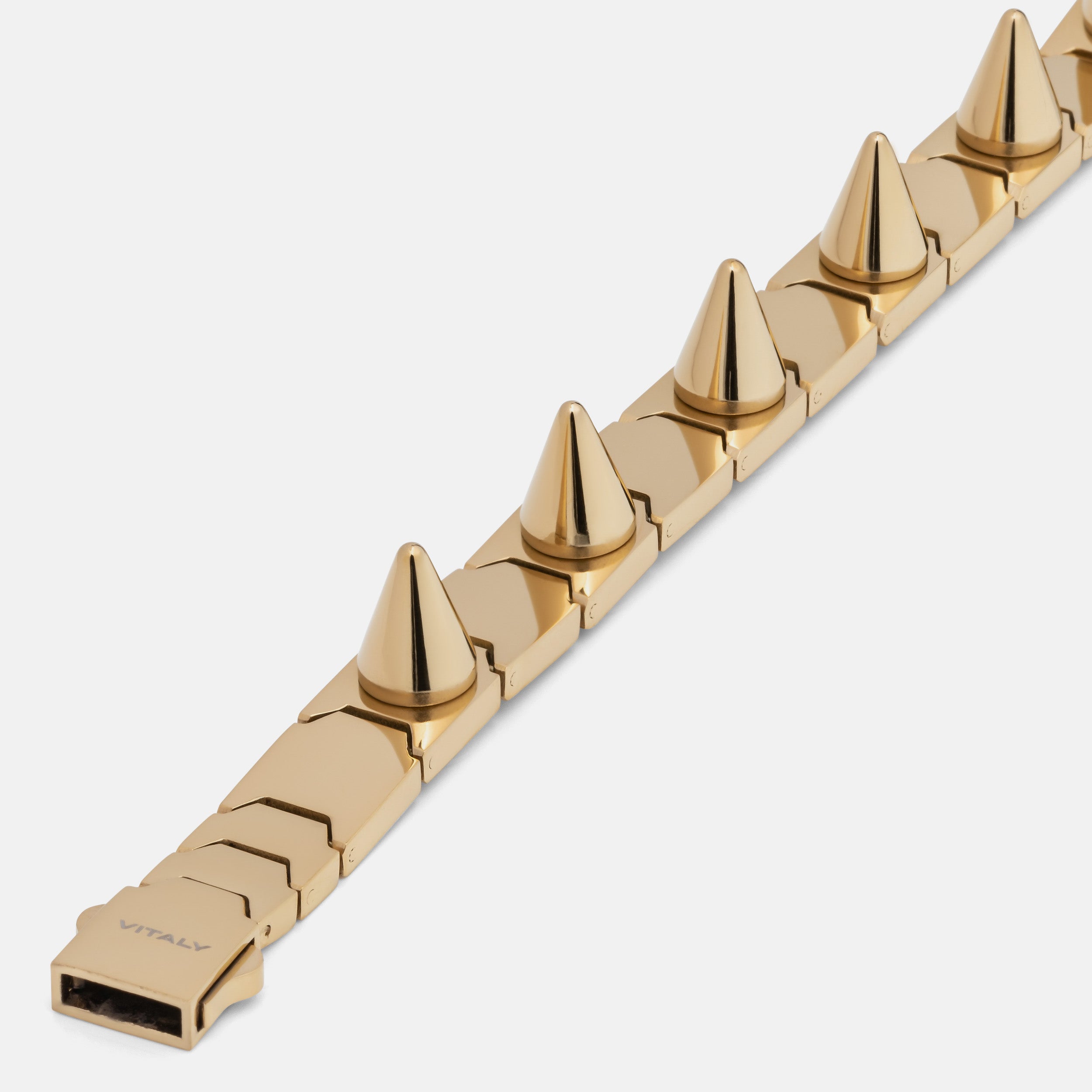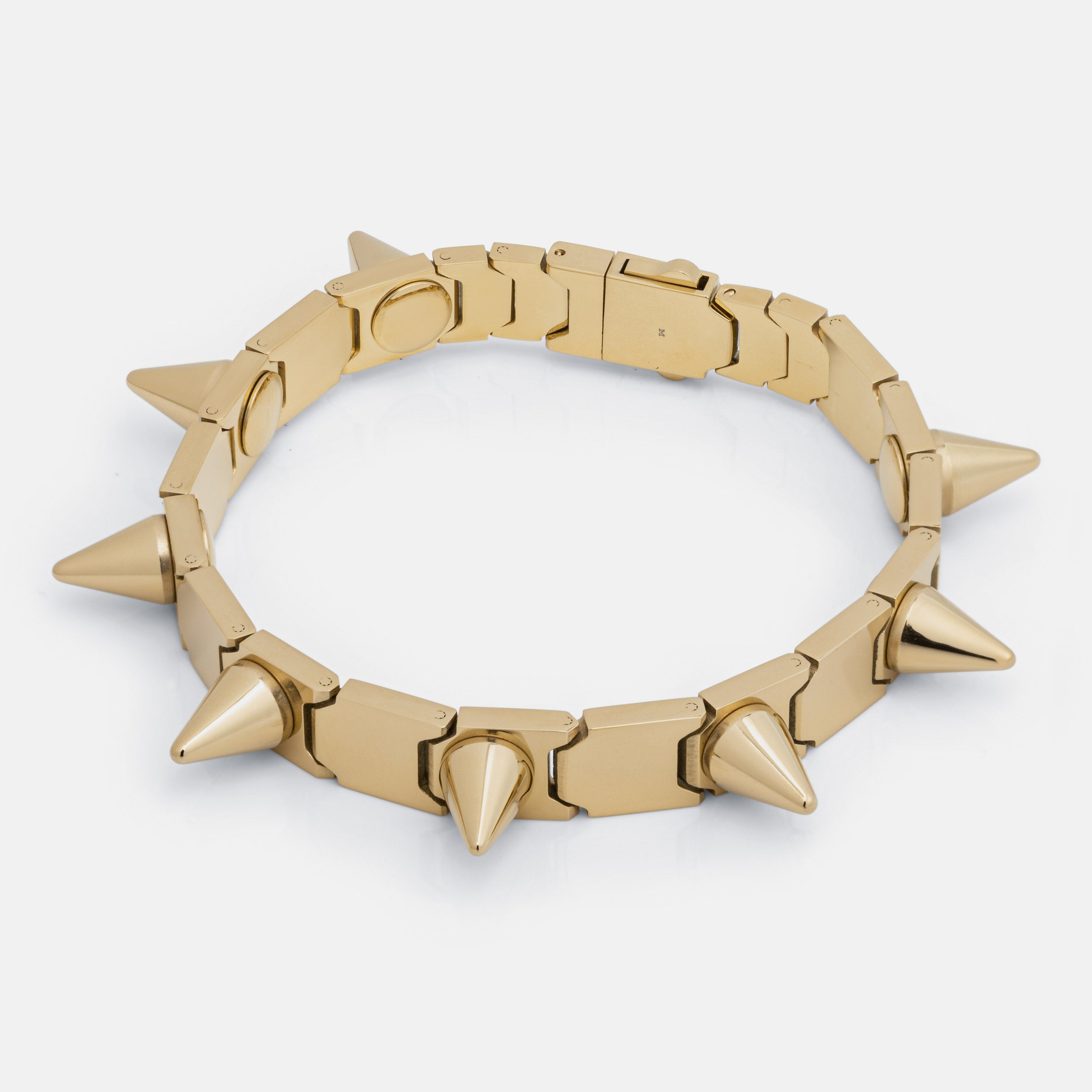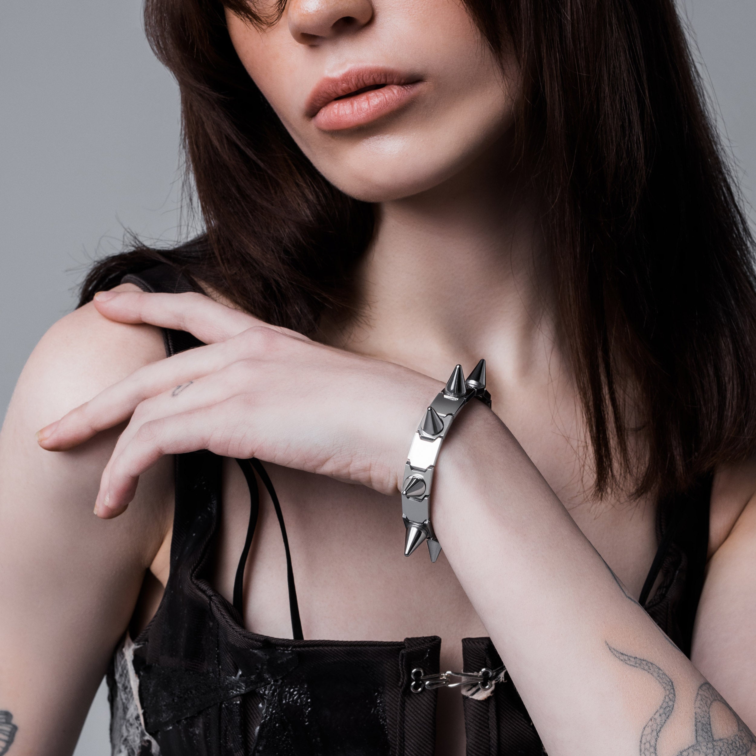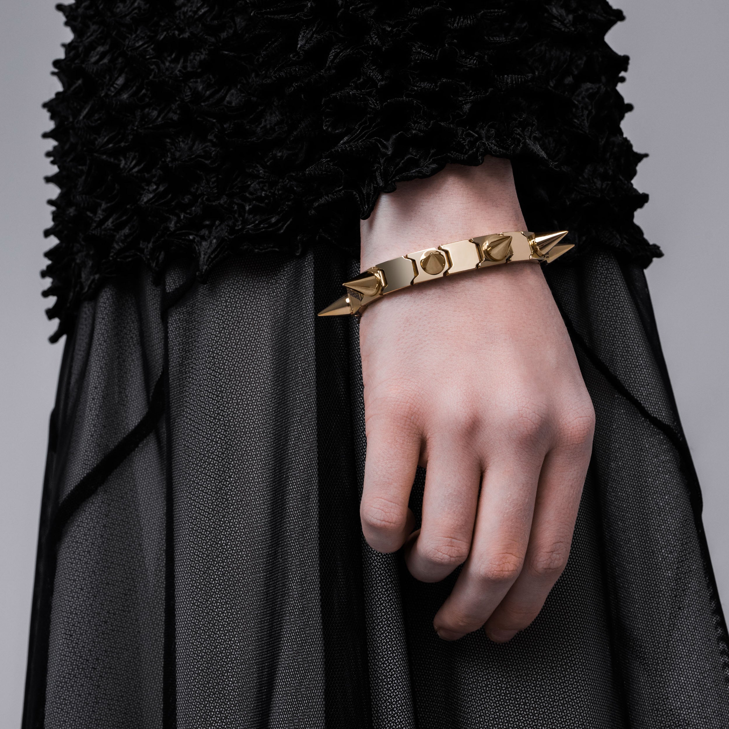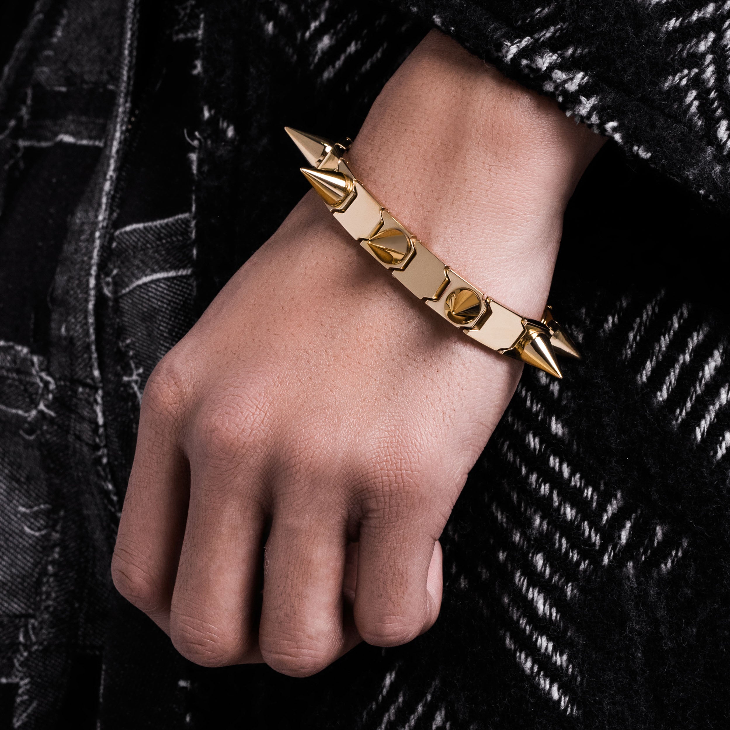 Featuring riveted studs adjoined to sleek hinging plates and a streamlined buckle clasp. the Agitator is a contemporary version of the classic spiked bracelet.