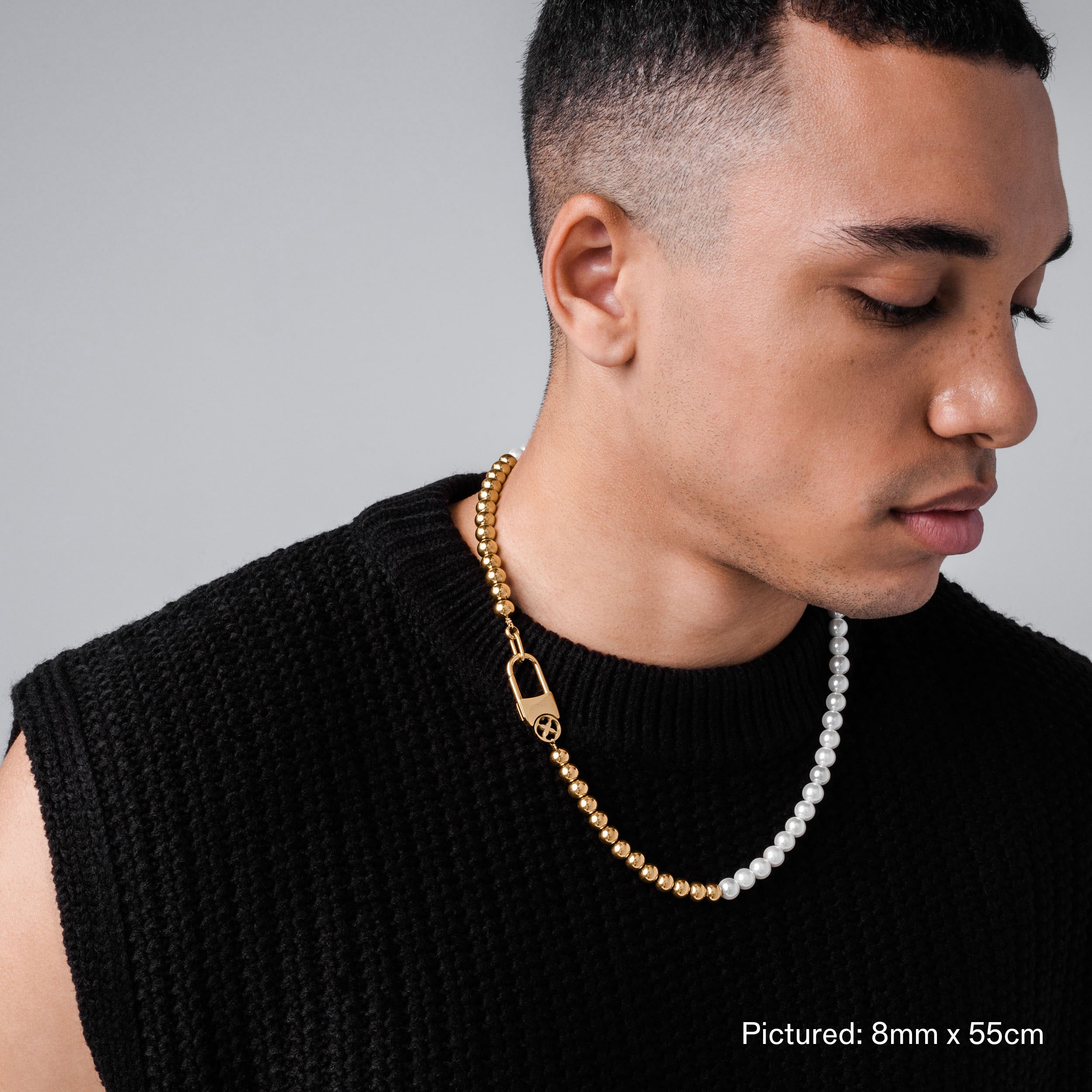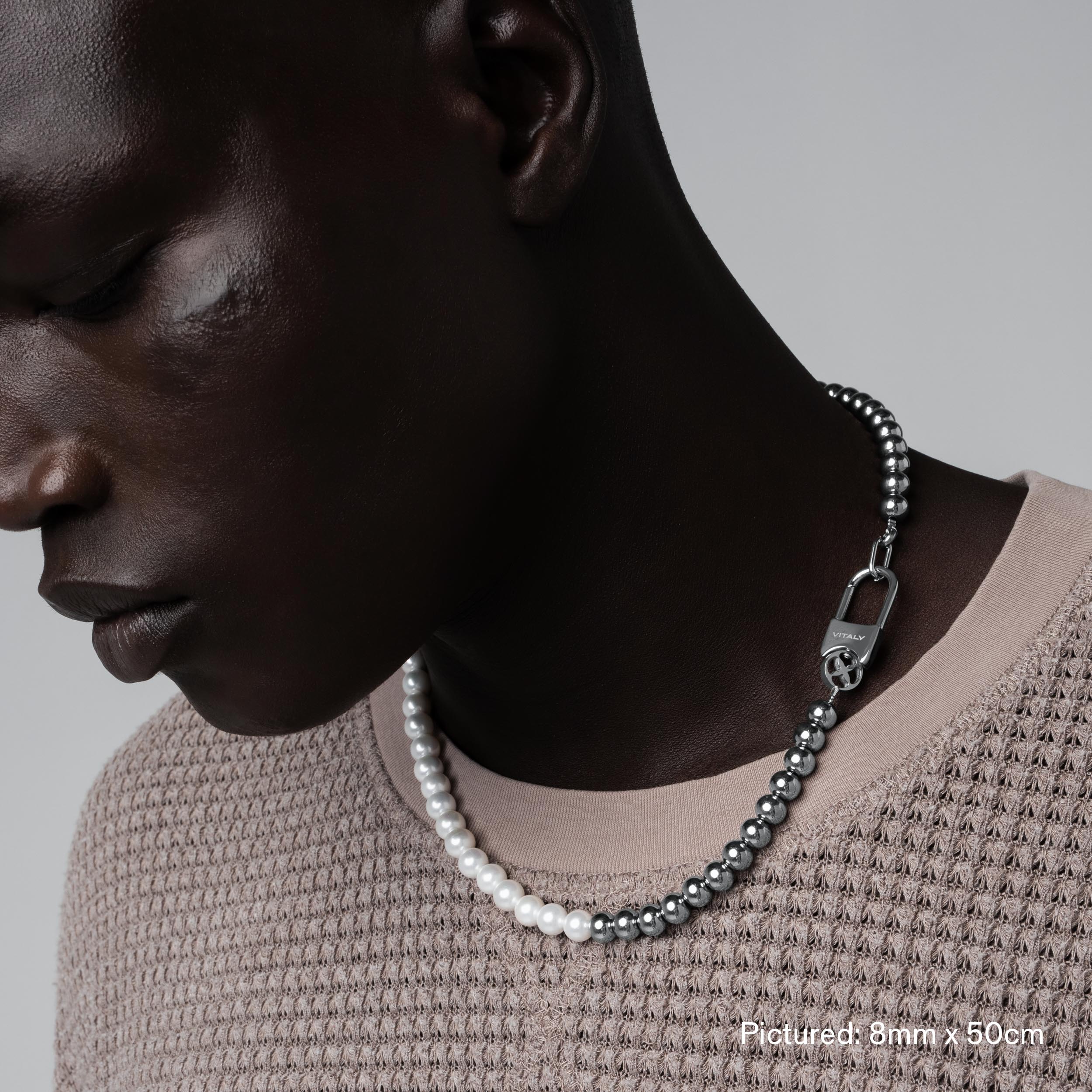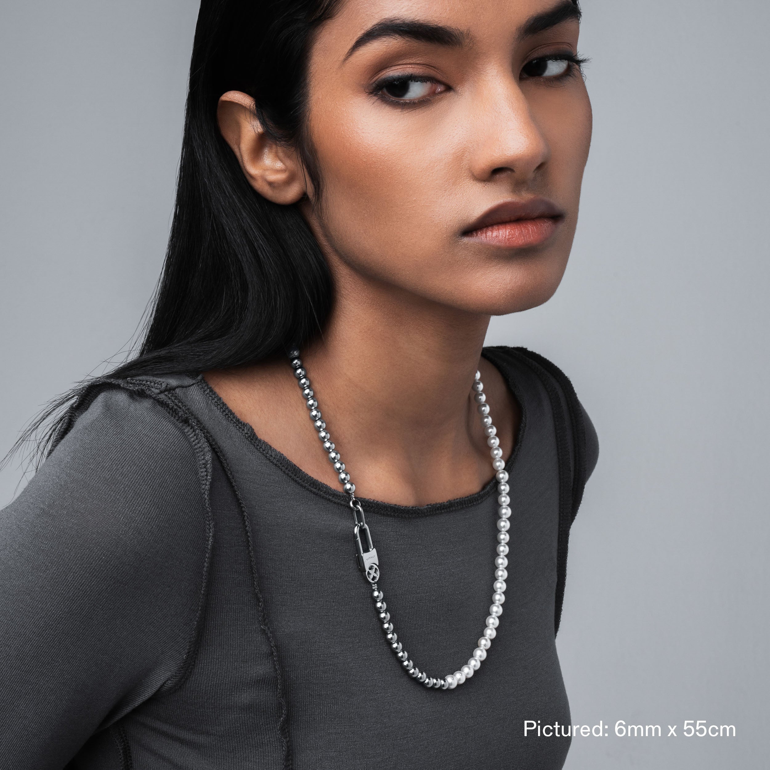 The Akoya juxtaposes iridescent synthetic pearls against a stainless steel ball chain and finishes with our signature Glyph carabiner clasp.