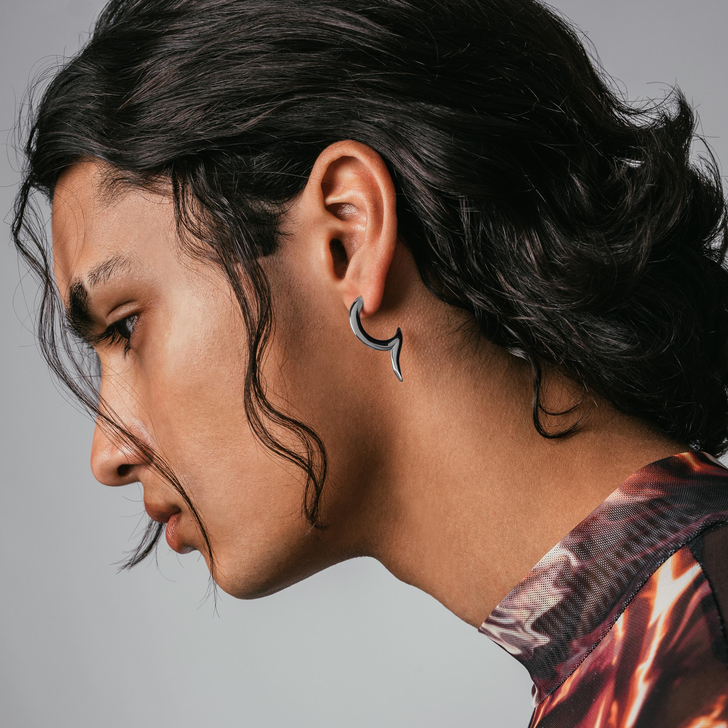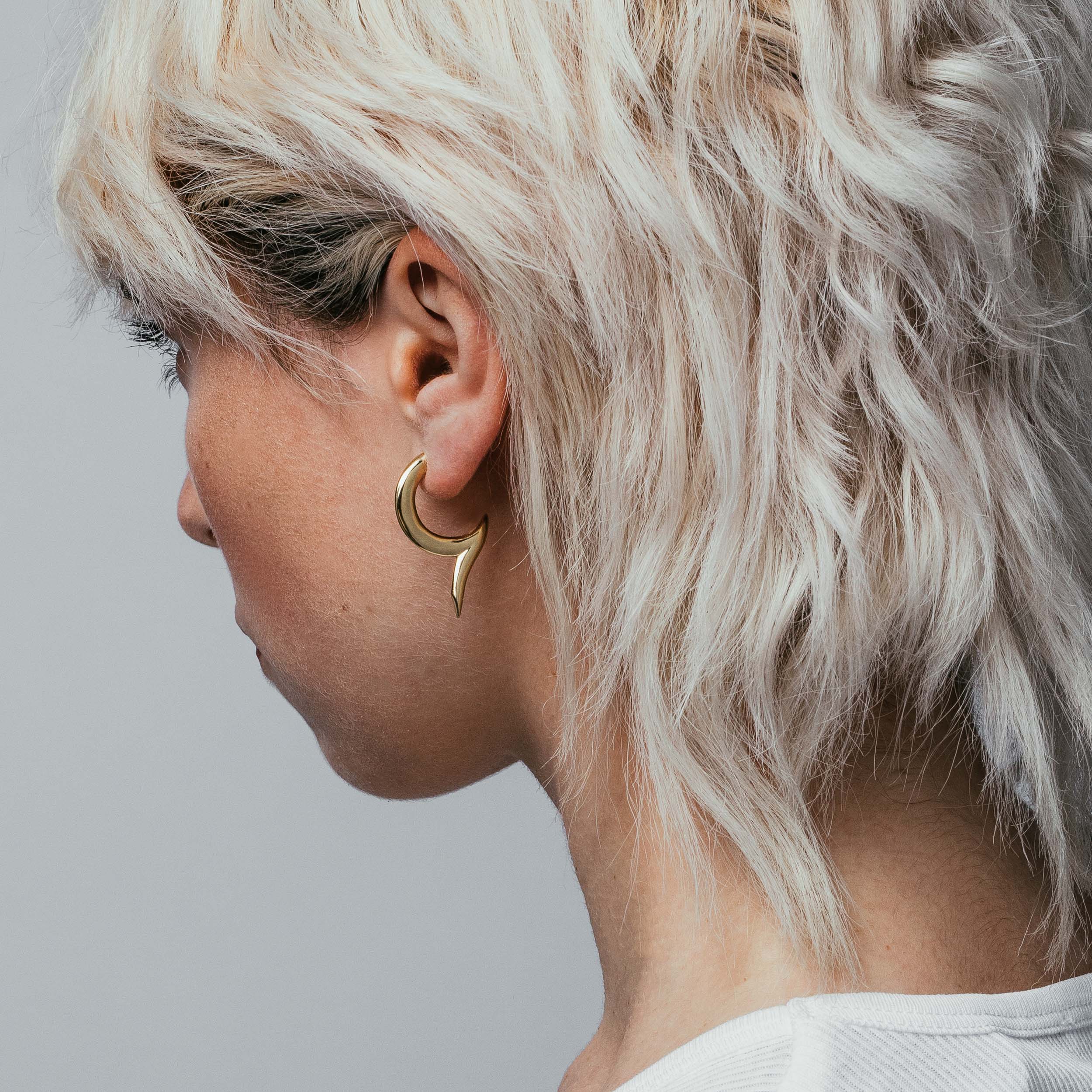 The Ambient is a curving earring set with a sharp. pointed appearance. Finished with a custom hexagon backing.