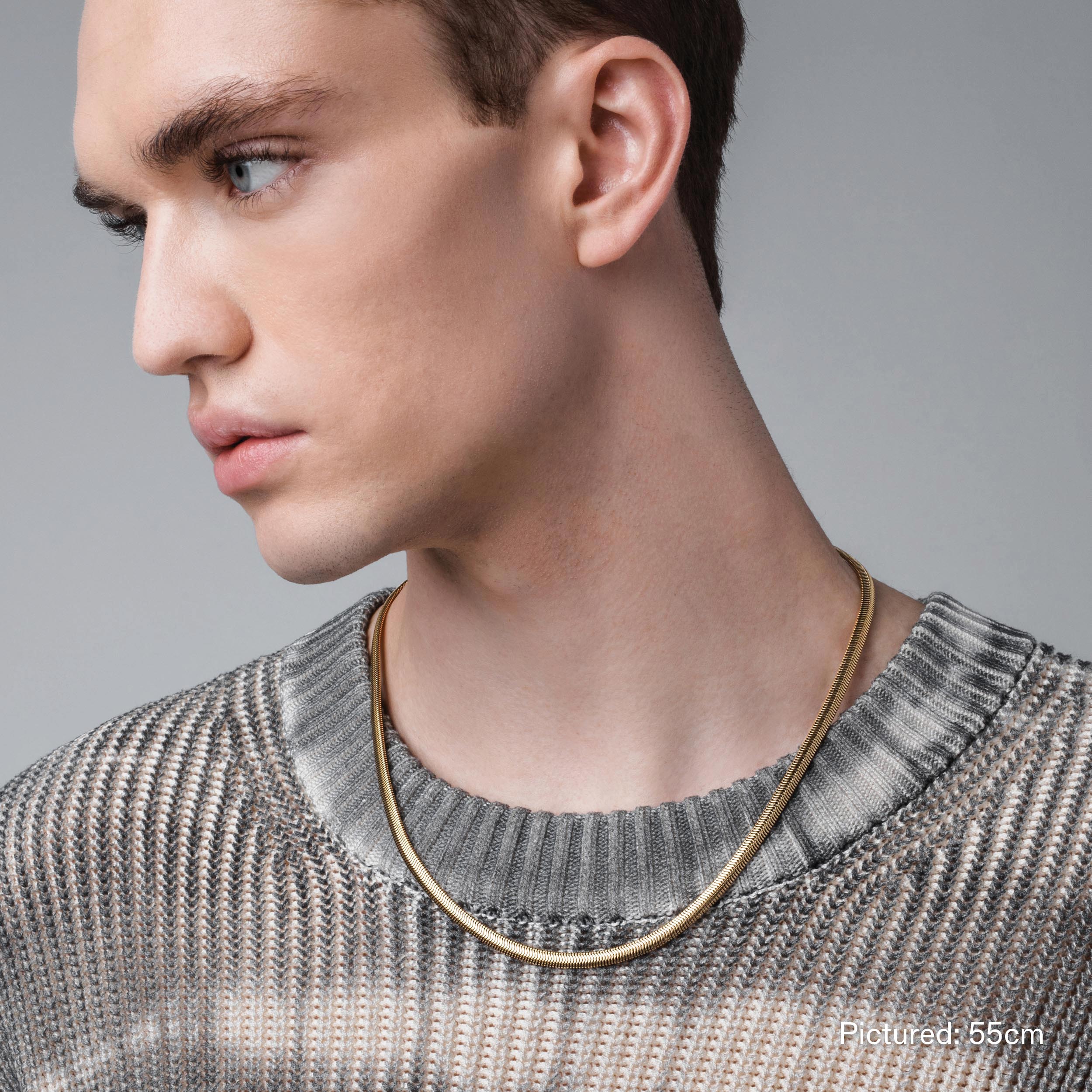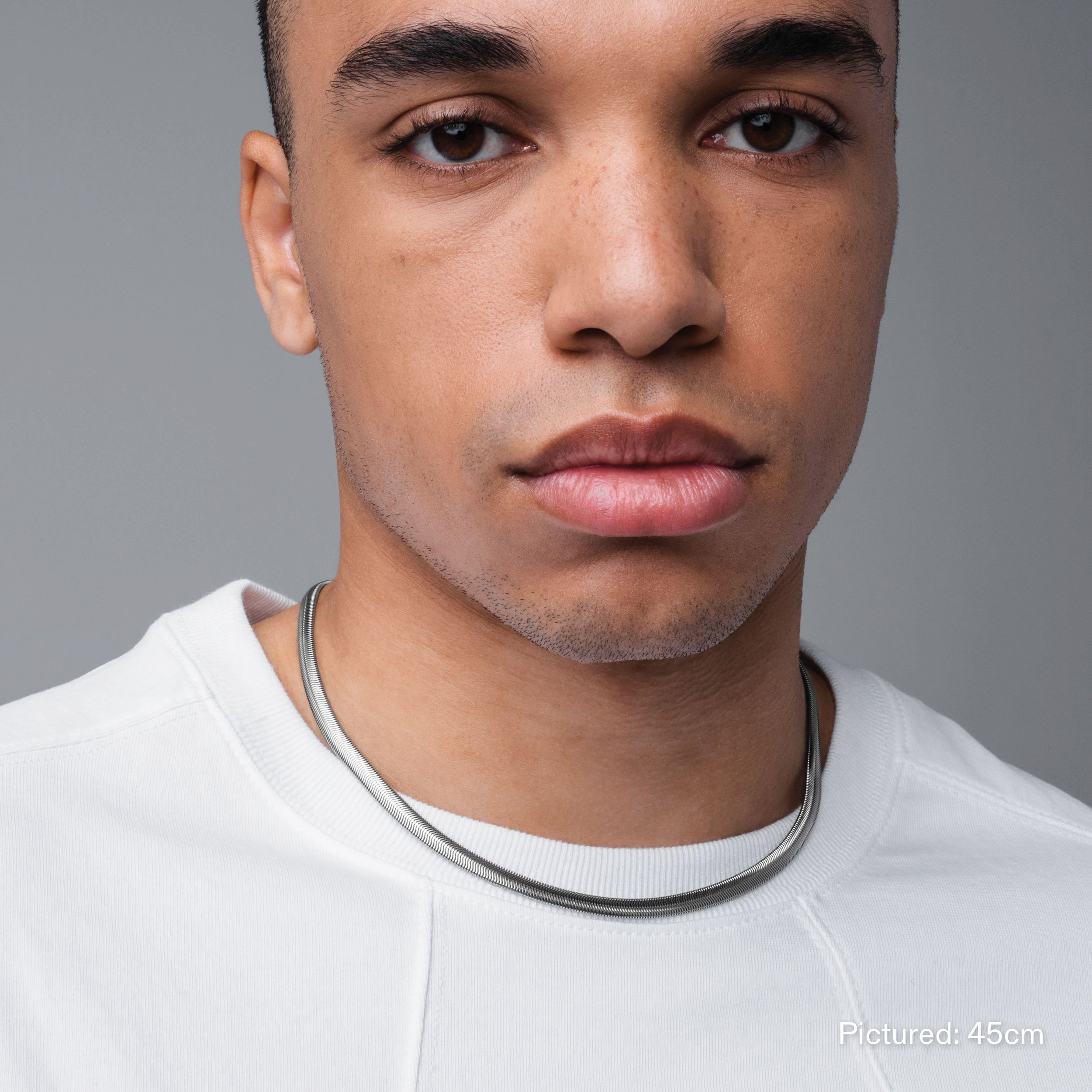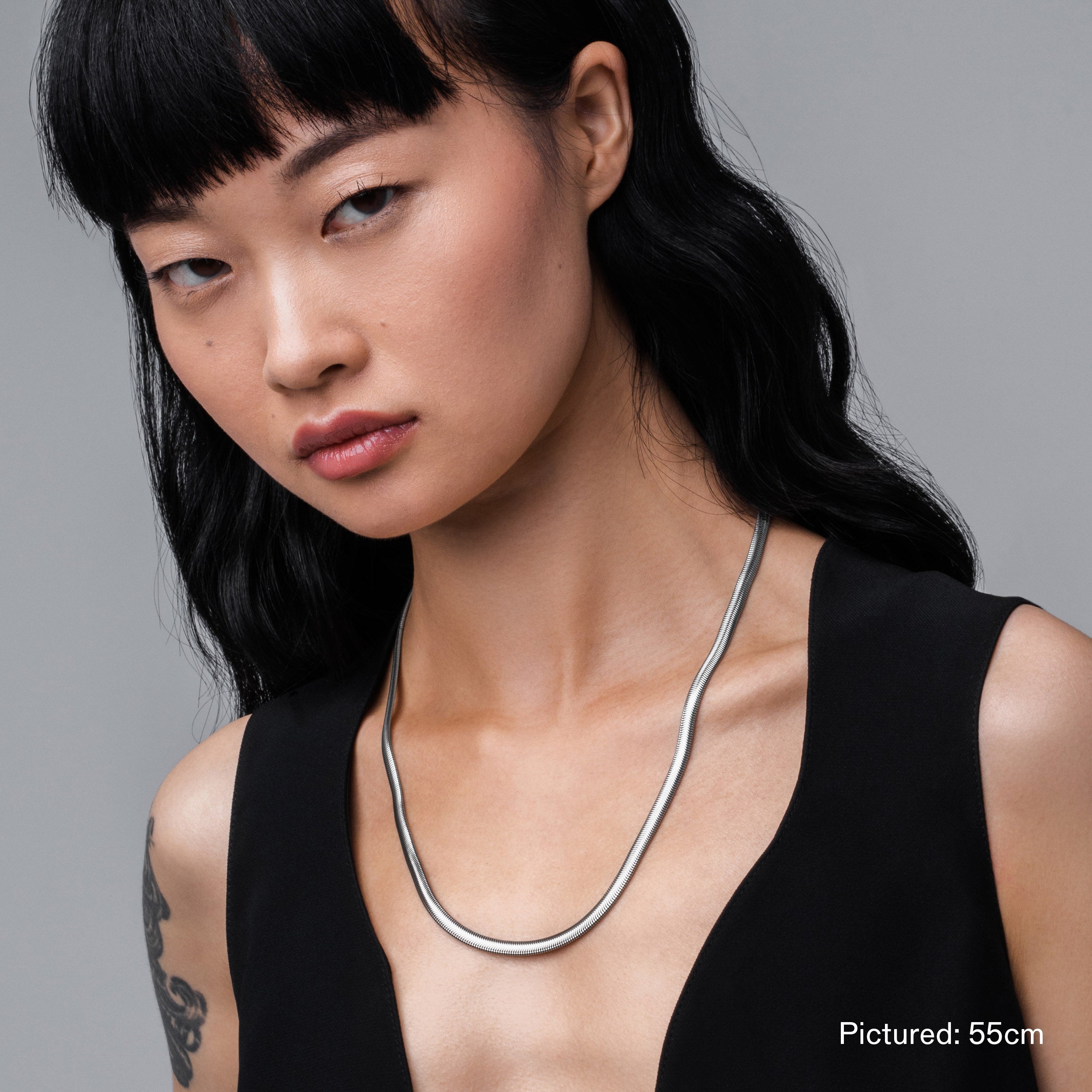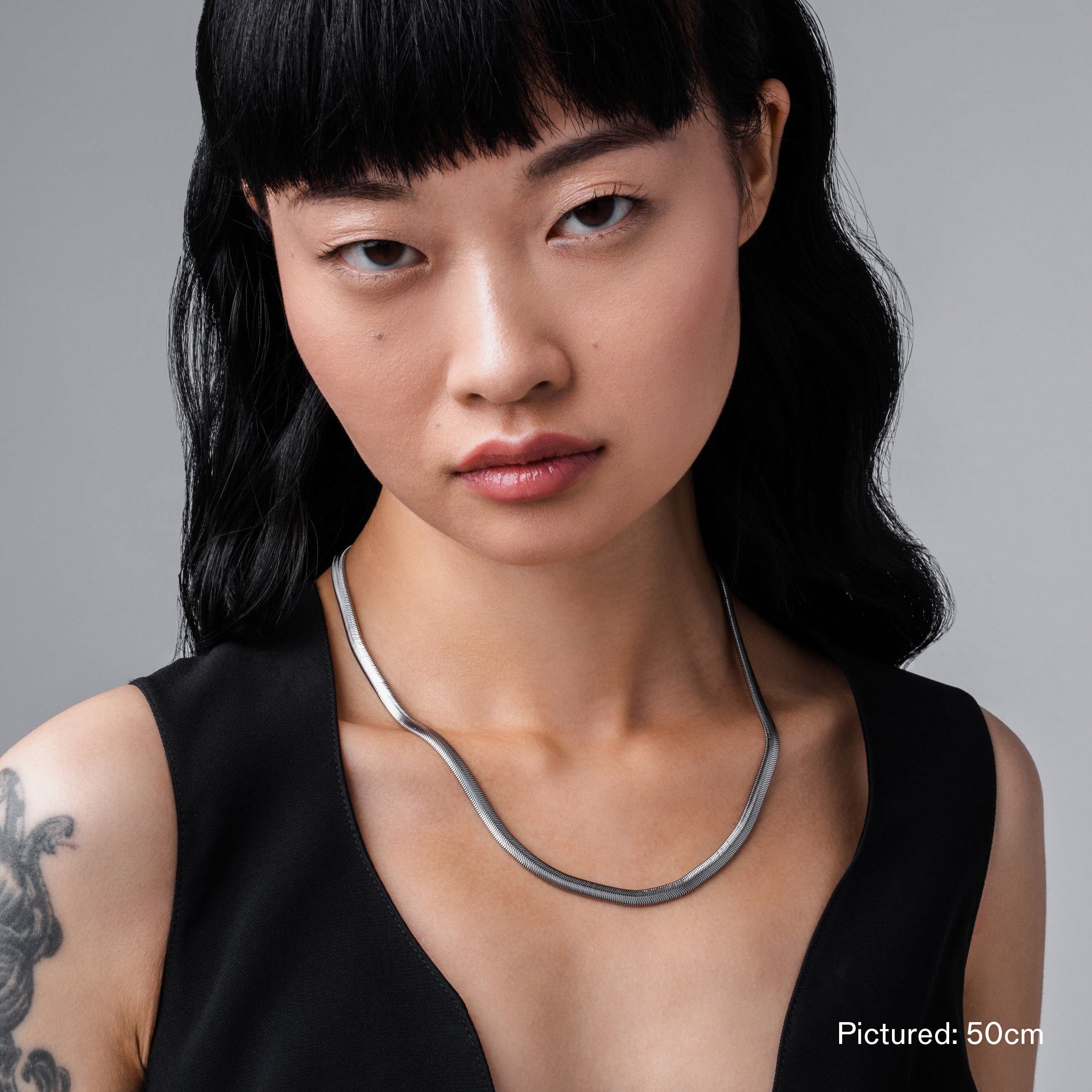 The Coil is constructed from a tightly woven herringbone chain. giving it a smooth appearance and fluid sense of movement. Comes in two lengths and finishes with our signature Glyph logo tag. Can be worn on its own or layered with other chains and pendants.
