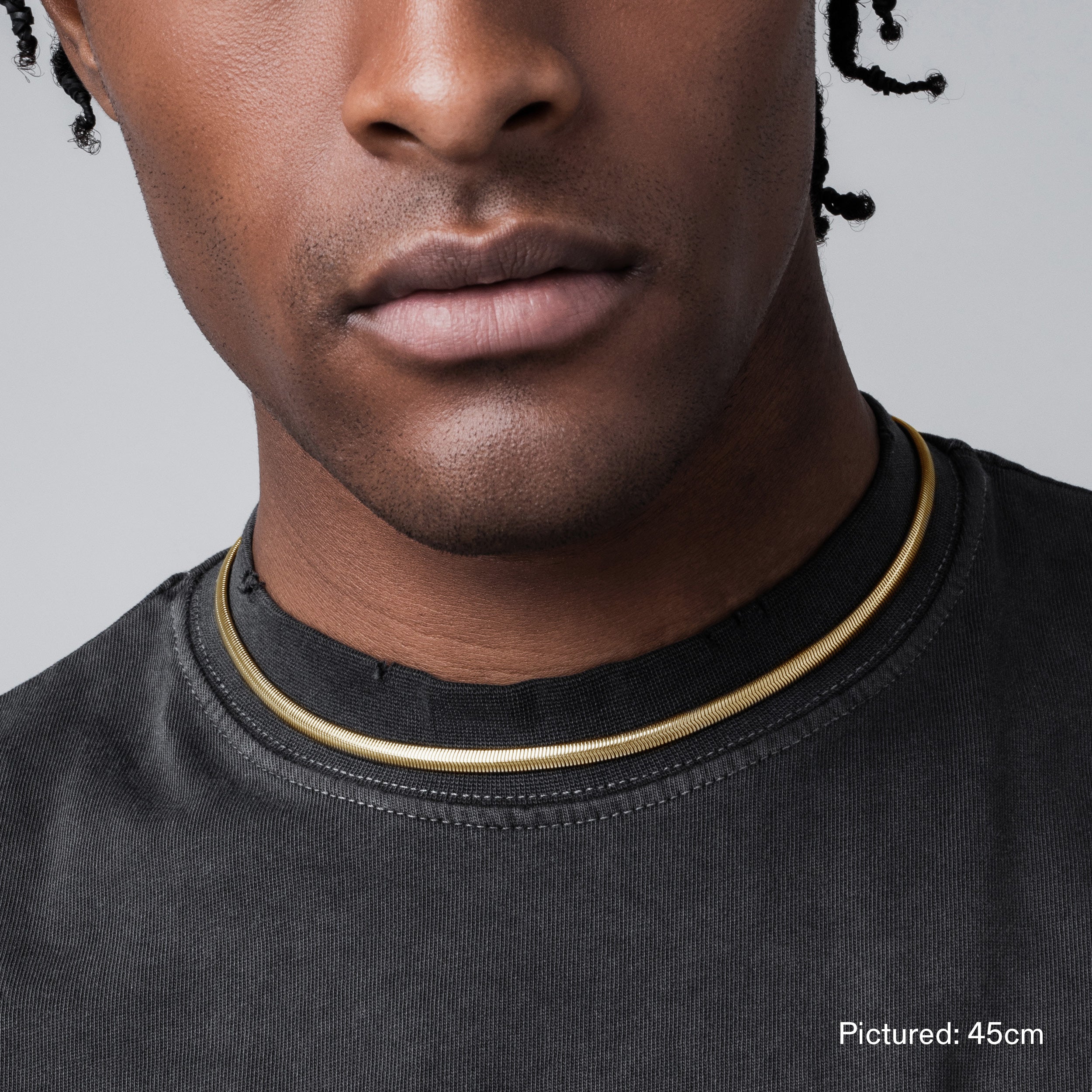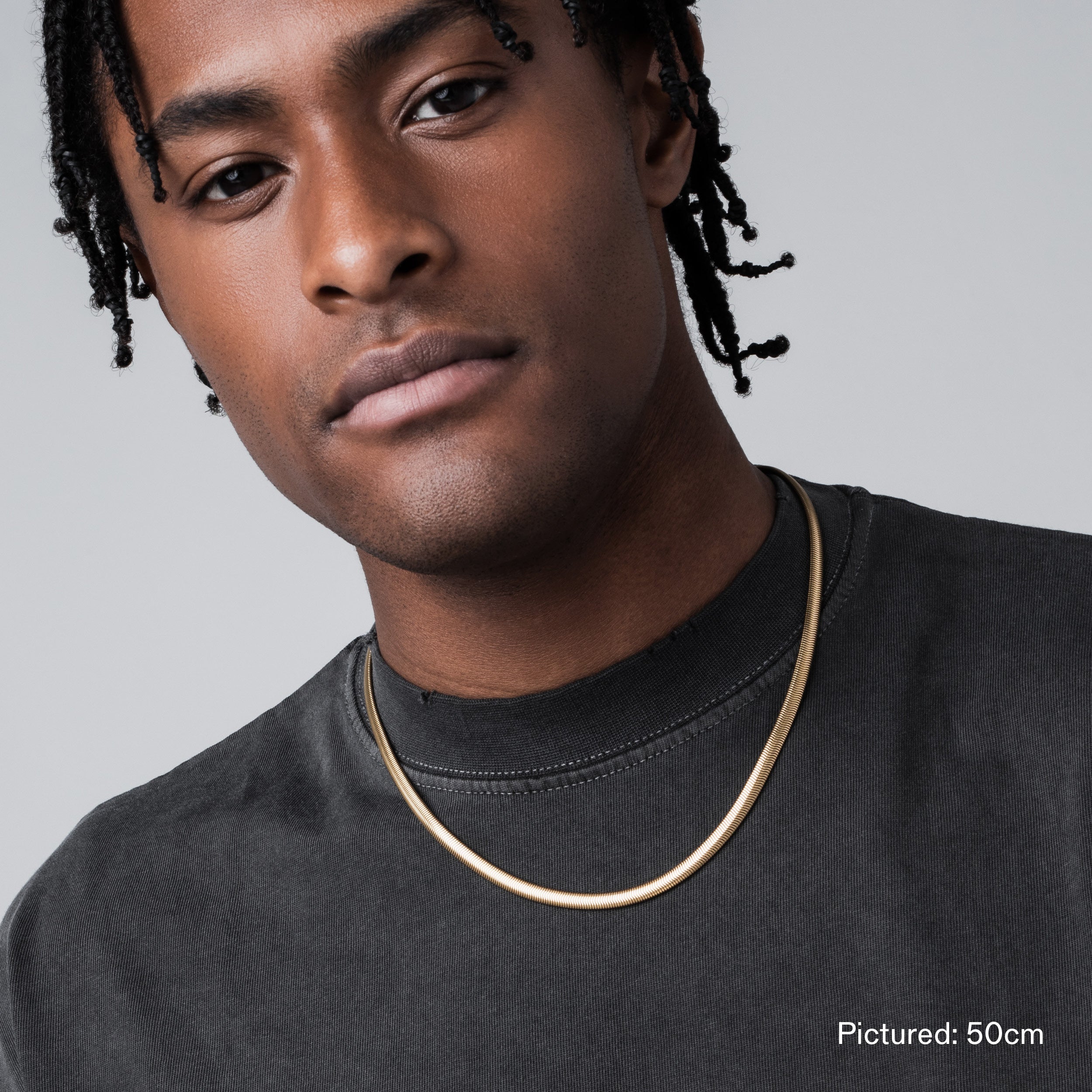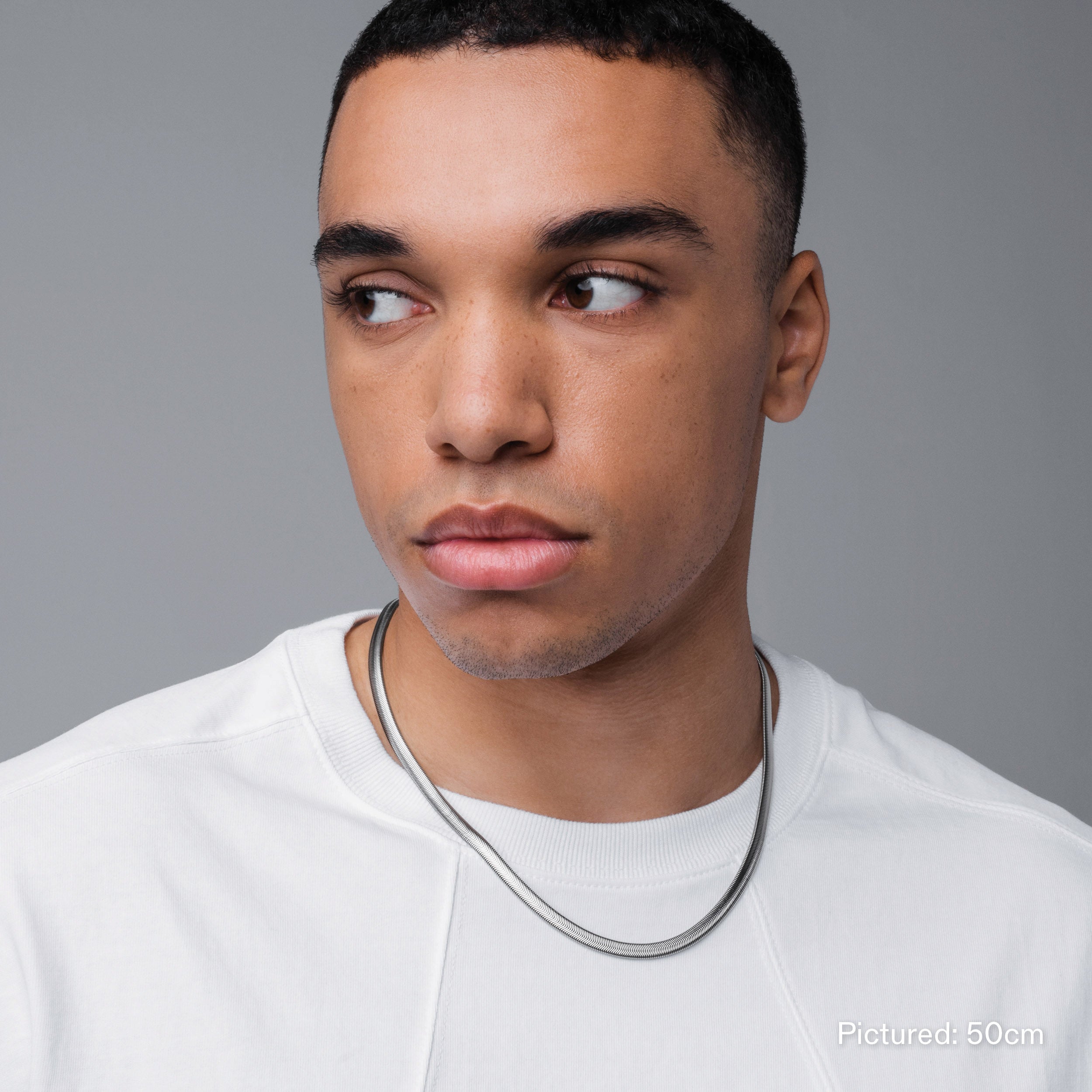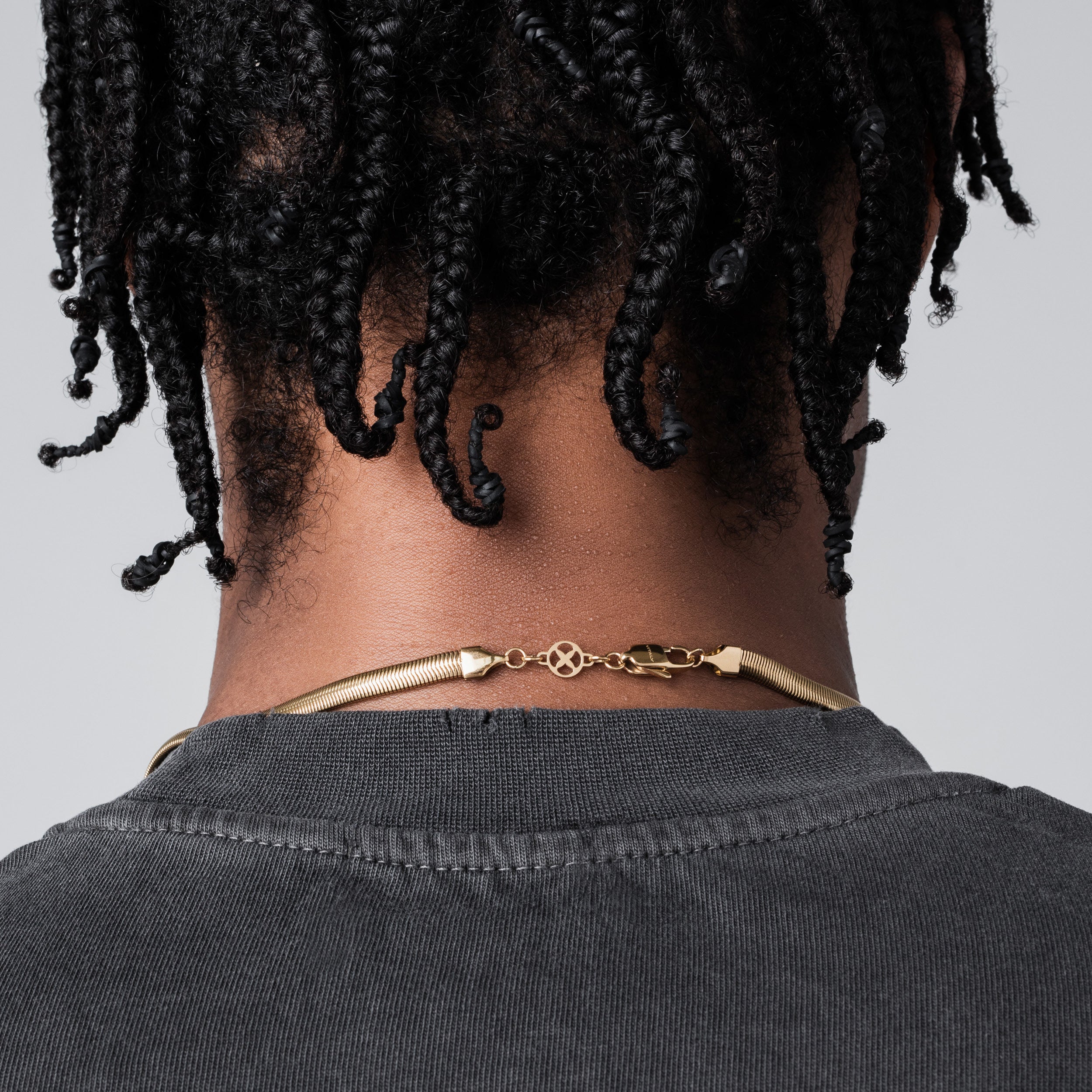 The Coil is constructed from a tightly woven herringbone chain. giving it a smooth appearance and fluid sense of movement. Comes in two lengths and finishes with our signature Glyph logo tag. Can be worn on its own or layered with other chains and pendants.