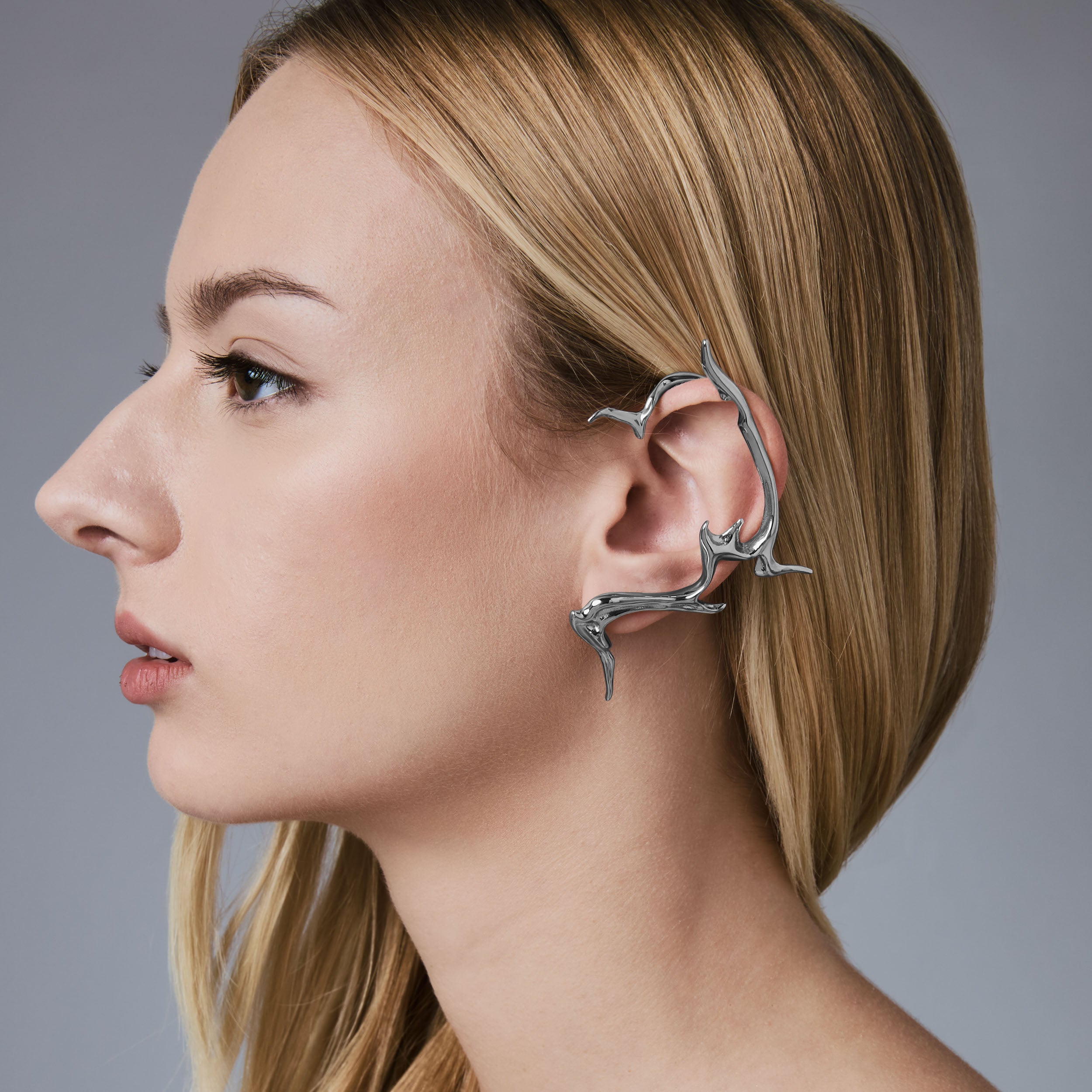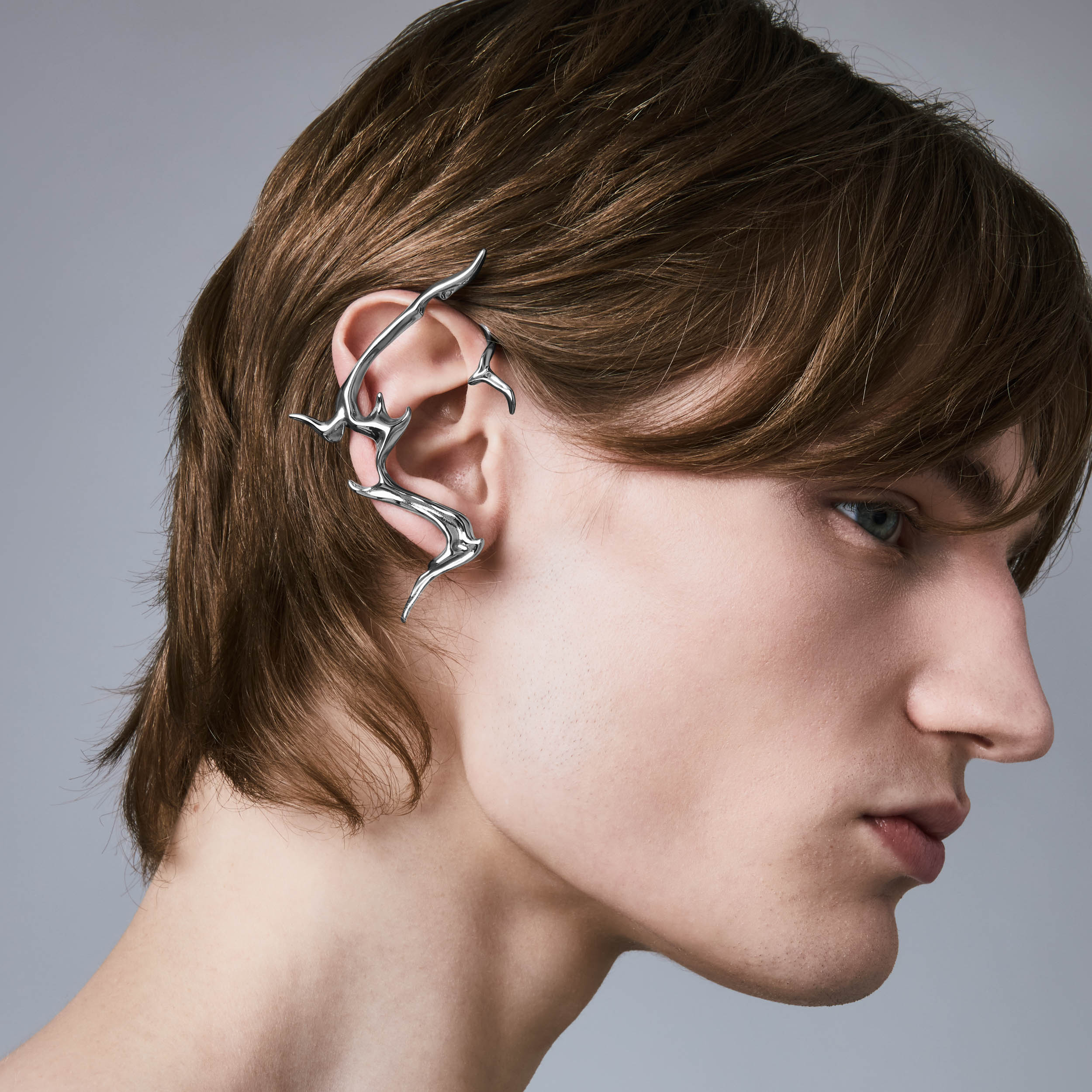 Designed in collaboration with influential artist as part of a four-piece collection C The Current is Inspired by the flowing. abstract lines of Mei’s neck and d colletage tattoos. the earcuff is a wearable ode to conceptual art. Designed for those who dare to push beyond normal limits and celebrating the act of losing the plot when in artistic flow and expression.
