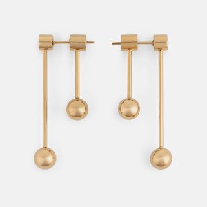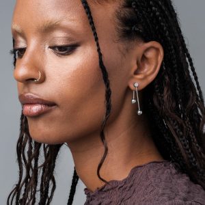Inspired by barbell piercings. the Dropp earring set features two elongated bars of differing length. Joined on a rotating axis. the barbells can be worn straight up and down or twisted to sit on an angle. creating distinct shapes.