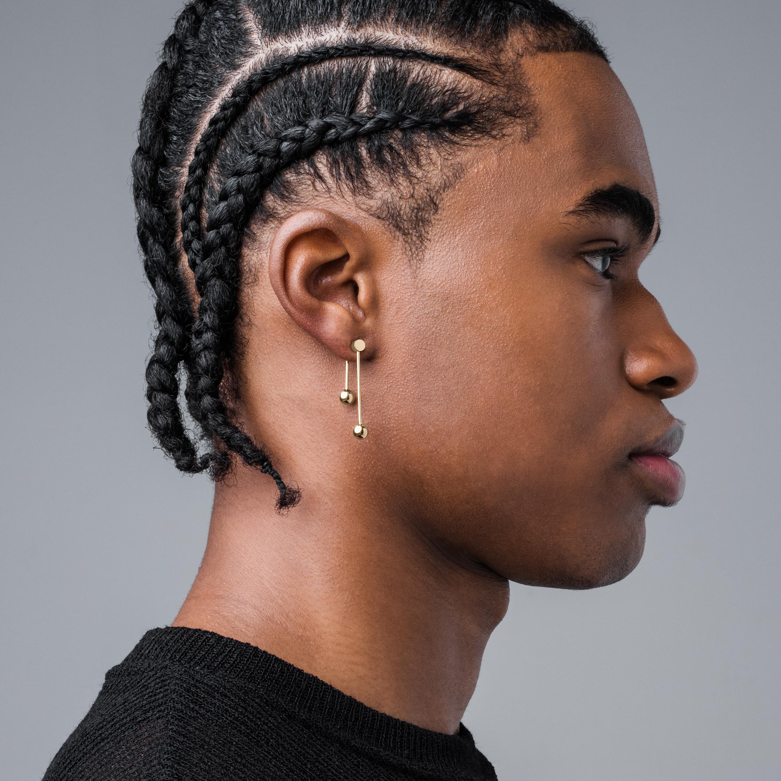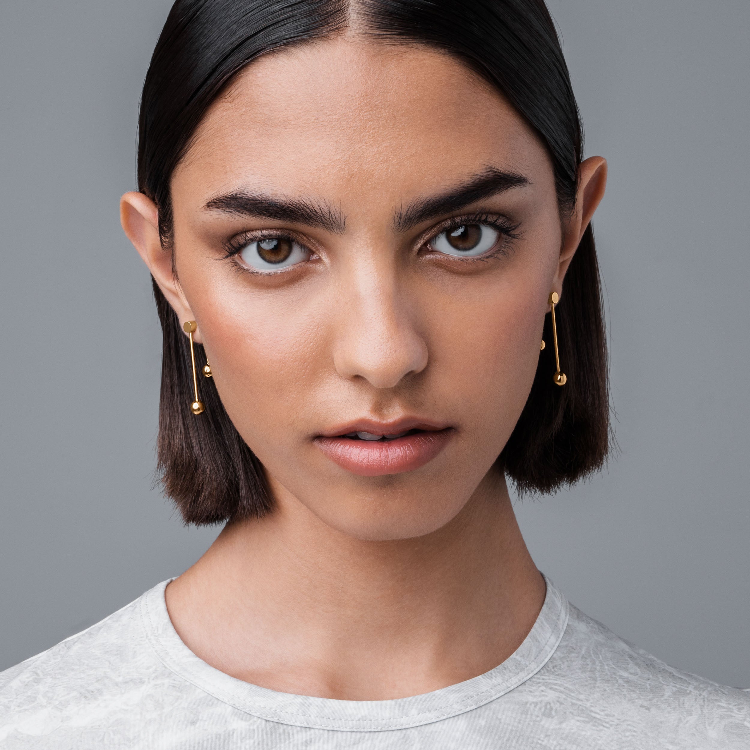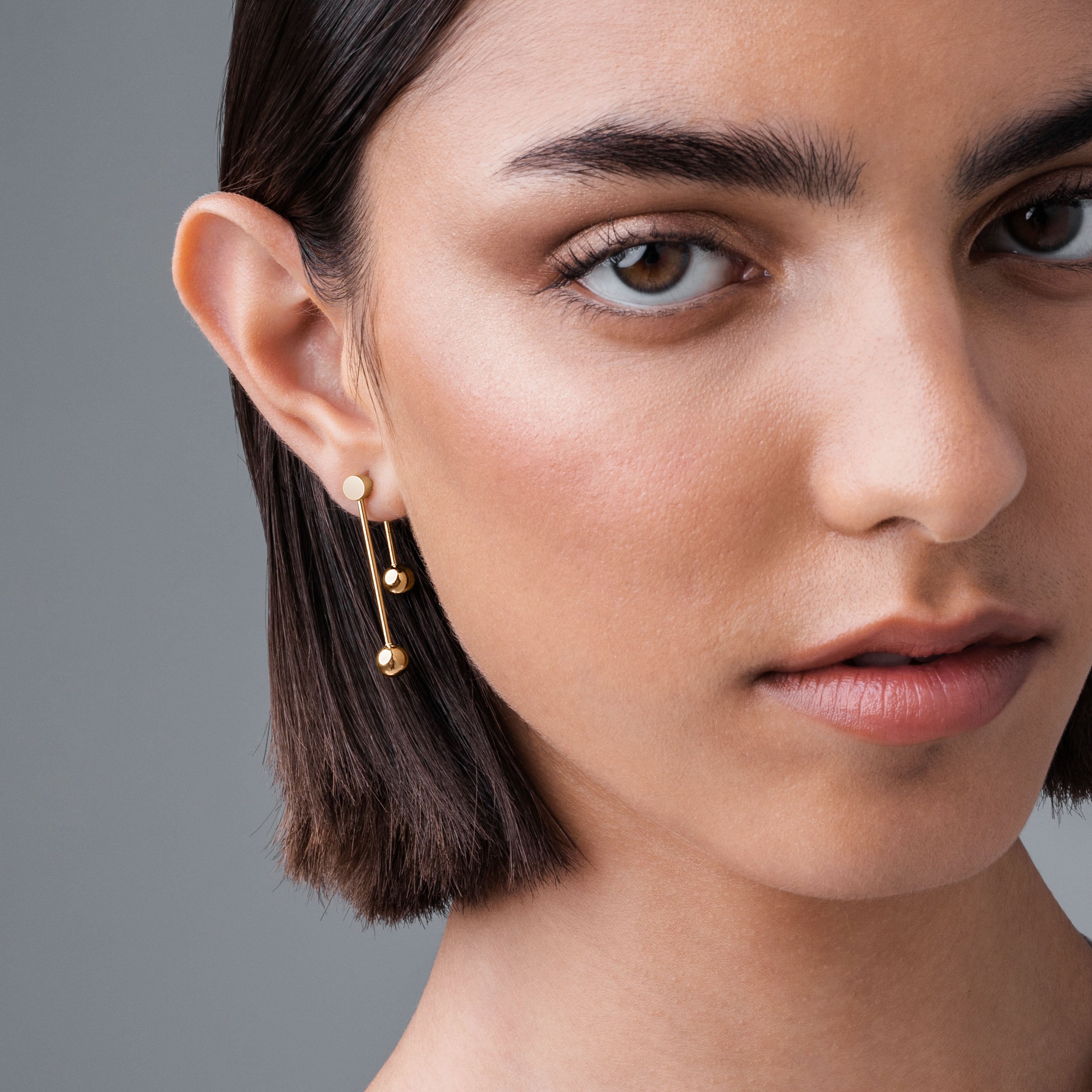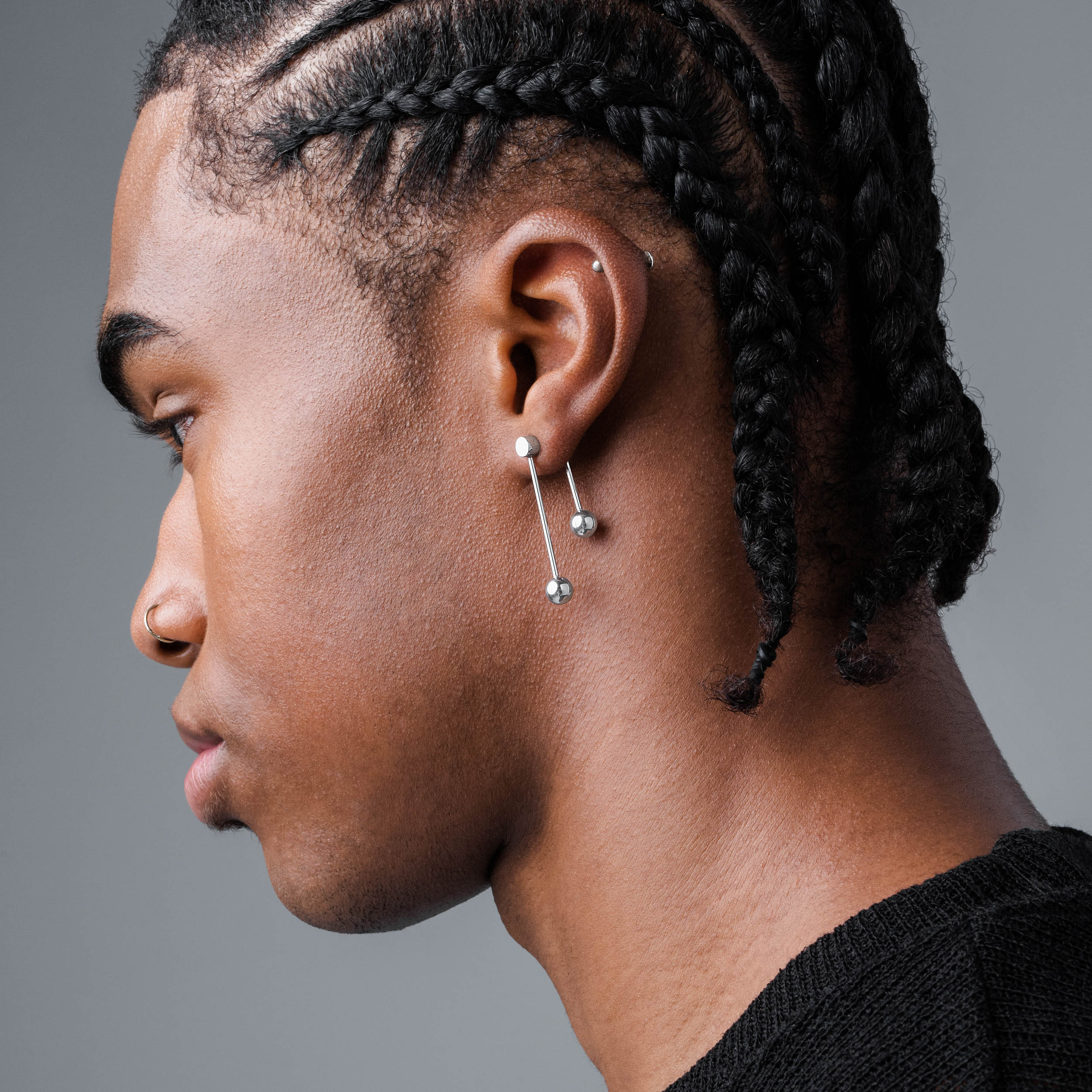 Inspired by barbell piercings. the Dropp earring set features two elongated bars of differing length. Joined on a rotating axis. the barbells can be worn straight up and down or twisted to sit on an angle. creating distinct shapes.