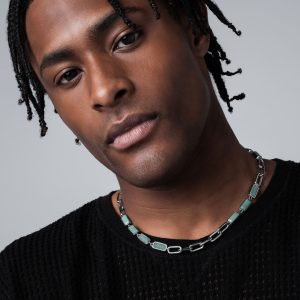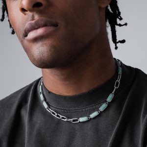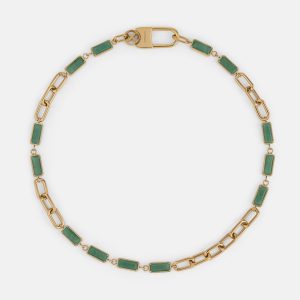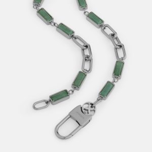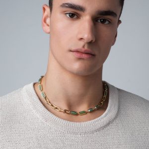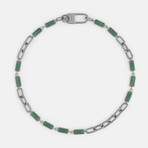 The Encode juxtaposes industrial cable links with sleek. faceted stones. Featuring inlaid quartz or aventurine. this contemporary chain adapts classical gemstone jewelry for a new age.