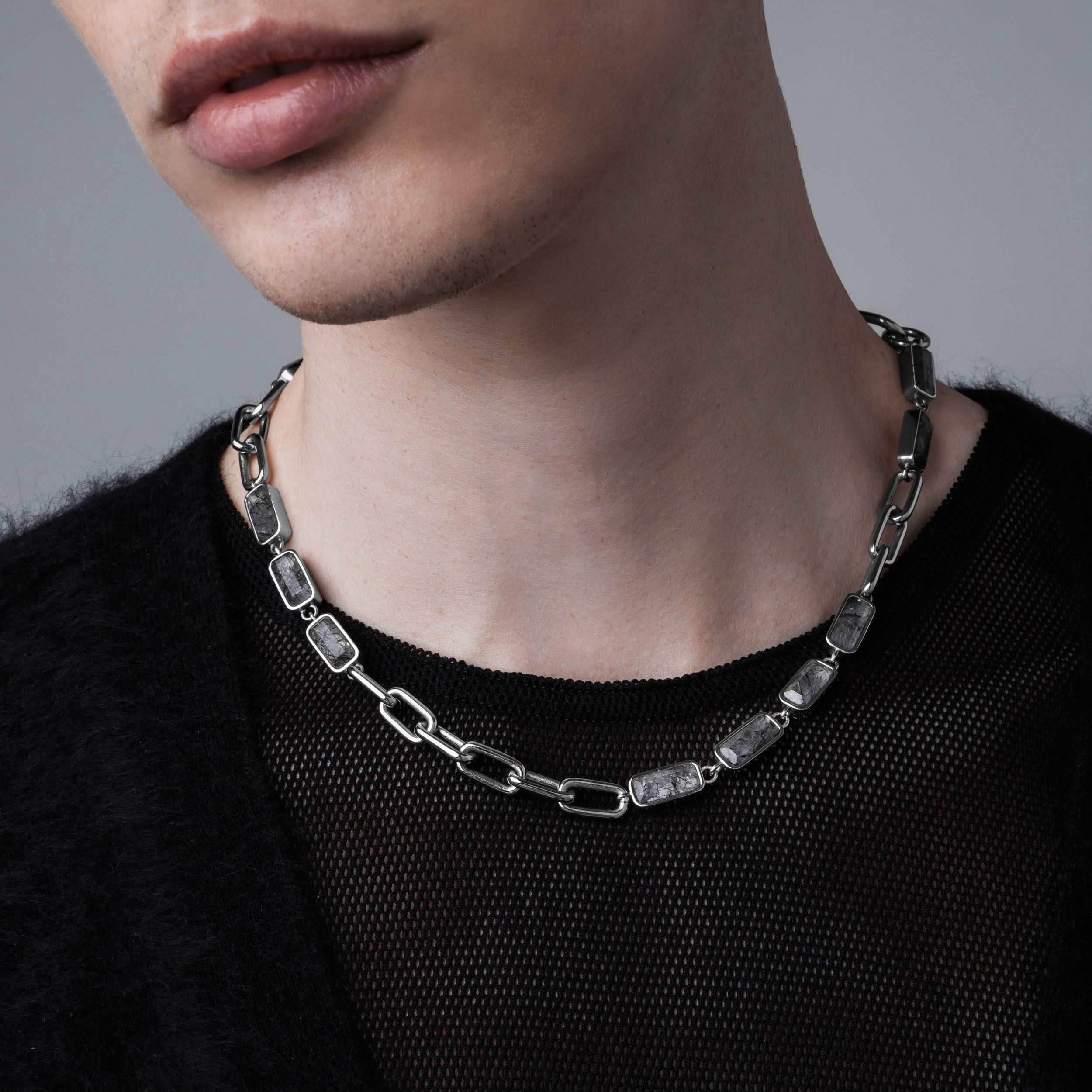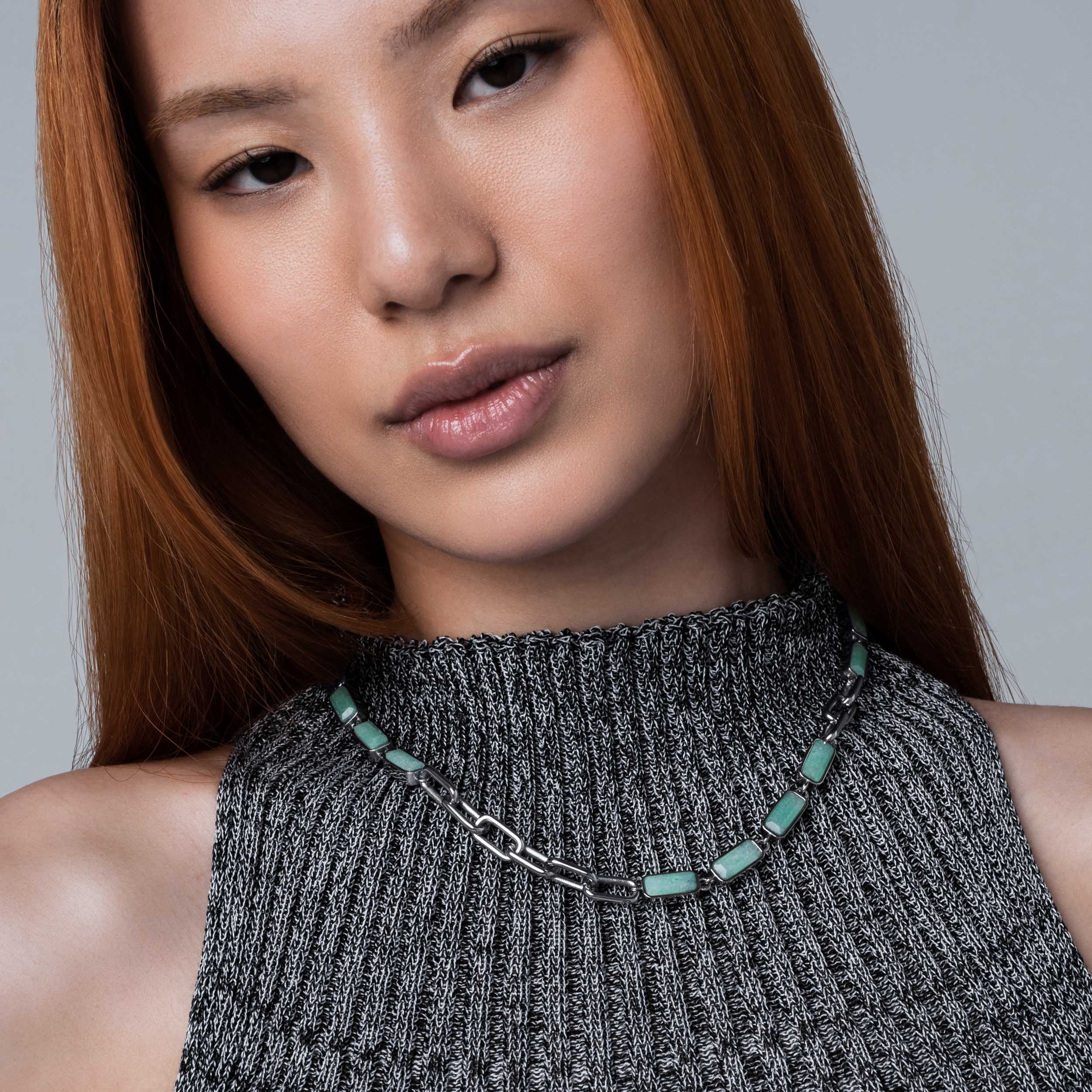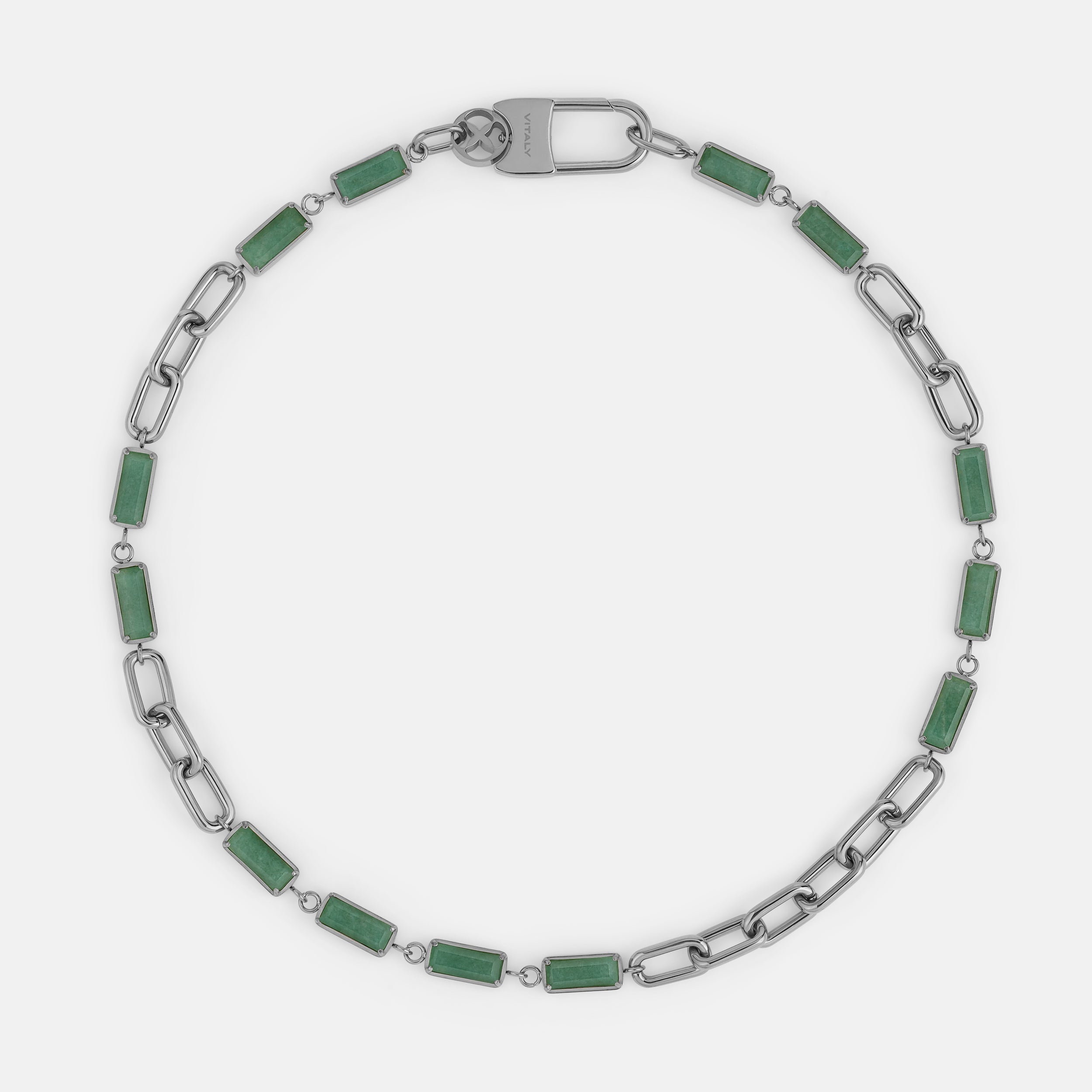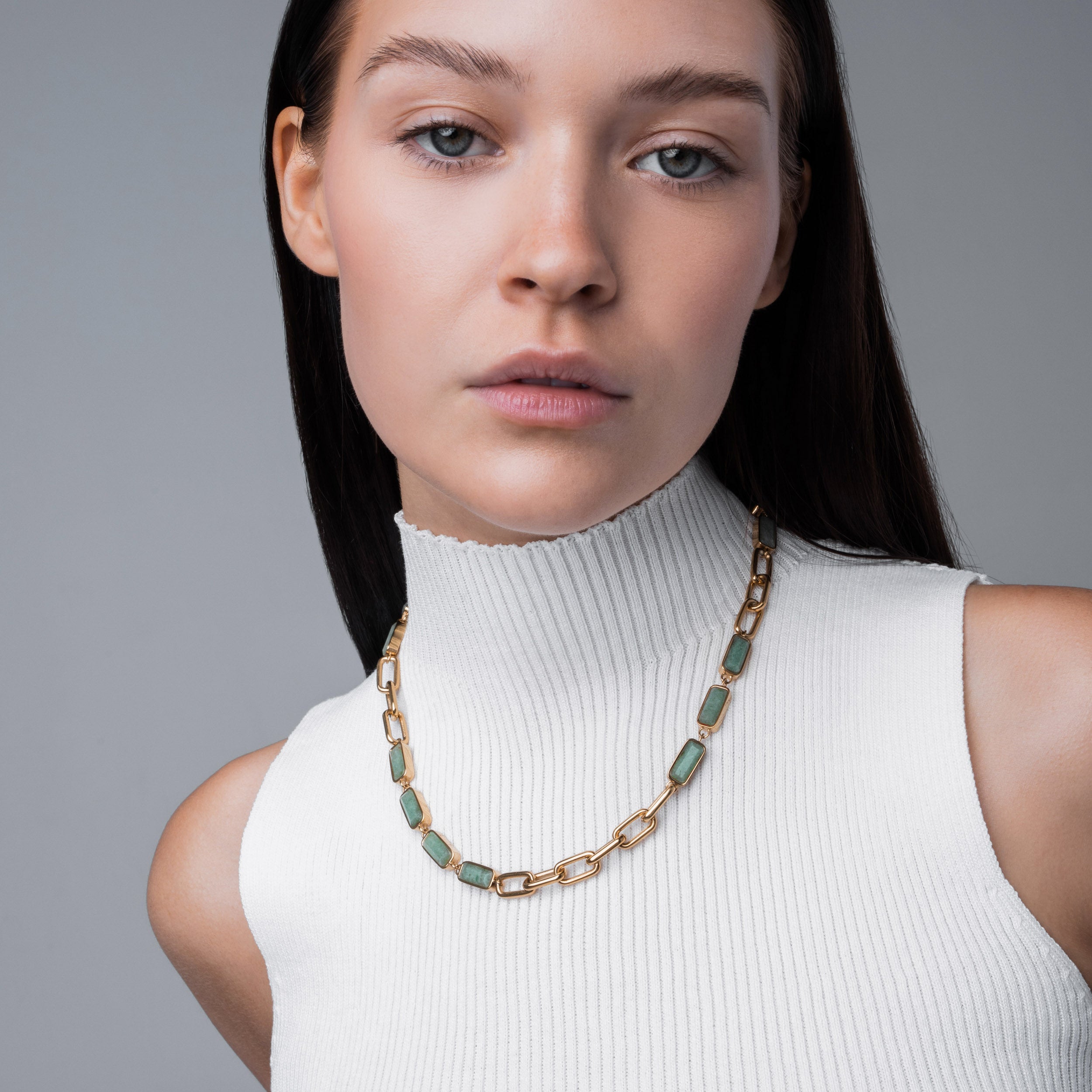 The Encode juxtaposes industrial cable links with sleek. faceted stones. Featuring inlaid quartz or aventurine. this contemporary chain adapts classical gemstone jewelry for a new age.