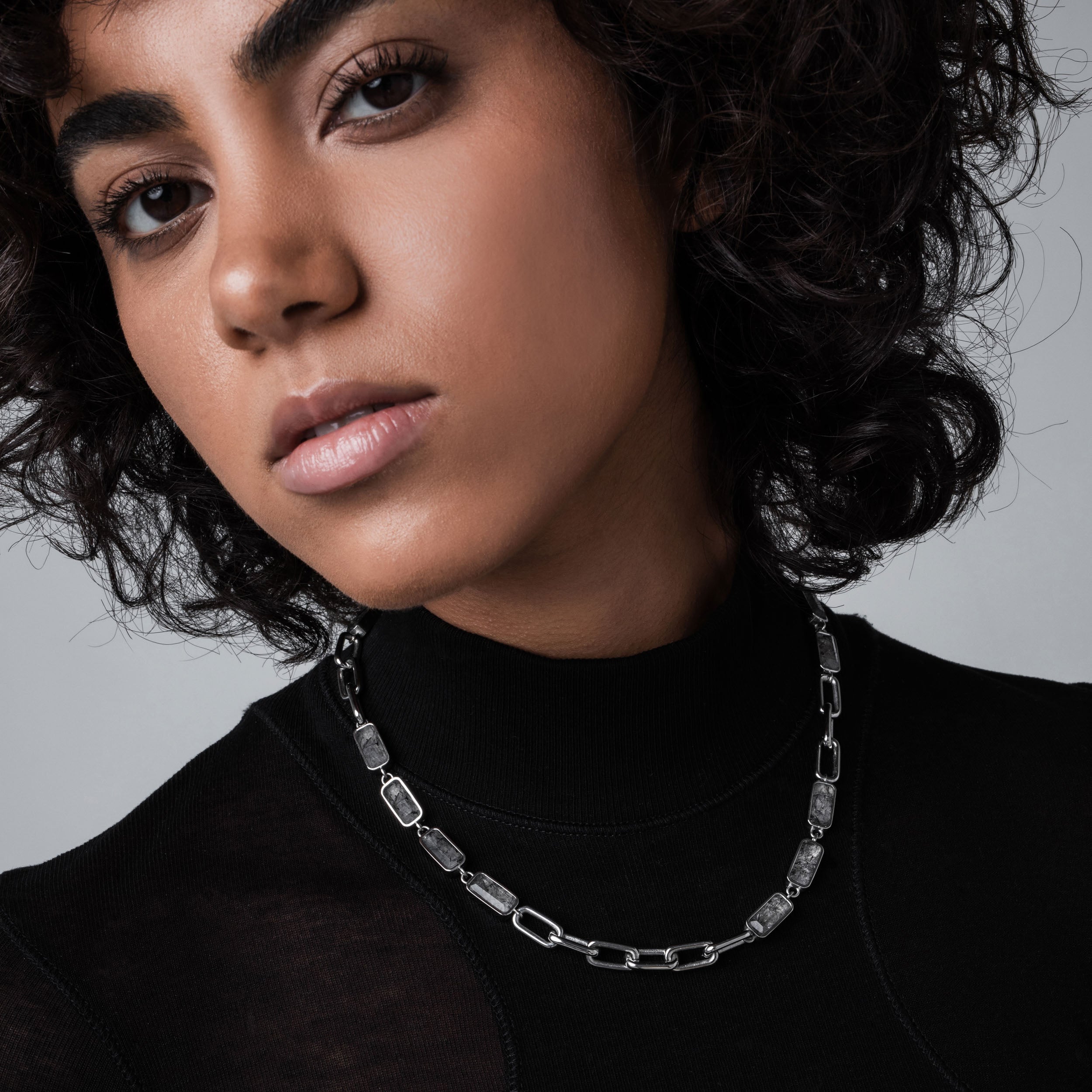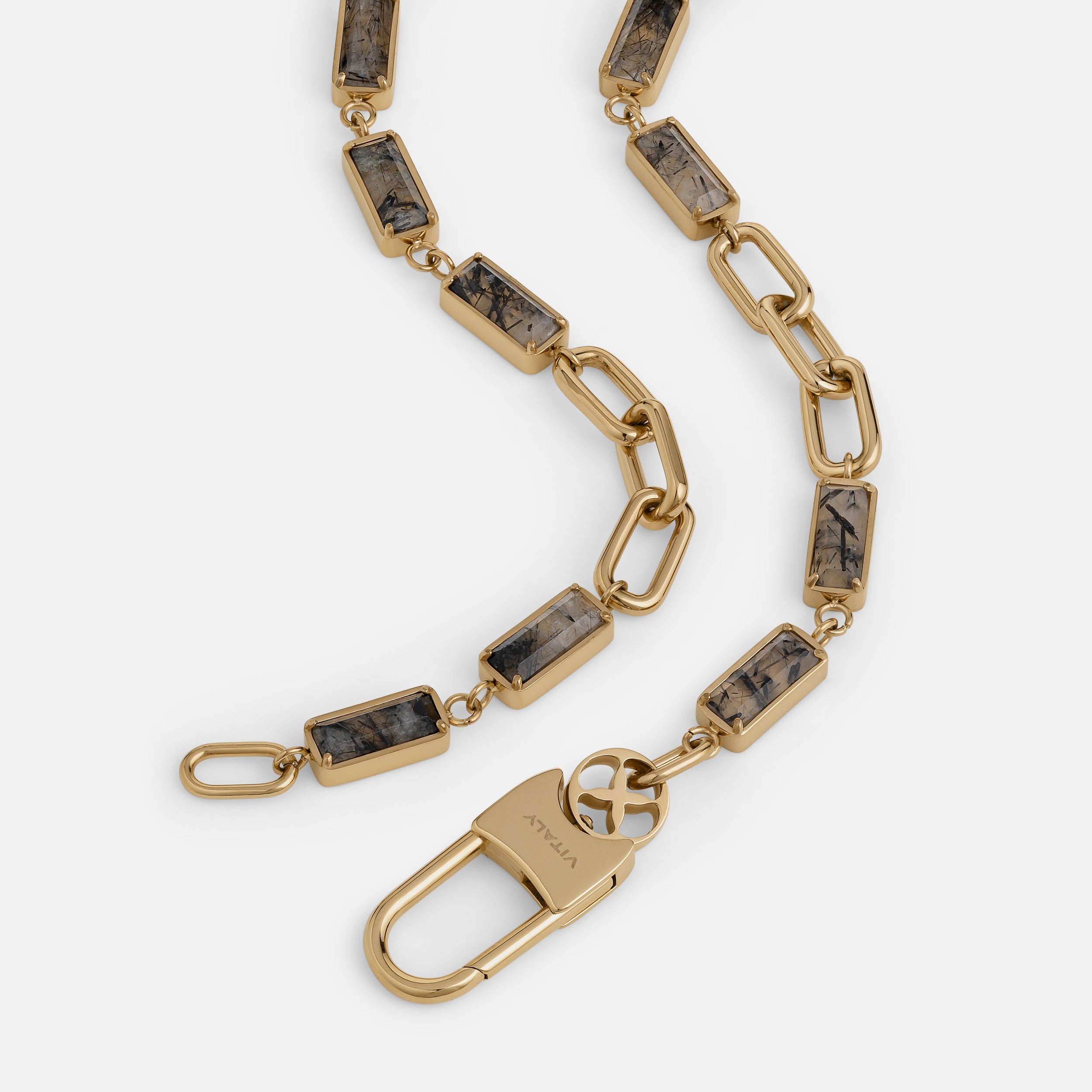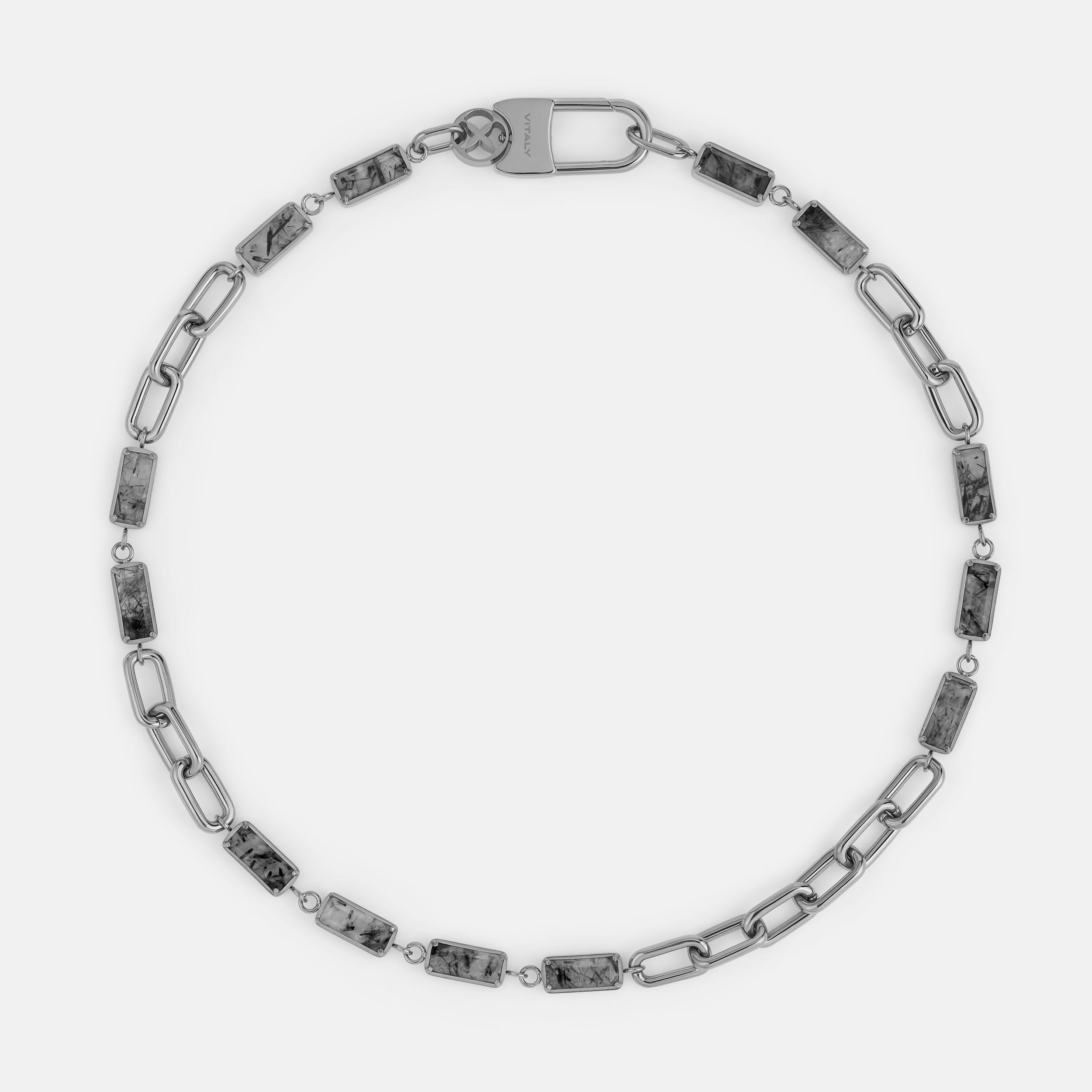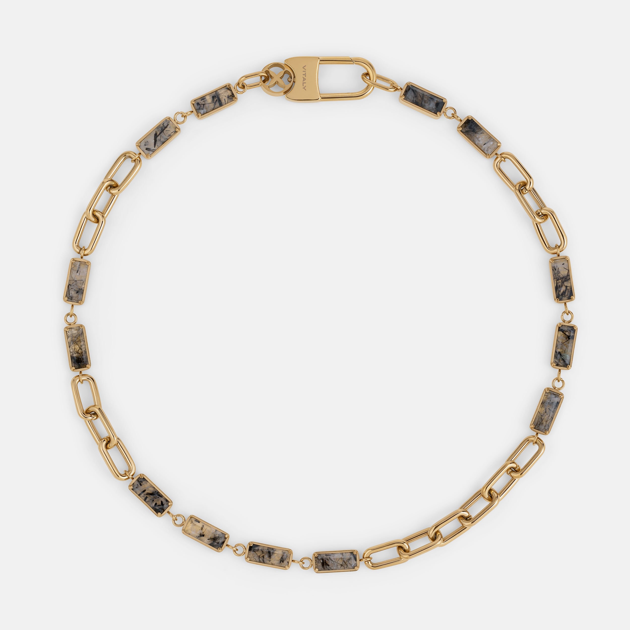 The Encode juxtaposes industrial cable links with sleek. faceted stones. Featuring inlaid quartz or aventurine. this contemporary chain adapts classical gemstone jewelry for a new age.