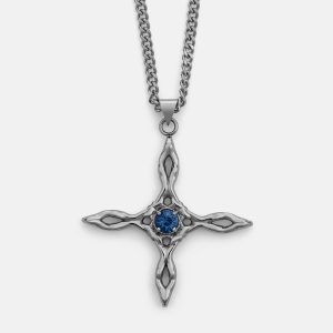 The Equilibrium is a symbol of balance. The symmetrical. cross-shaped pendant looks as though it has melted under flames. though in its centre. a blue glass crystal shimmers like a piece of ice. Representing both fire and water and good and evil. this piece is your reminder that it’s all about moderation.