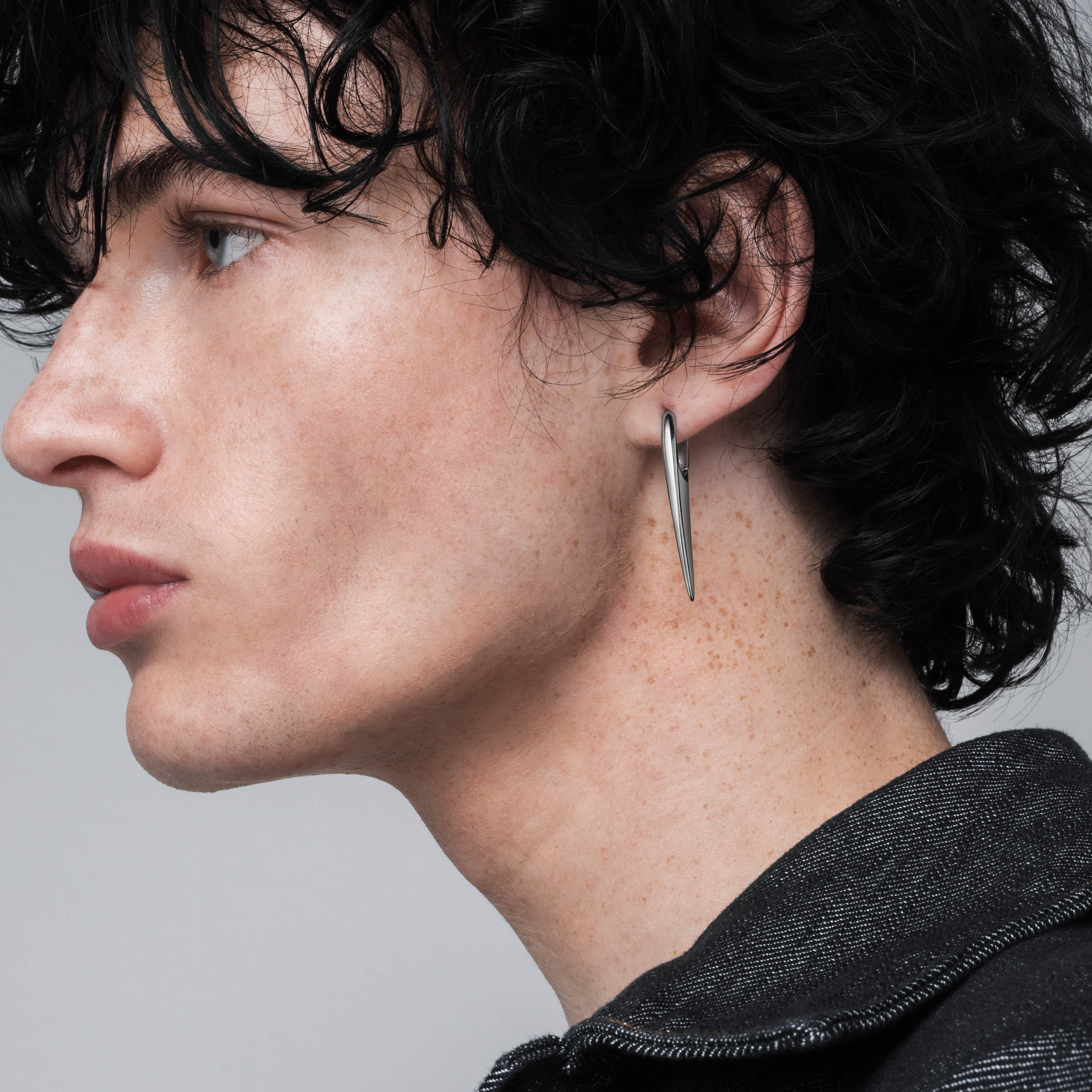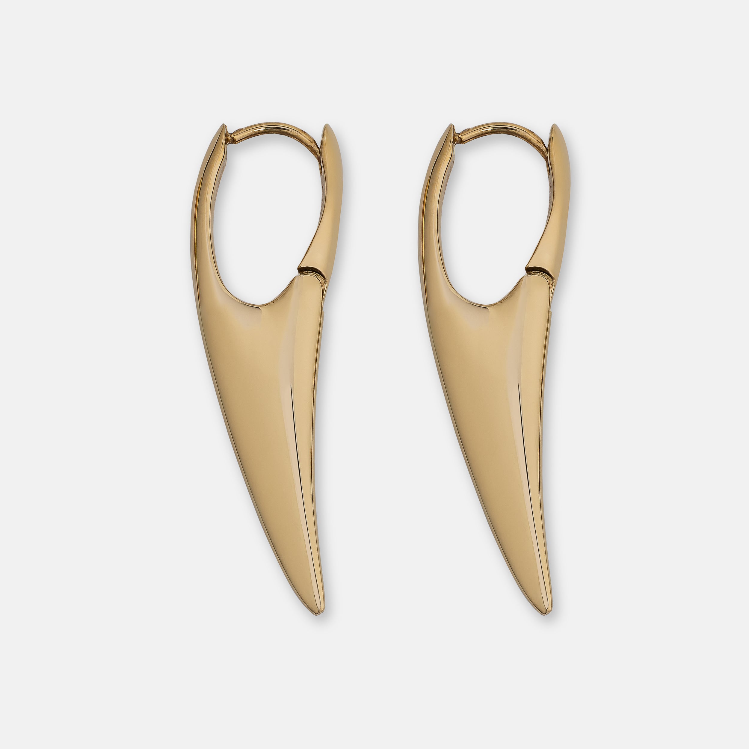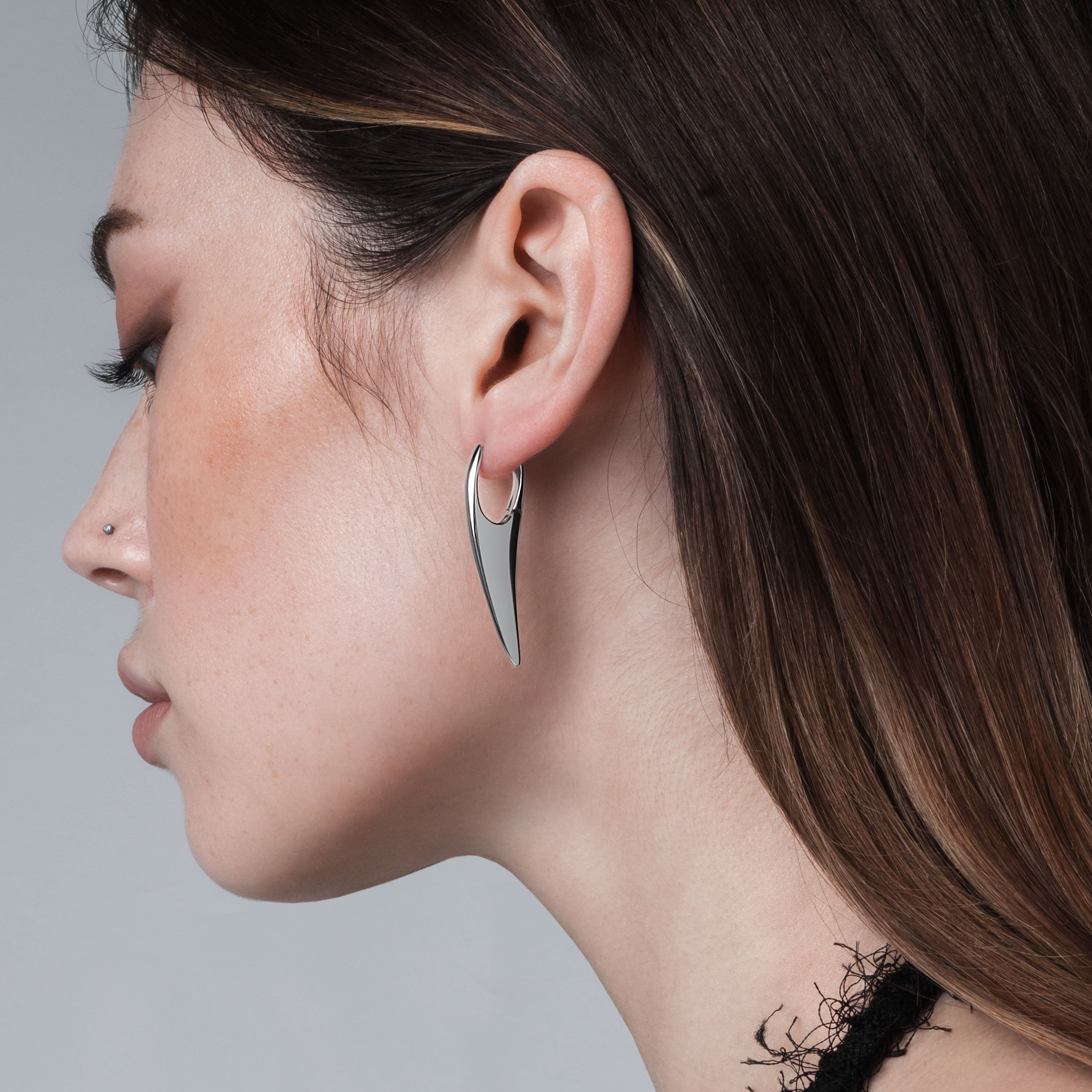 The Faction earrings feature a barbed silhouette that extends into an elongated spike. mirroring the edge of a blade. Finished with a seamless hinge for a sleek fit.