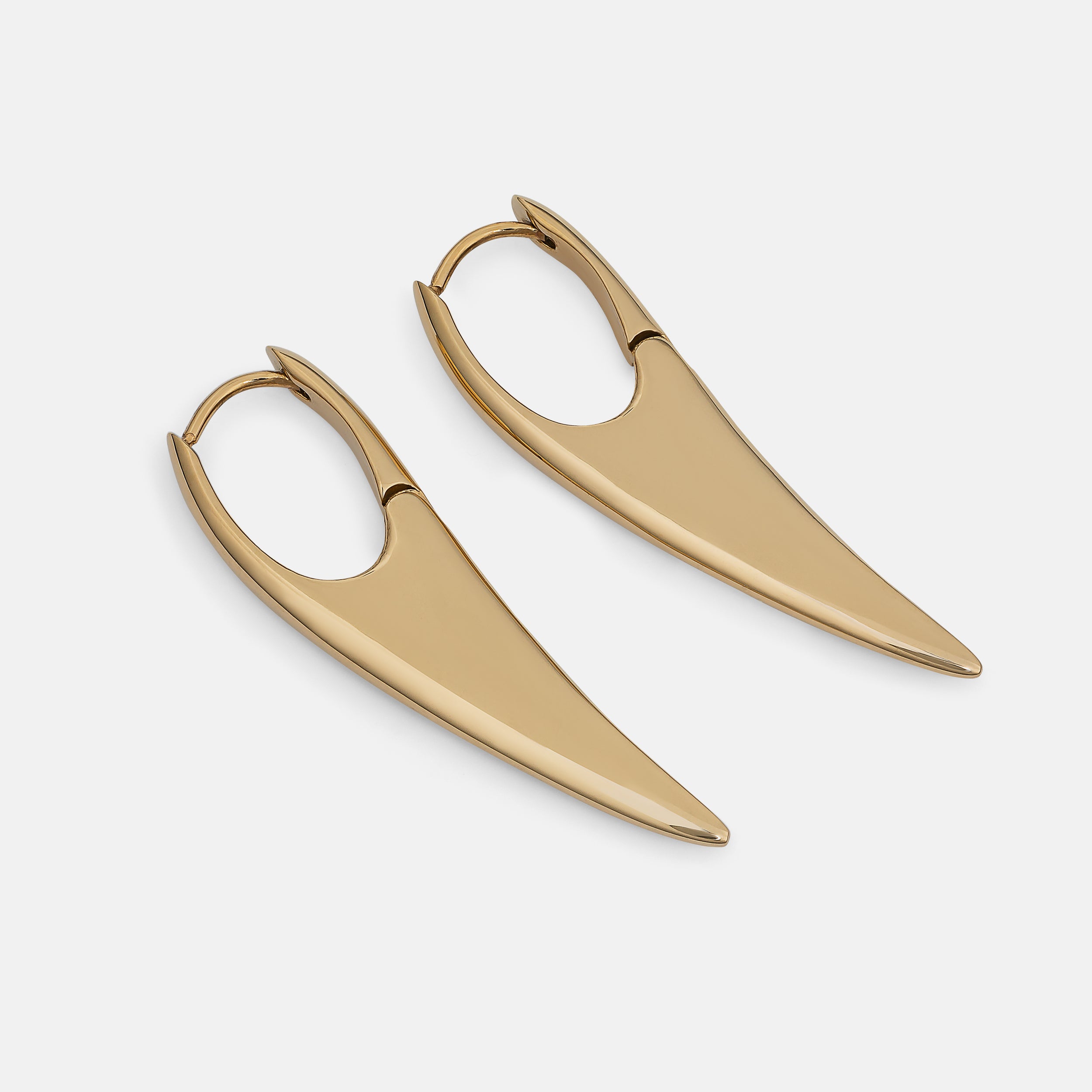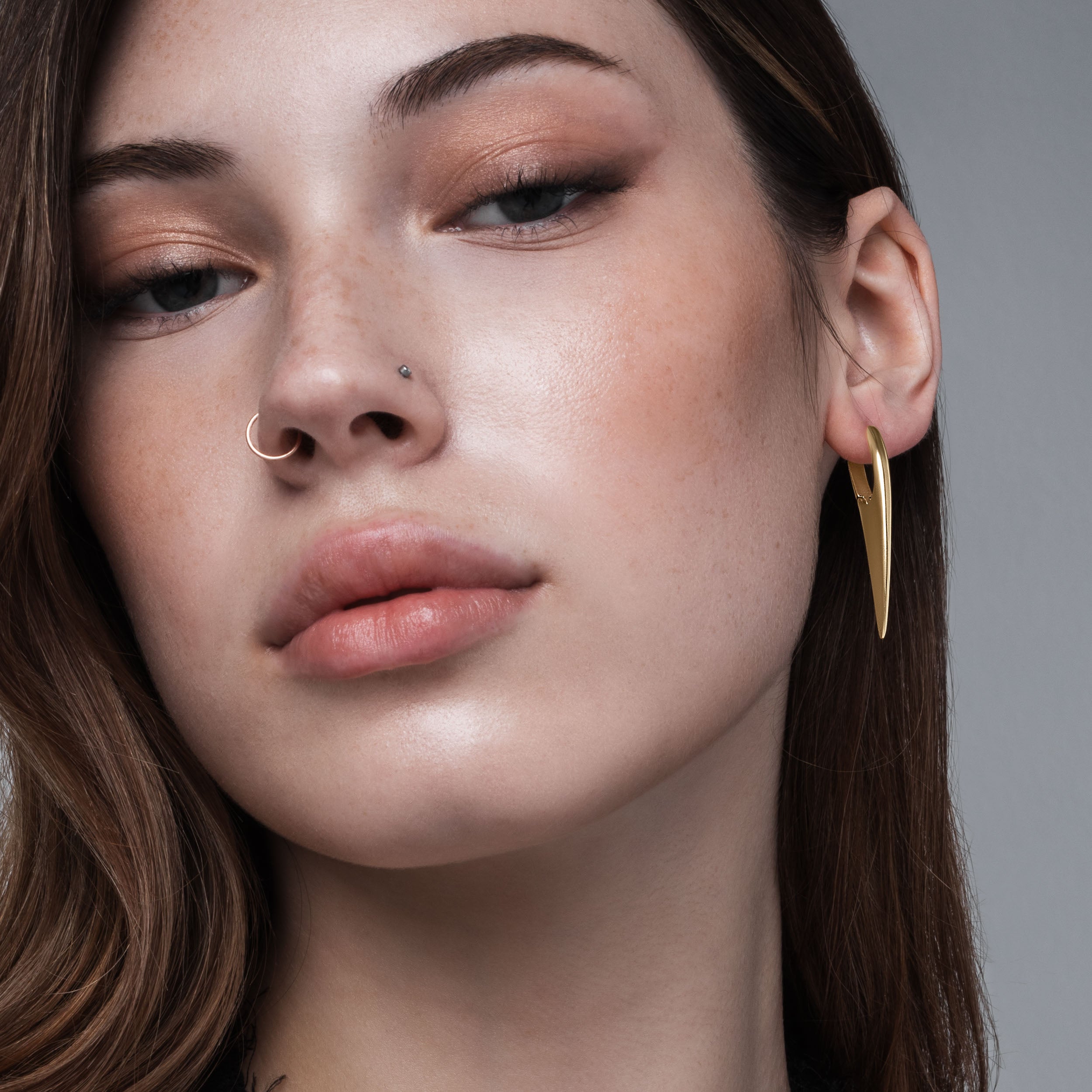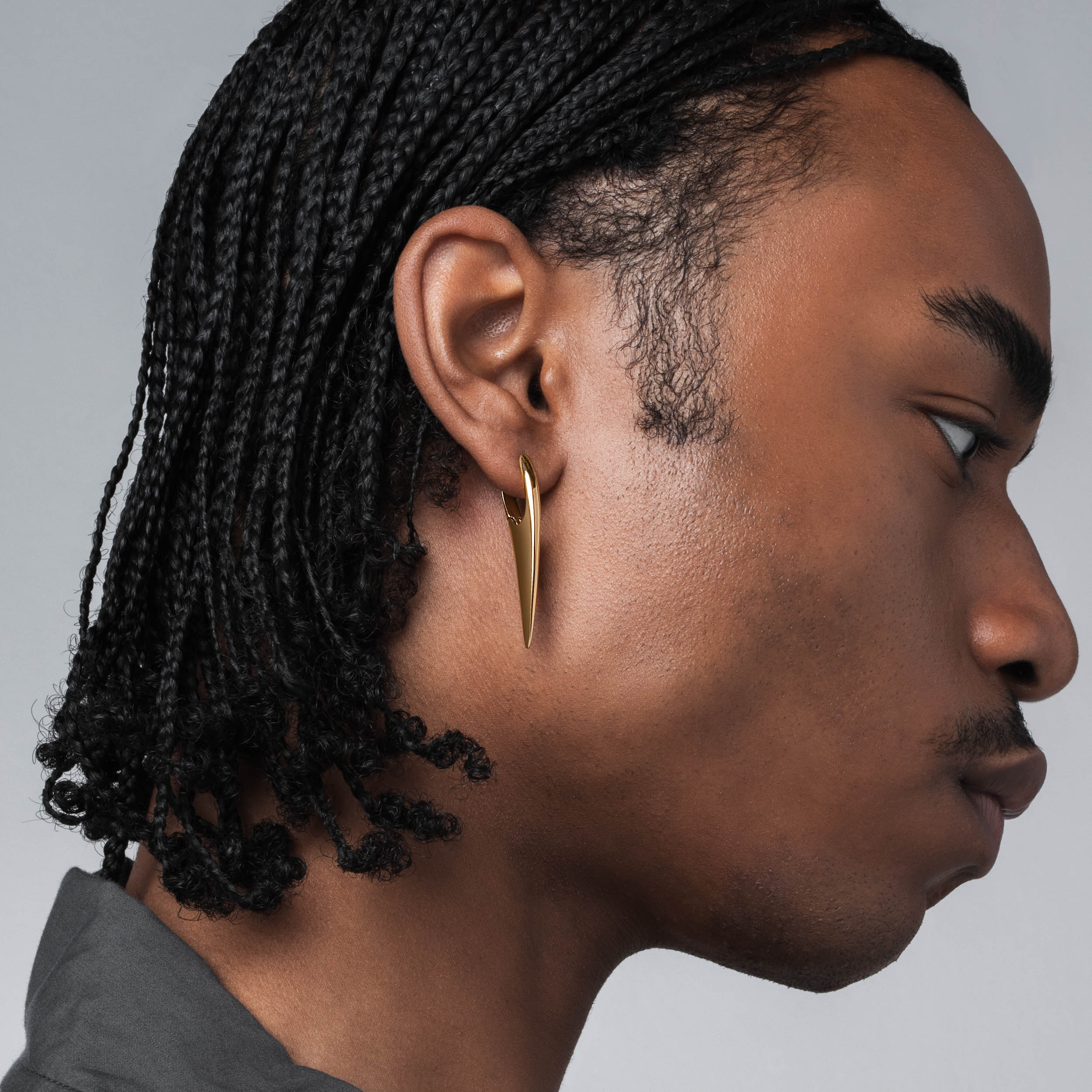 The Faction earrings feature a barbed silhouette that extends into an elongated spike. mirroring the edge of a blade. Finished with a seamless hinge for a sleek fit.
