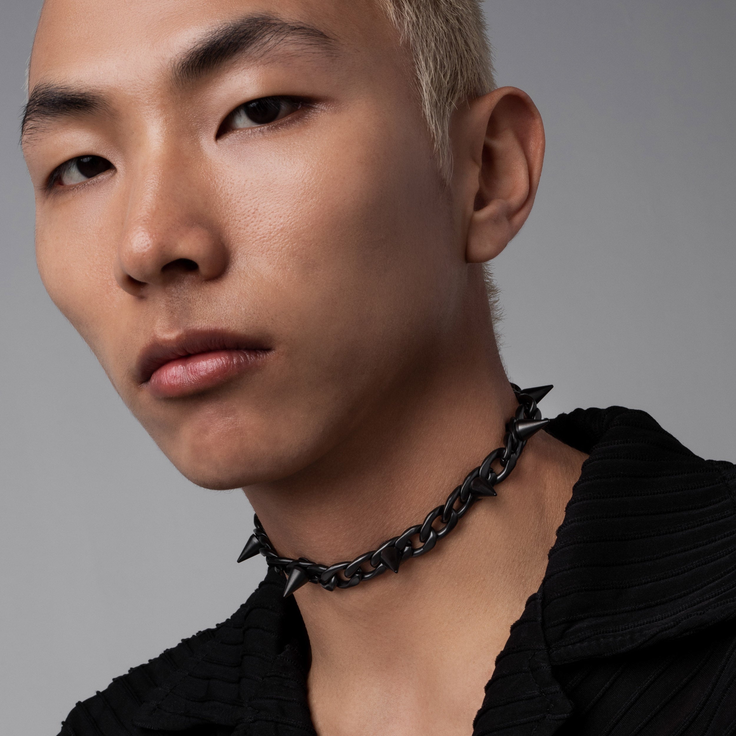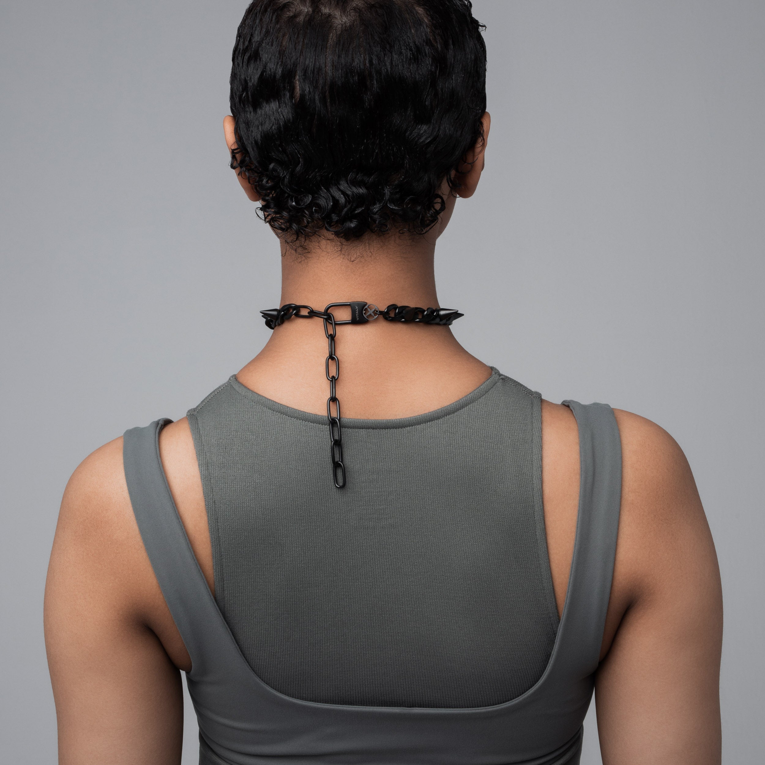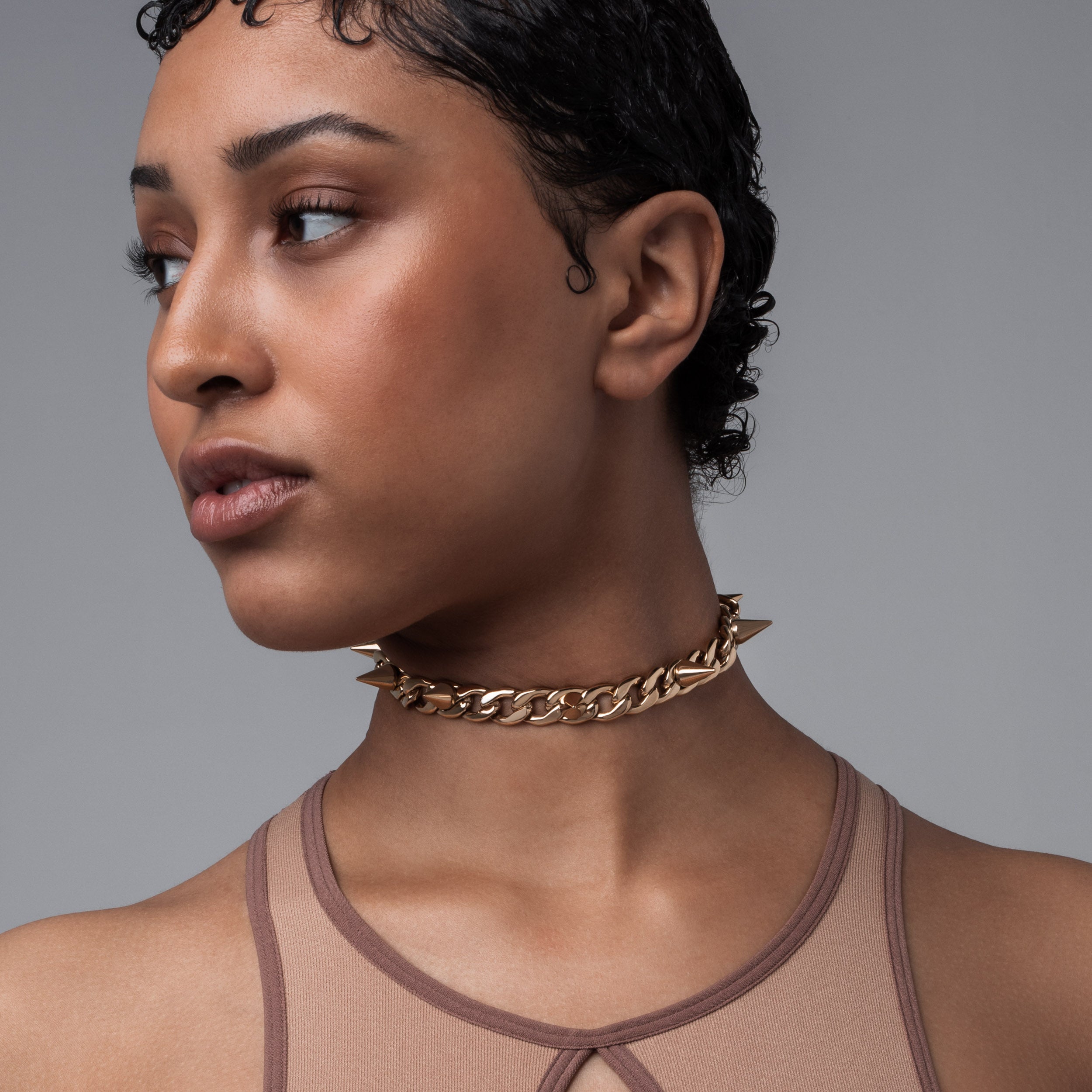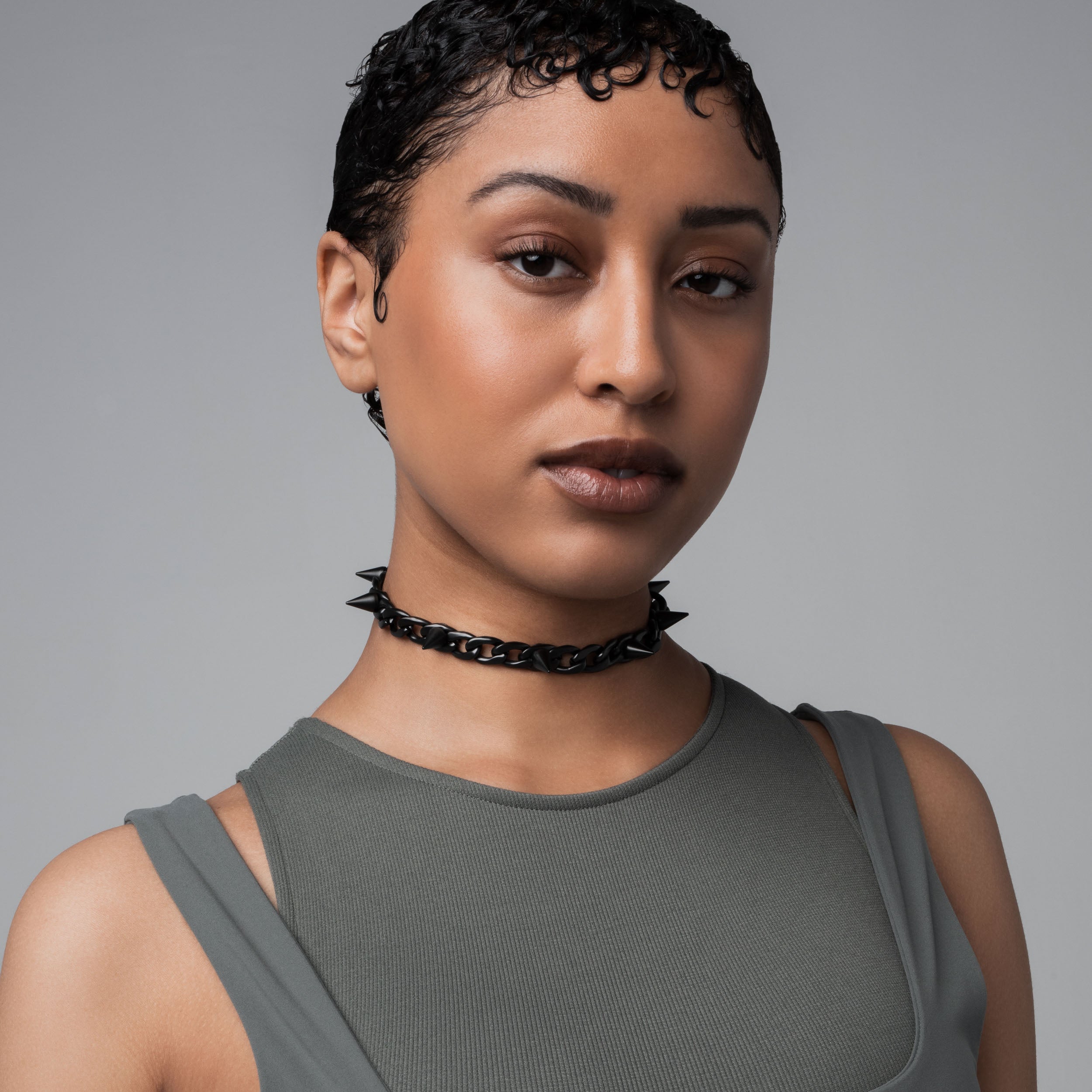 Spiked choker with adjustable sizing chain and signature Glyph carabiner clasp.