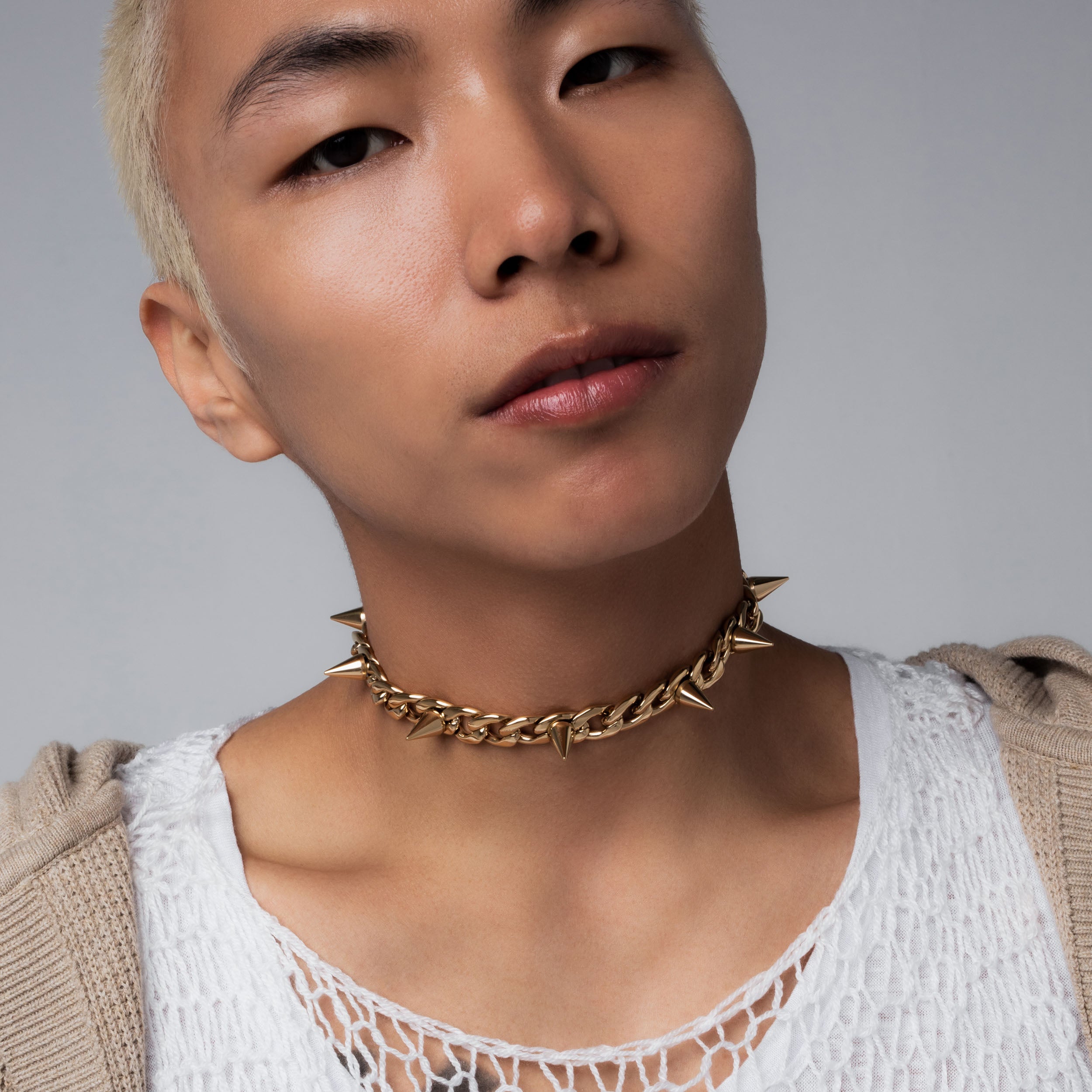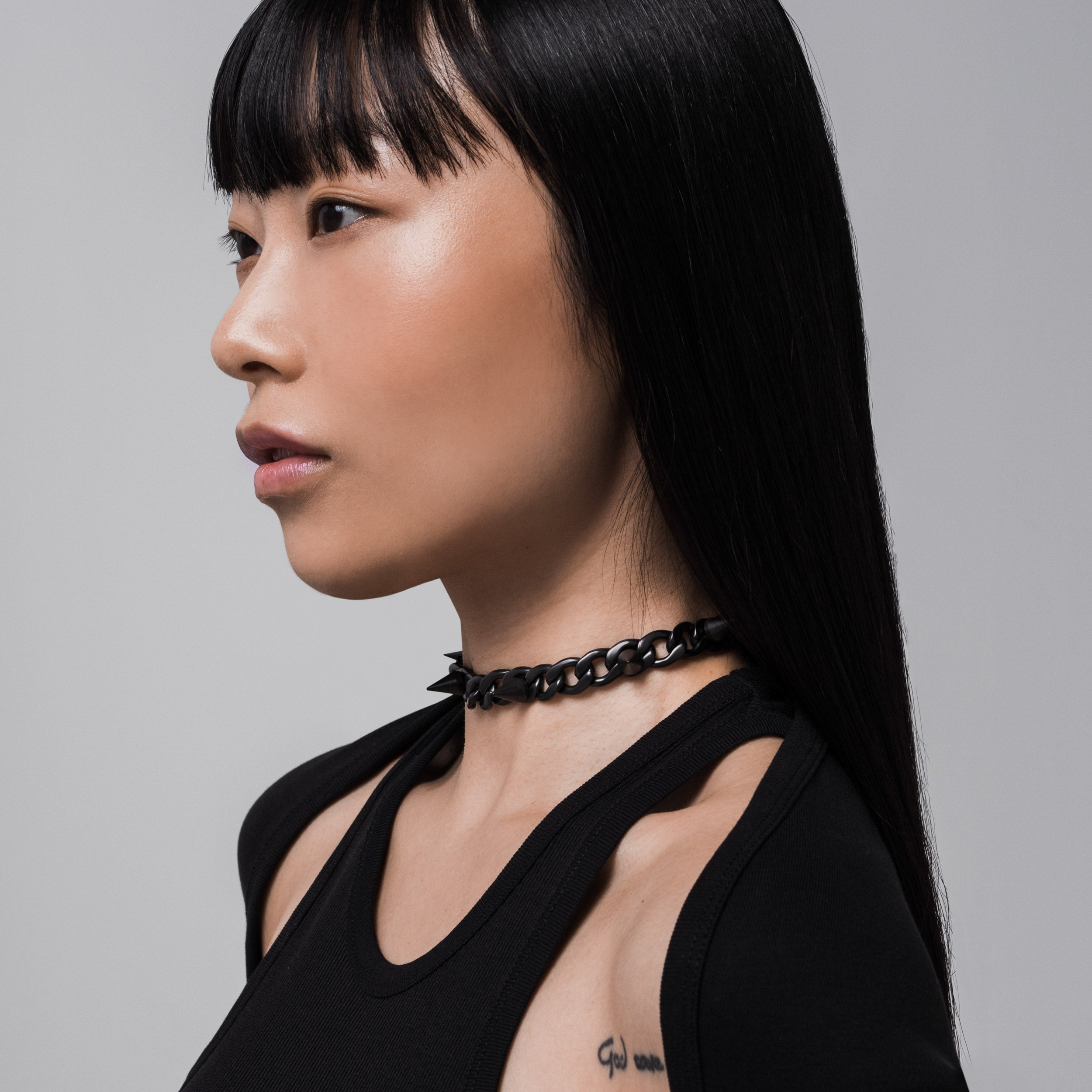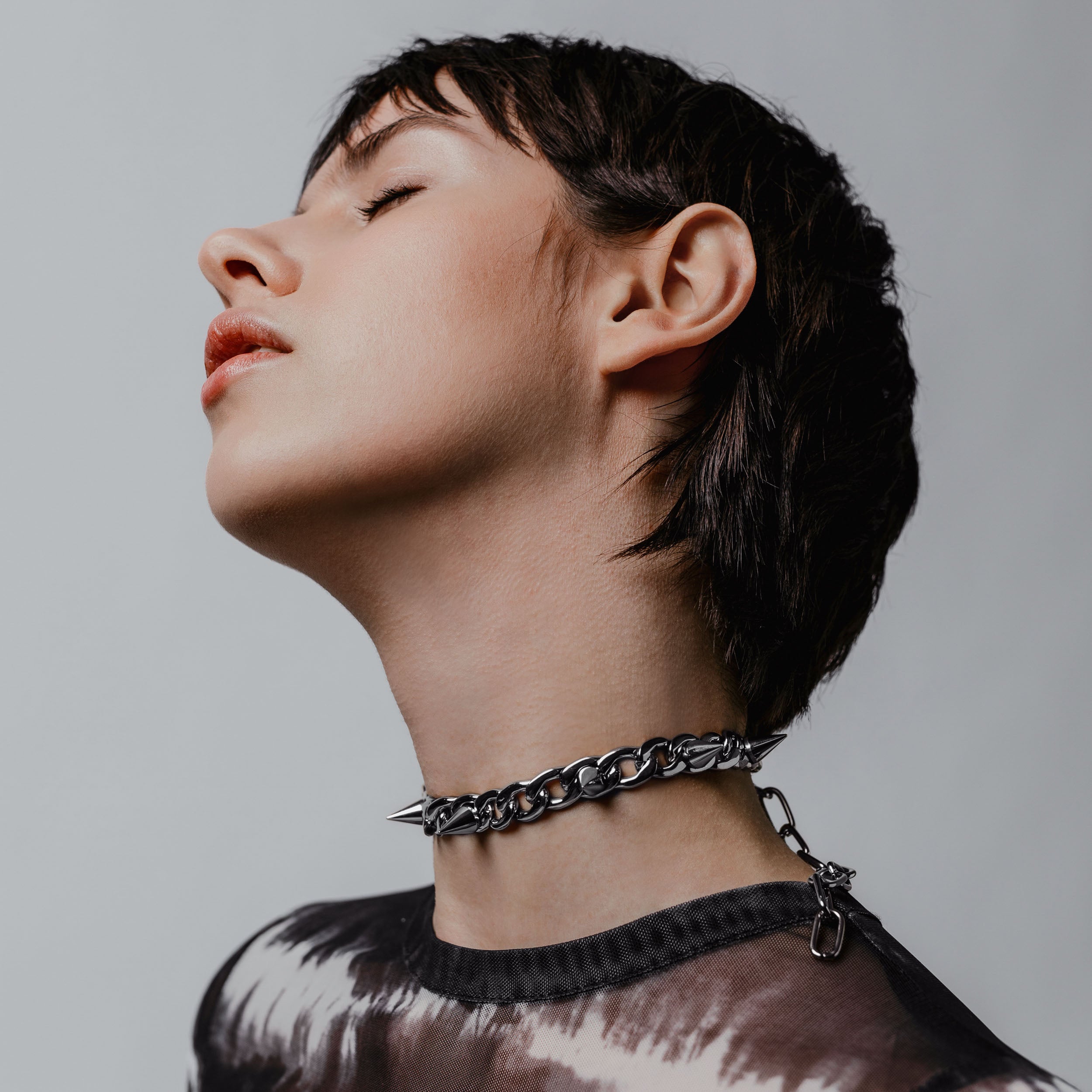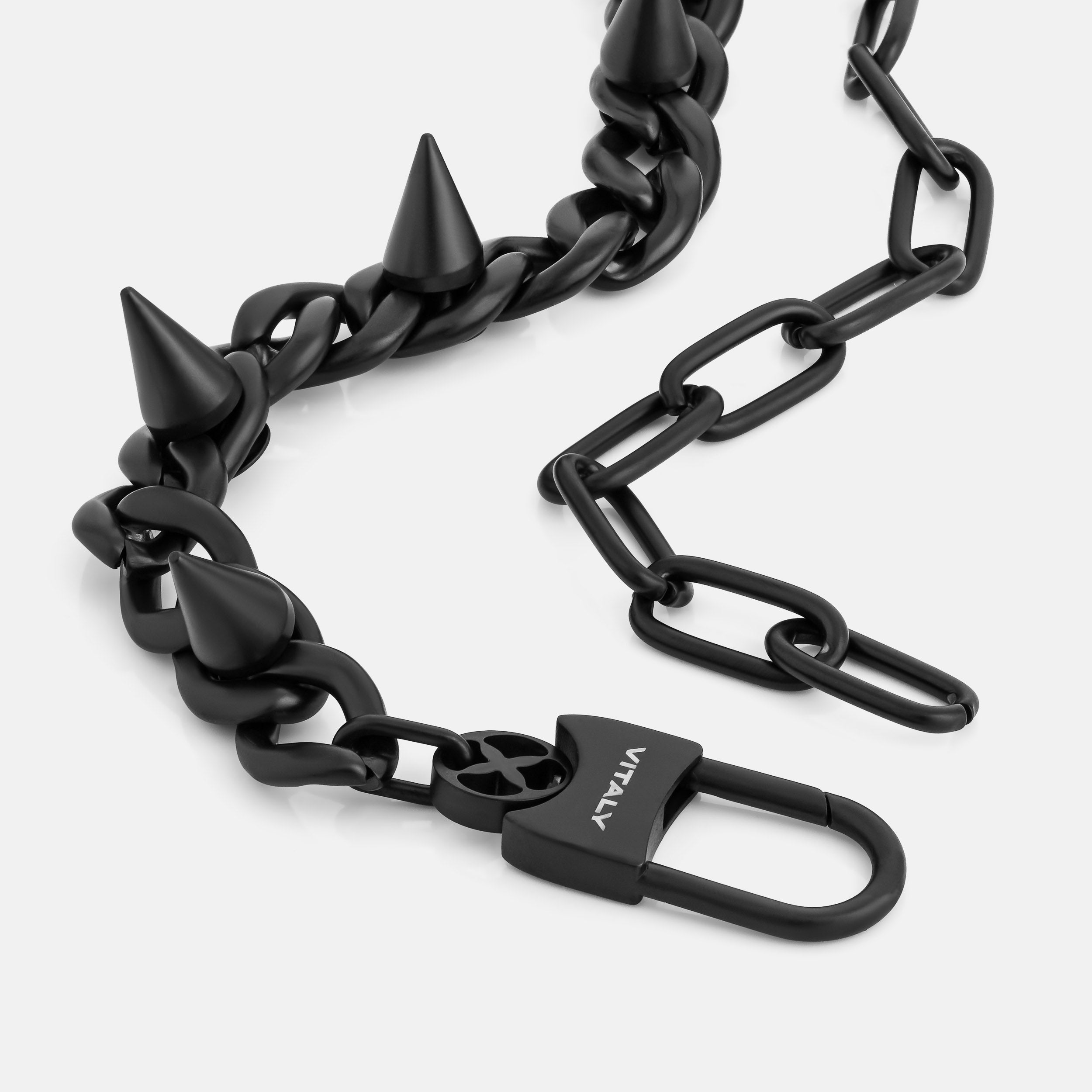 Spiked choker with adjustable sizing chain and signature Glyph carabiner clasp.