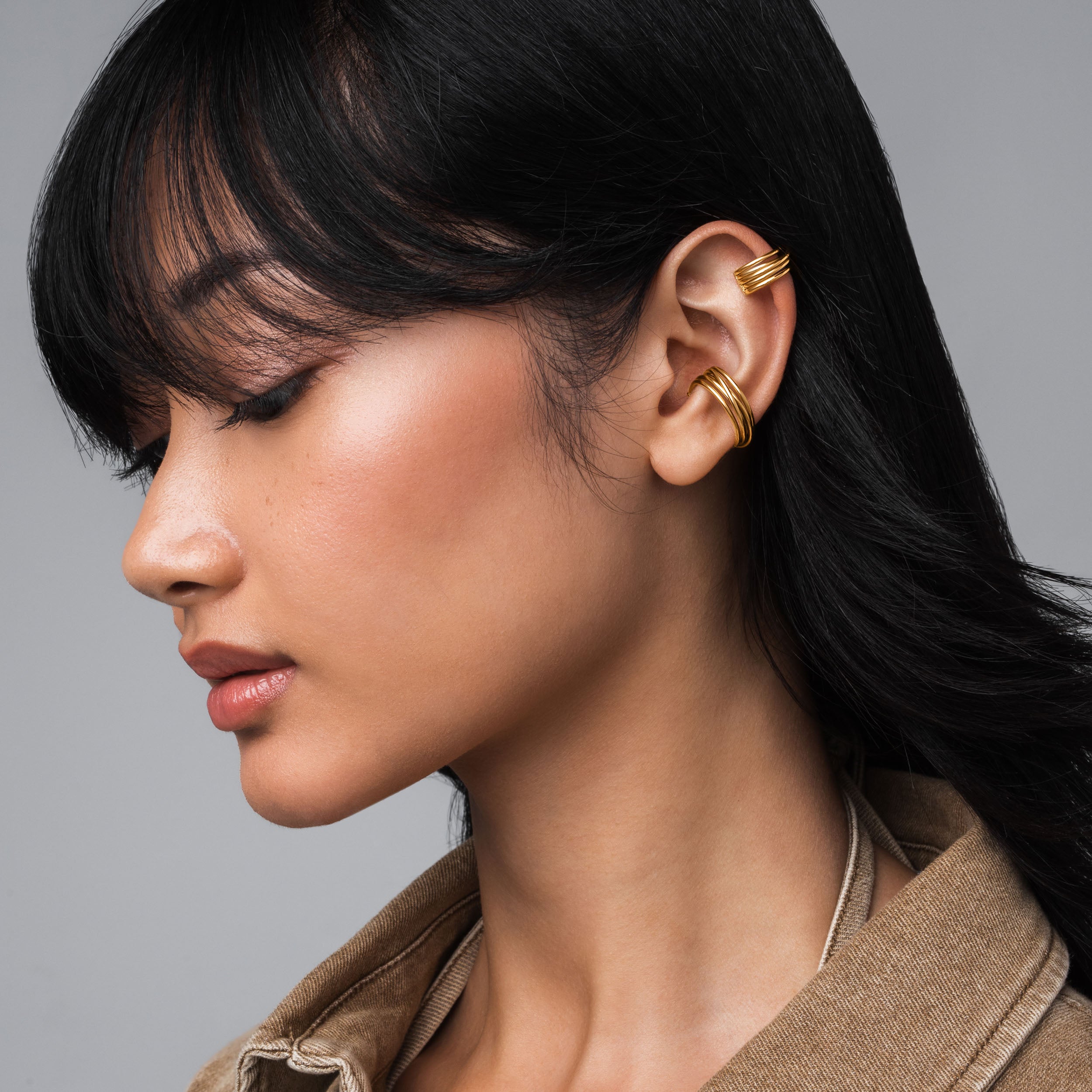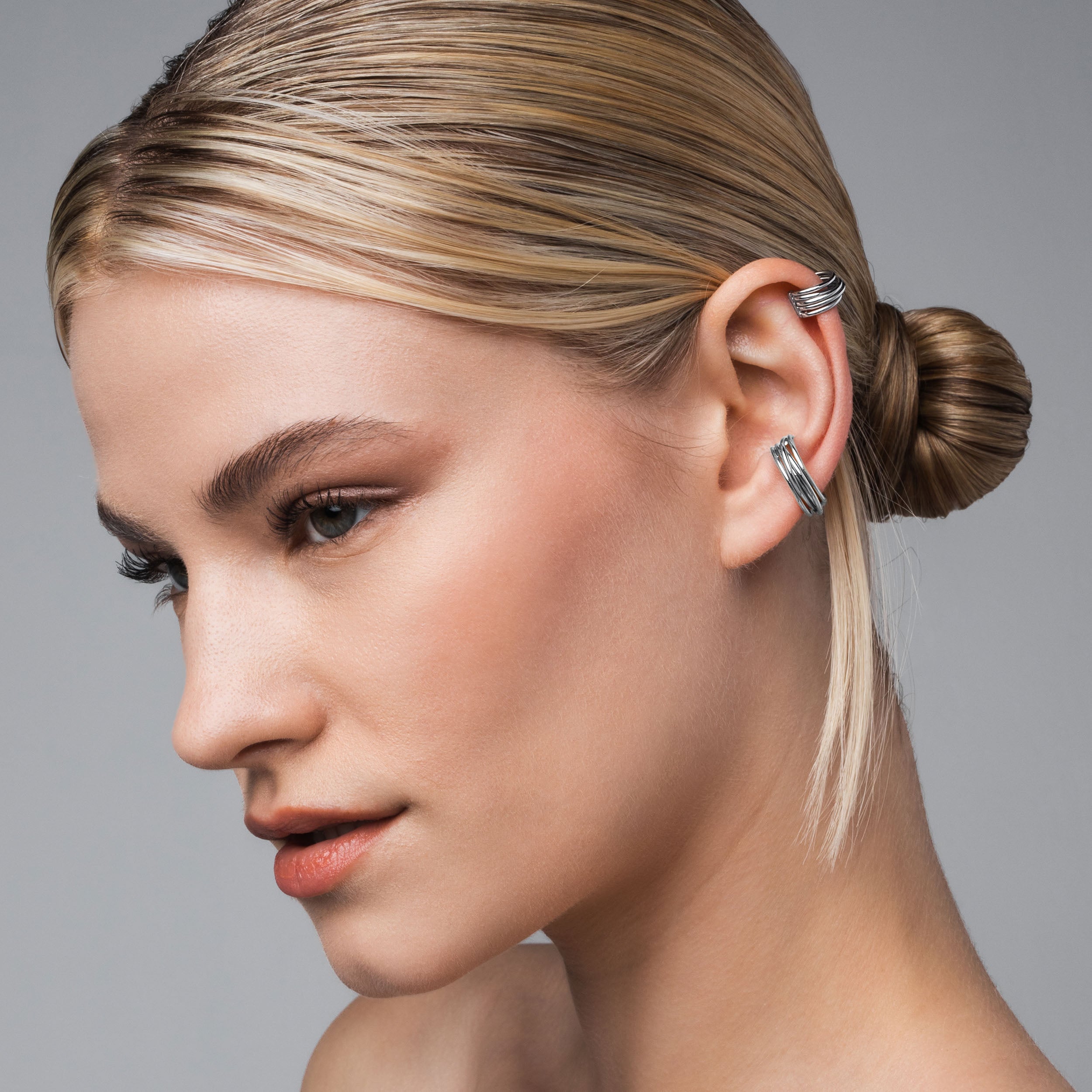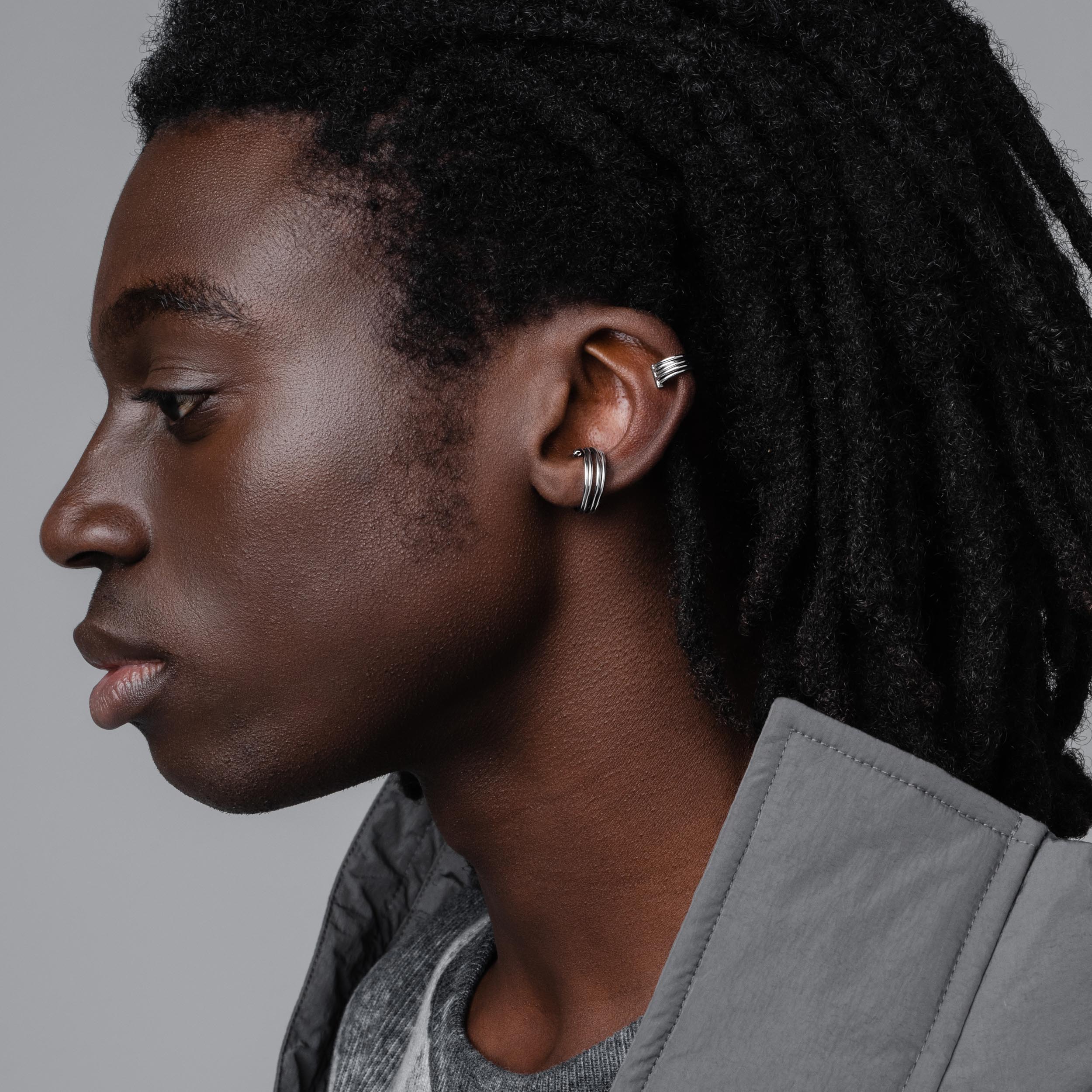 The Frequency is a contemporary ear cuff set marked by concentric rings that produce an orbiting effect. Features two different size cuffs one designed for the upper ear and one for the lower lobe that can be gently bent to accommodate different ear shapes.