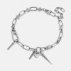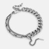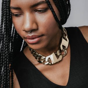 The Fuse is an oversized choker chain marked by substantial links that increase in size before terminating with two heavy-duty buckle clasps at the chain’s front. One clasp can be removed to create a tighter fit.
