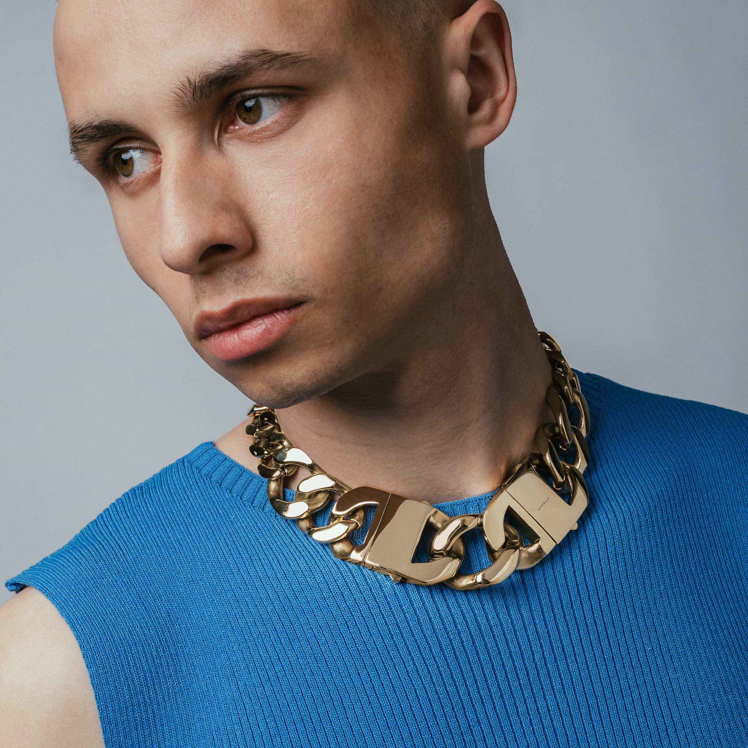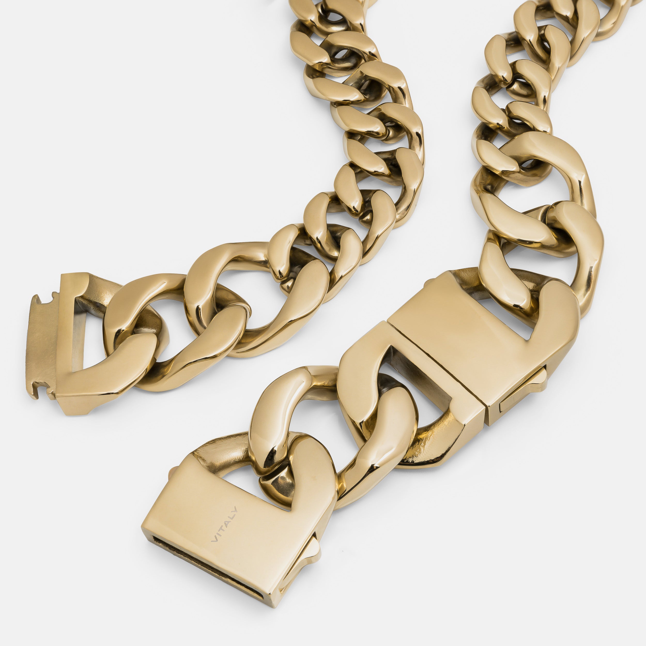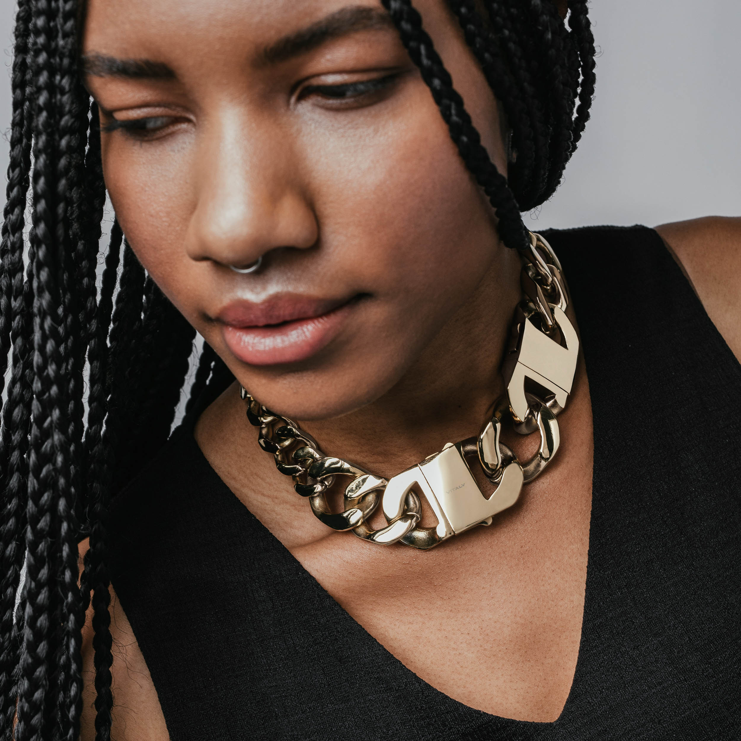 The Fuse is an oversized choker chain marked by substantial links that increase in size before terminating with two heavy-duty buckle clasps at the chain’s front. One clasp can be removed to create a tighter fit.