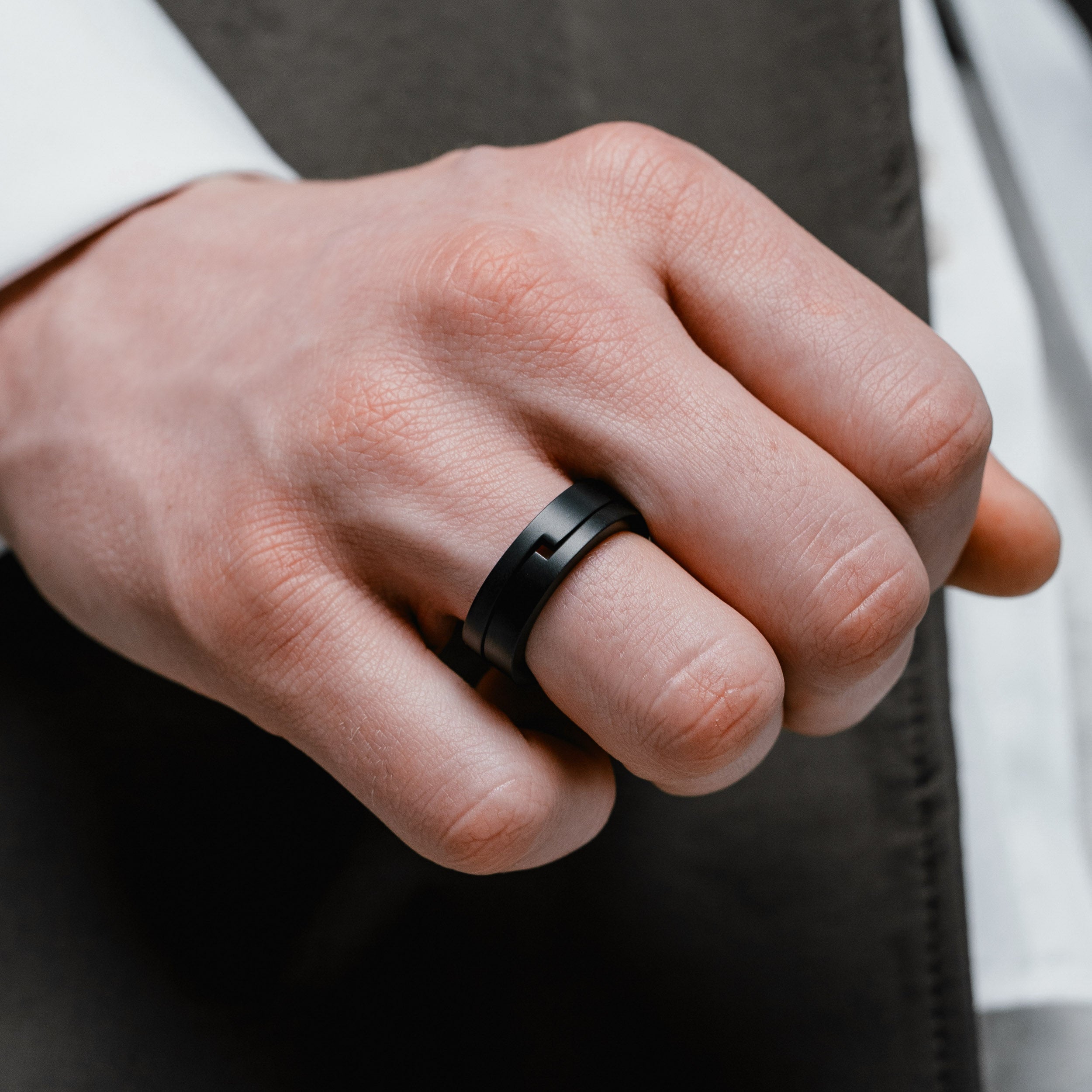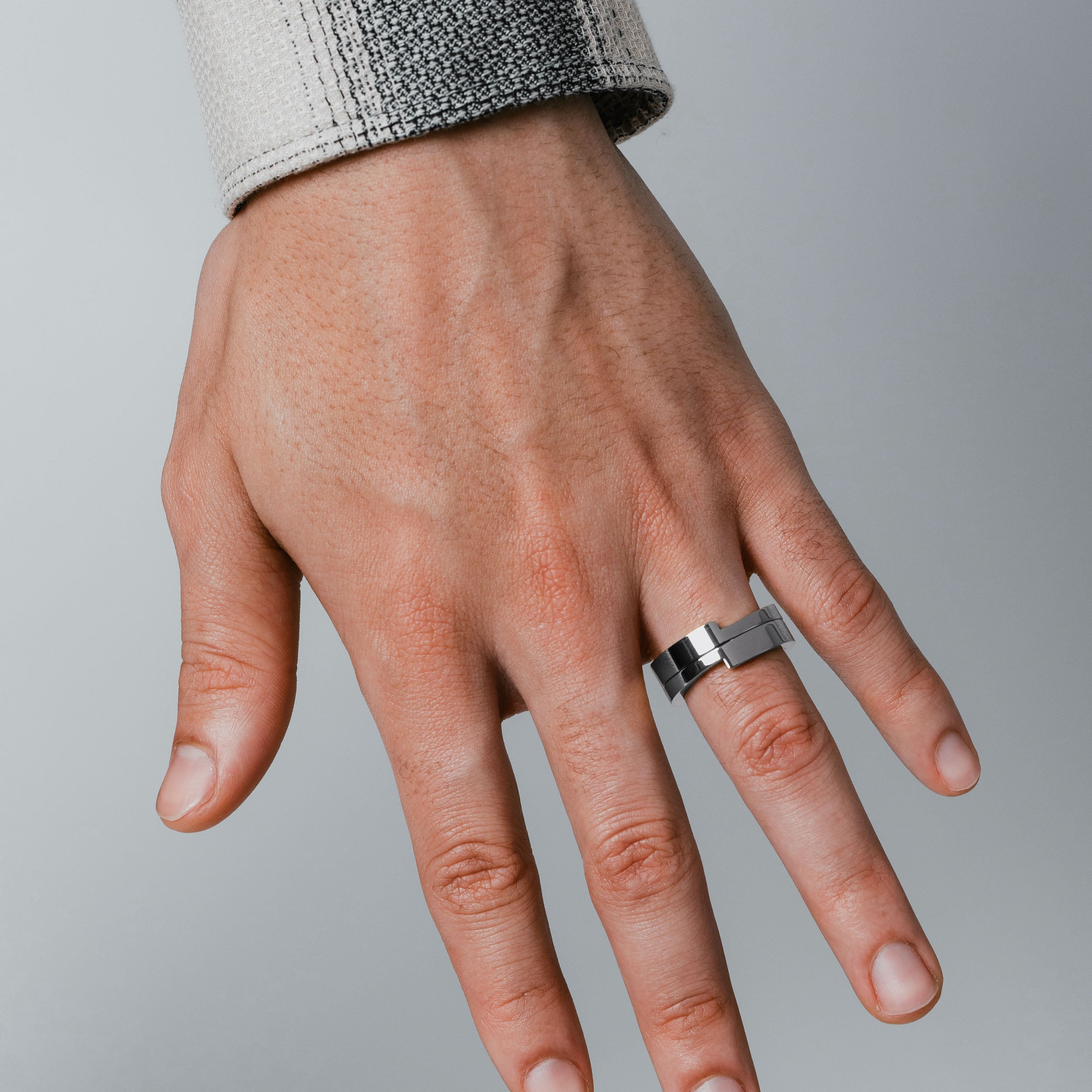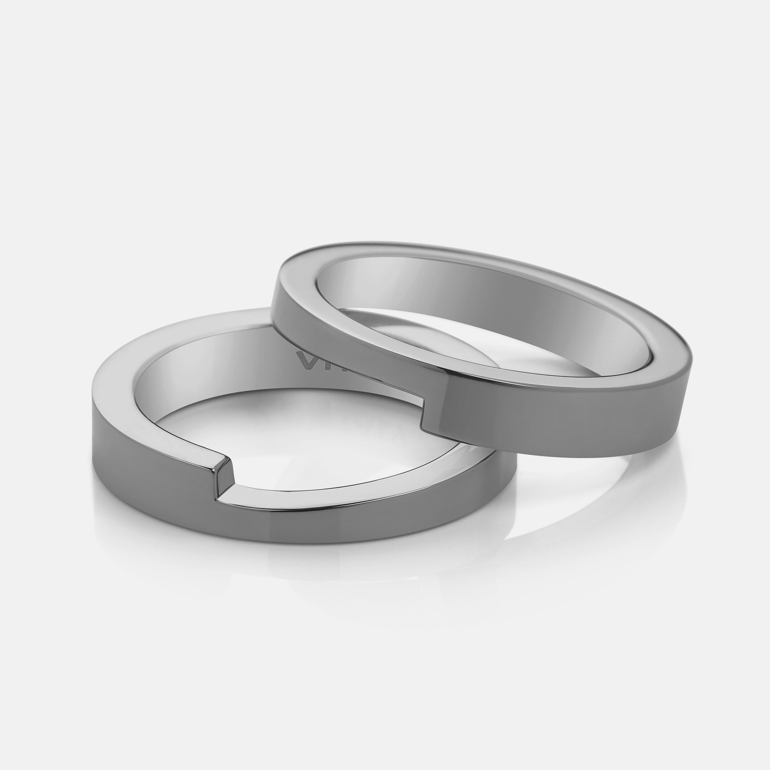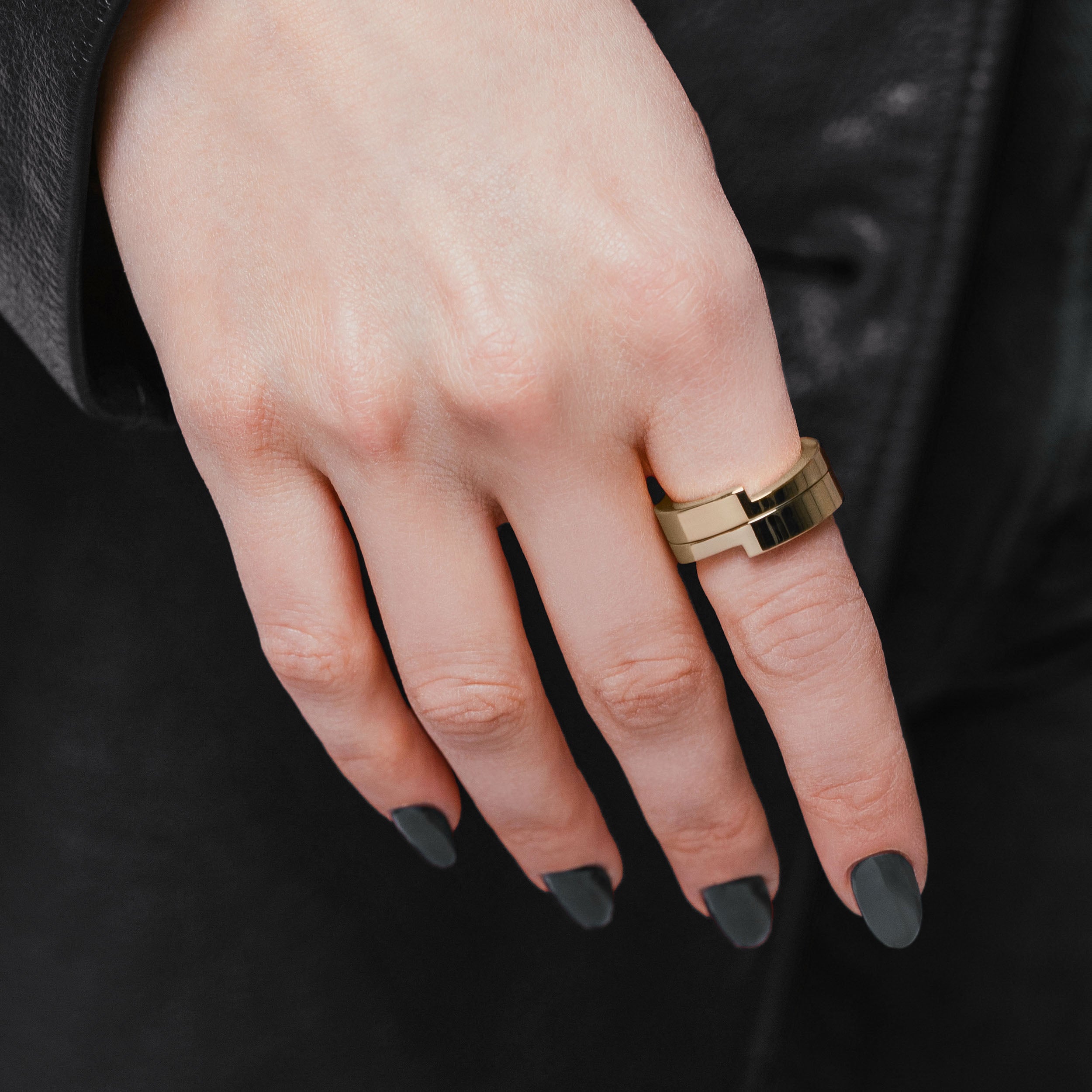 The Gridlok features two interlocking rings that can be worn flush. pulled apart or back-to-back in order to create multiple looks. Each ring is also substantial enough to be worn individually on separate fingers.
