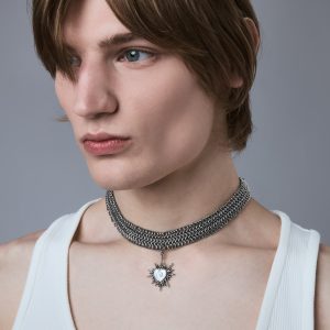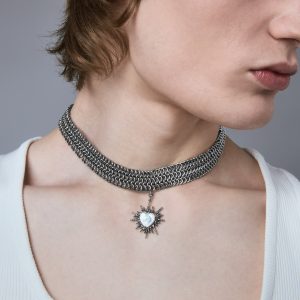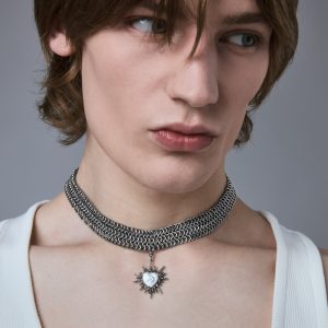 Part of a limited three-piece collection designed in collaboration with the Tenants of HXOUSE C Julieta is a chainmail choker composed of interlocking rings that form a dense. architectural mesh. At its center hangs a jagged. radiant heart charm an abstracted take on sacred heart iconography. reinterpreted through a modern industrial lens.