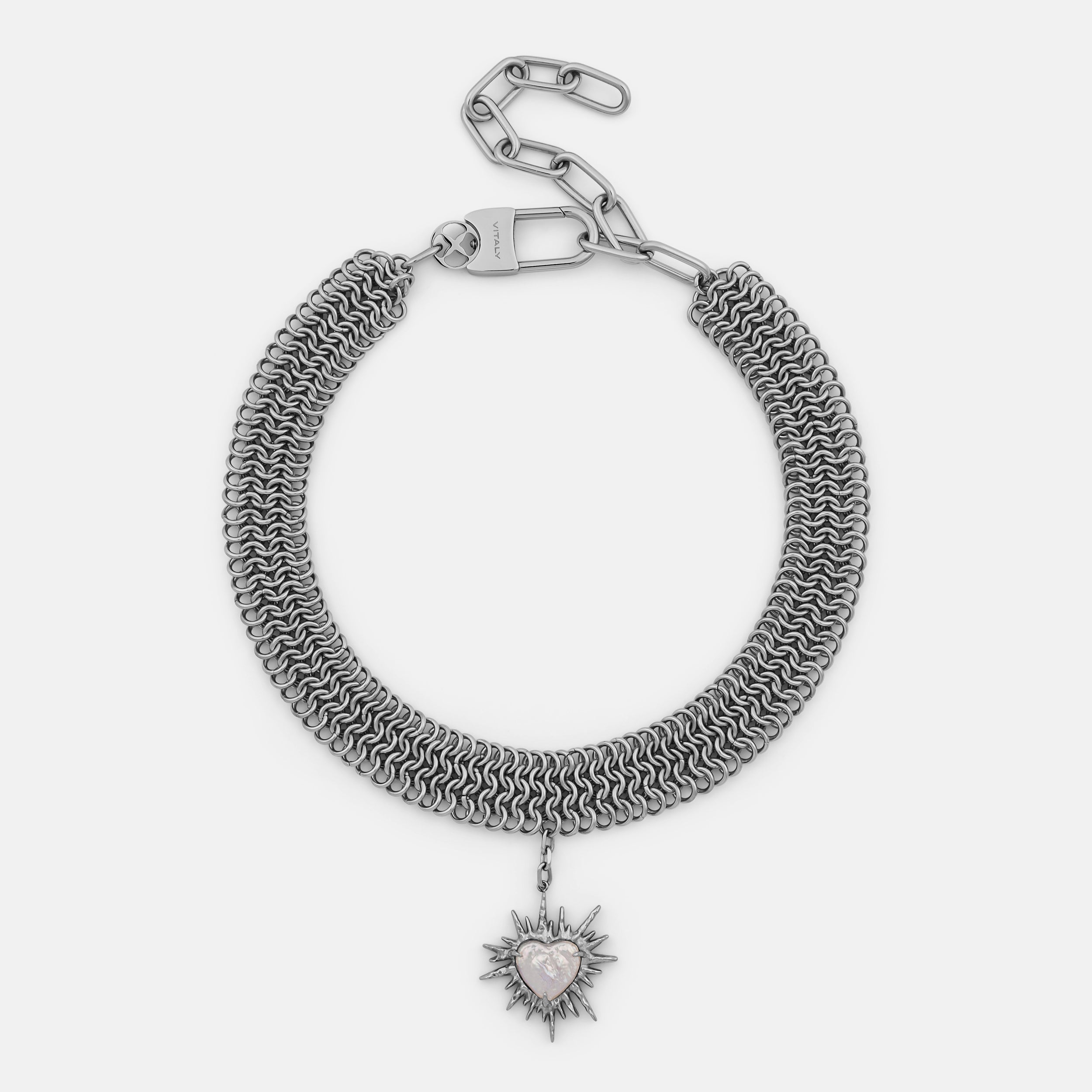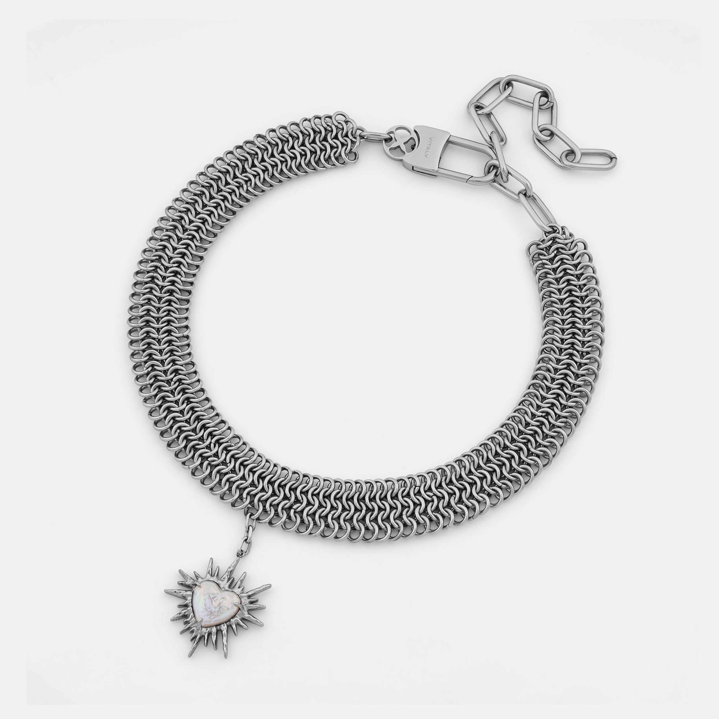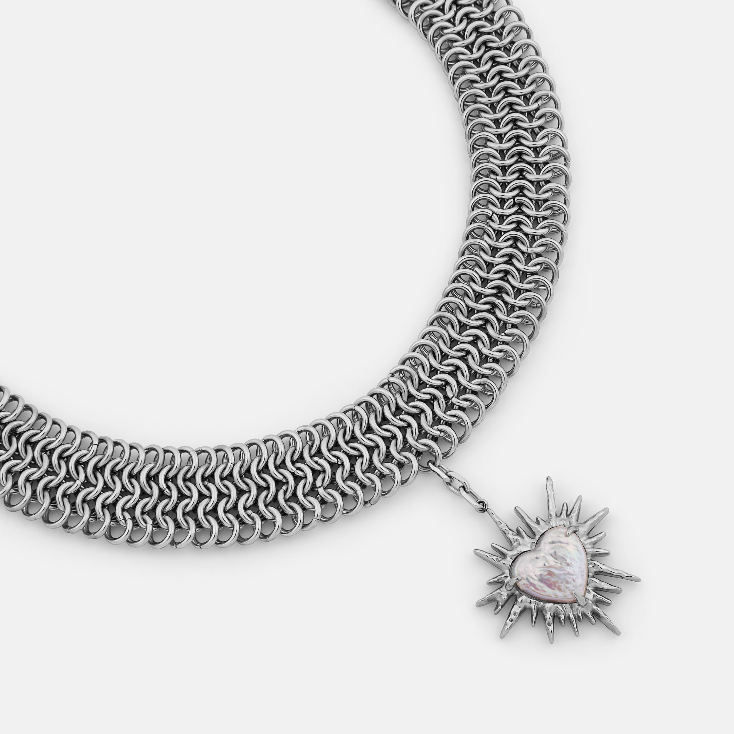 Part of a limited three-piece collection designed in collaboration with the Tenants of HXOUSE C Julieta is a chainmail choker composed of interlocking rings that form a dense. architectural mesh. At its center hangs a jagged. radiant heart charm an abstracted take on sacred heart iconography. reinterpreted through a modern industrial lens.
