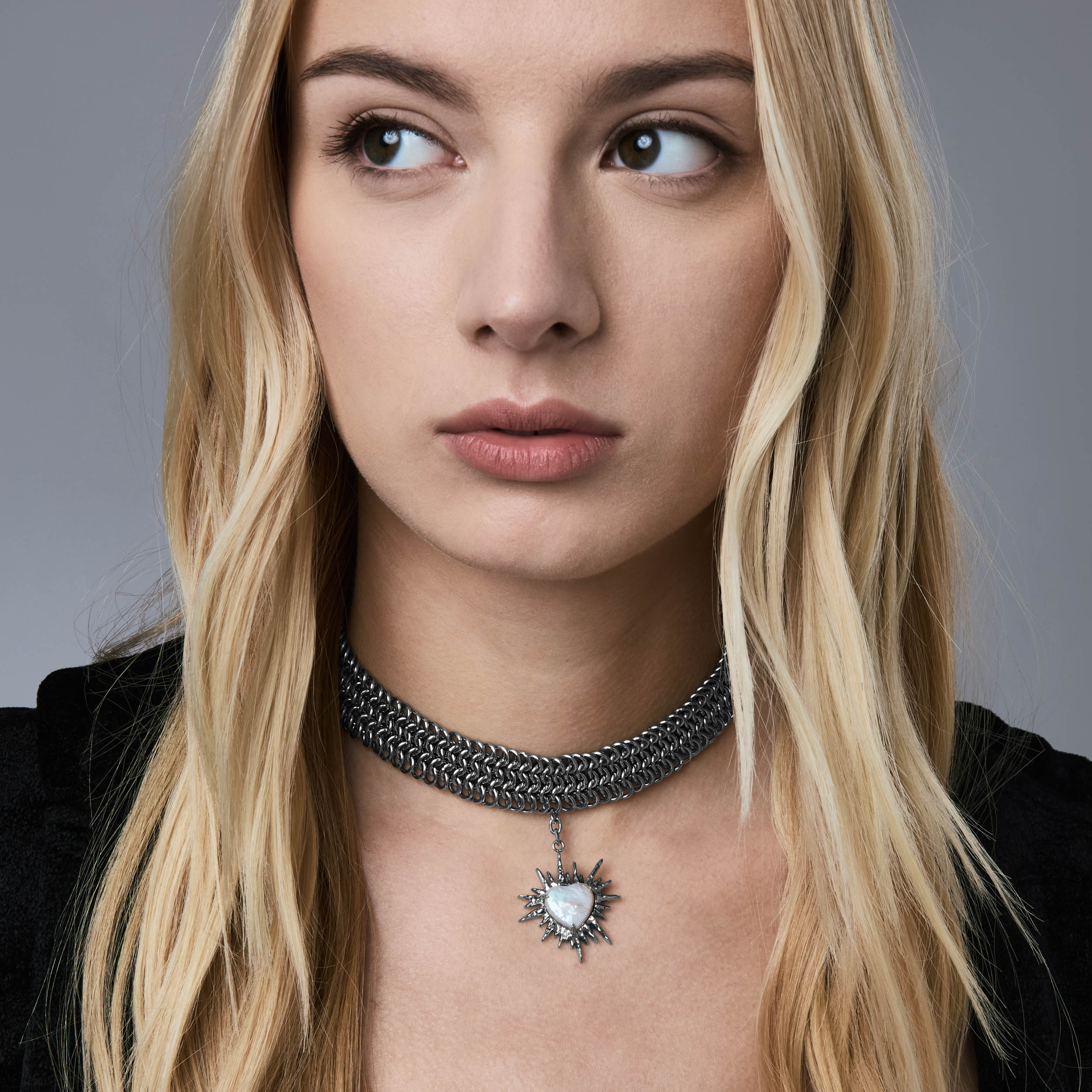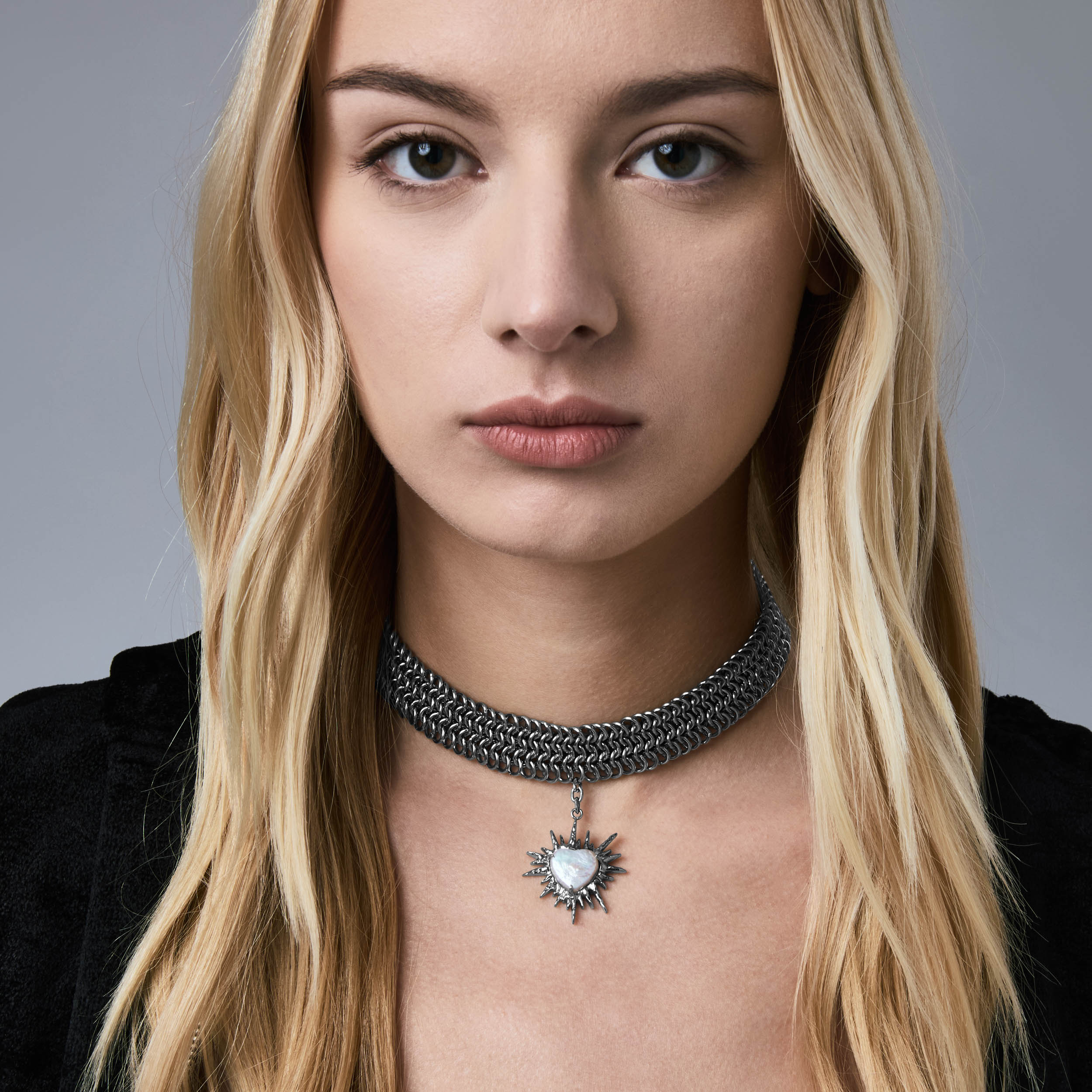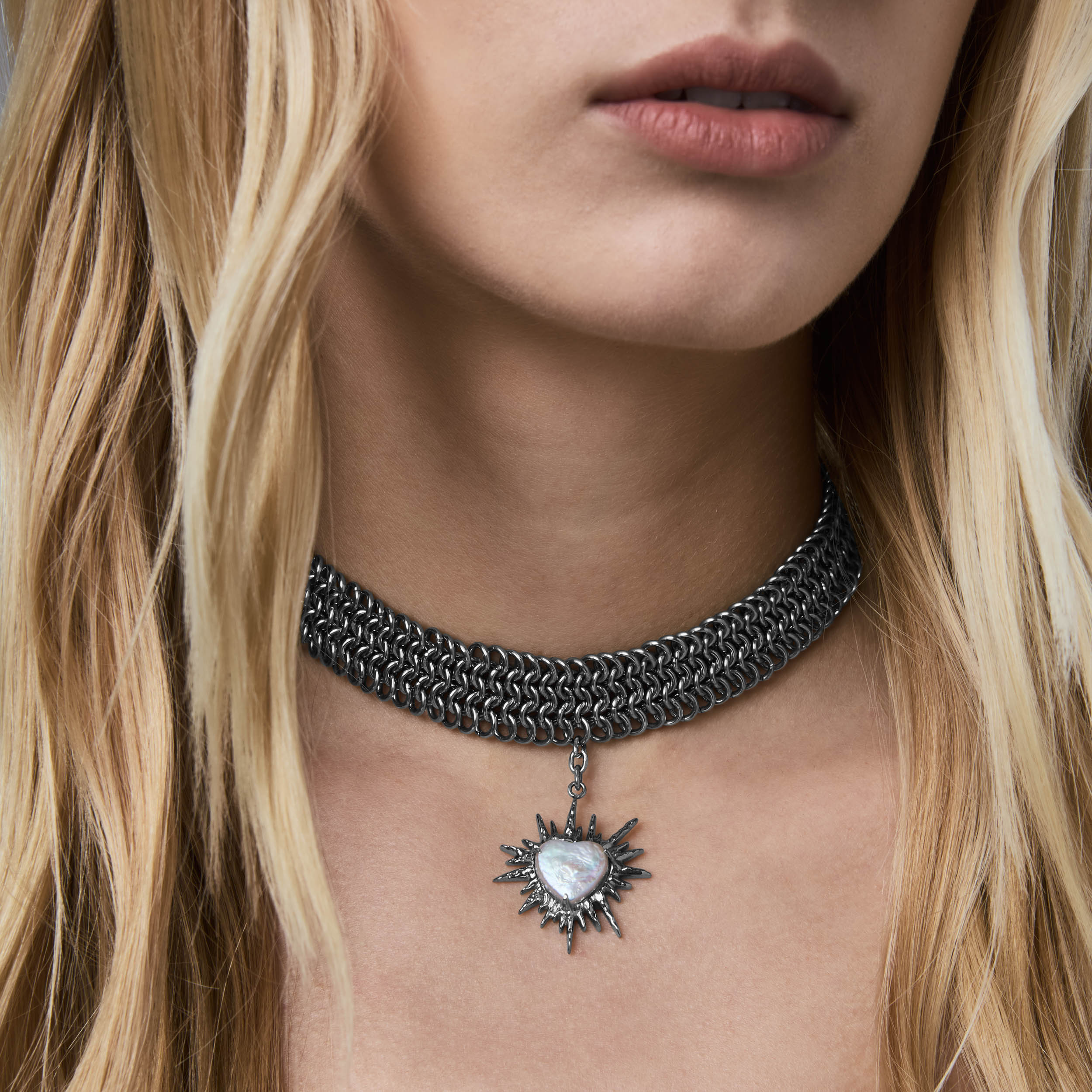 Part of a limited three-piece collection designed in collaboration with the Tenants of HXOUSE C Julieta is a chainmail choker composed of interlocking rings that form a dense. architectural mesh. At its center hangs a jagged. radiant heart charm an abstracted take on sacred heart iconography. reinterpreted through a modern industrial lens.