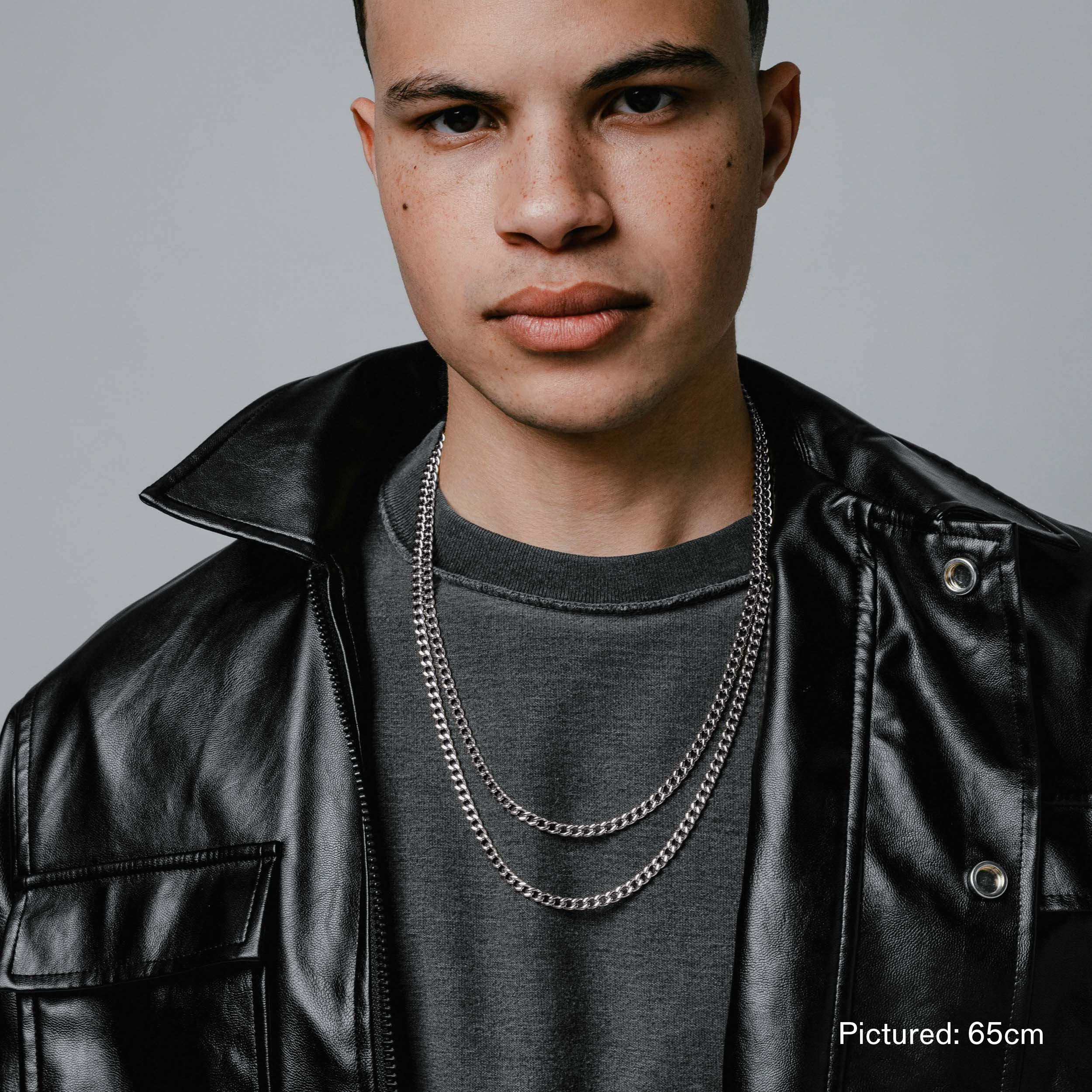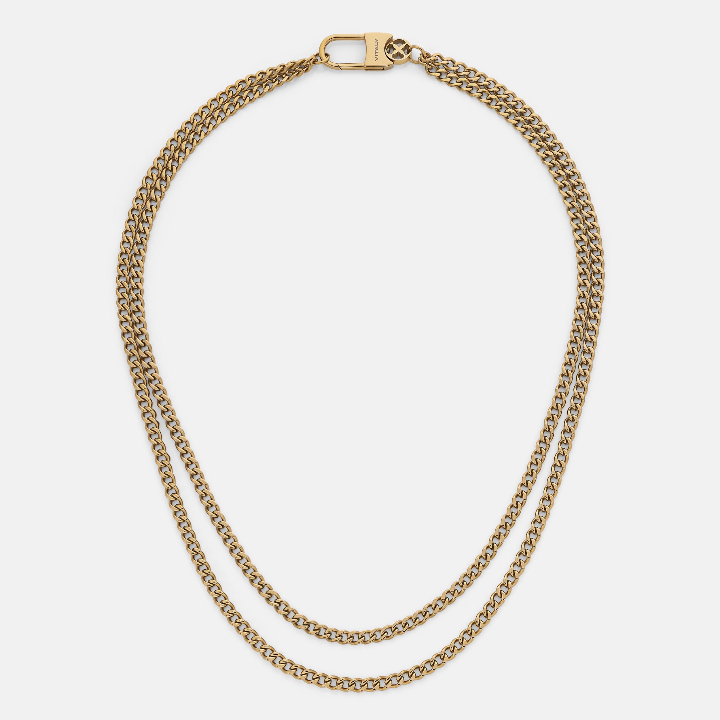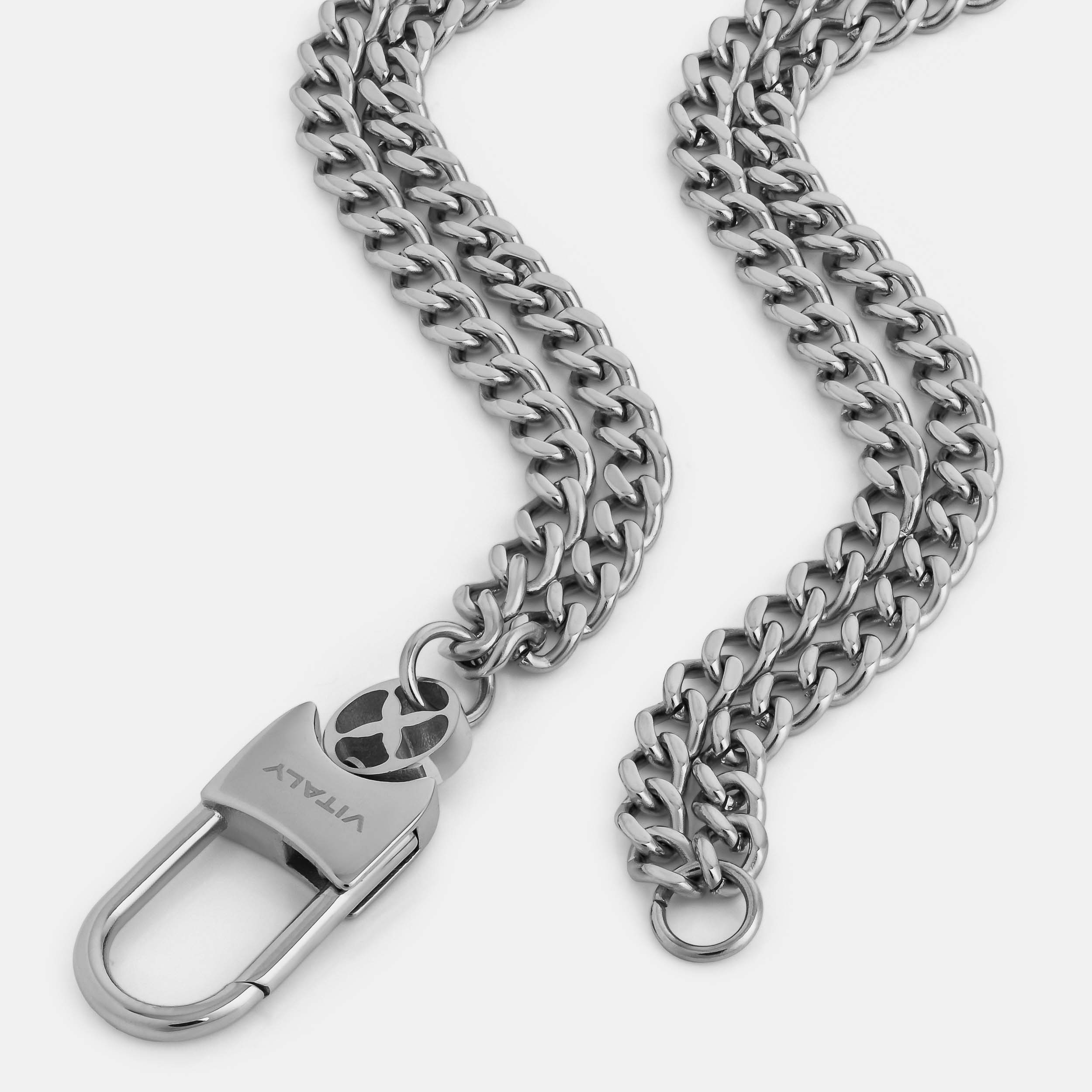 Inspired by the suspension cables that hold up bridges. the Kabel features two Cuban-link chains that are connected at the back with our signature Glyph carabiner clasp.