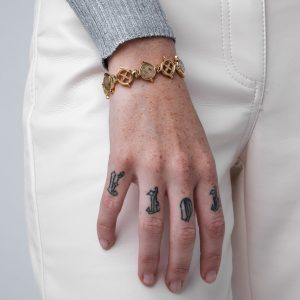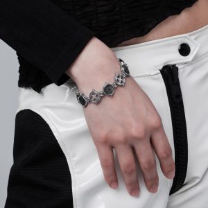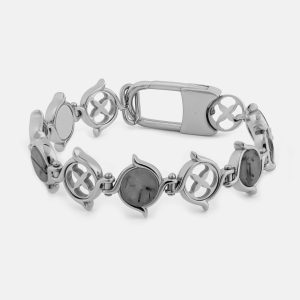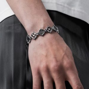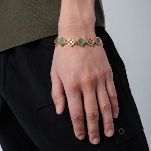 The Lucid features alternating links. pairing diecut Glyph symbols with quartz or aventurine stones. Joined with articulating hinges. this contemporary bracelet re-imagines classical gemstone jewelry for a new age.