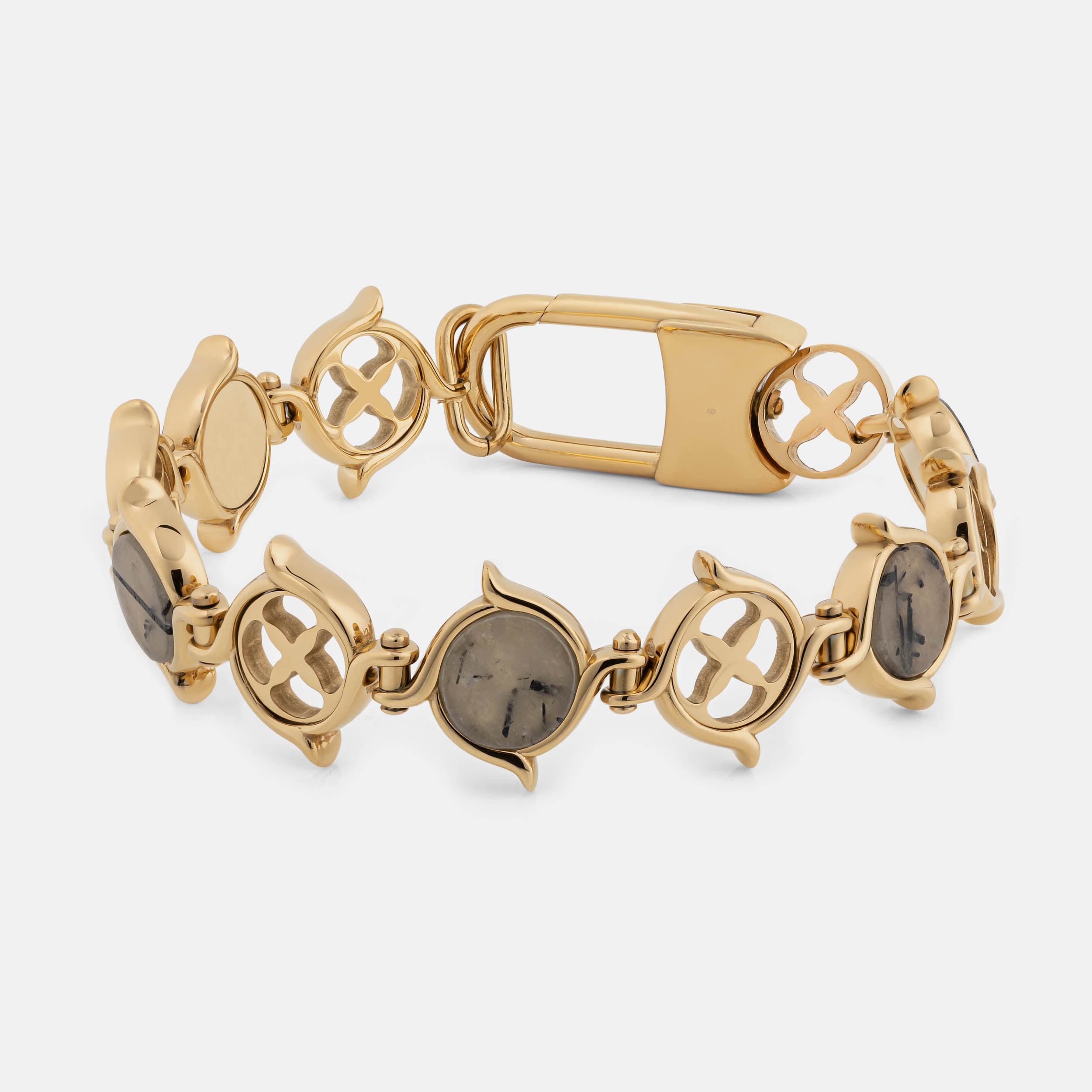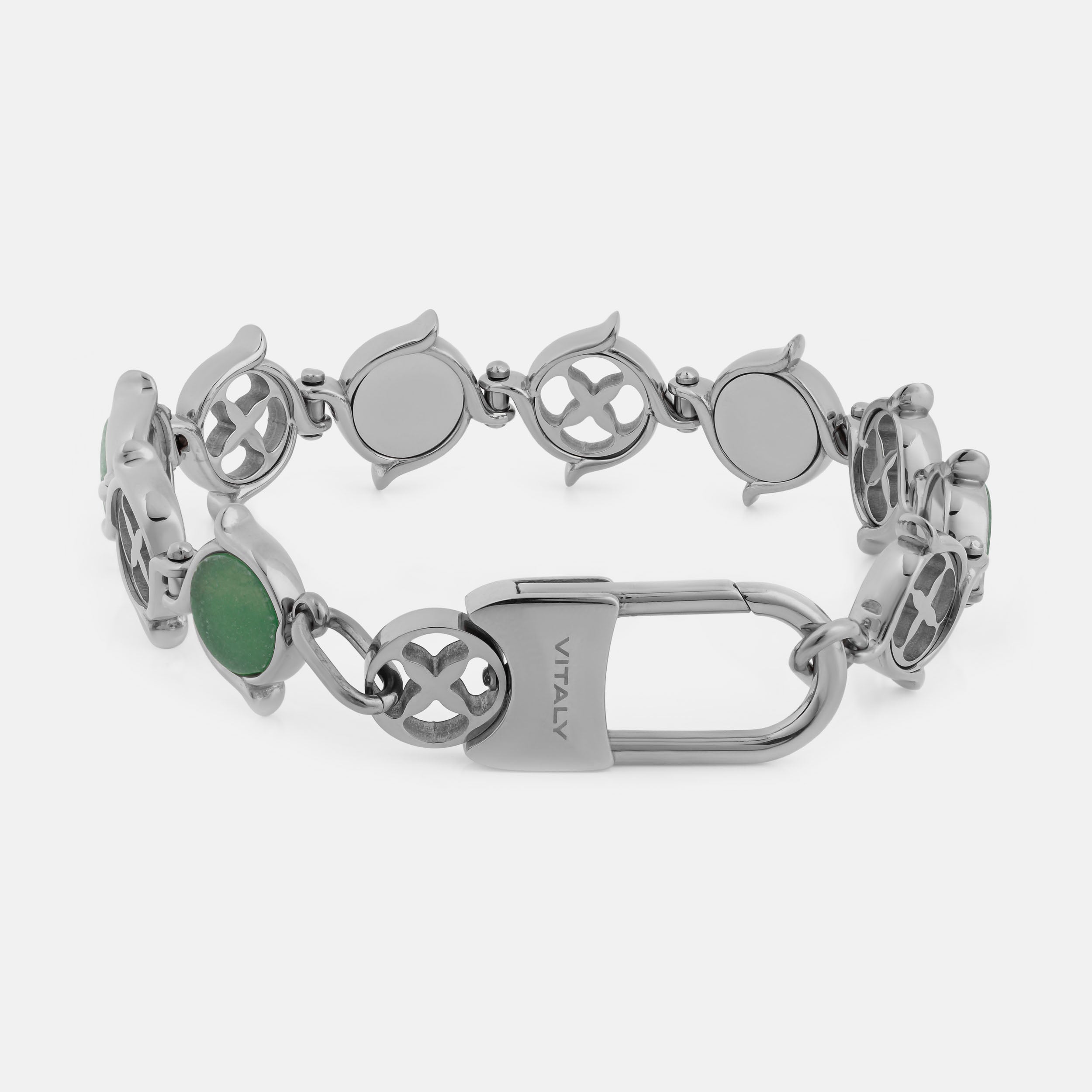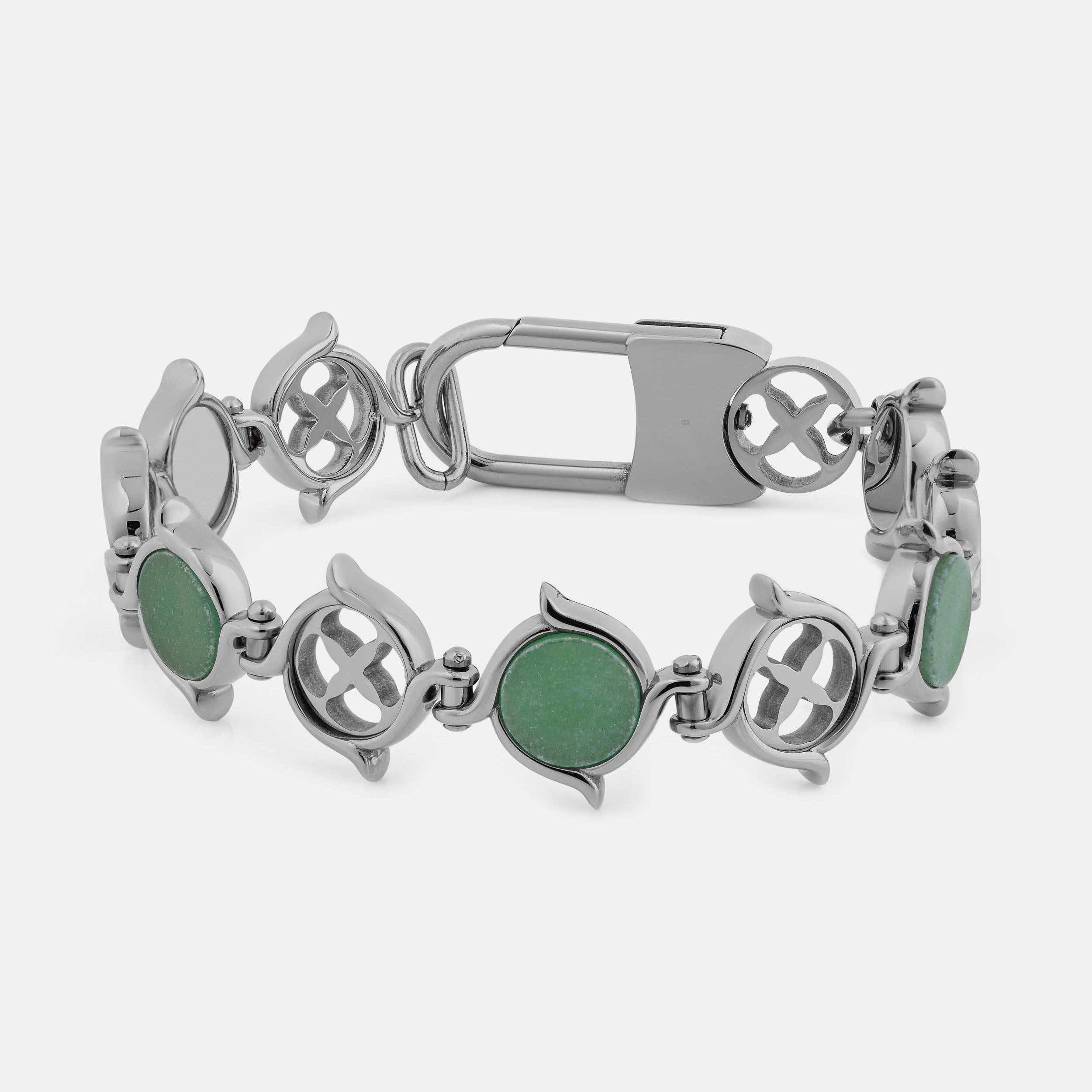 The Lucid features alternating links. pairing diecut Glyph symbols with quartz or aventurine stones. Joined with articulating hinges. this contemporary bracelet re-imagines classical gemstone jewelry for a new age.
