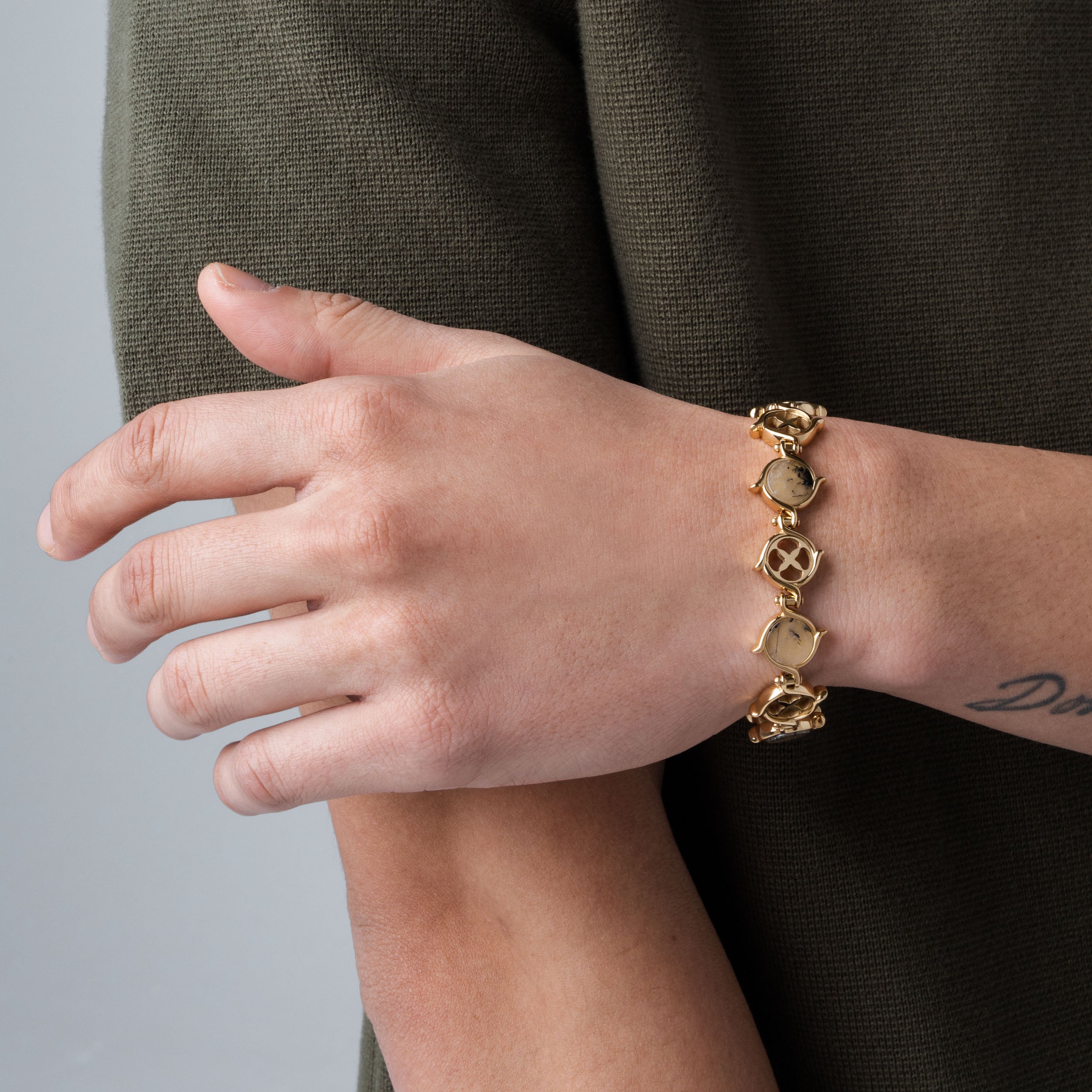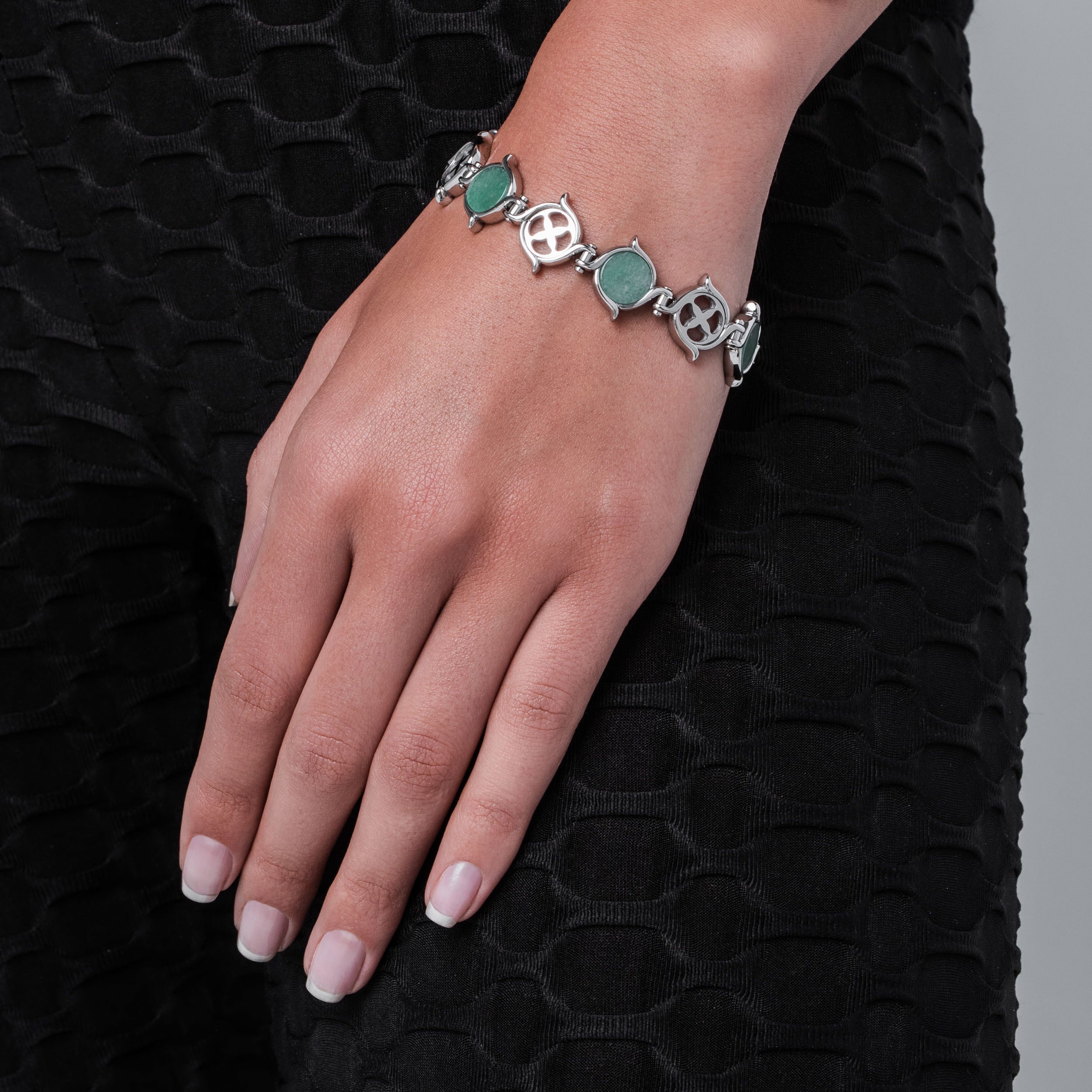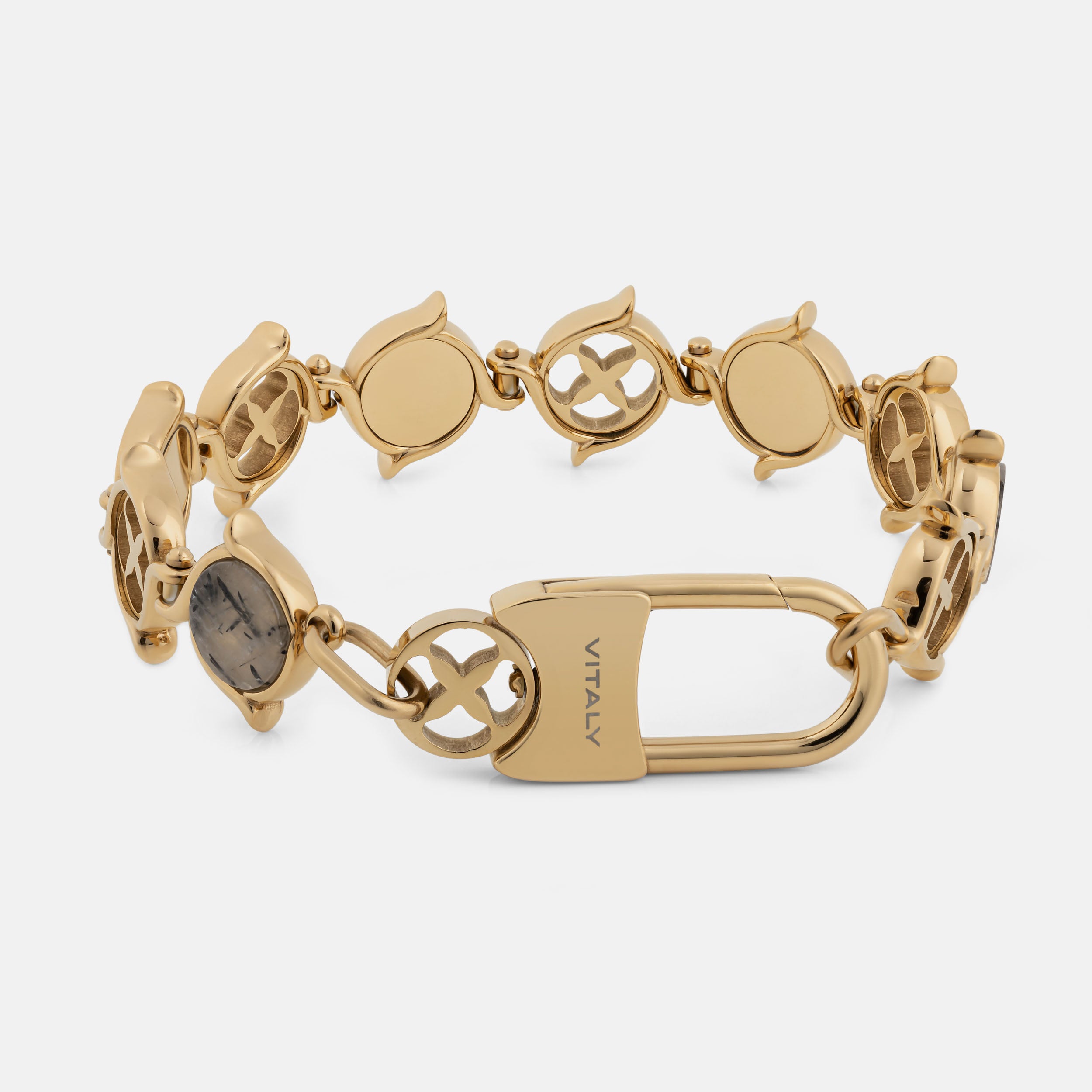 The Lucid features alternating links. pairing diecut Glyph symbols with quartz or aventurine stones. Joined with articulating hinges. this contemporary bracelet re-imagines classical gemstone jewelry for a new age.