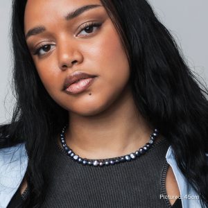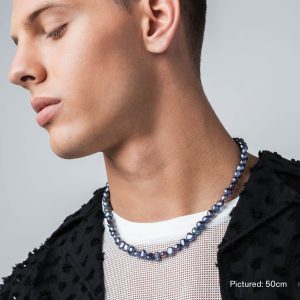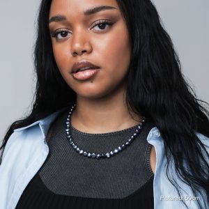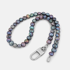 The Midnight features synthetic purple Edison pearls that shimmer with a lustrous. iridescent finish. Each pearl is unique. ranging from light blue to dark purple. giving the effect of a sky at dusk. Finished with our signature Glyph carabiner clasp.