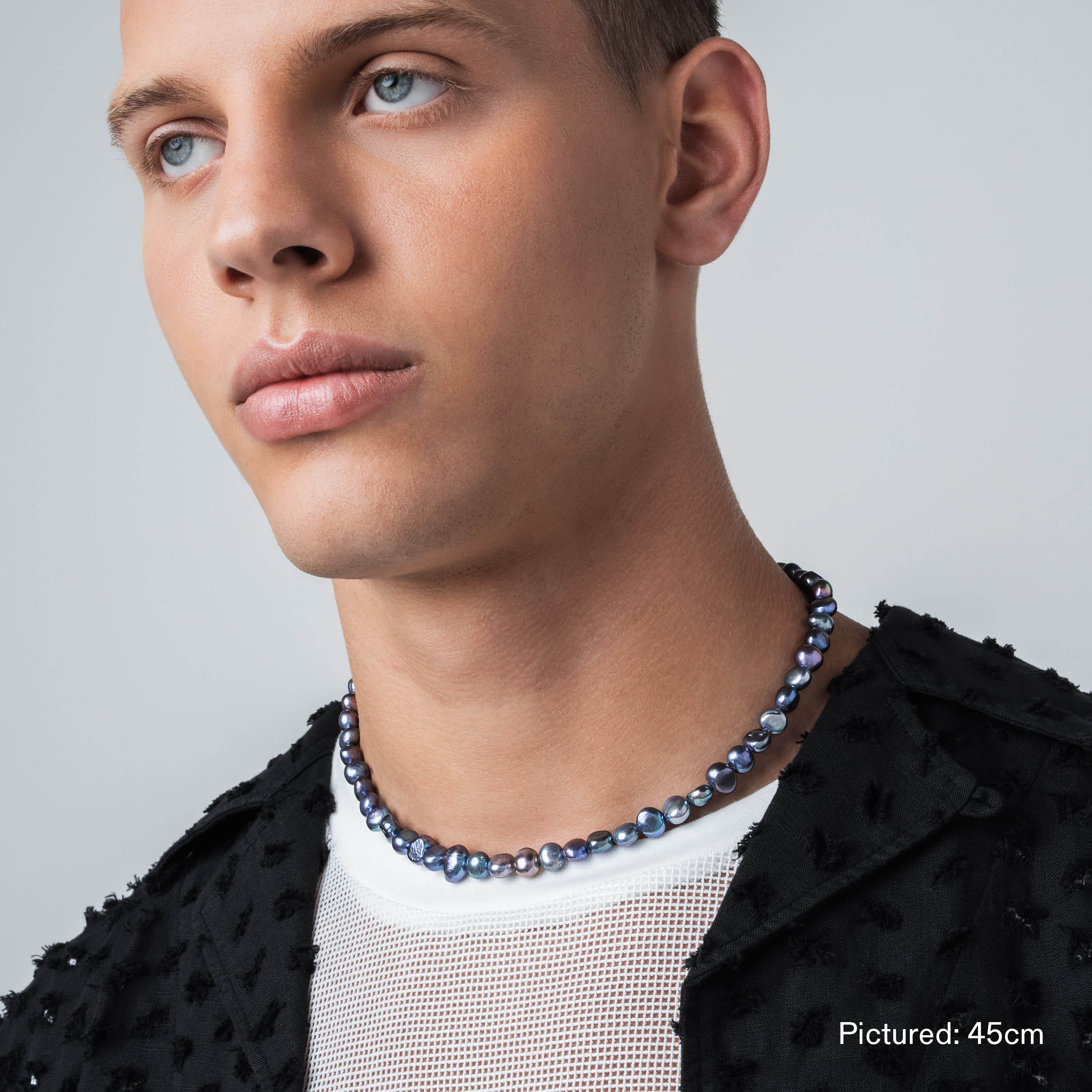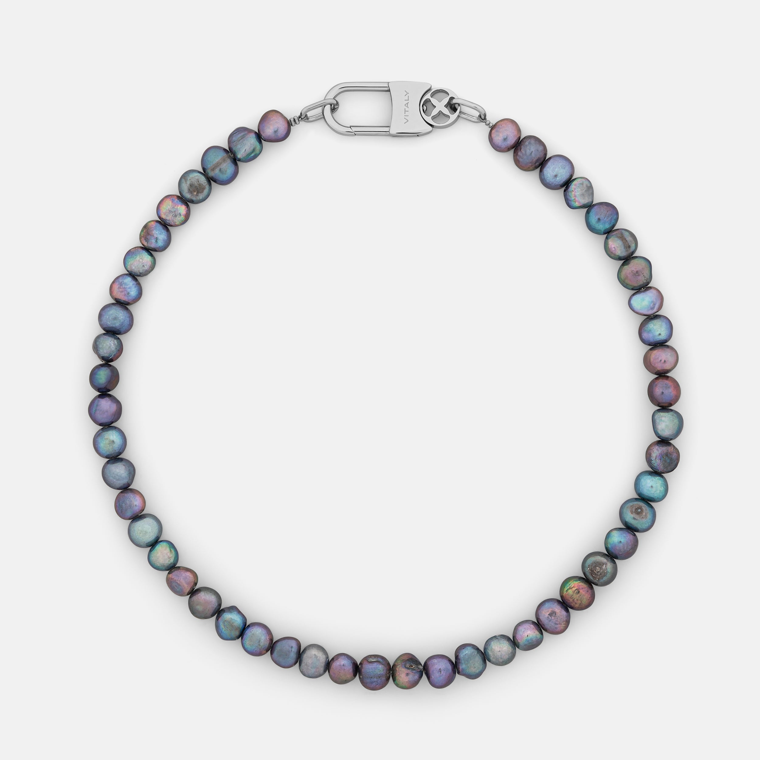 The Midnight features synthetic purple Edison pearls that shimmer with a lustrous. iridescent finish. Each pearl is unique. ranging from light blue to dark purple. giving the effect of a sky at dusk. Finished with our signature Glyph carabiner clasp.