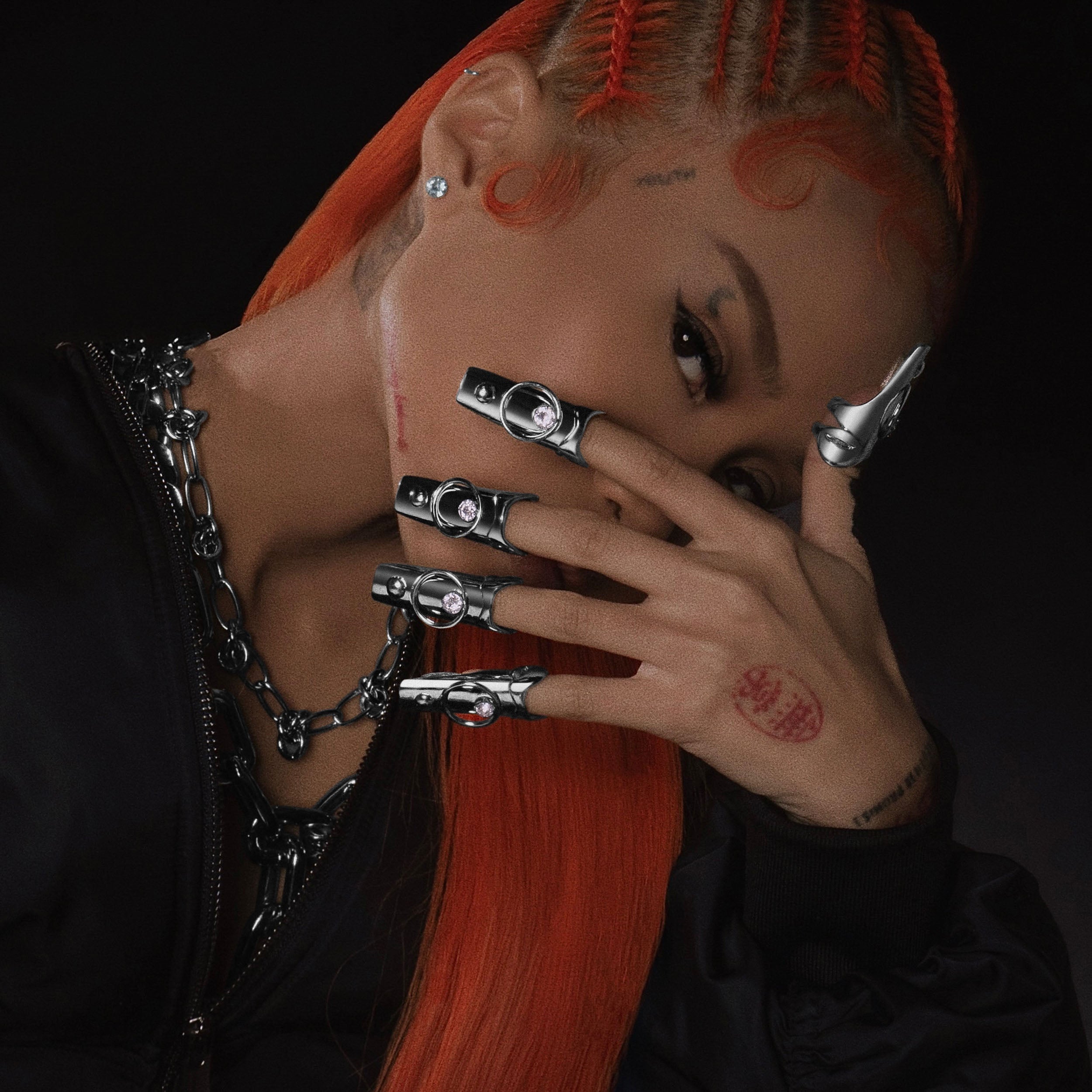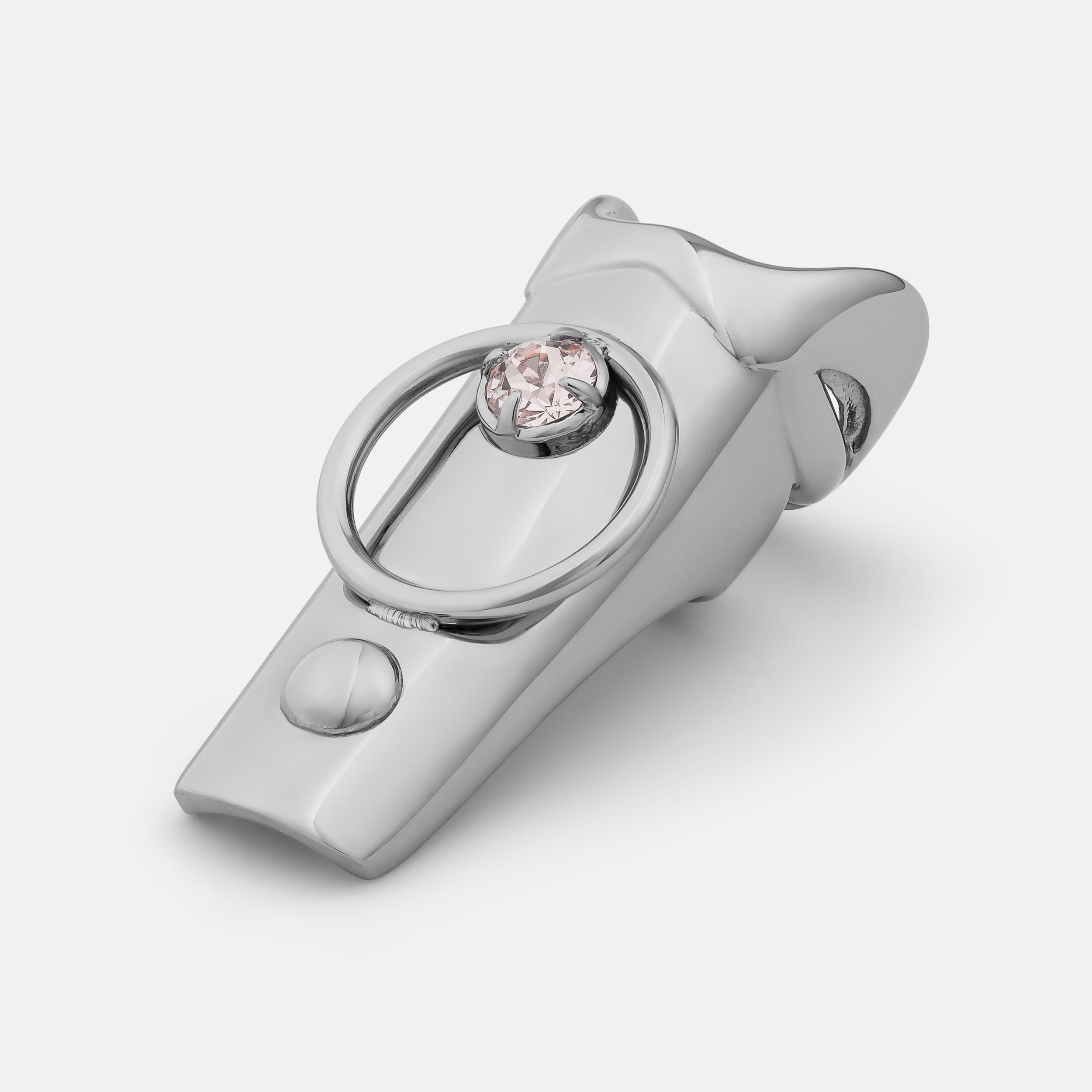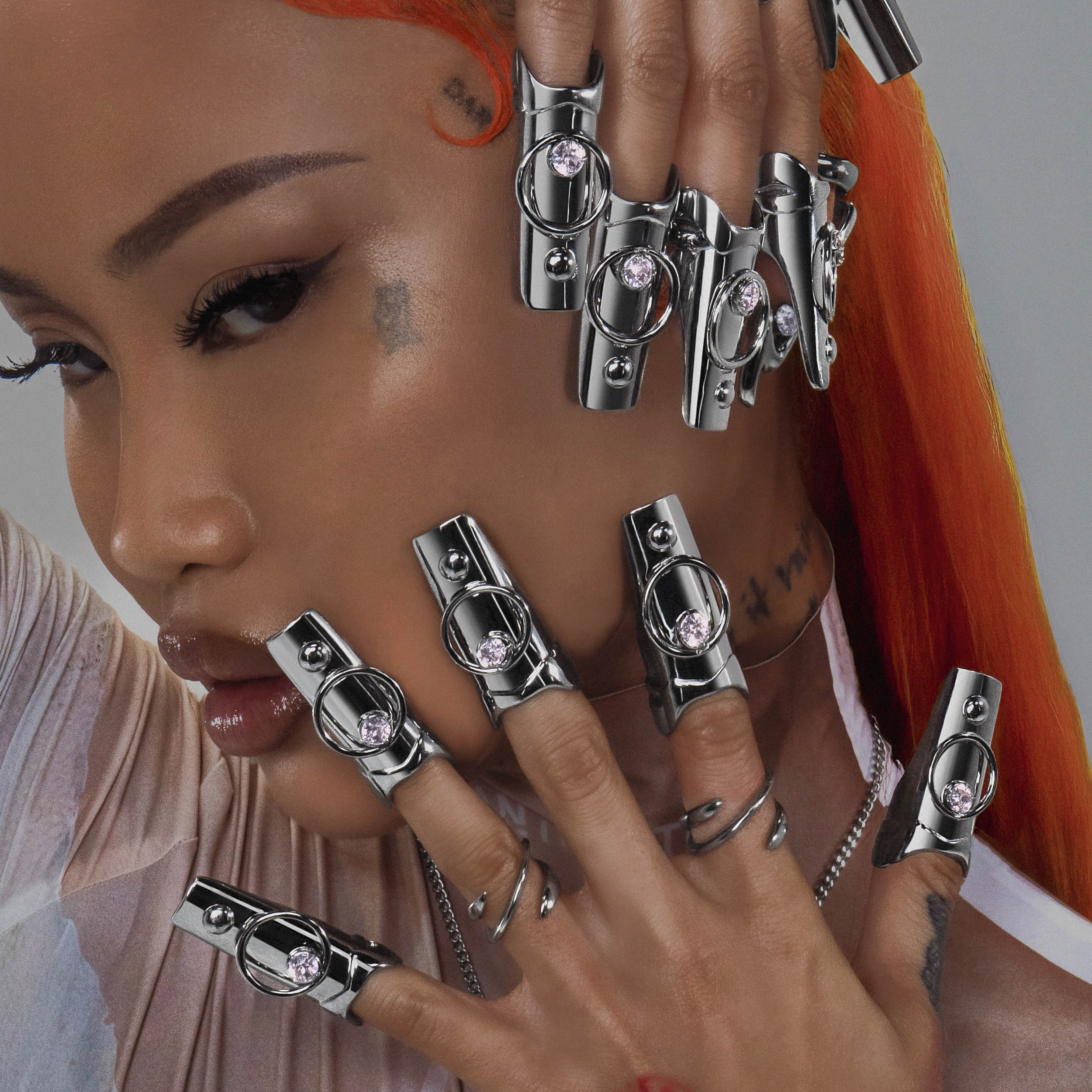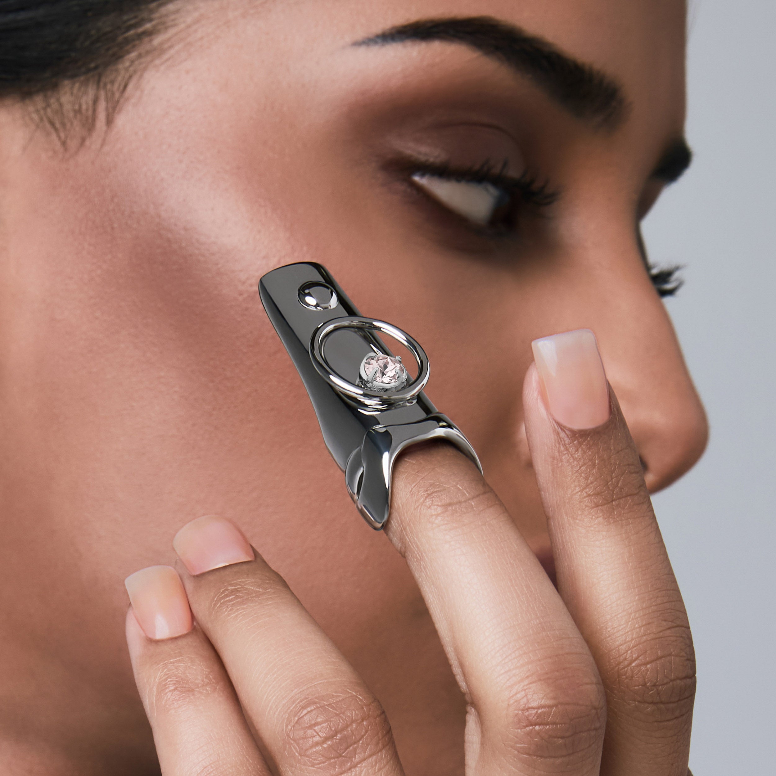 As a personal reflection of Coca’s story. the ring takes its name from the Vietnamese word for nail. honouring both her cultural roots and the artistry. Made from high-polish stainless steel. the form mimics the tapered silhouette of an extended nail. while a ring detail encircles a glass stone – inspired by her curiosity with crop circles.