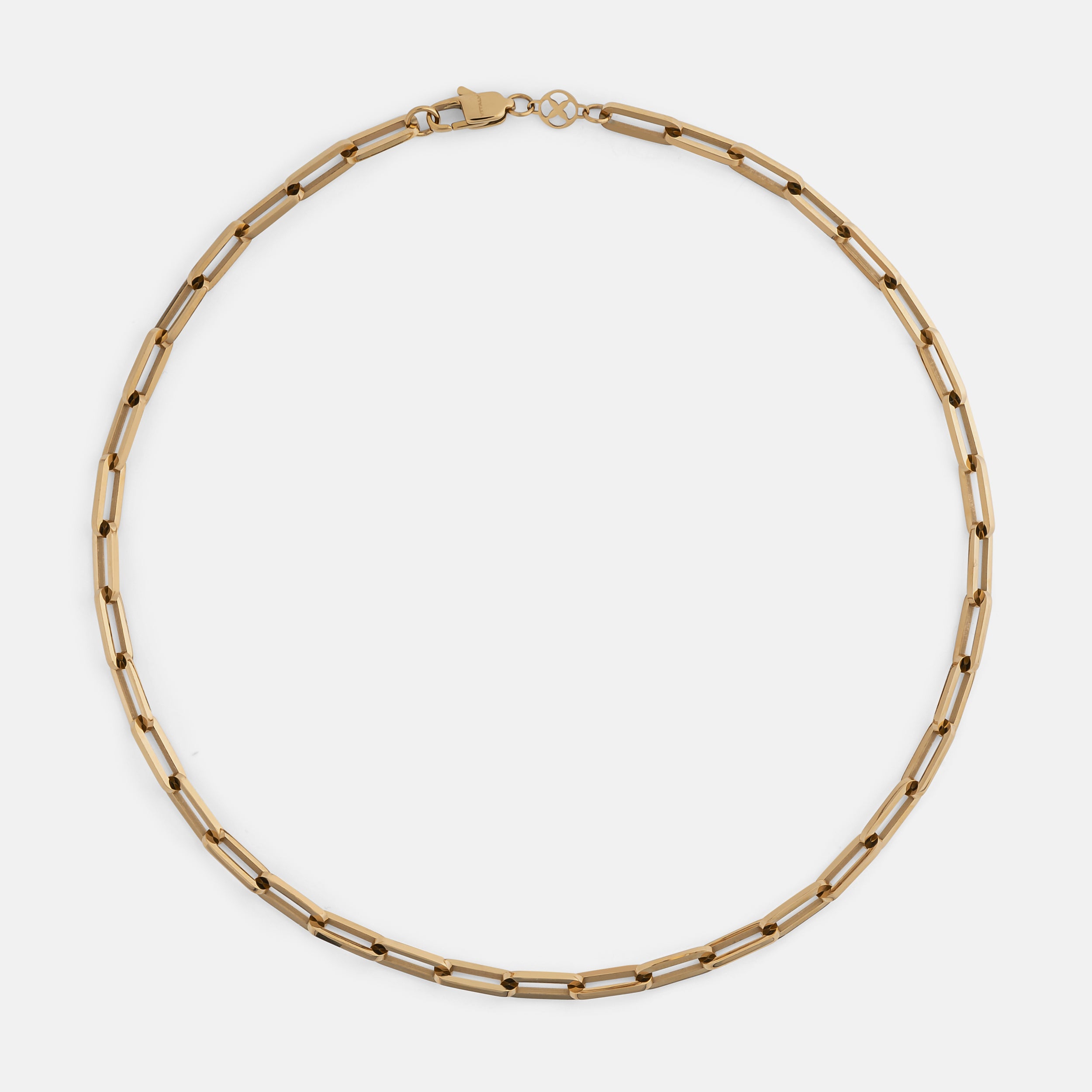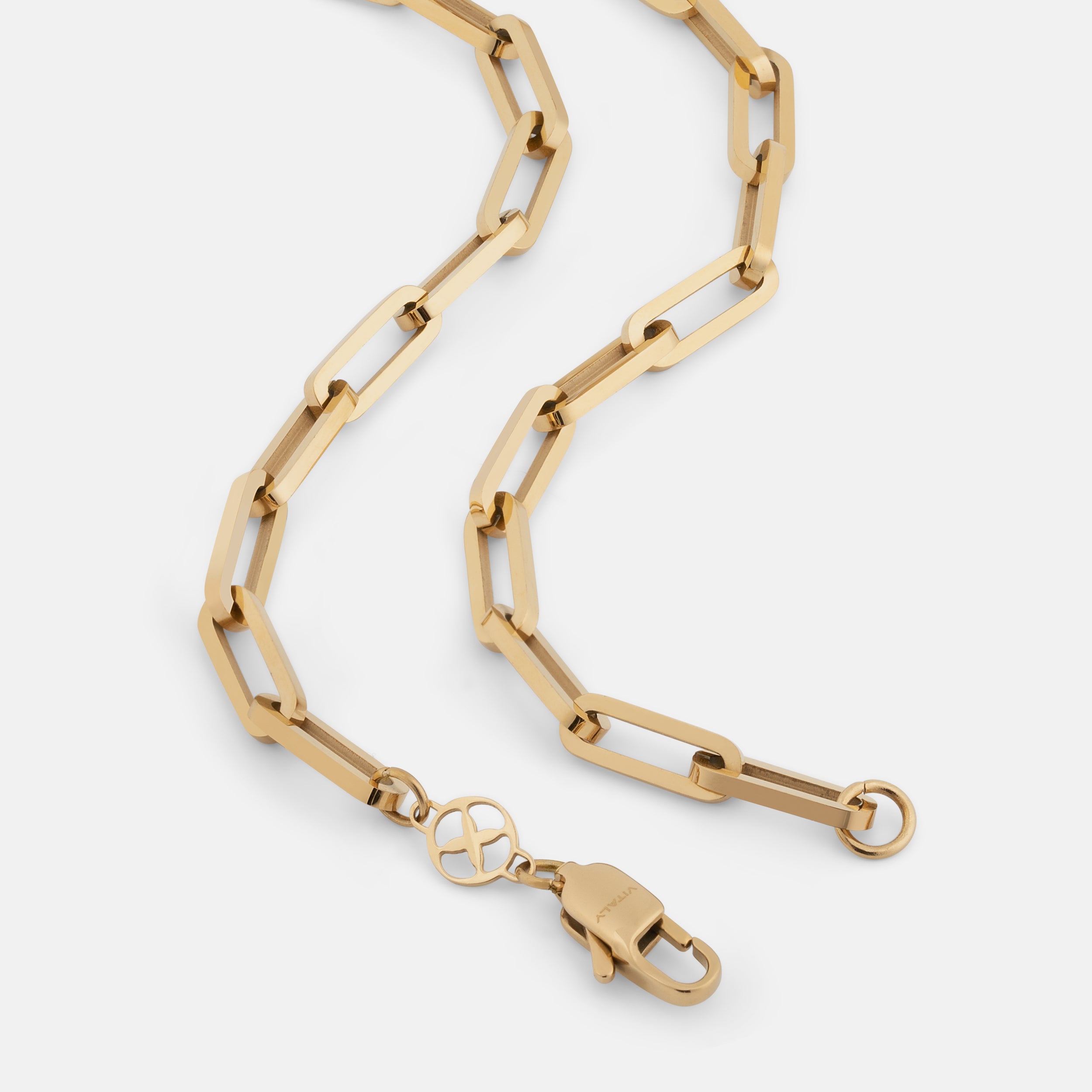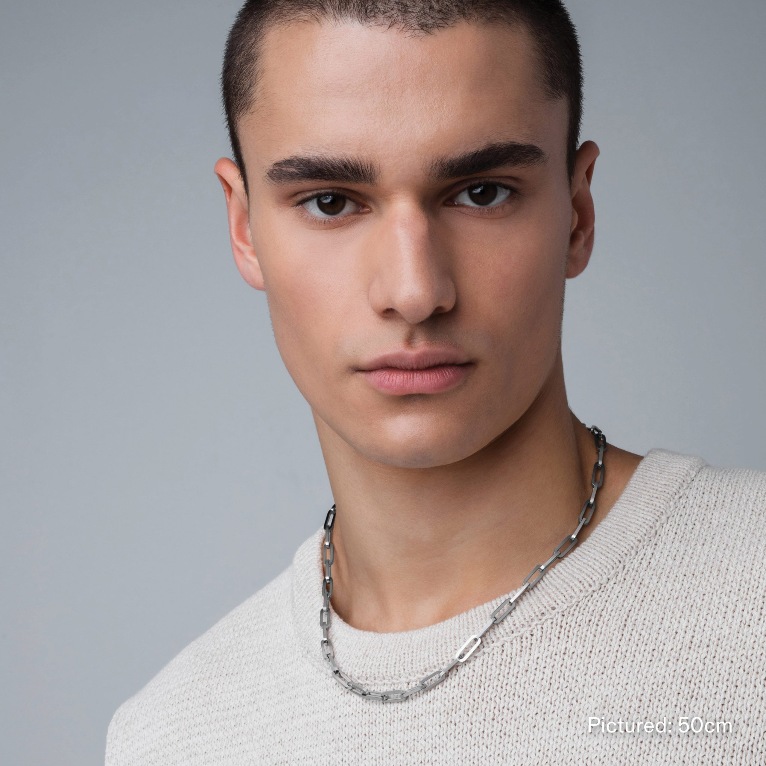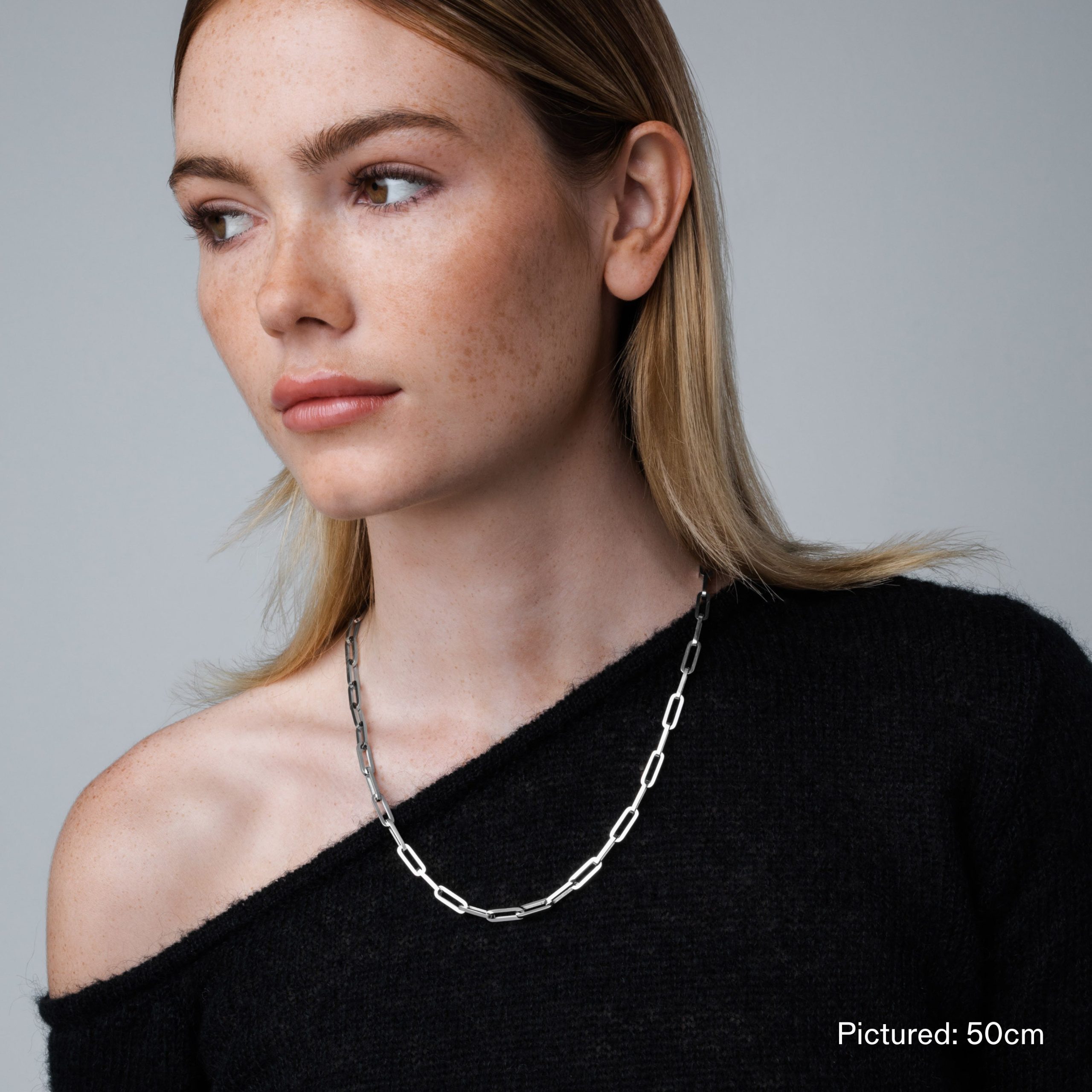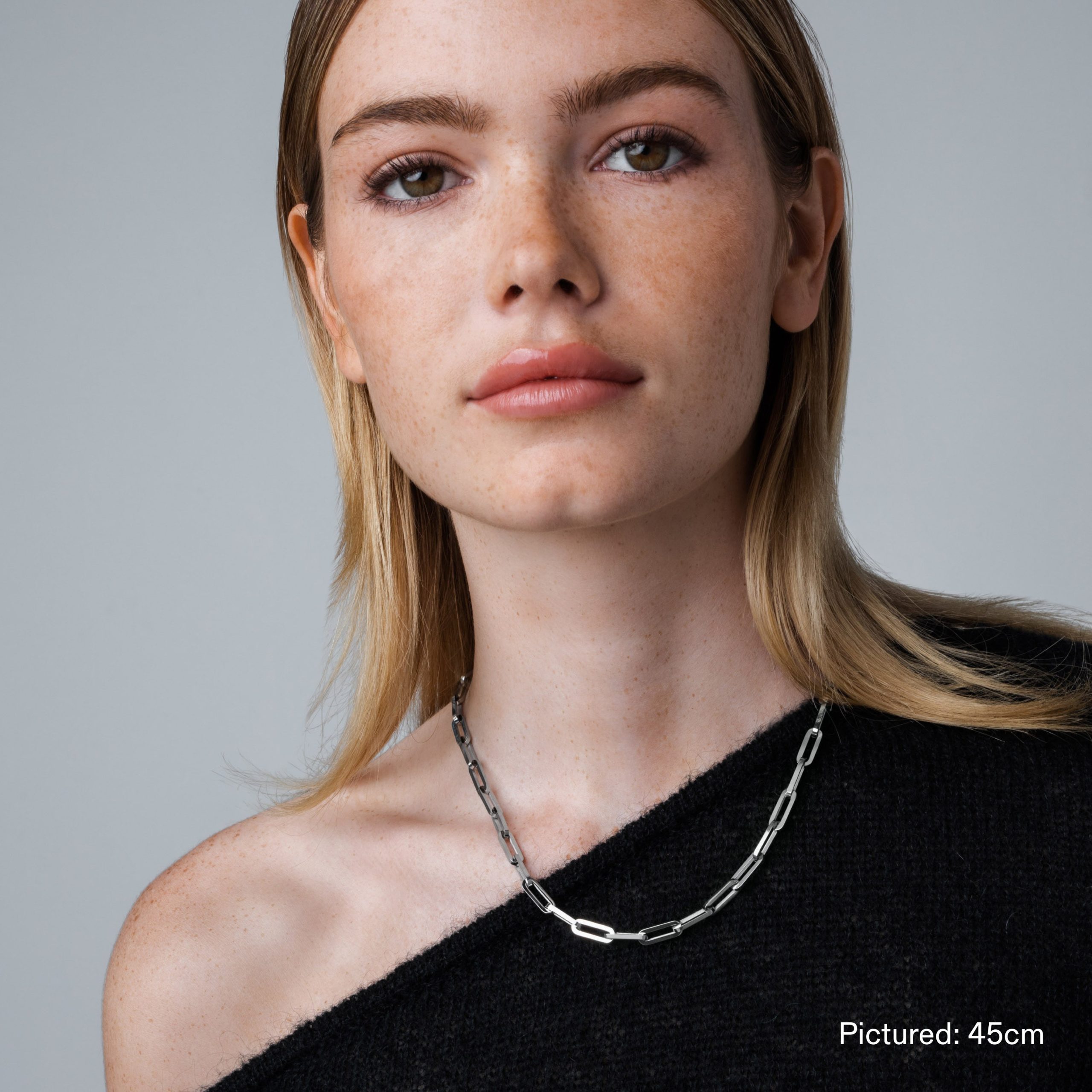 A contemporary take on the paperclip chain. each link features flat. angular edges that glint in the light. Finished with our signature Glyph clasp tag.