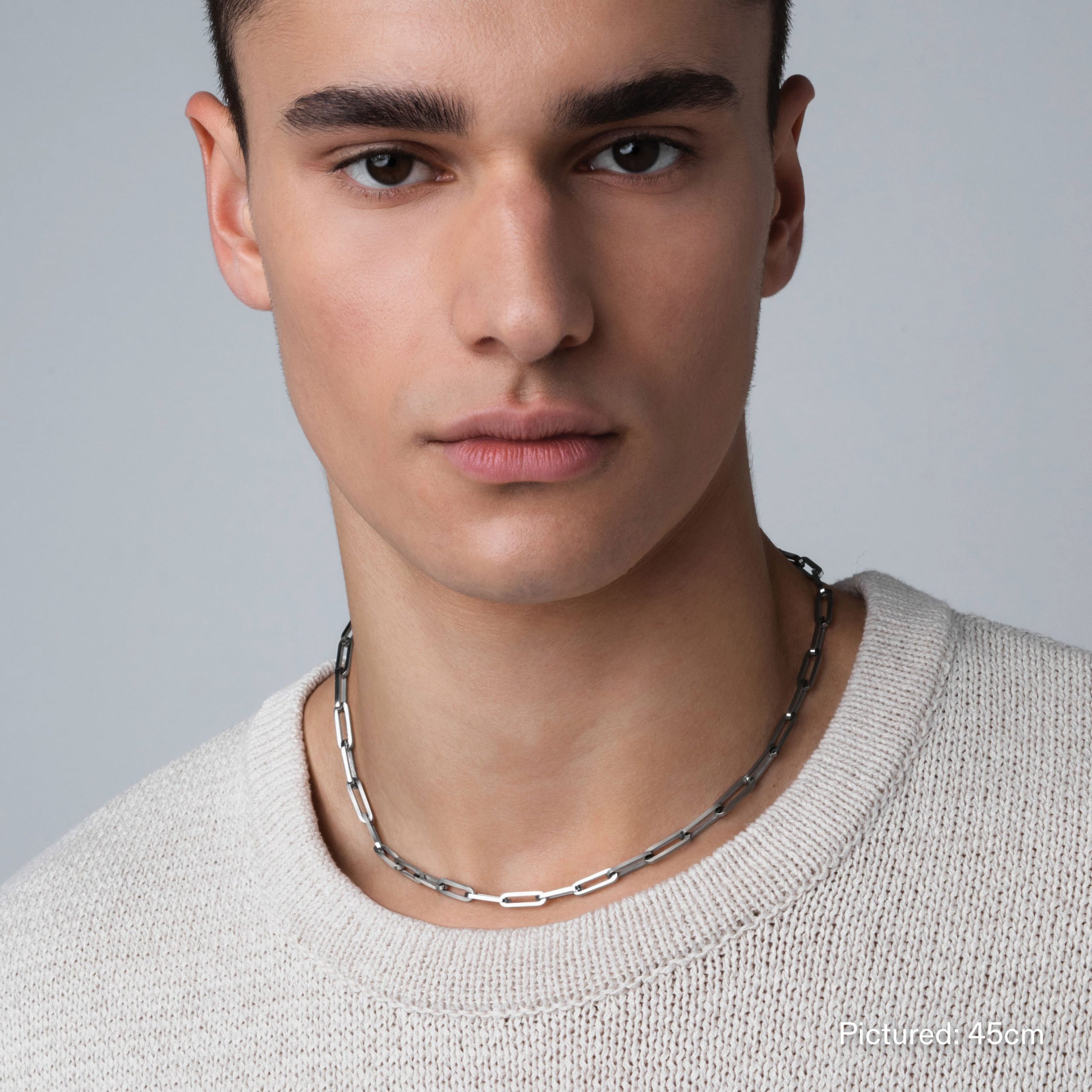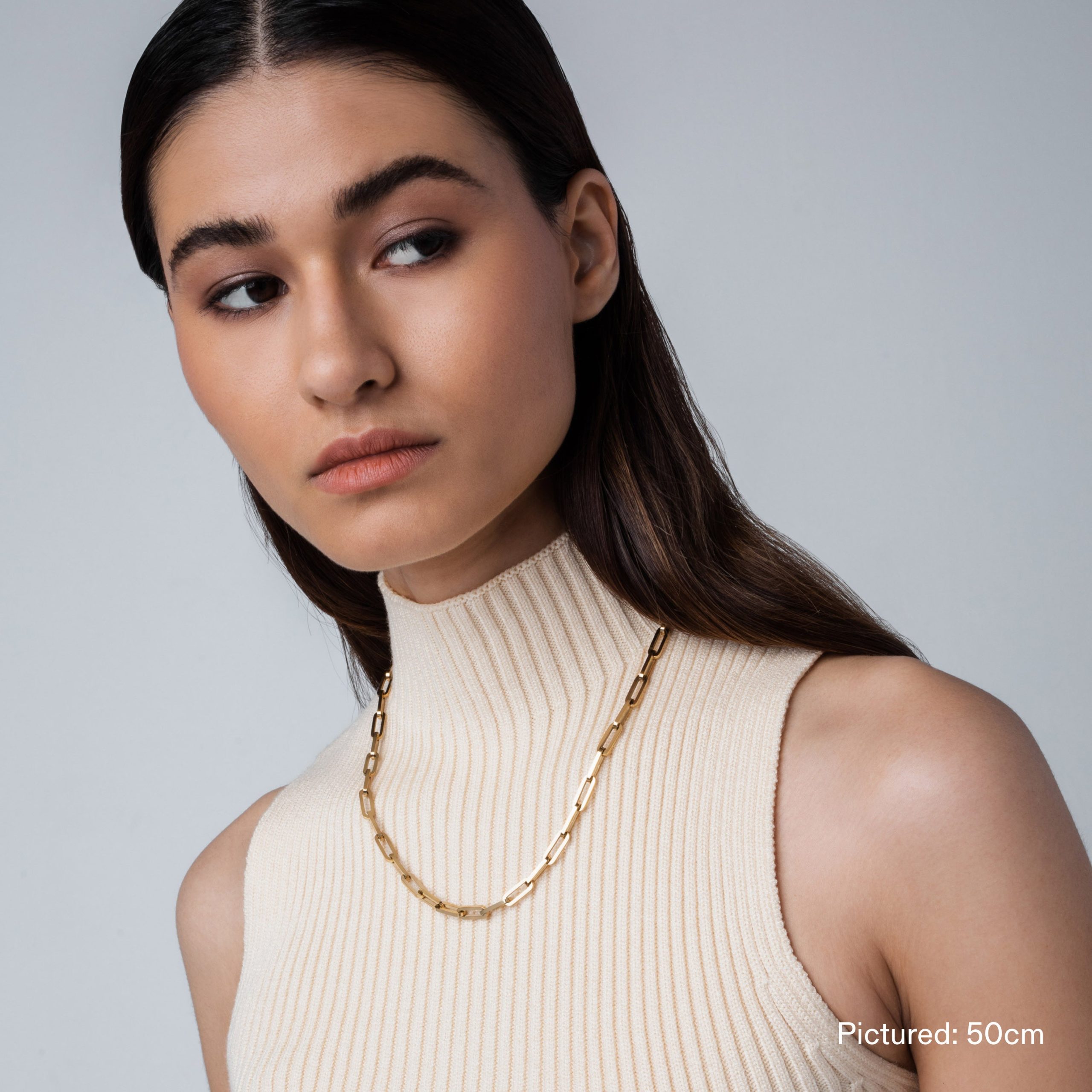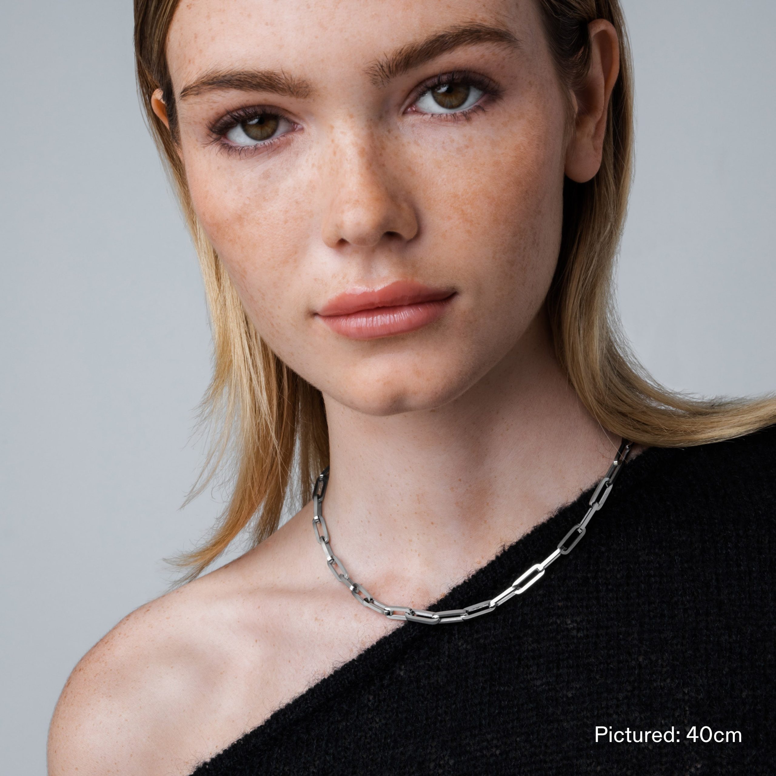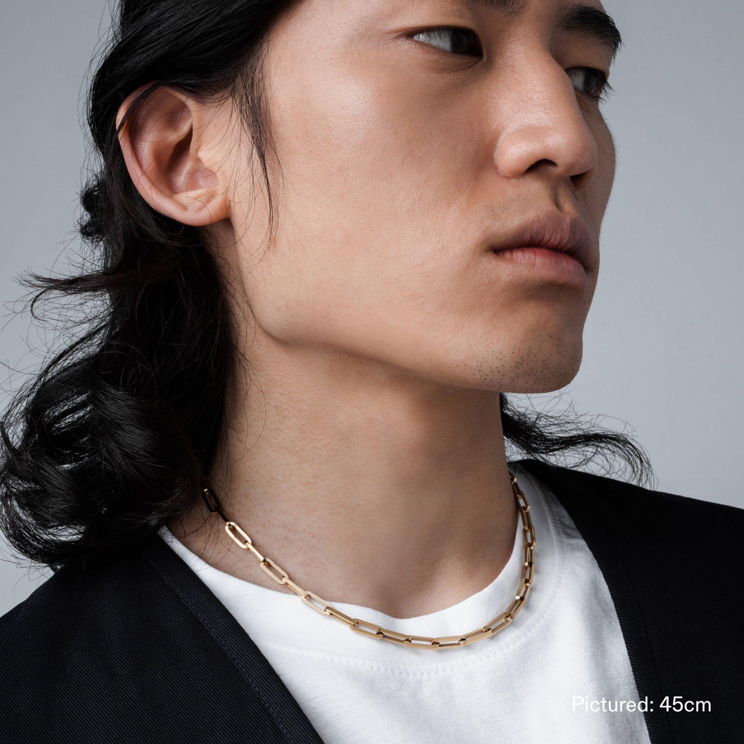 A contemporary take on the paperclip chain. each link features flat. angular edges that glint in the light. Finished with our signature Glyph clasp tag.