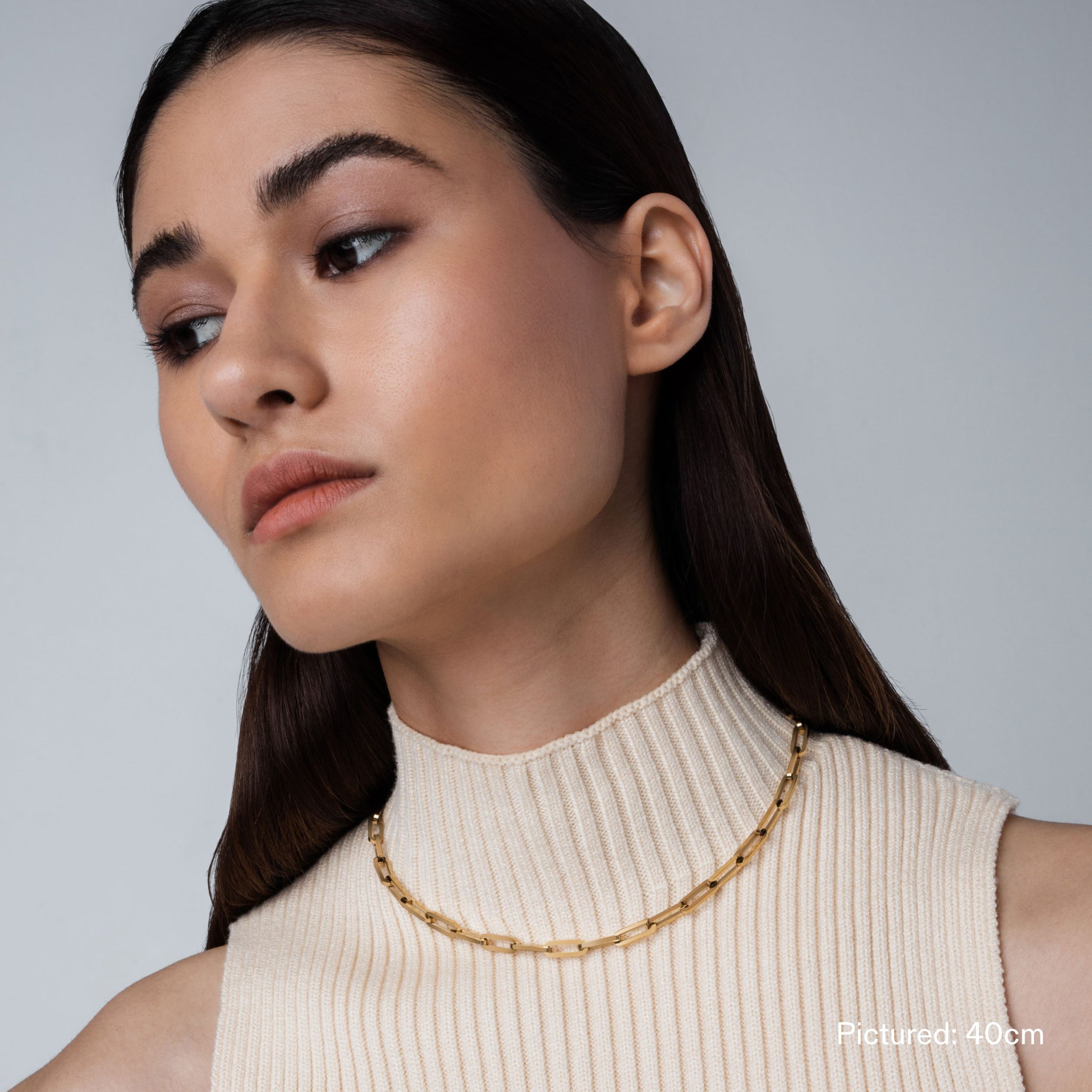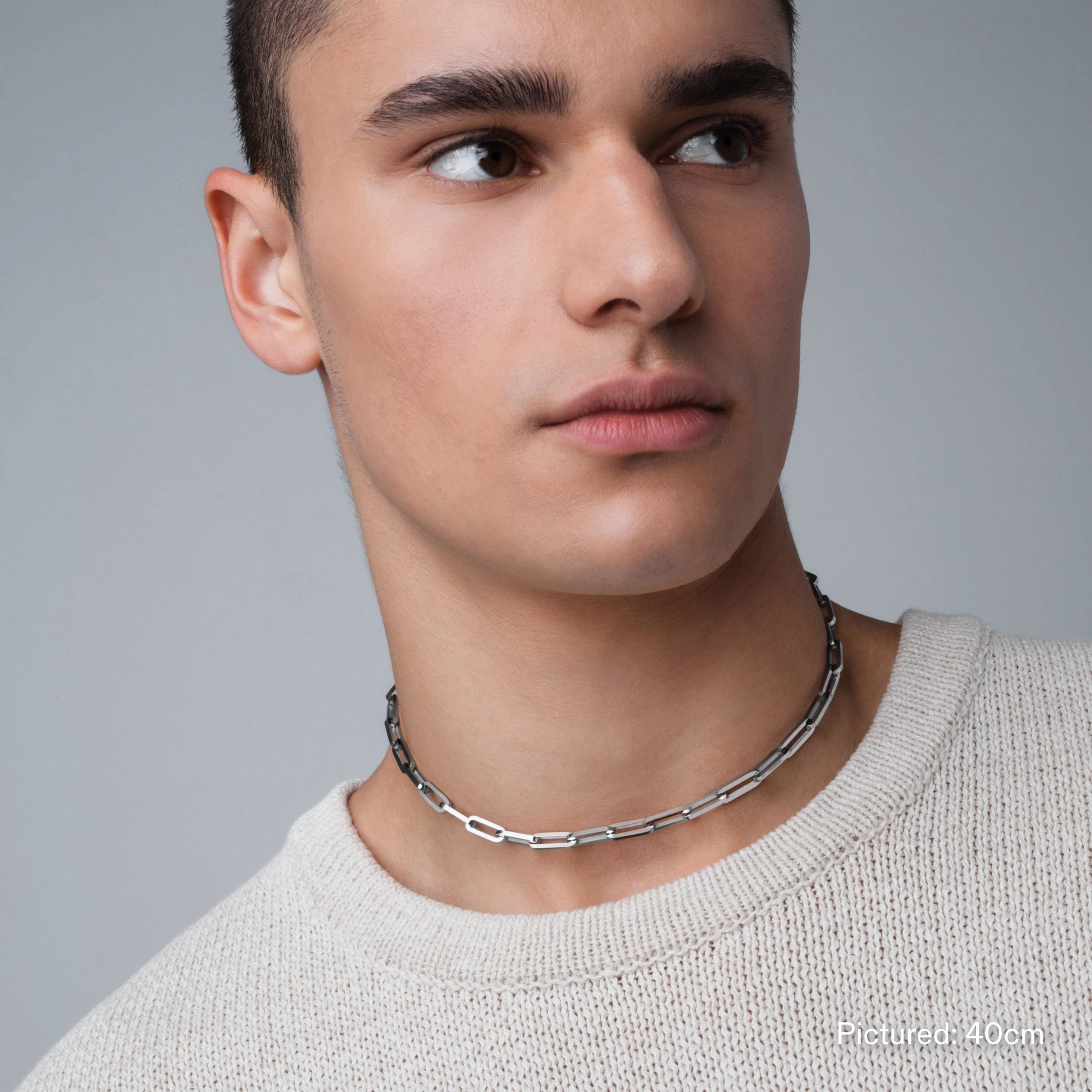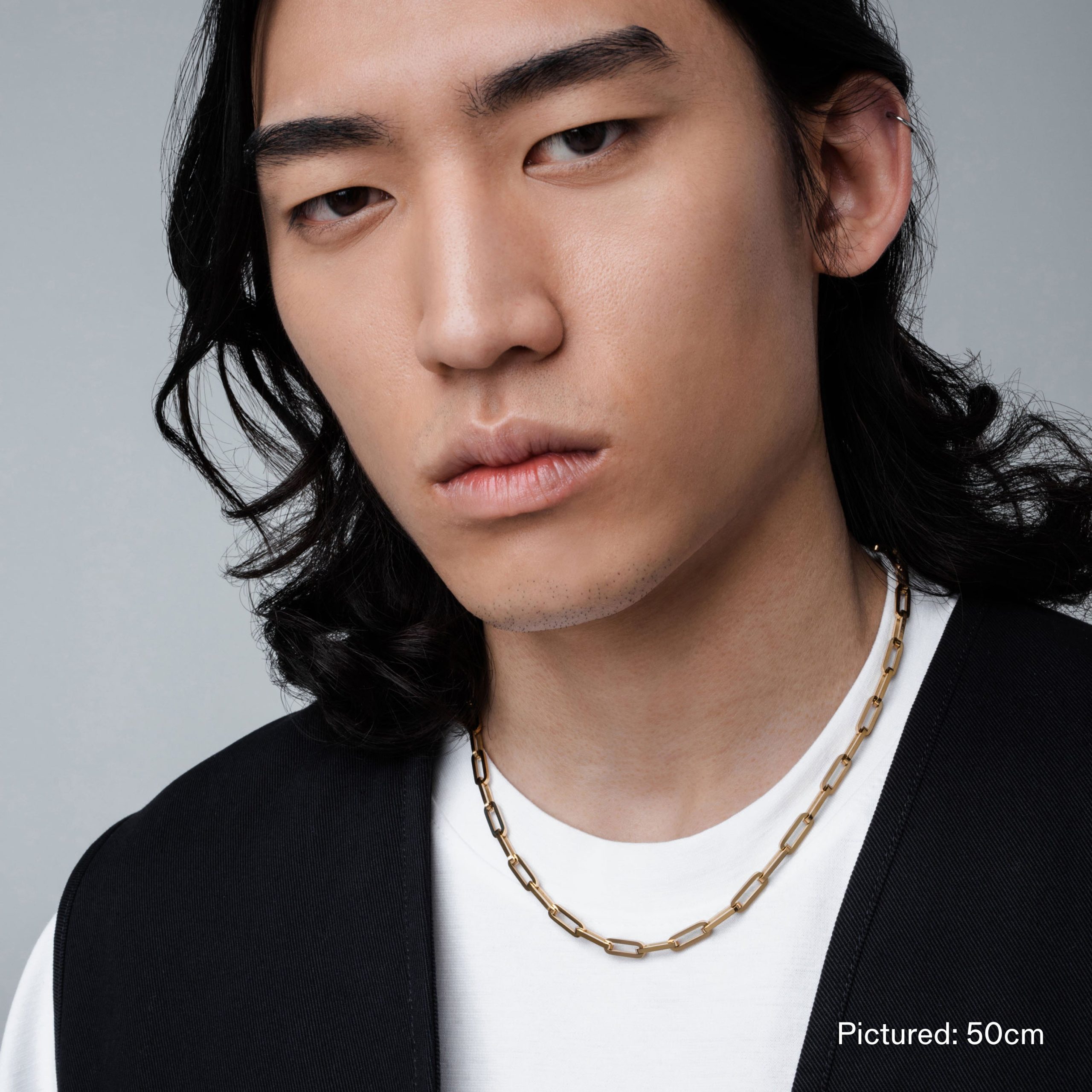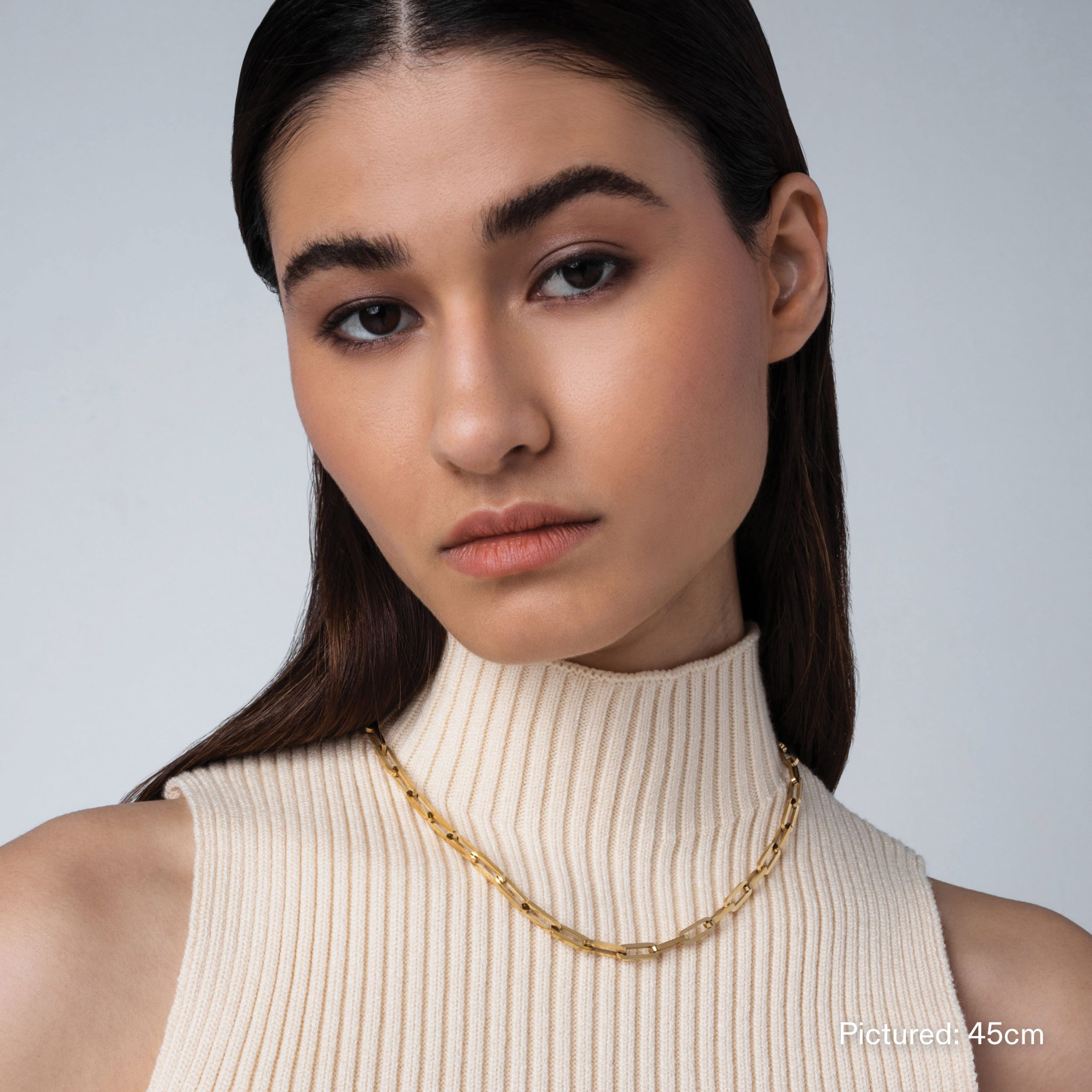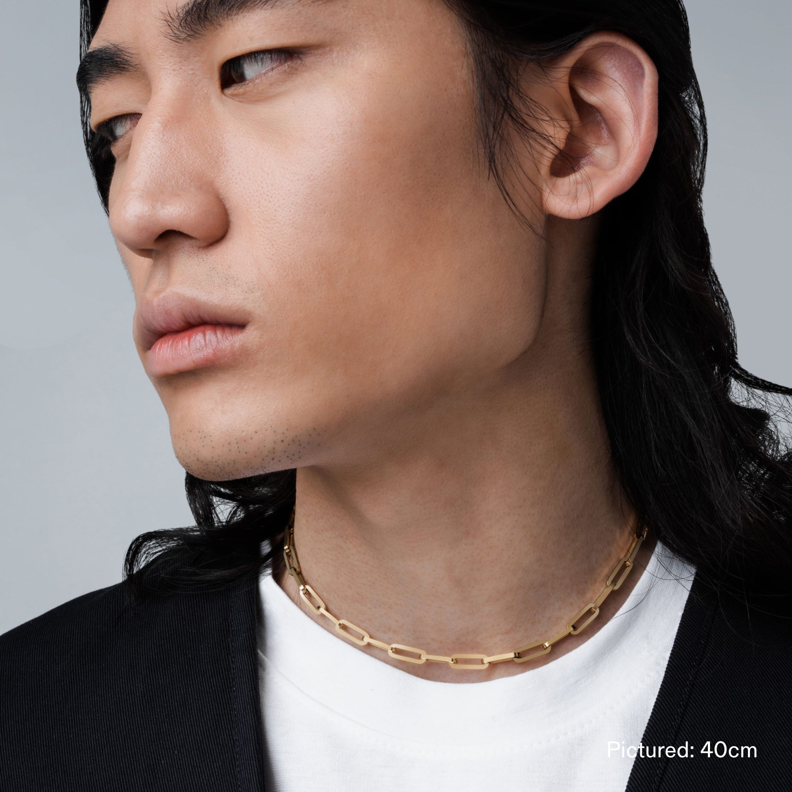 A contemporary take on the paperclip chain. each link features flat. angular edges that glint in the light. Finished with our signature Glyph clasp tag.