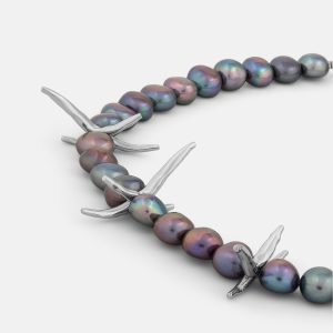 The Paranoid is constructed from synthetic purple Edison pearls that shimmer with a lustrous. iridescent finish. Each pearl is unique. ranging from light blue to dark purple. giving the effect of a sky at dusk. Paired with six asymmetrical spike details woven between the pearls. the resulting chain takes on a menacing appearance. Finished with an adjustable sizing chain and our signature Glyph carabiner clasp.