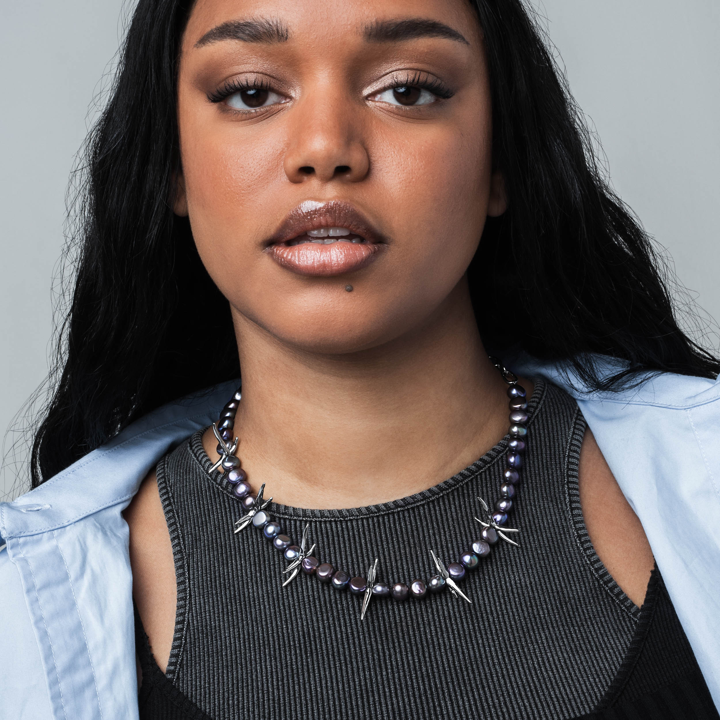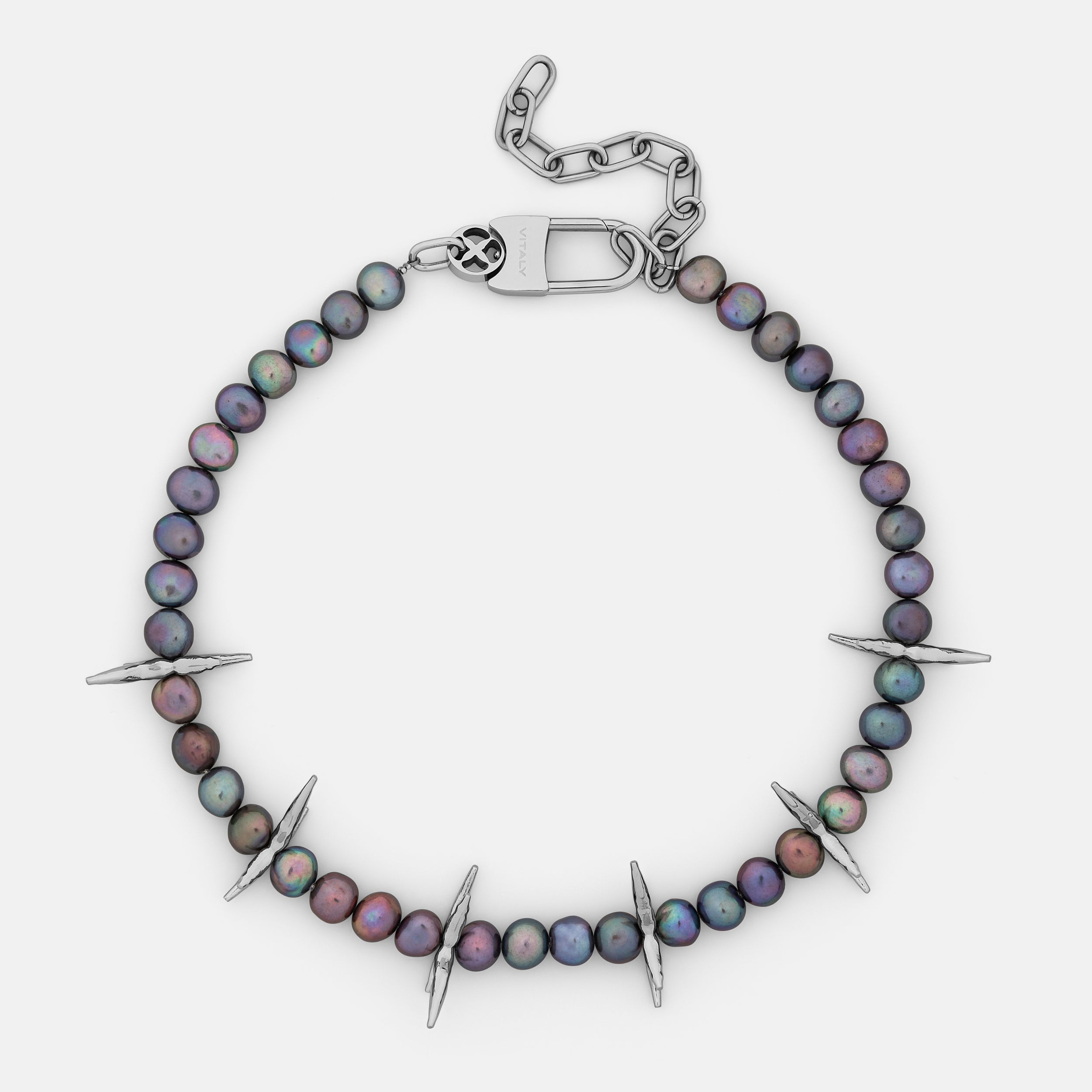 The Paranoid is constructed from synthetic purple Edison pearls that shimmer with a lustrous. iridescent finish. Each pearl is unique. ranging from light blue to dark purple. giving the effect of a sky at dusk. Paired with six asymmetrical spike details woven between the pearls. the resulting chain takes on a menacing appearance. Finished with an adjustable sizing chain and our signature Glyph carabiner clasp.