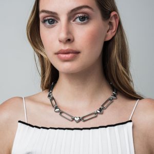 The Passion chain is for all you lovers. featuring oversized paperclip-style links intertwined with bold 3D hearts. This playful design has an adjustable sizing chain. allowing it to be styled as a choker or worn looser around the collarbone for two distinct looks. Finished with our signature Glyph carabiner clasp.