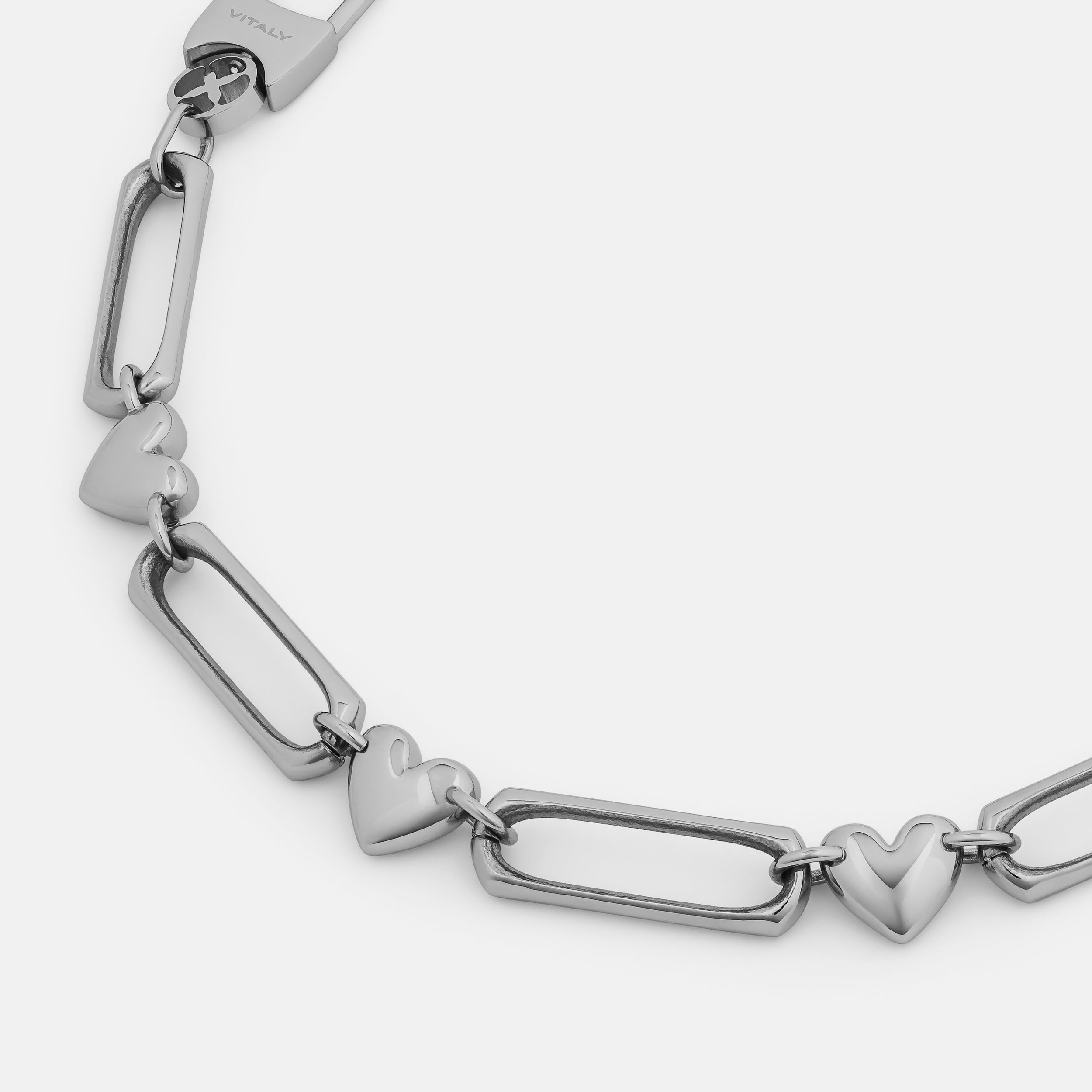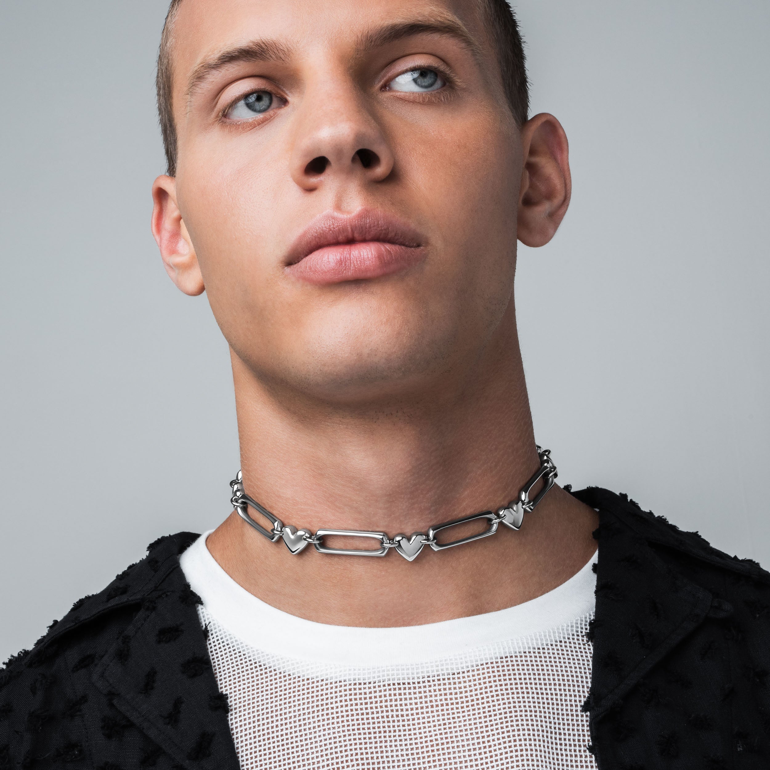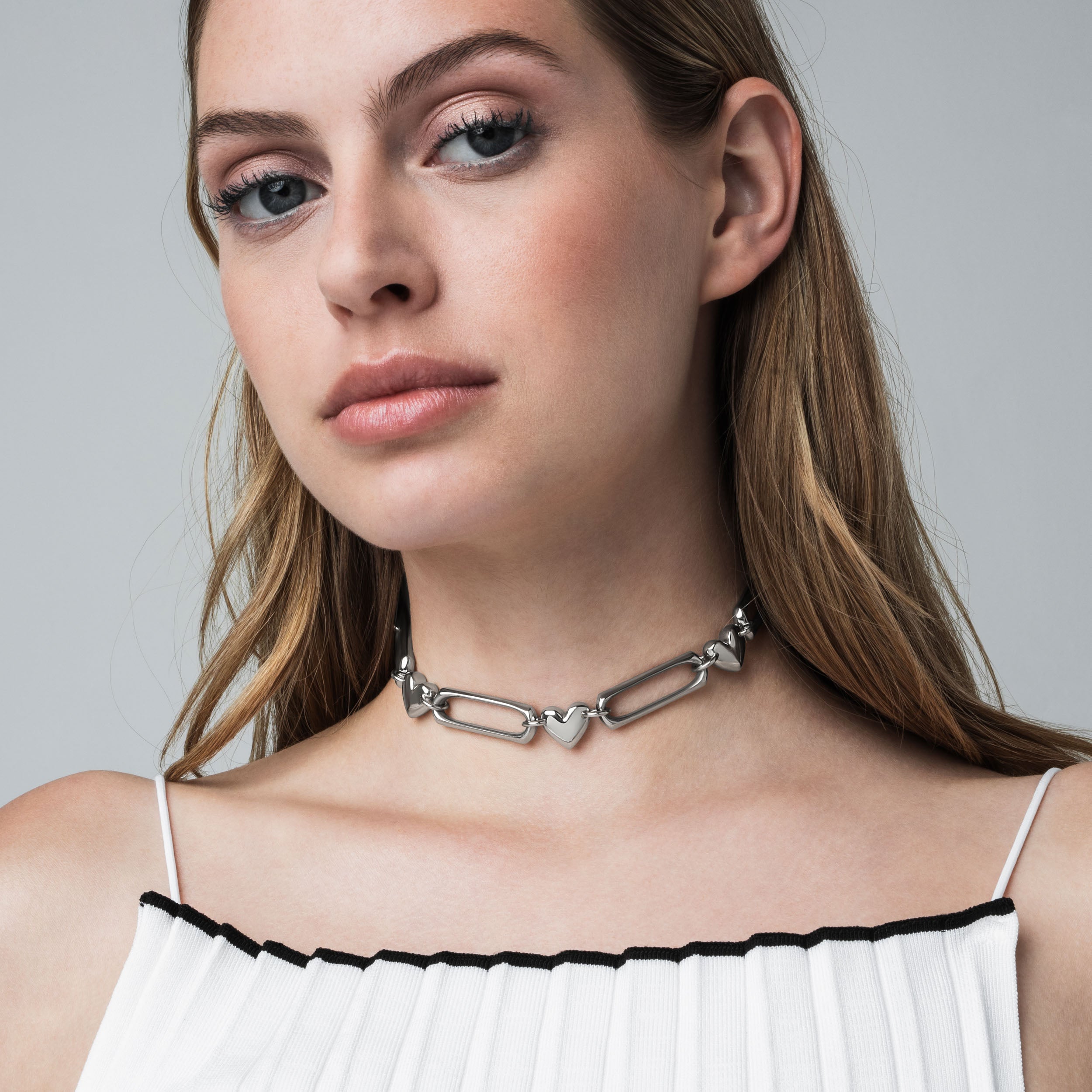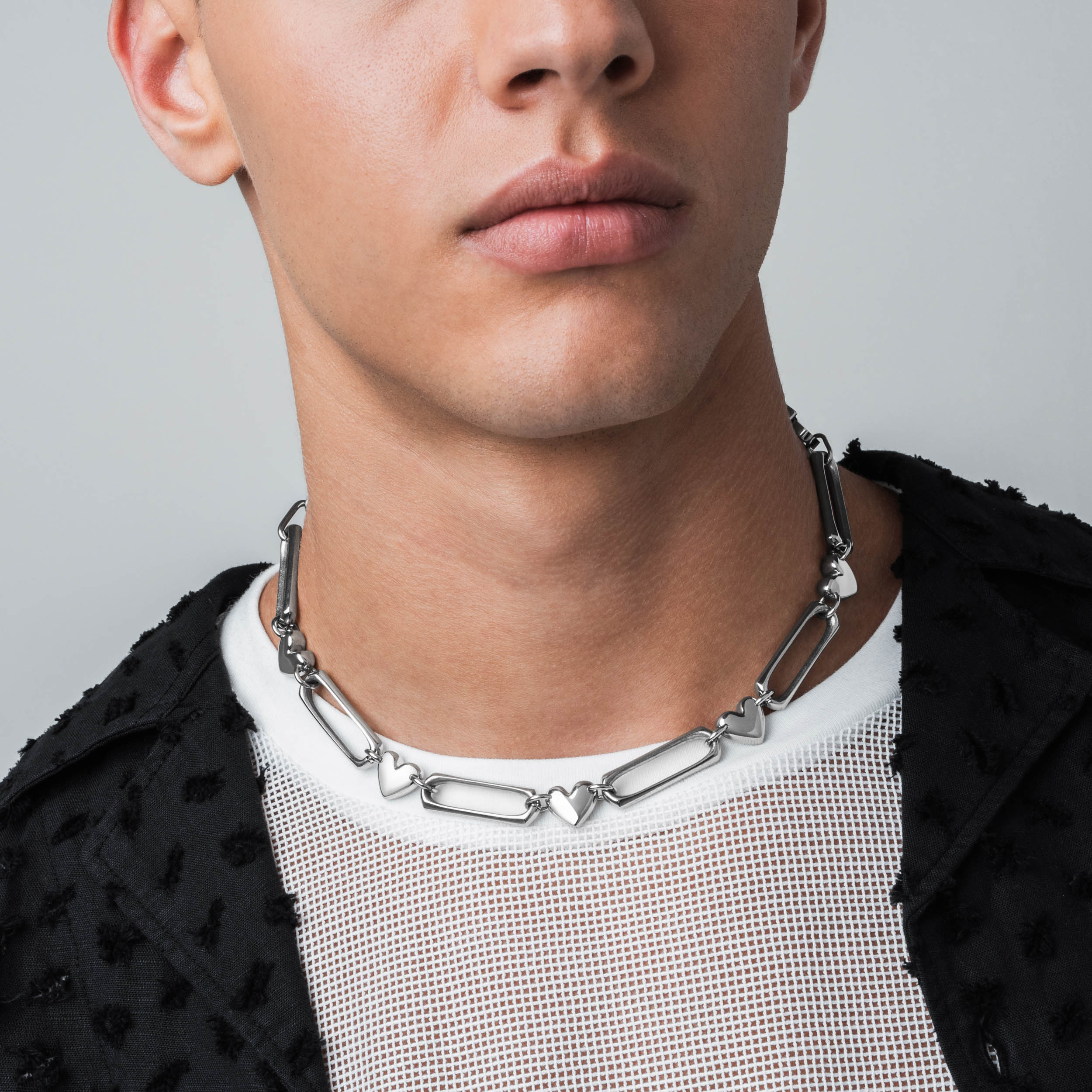 The Passion chain is for all you lovers. featuring oversized paperclip-style links intertwined with bold 3D hearts. This playful design has an adjustable sizing chain. allowing it to be styled as a choker or worn looser around the collarbone for two distinct looks. Finished with our signature Glyph carabiner clasp.