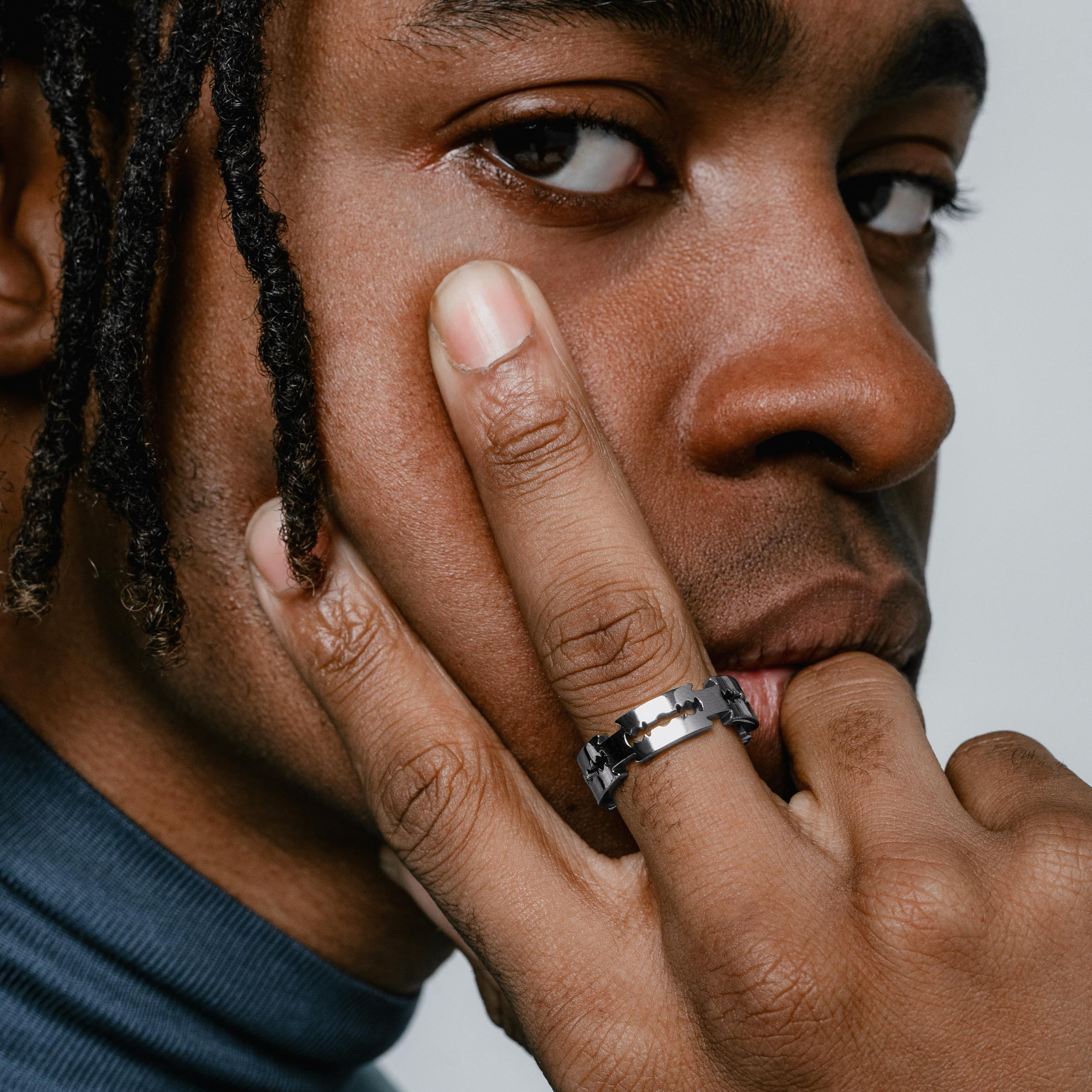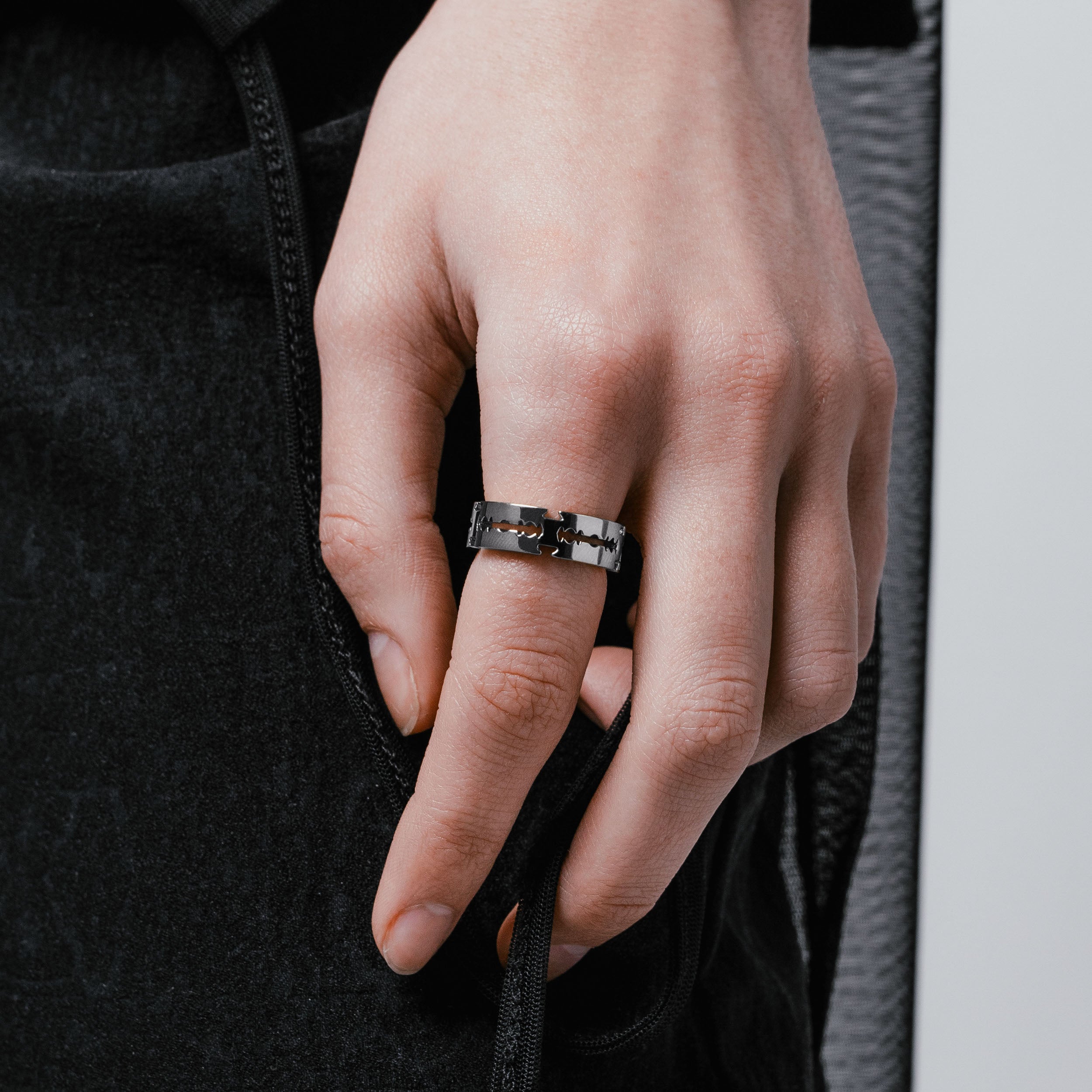 This band ring is composed of interlocking razors. Each blade is finished with intricate laser-cut detailing.