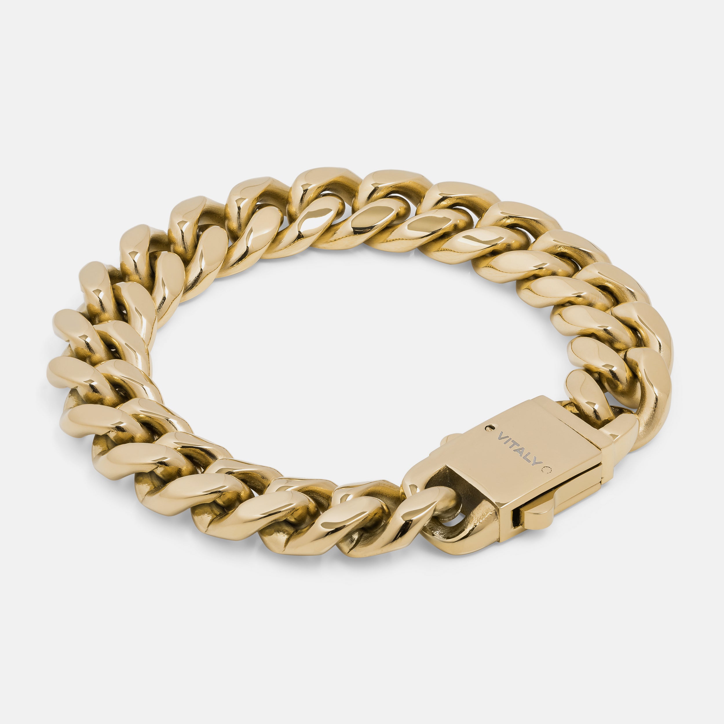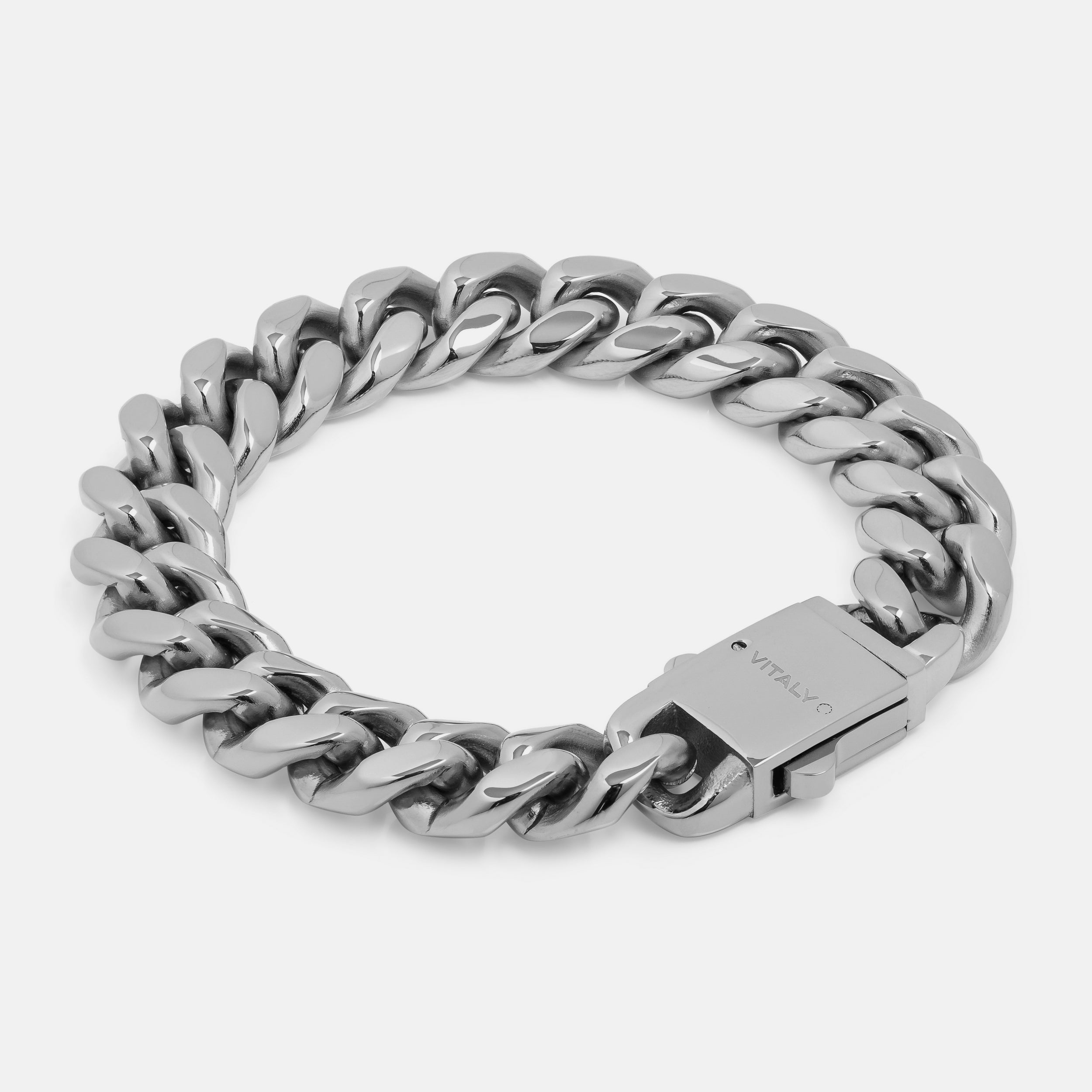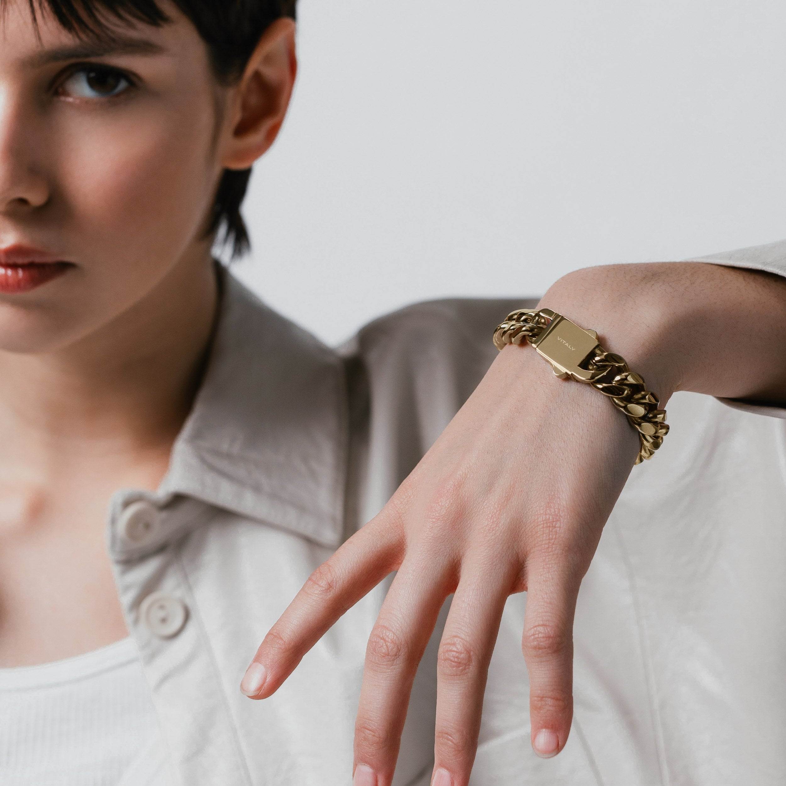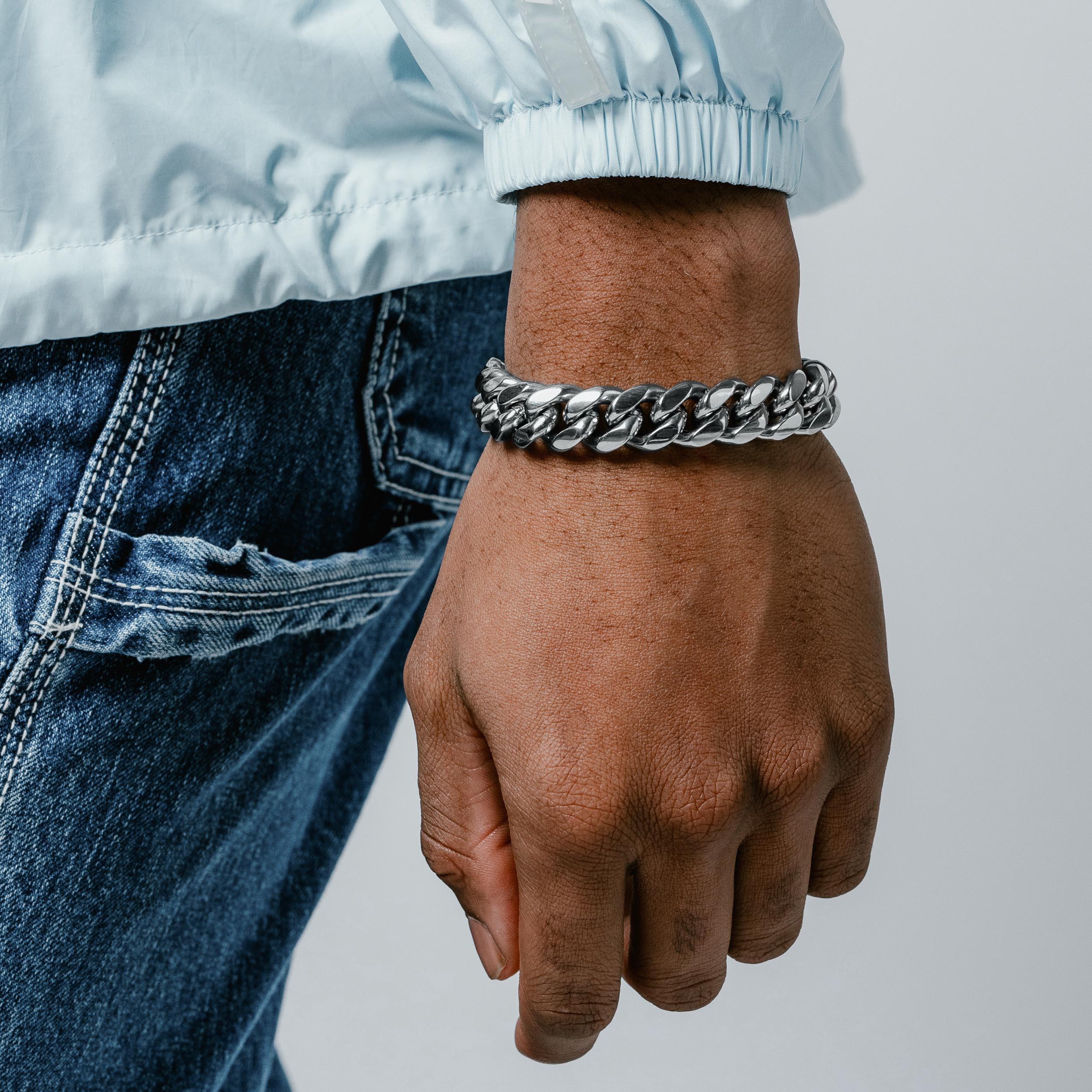 This versatile bracelet features tightly woven links and a laser-engraved buckle clasp that can be worn facing up or down.