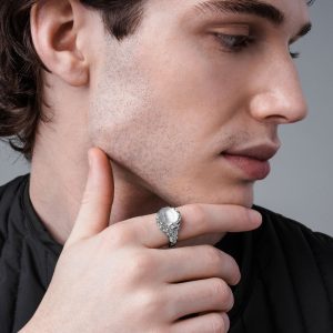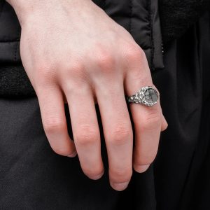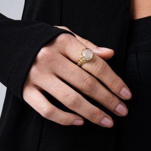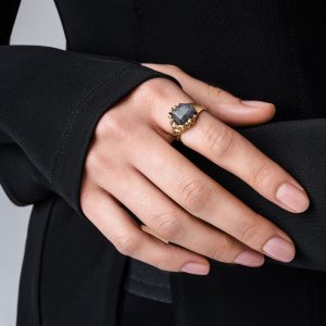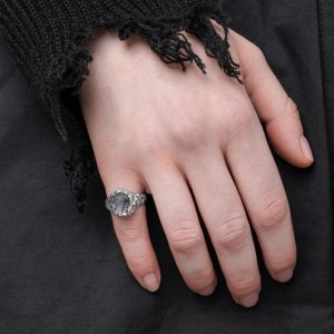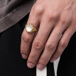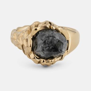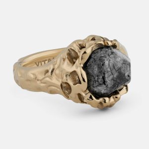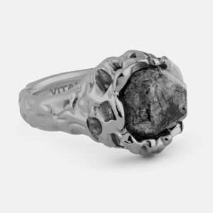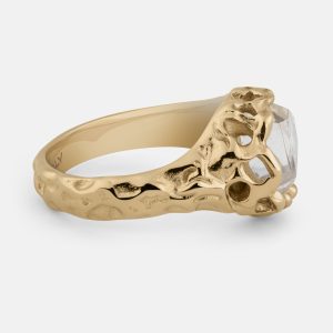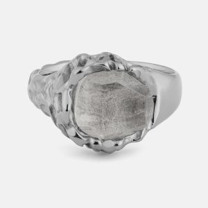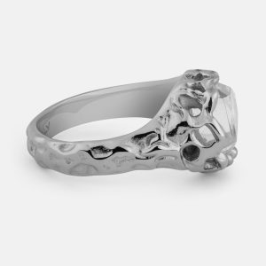 Fit for a king. the Realm features a large quartz stone with angular facets encased in a ring that appears molten from one side. and perfectly smooth on the other.