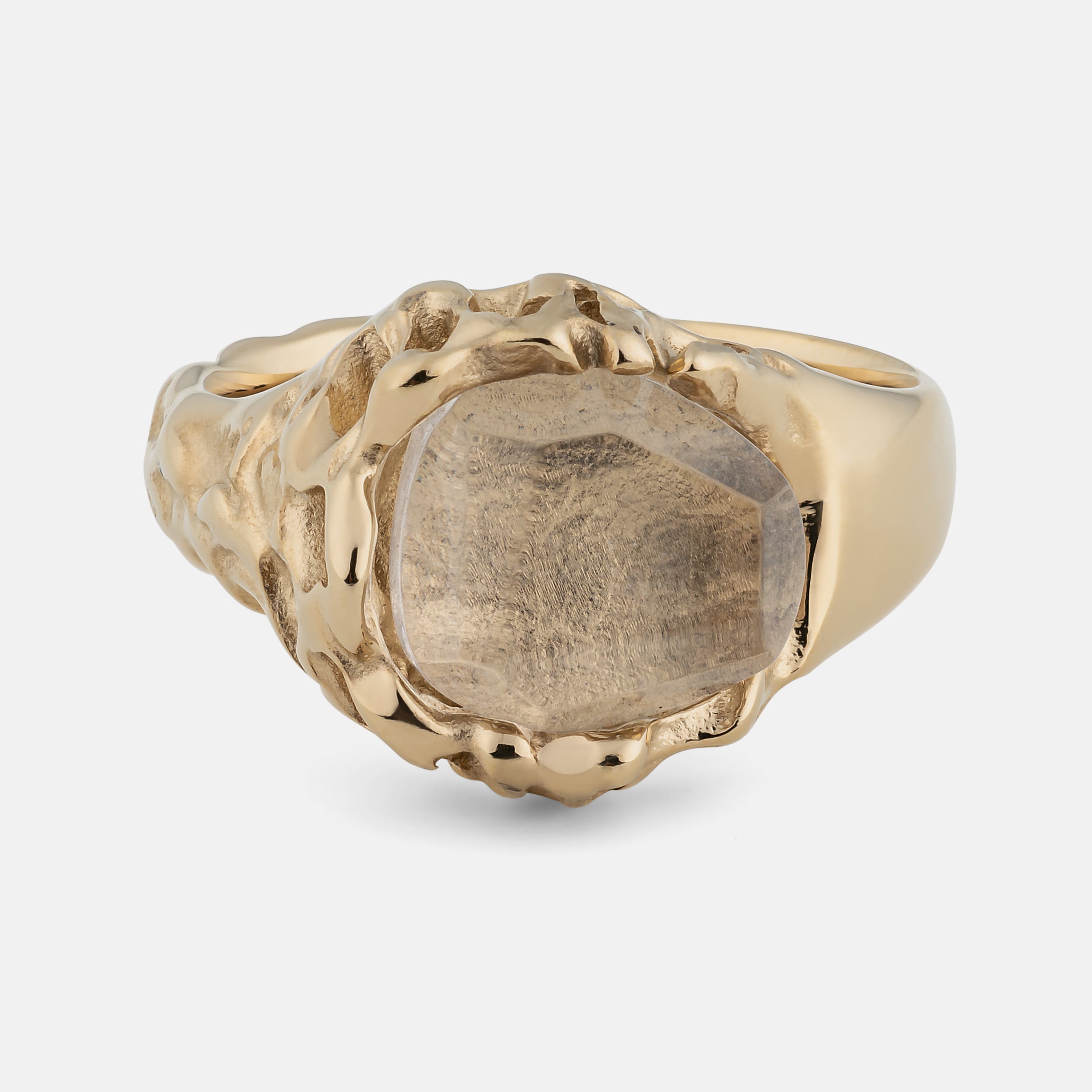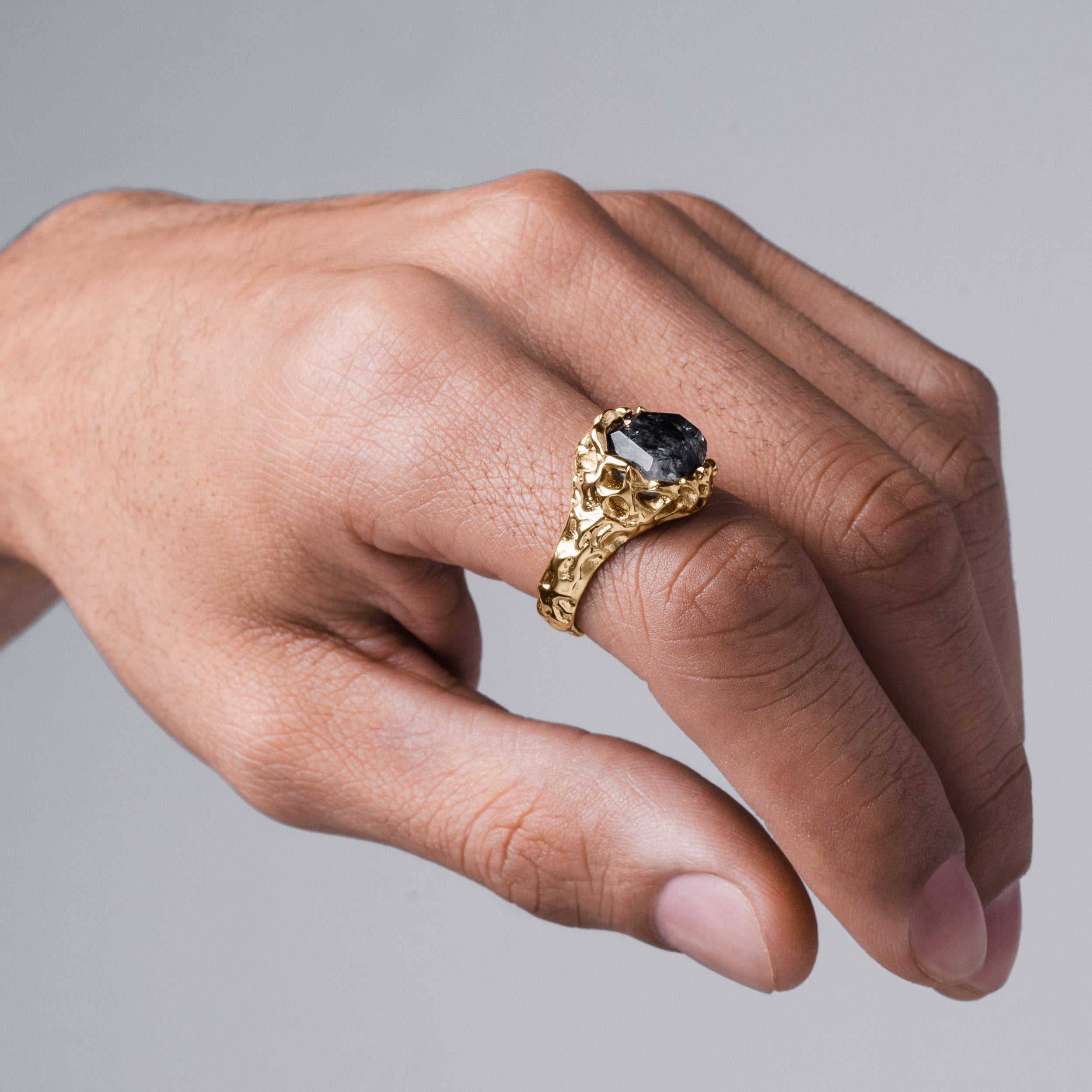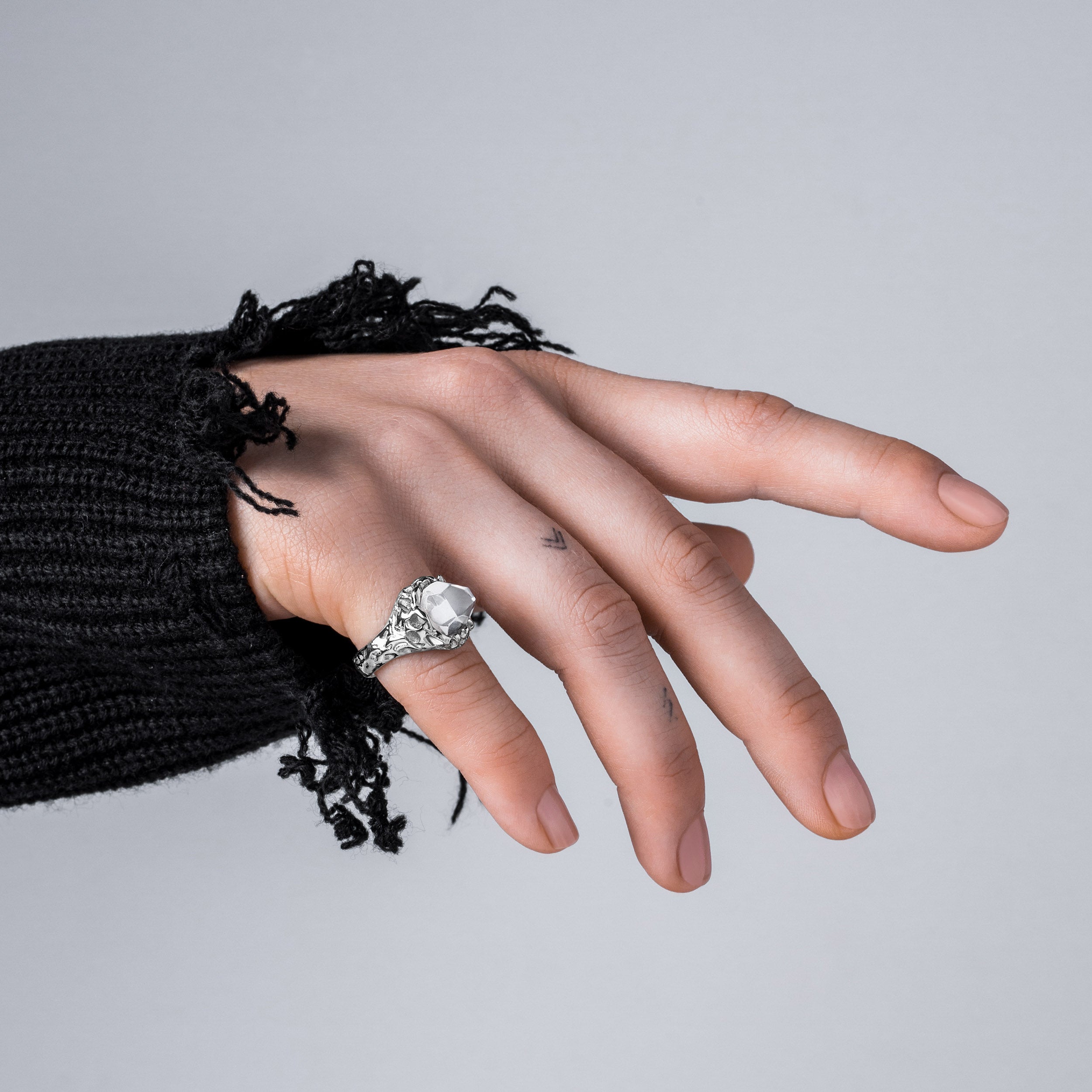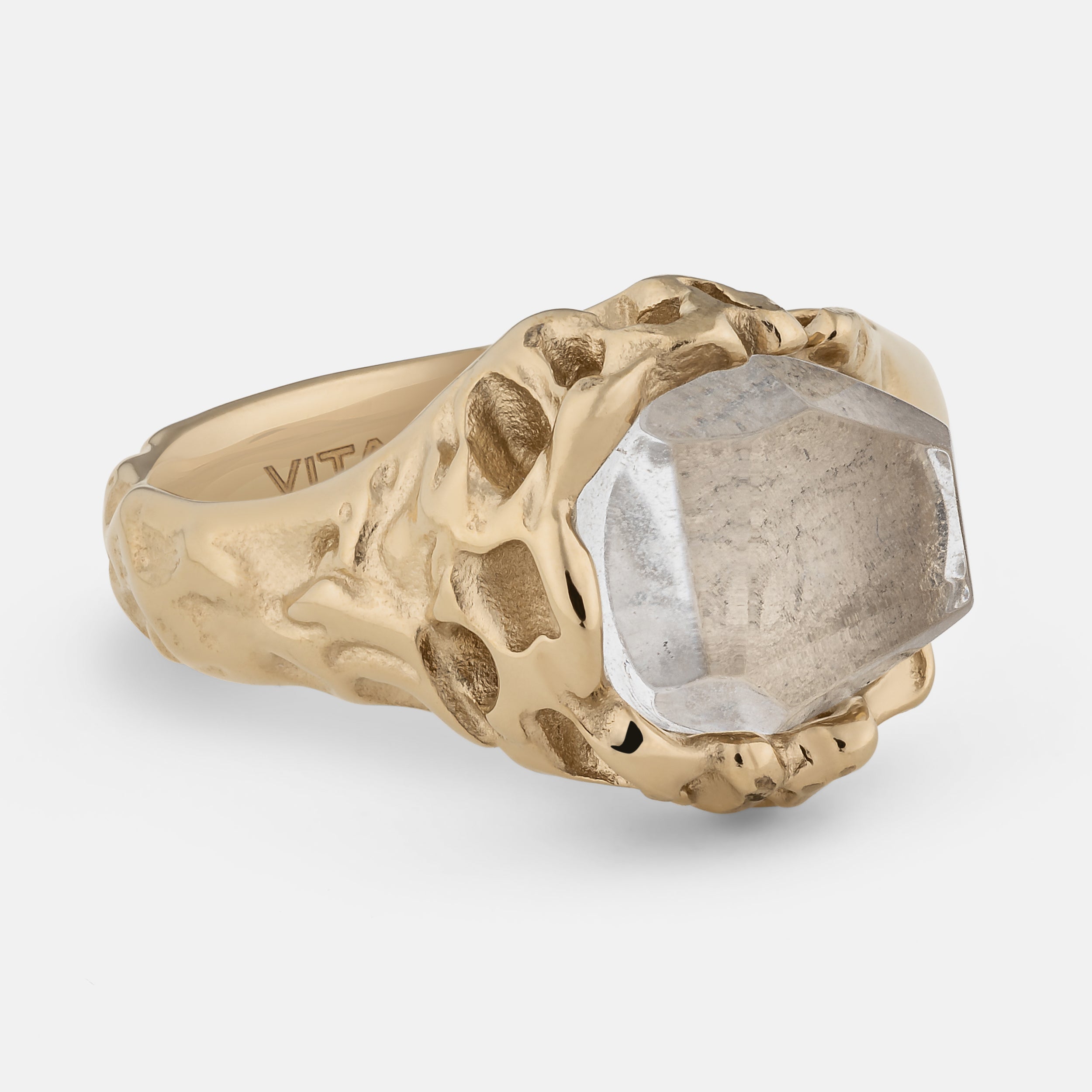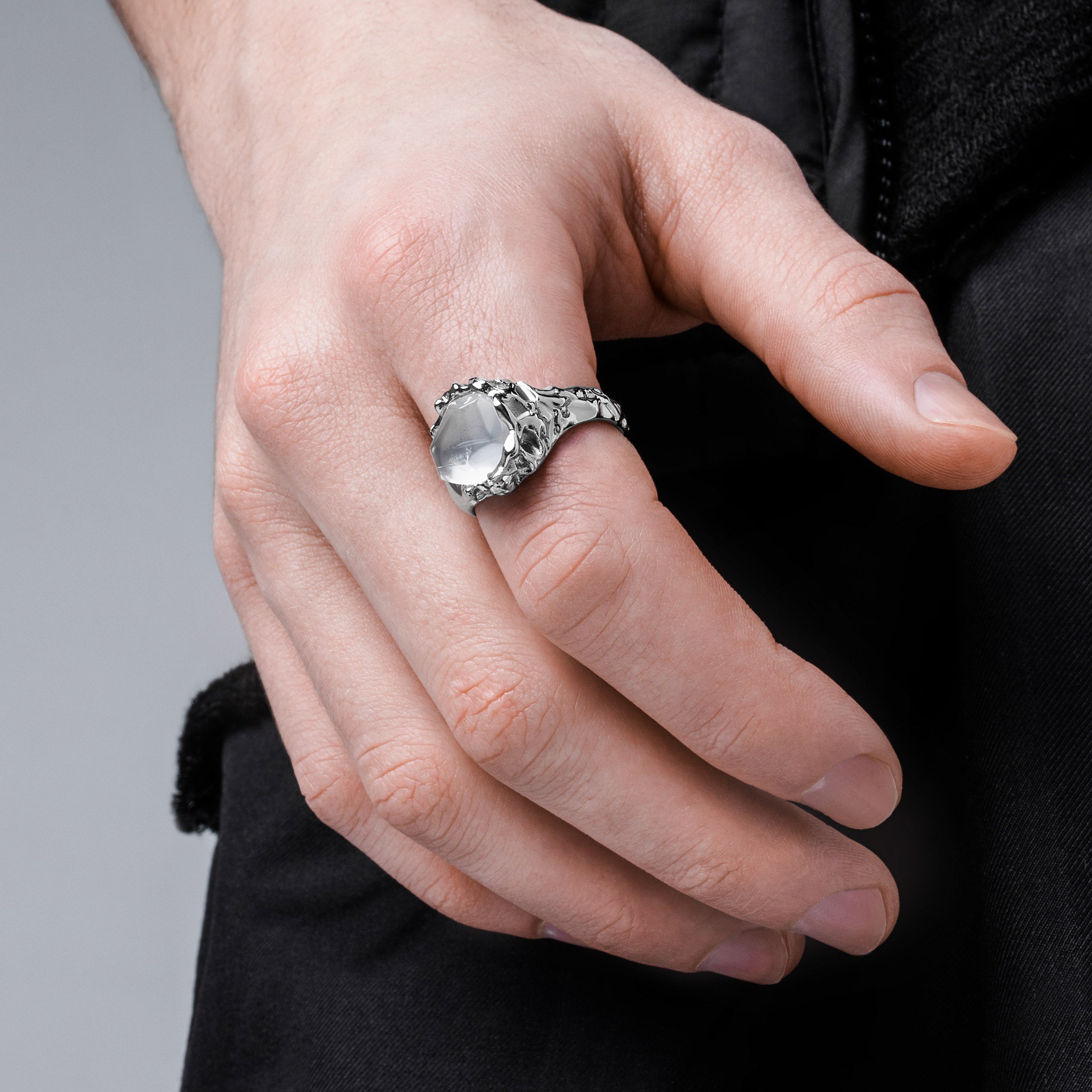 Fit for a king. the Realm features a large quartz stone with angular facets encased in a ring that appears molten from one side. and perfectly smooth on the other.