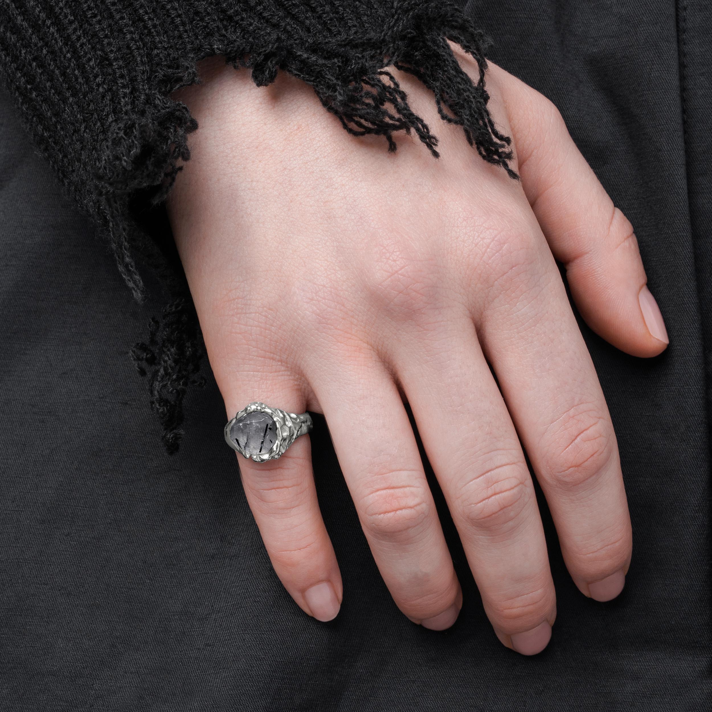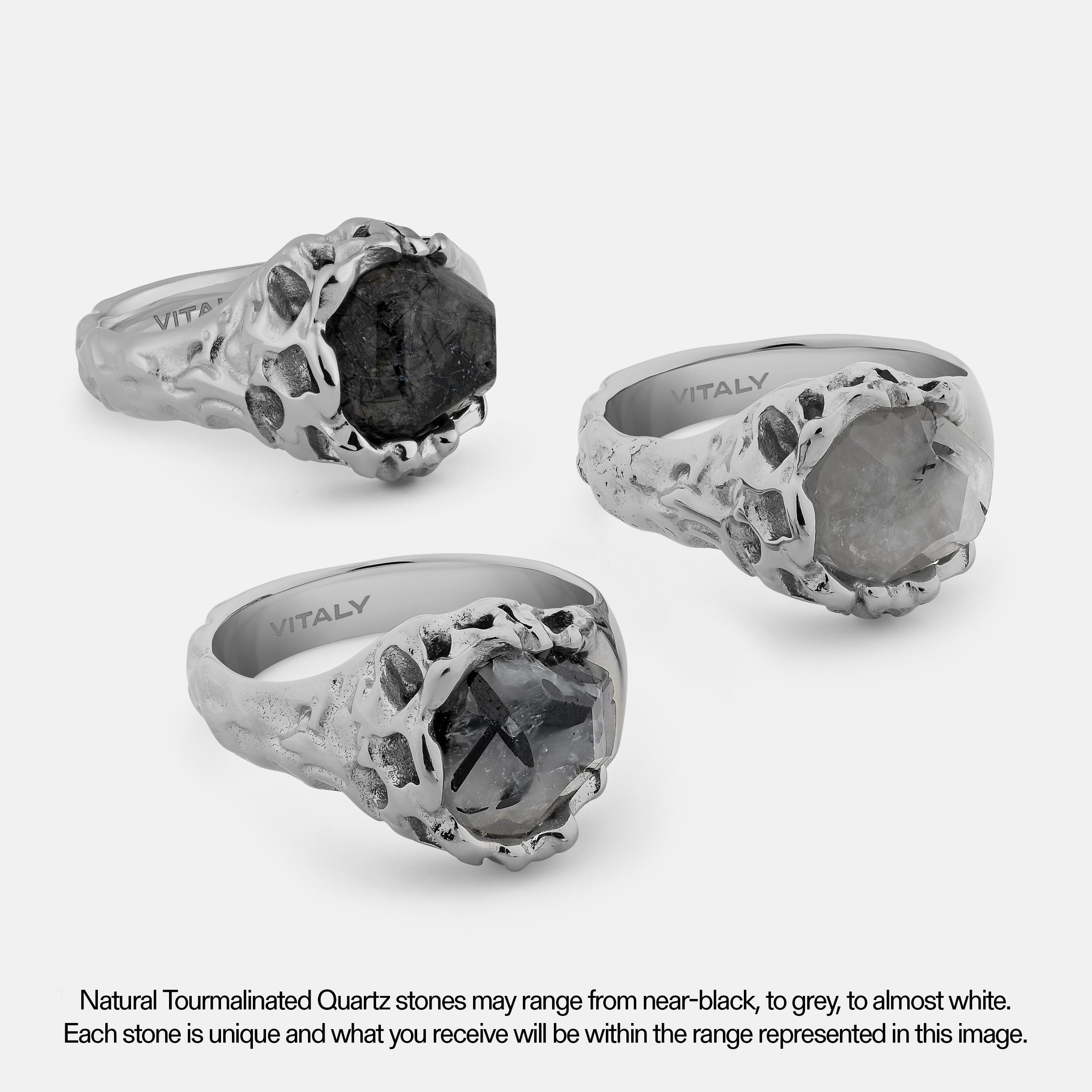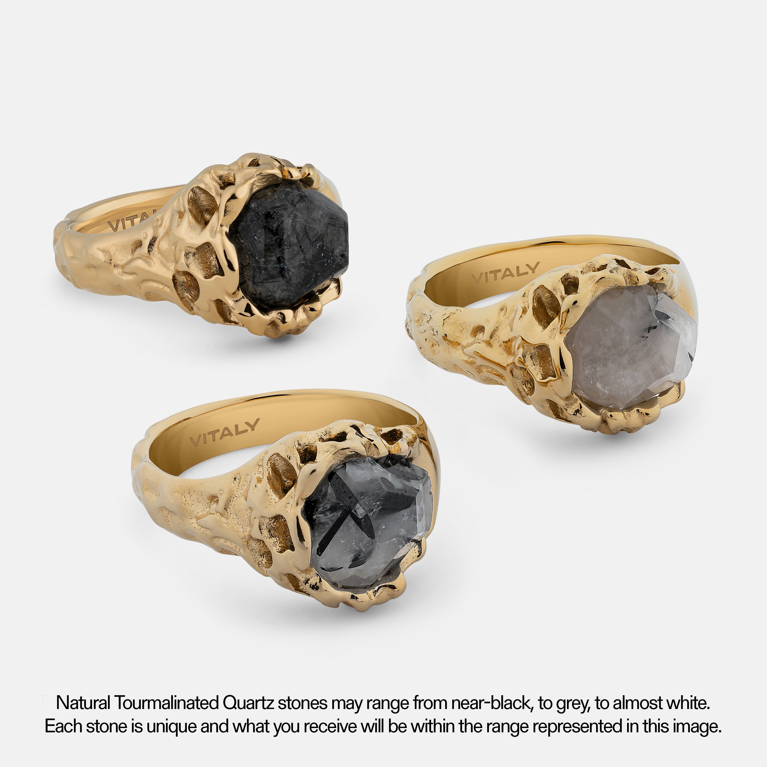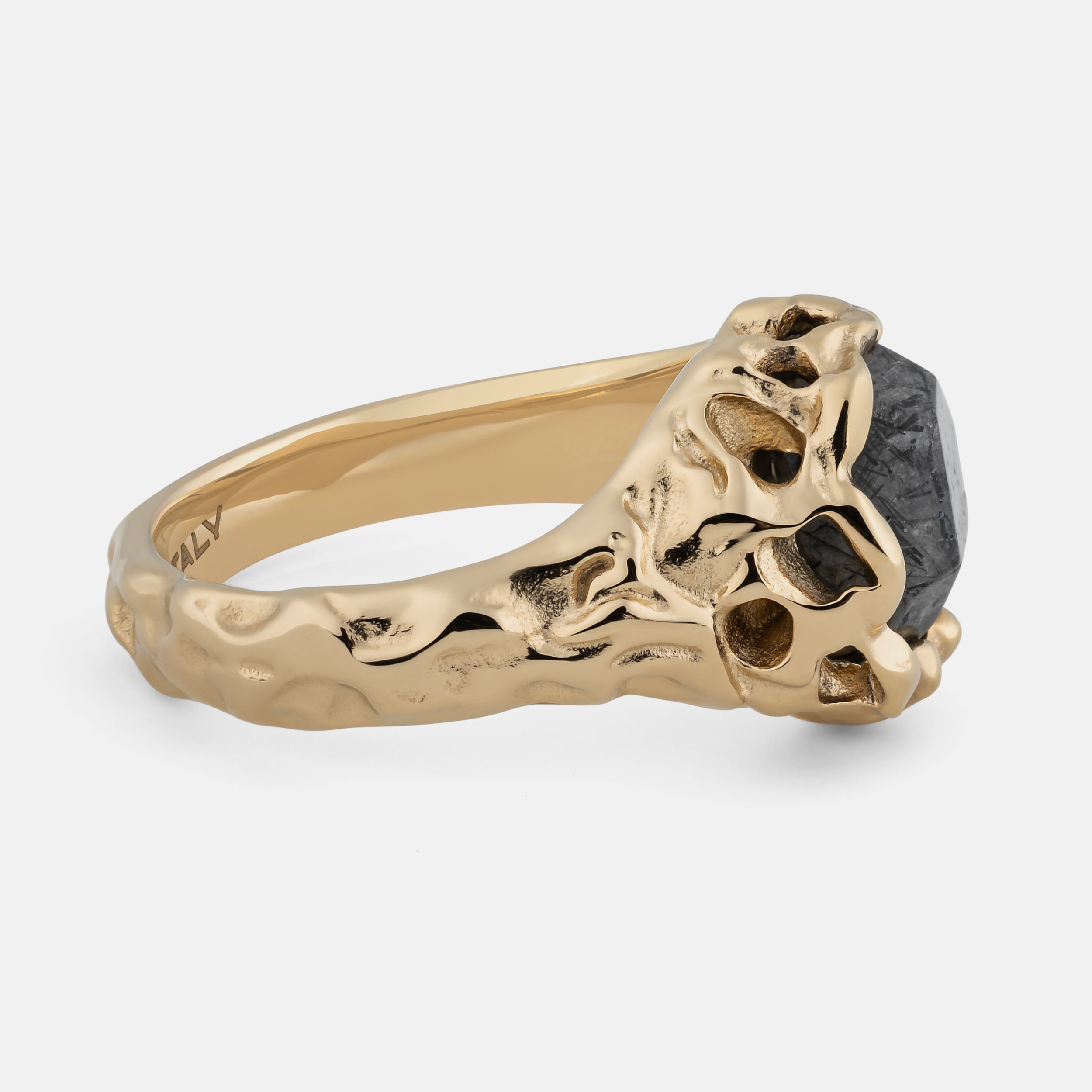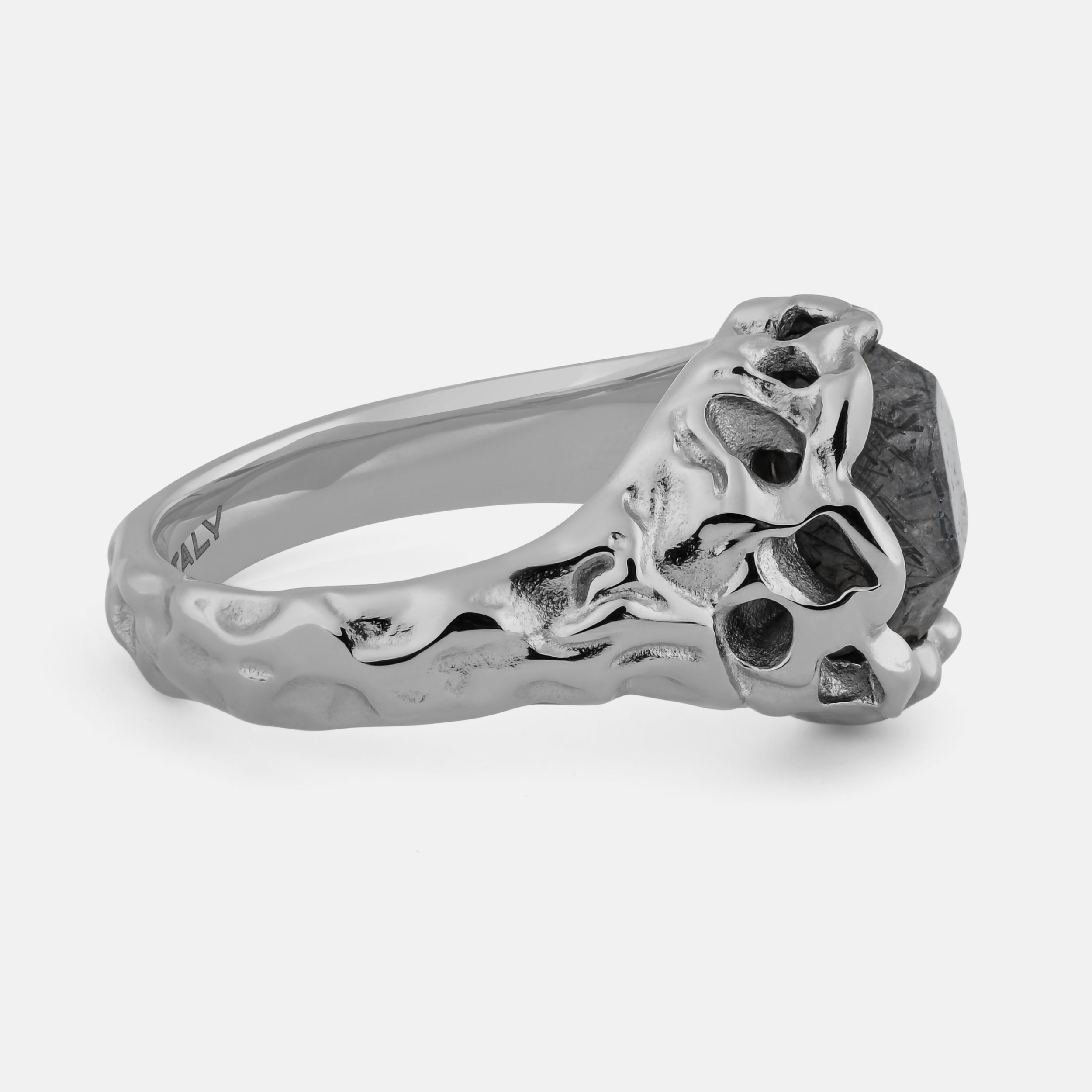 Fit for a king. the Realm features a large quartz stone with angular facets encased in a ring that appears molten from one side. and perfectly smooth on the other.