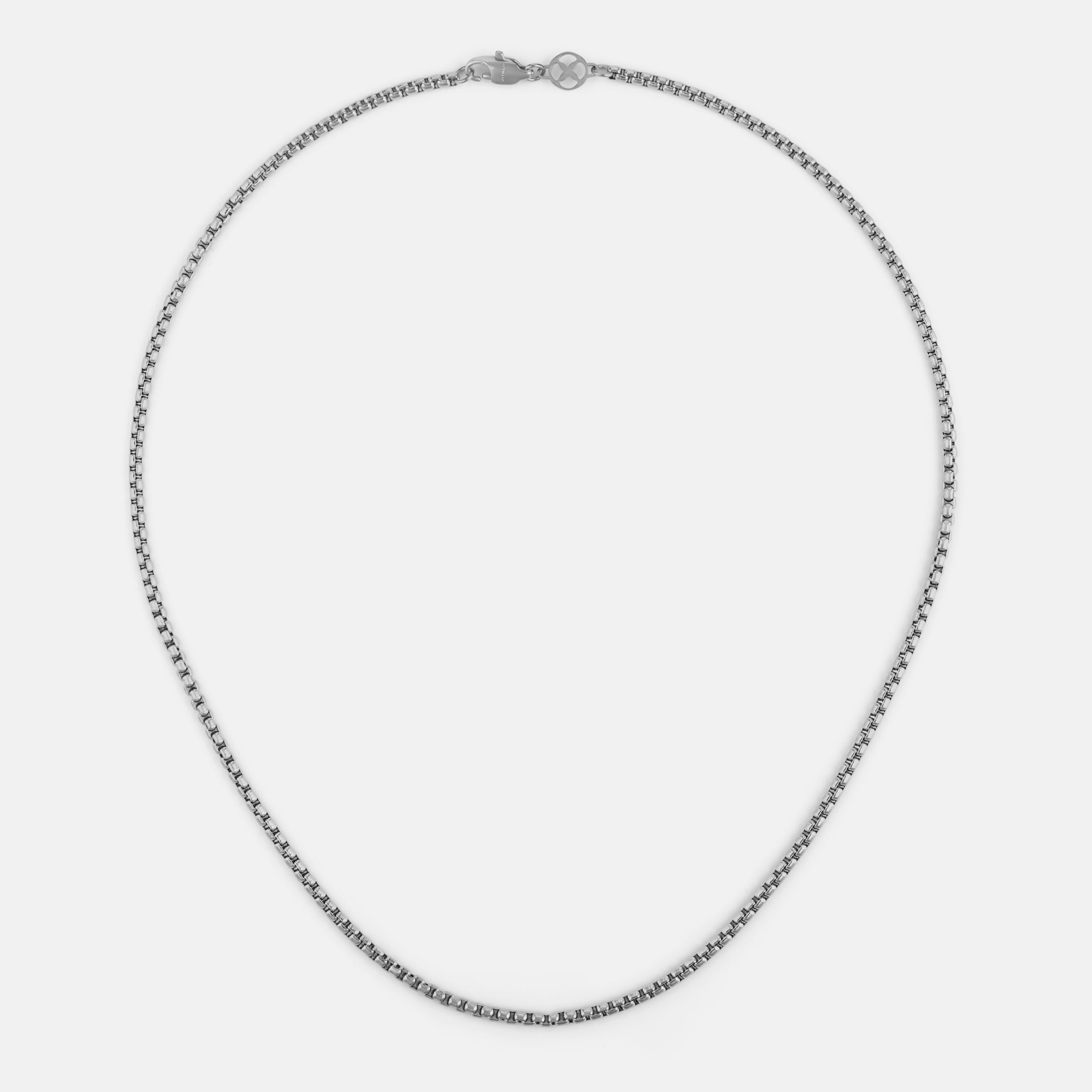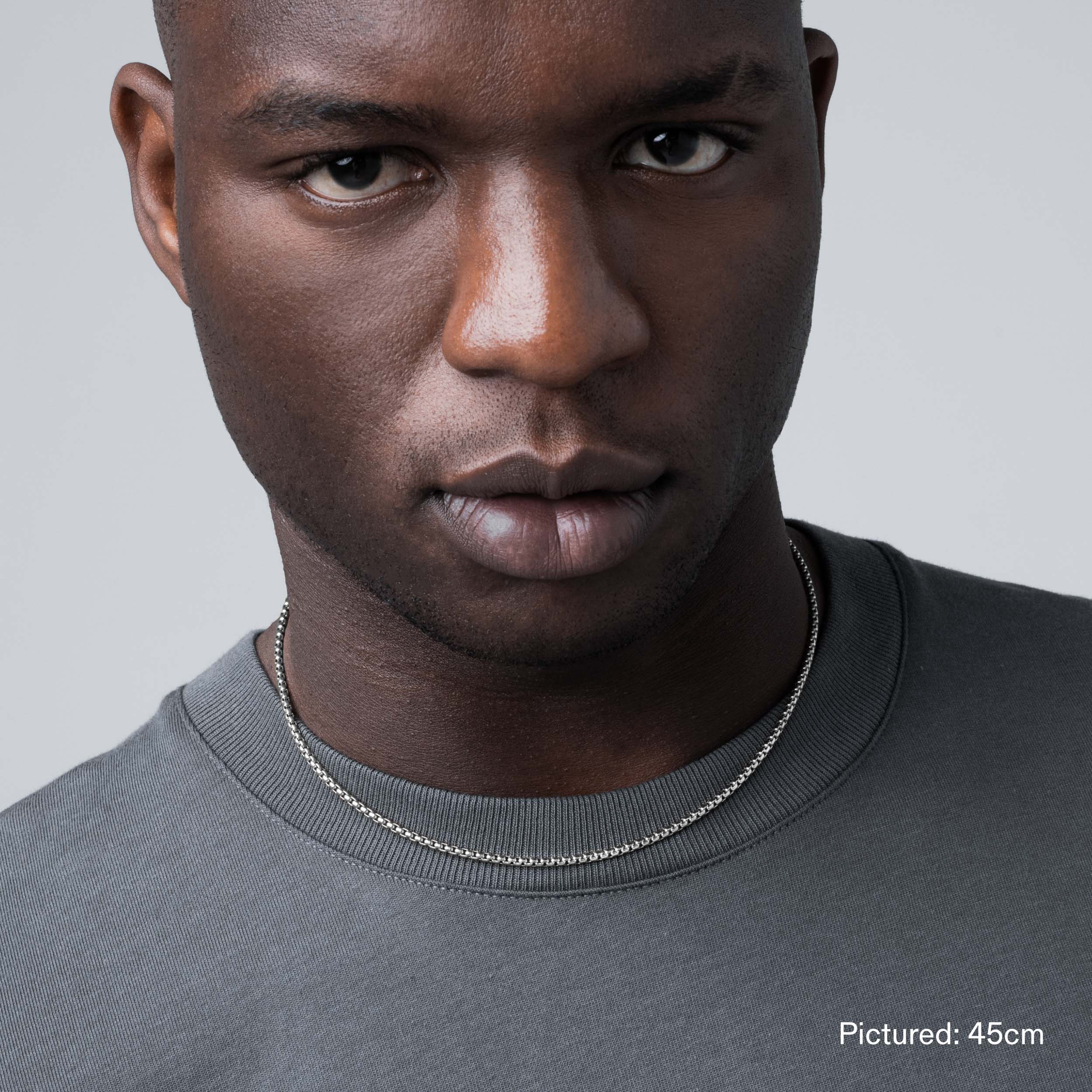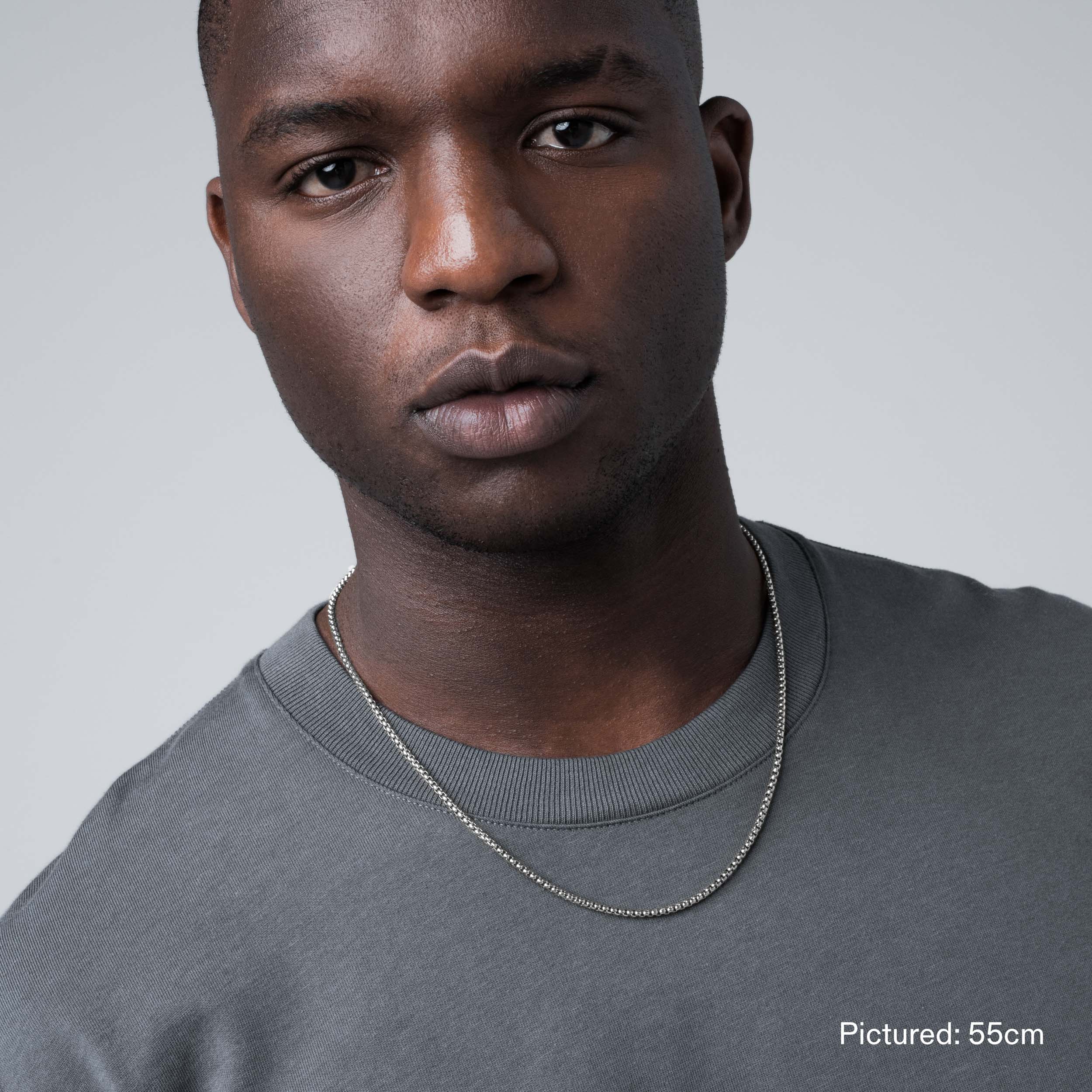 Single 45cm. 55cm. or 65cm length Rounded Box chain. 2.4mm thick. Finished with our signature Glyph clasp tag.