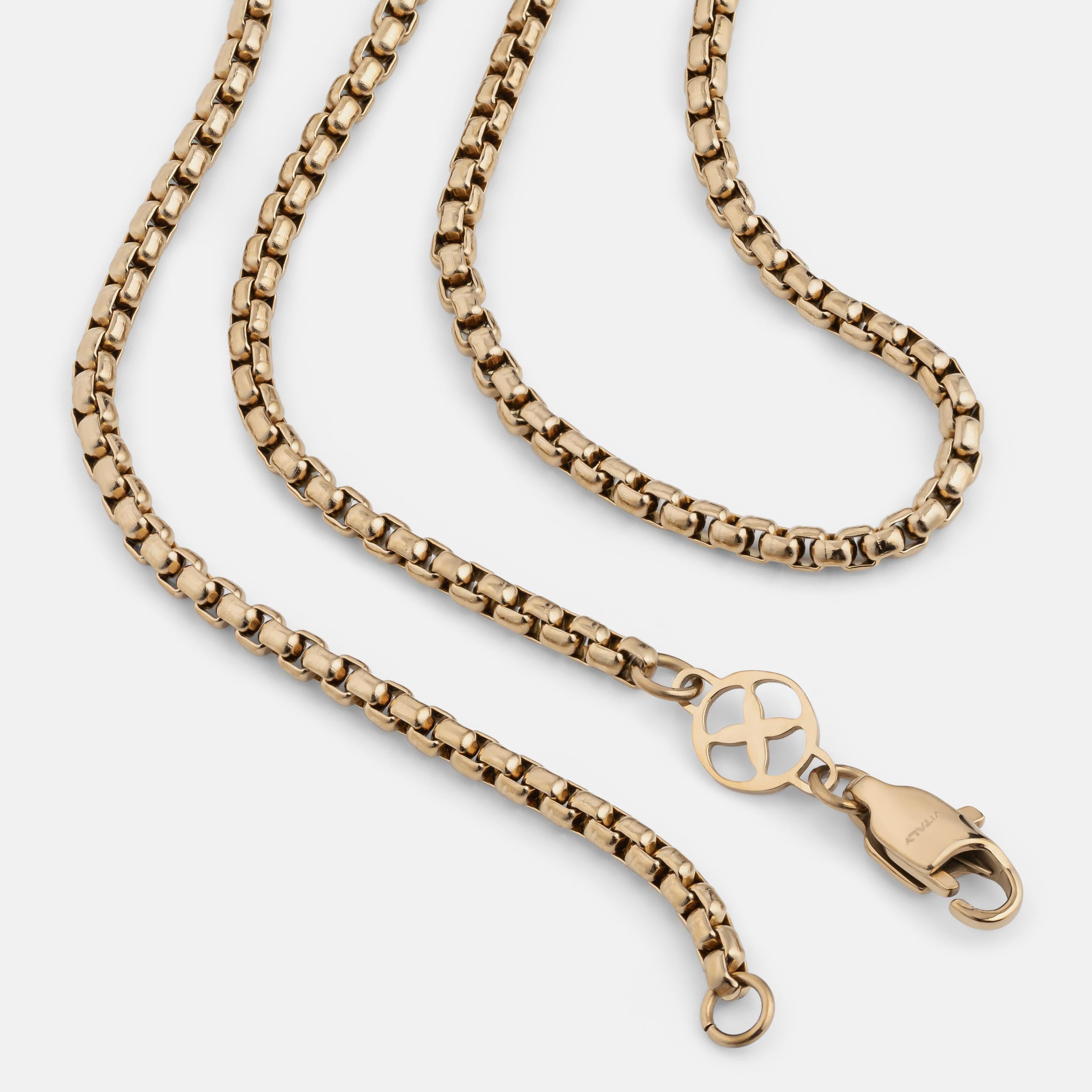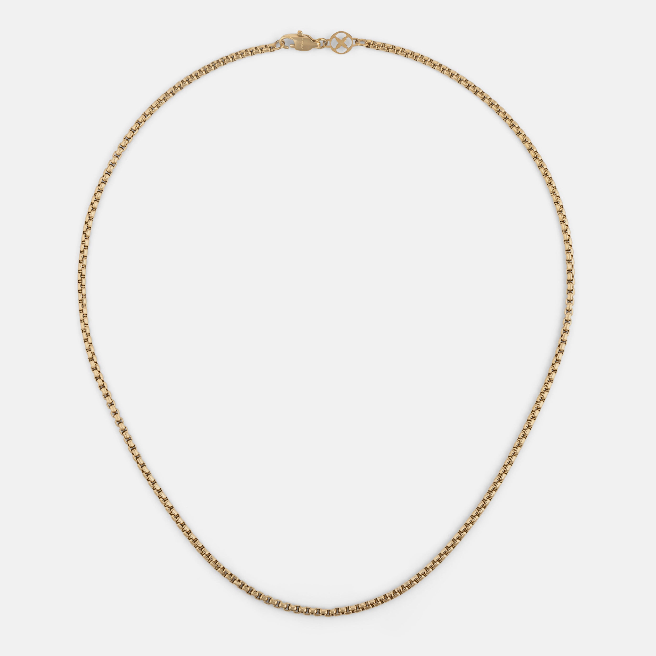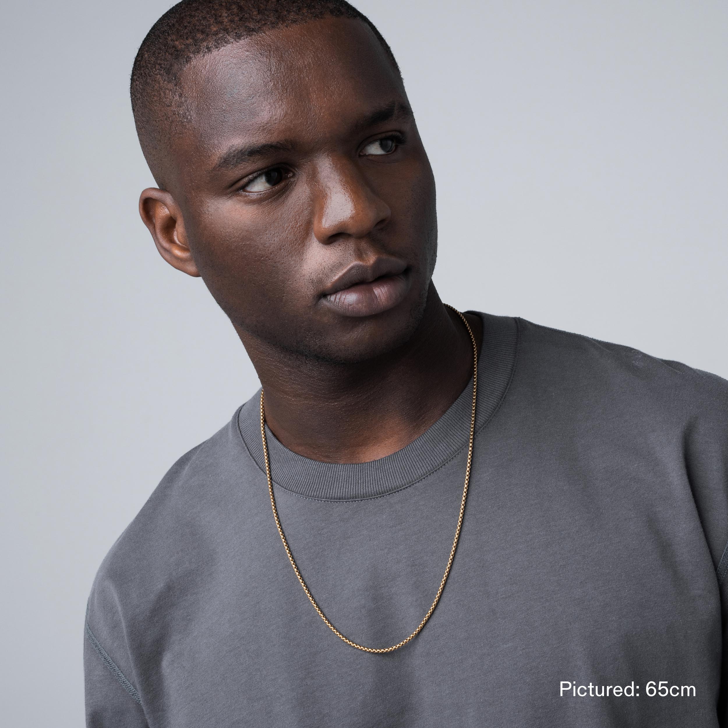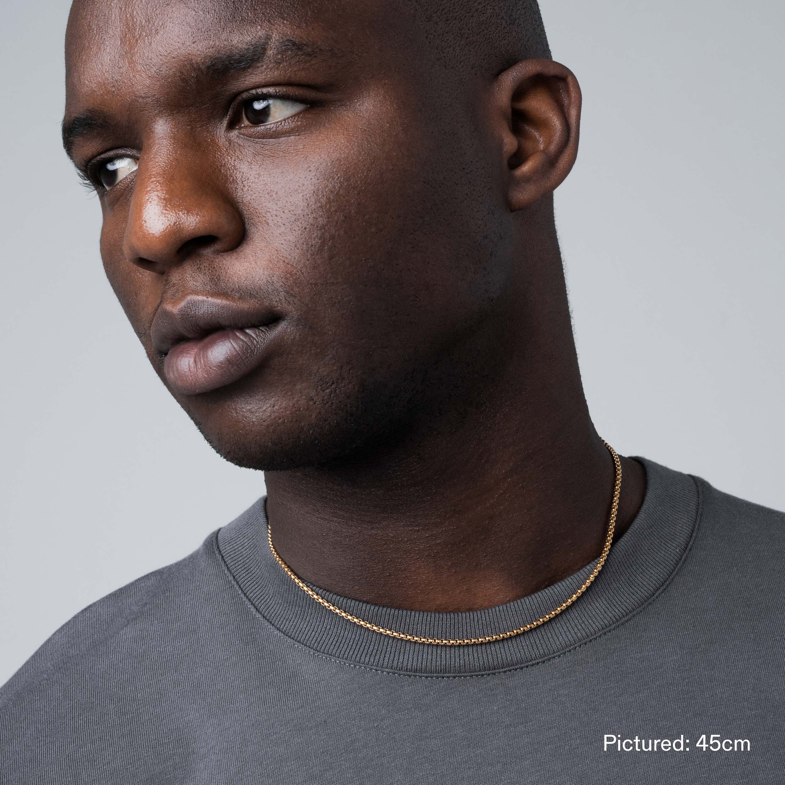Single 45cm. 55cm. or 65cm length Rounded Box chain. 2.4mm thick. Finished with our signature Glyph clasp tag.