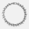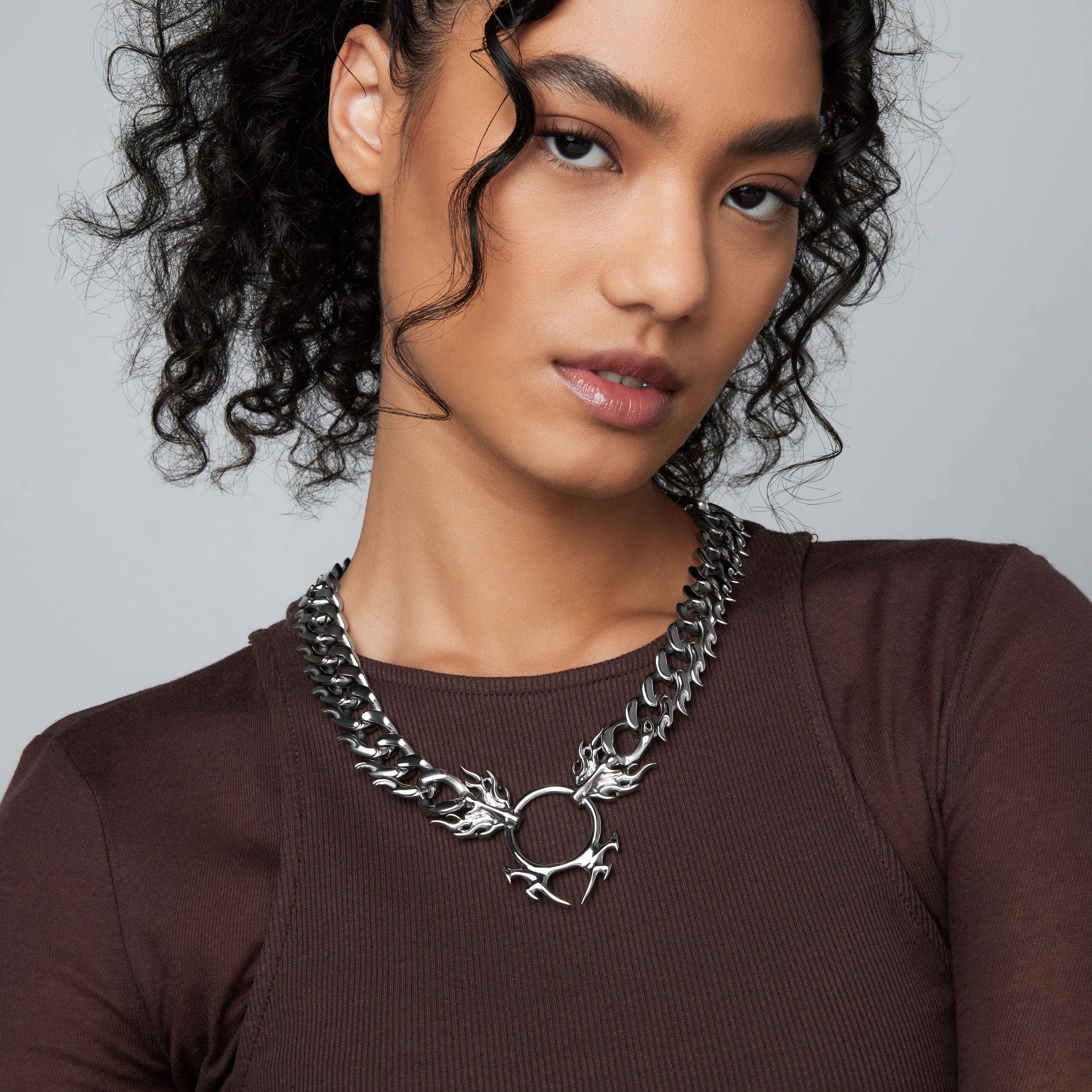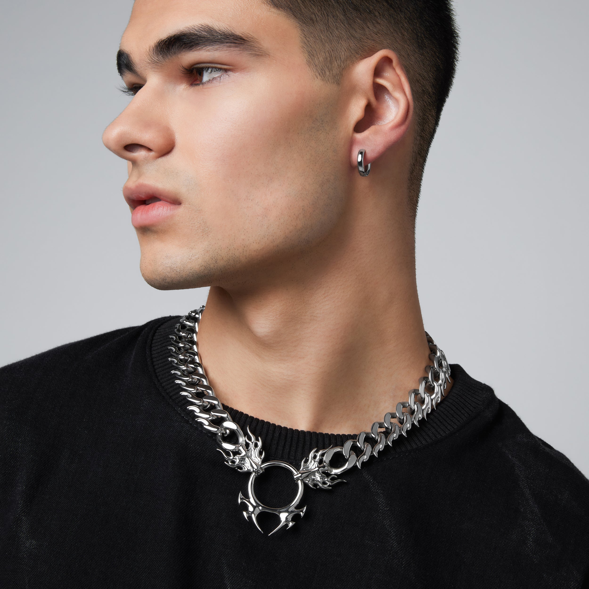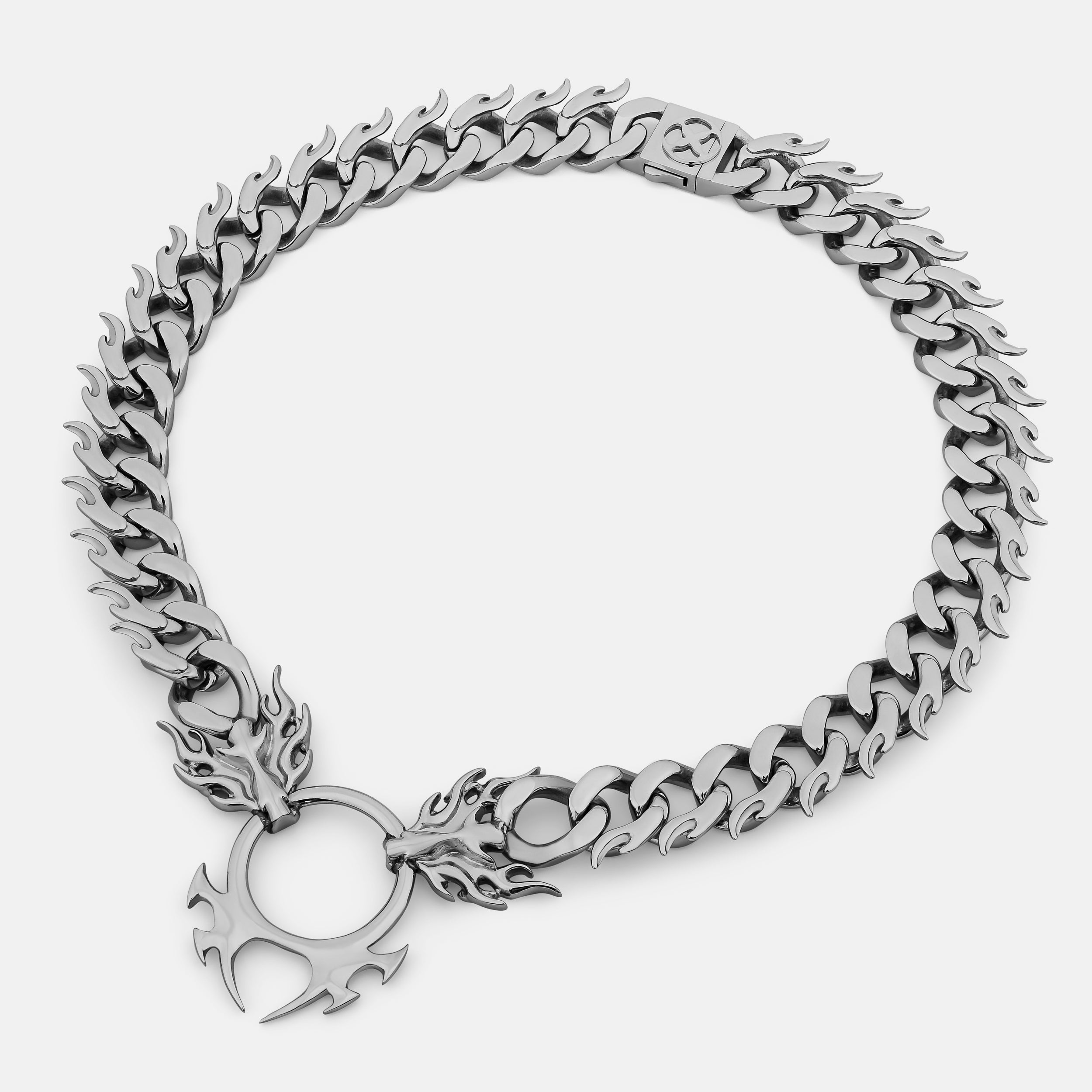 Created in collaboration with artist and designer Denzel Currie. AKA . the Scylla is an intricately detailed chain that pulls imagery from his own mythically-inspired artworks. Scylla. a monster from Greek mythology. is represented through flame-adorned cuban links and two menacing. dragon-like heads that grip a barbed bull-ring in their mouths. Finished with our signature Glyph buckle clasp.