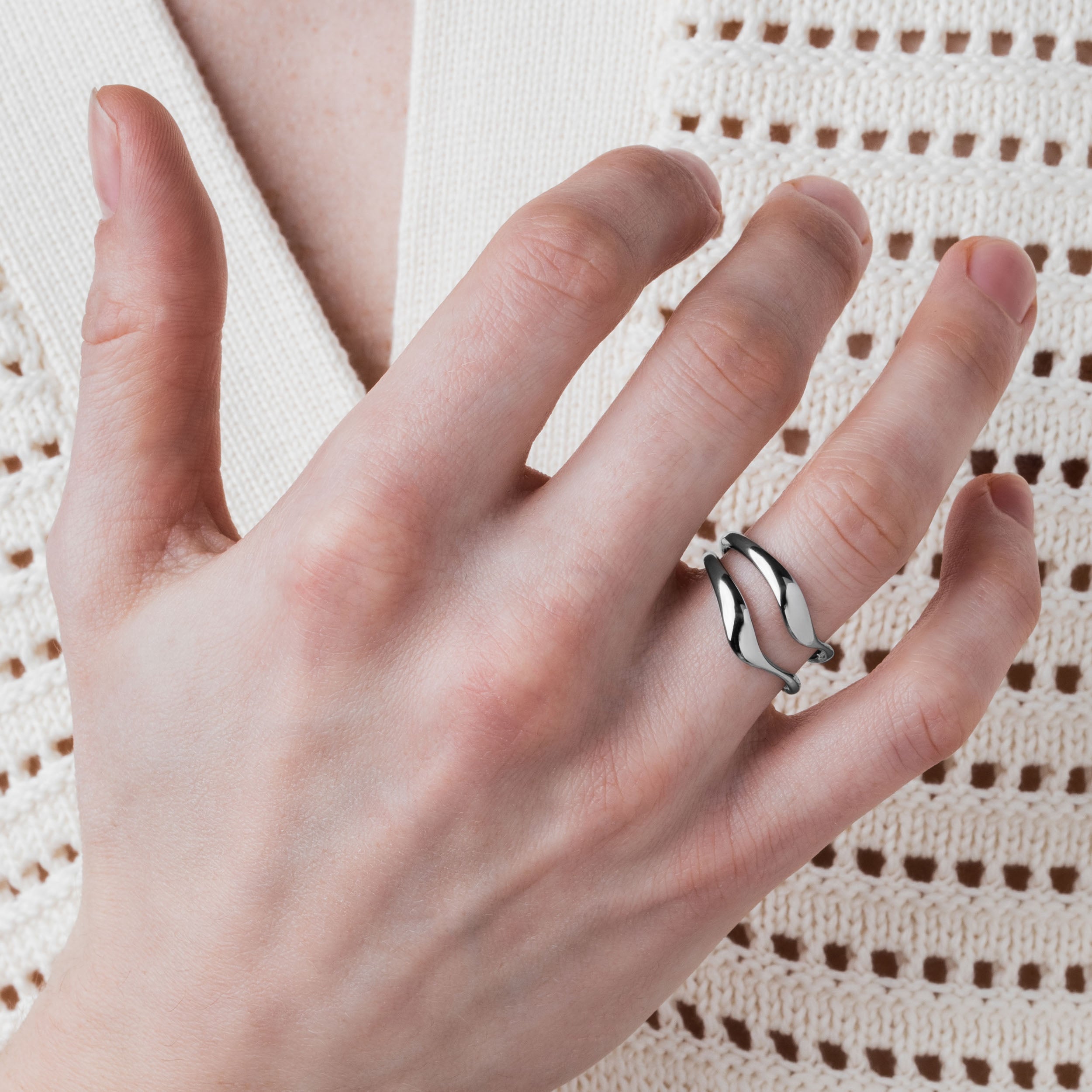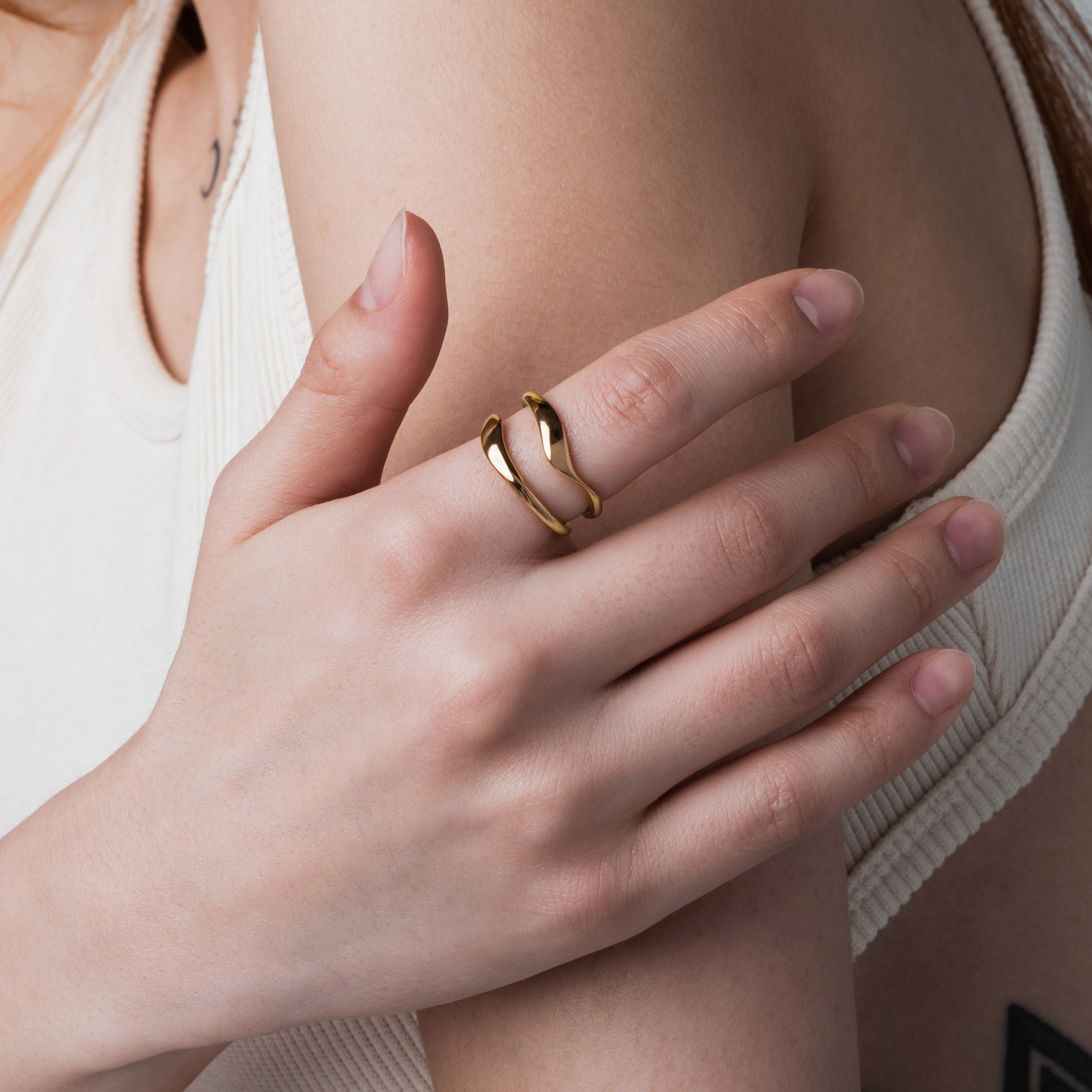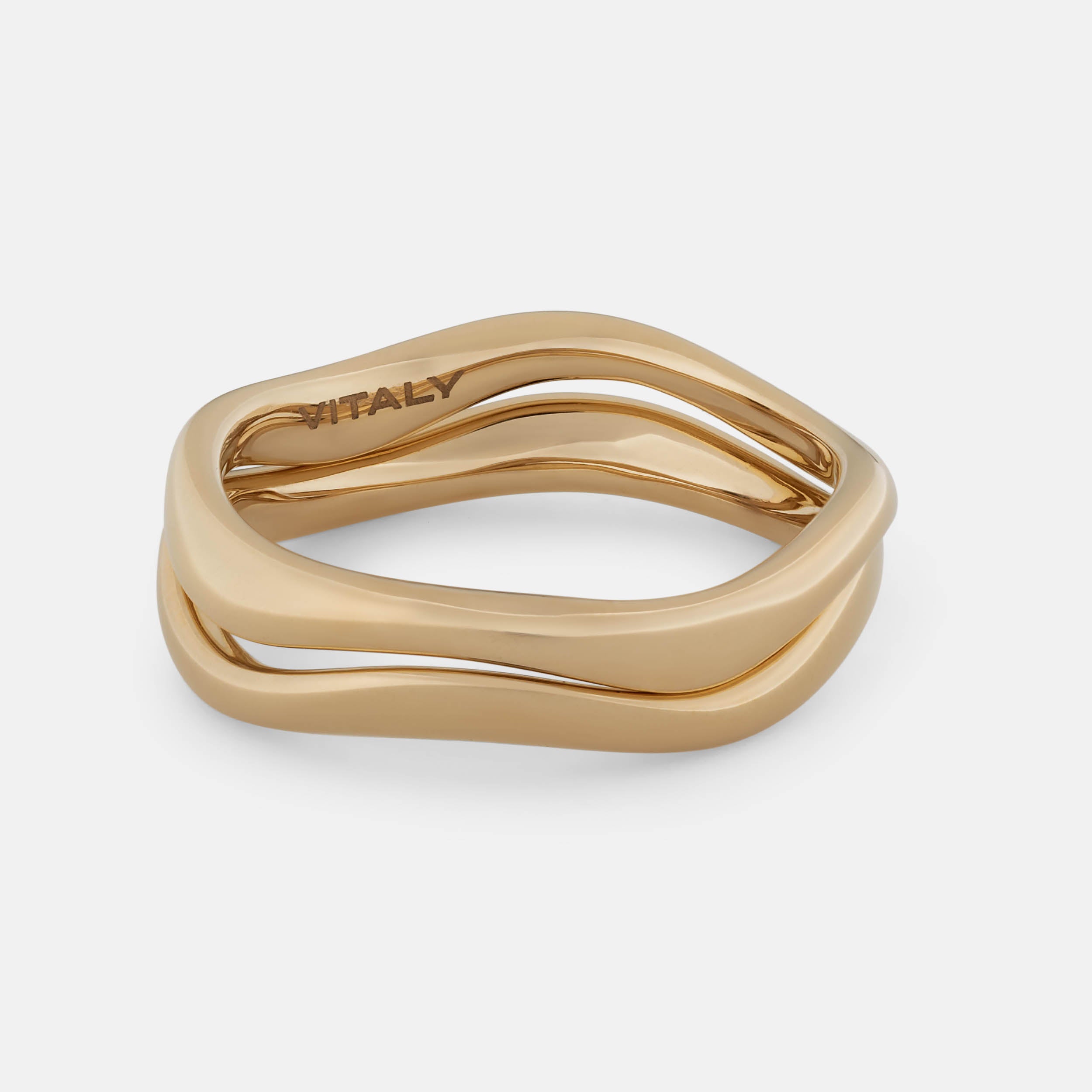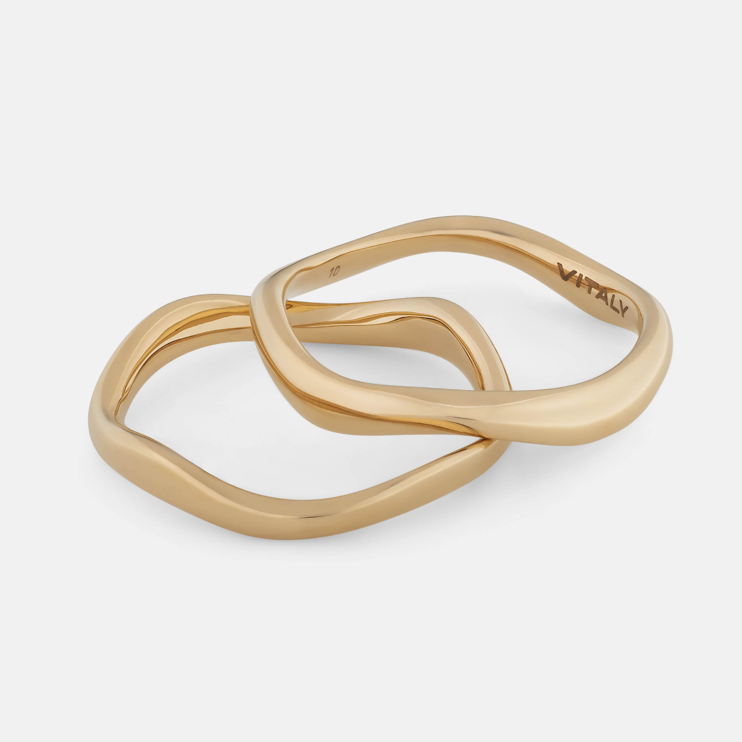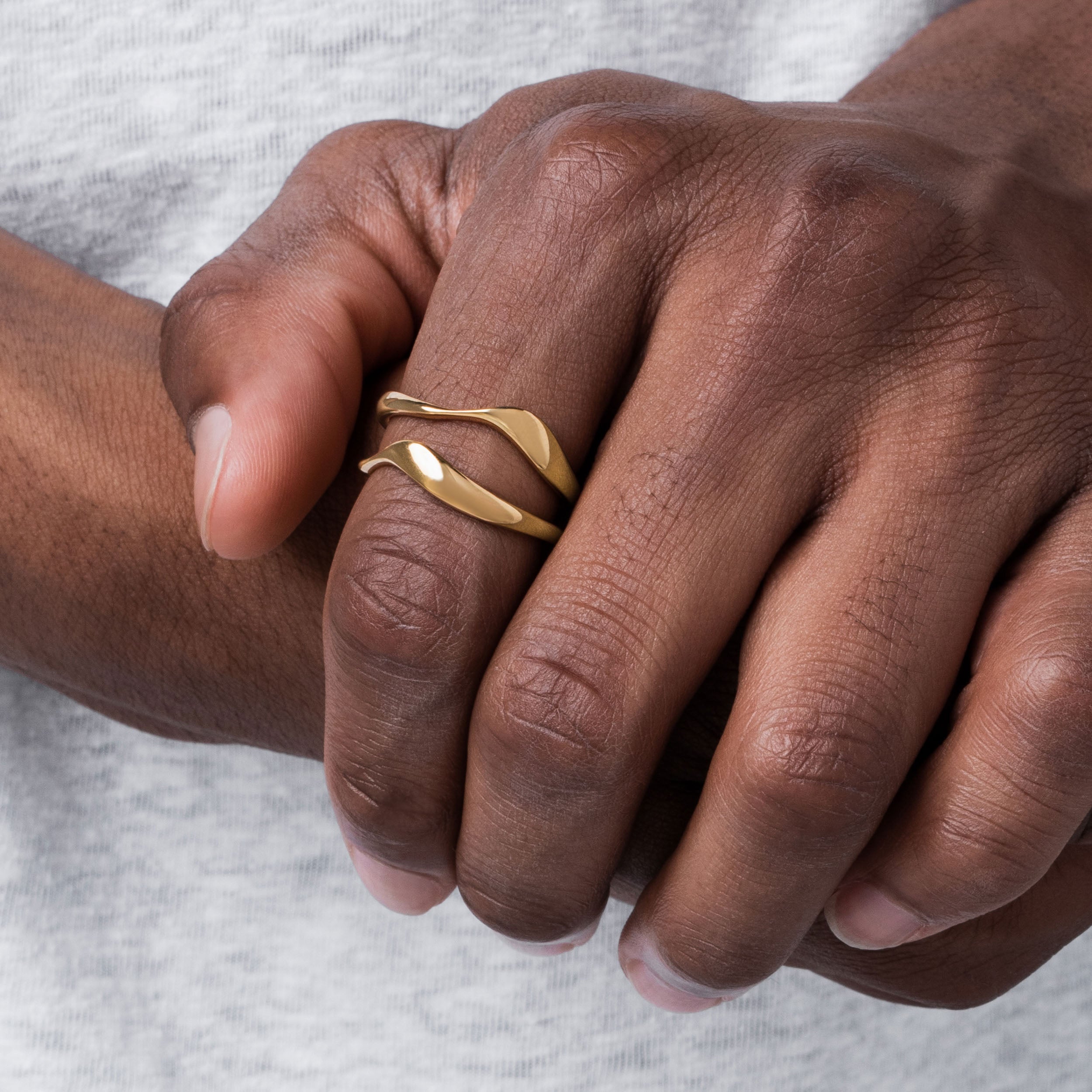 The Slip stackable ring set is comprised of two curving. organic bands. With an asymmetrical form. the rings are designed to be stacked in different configurations or spread across multiple fingers.