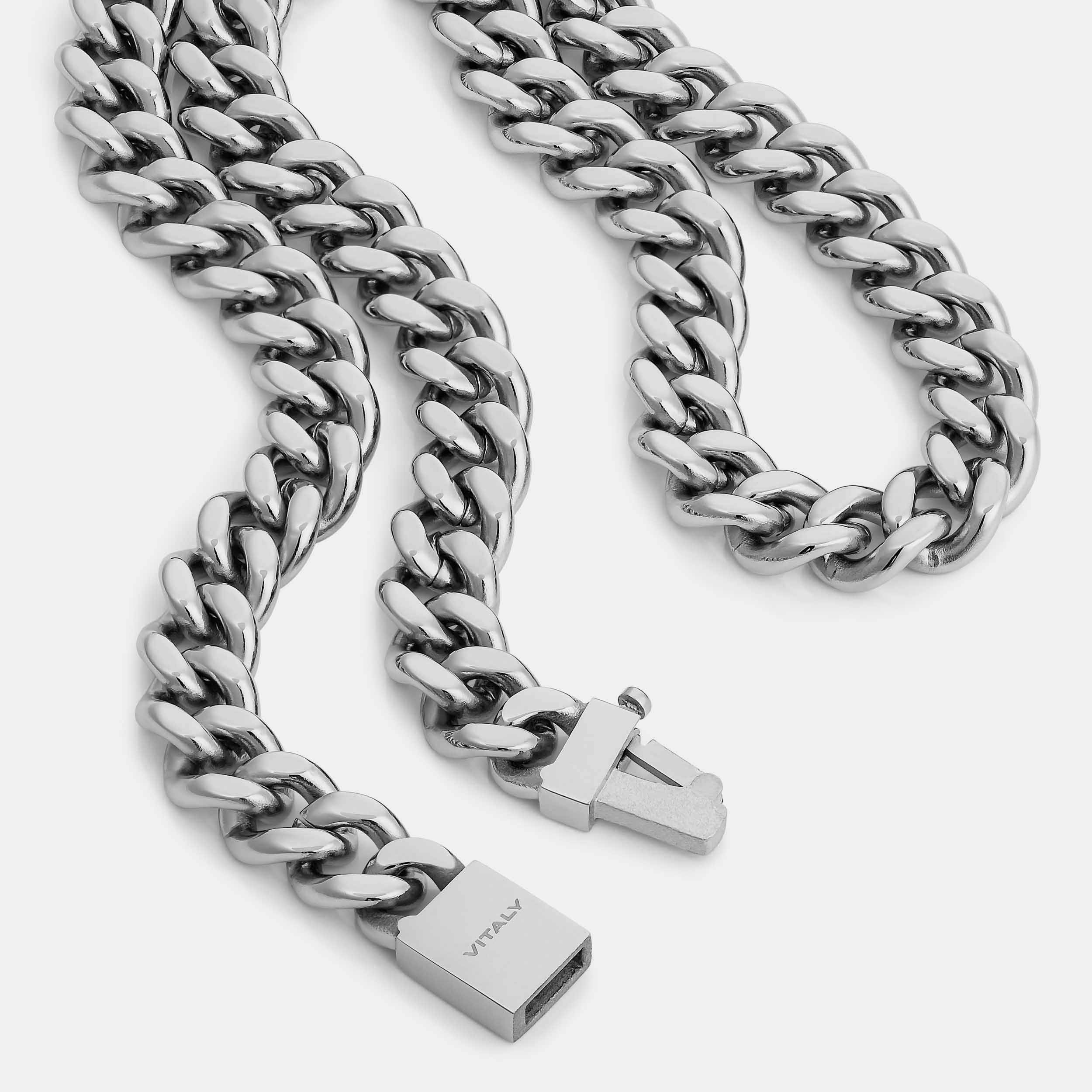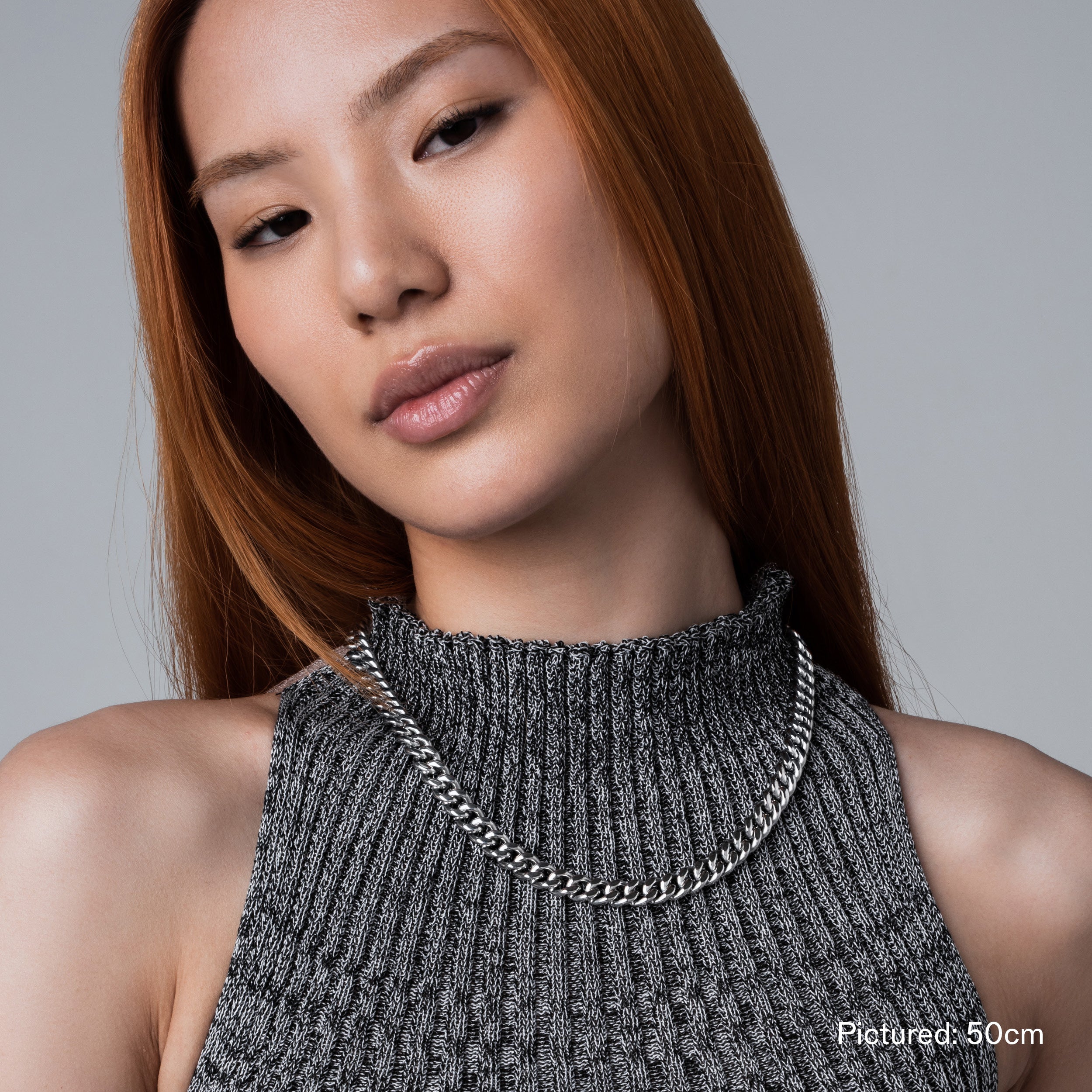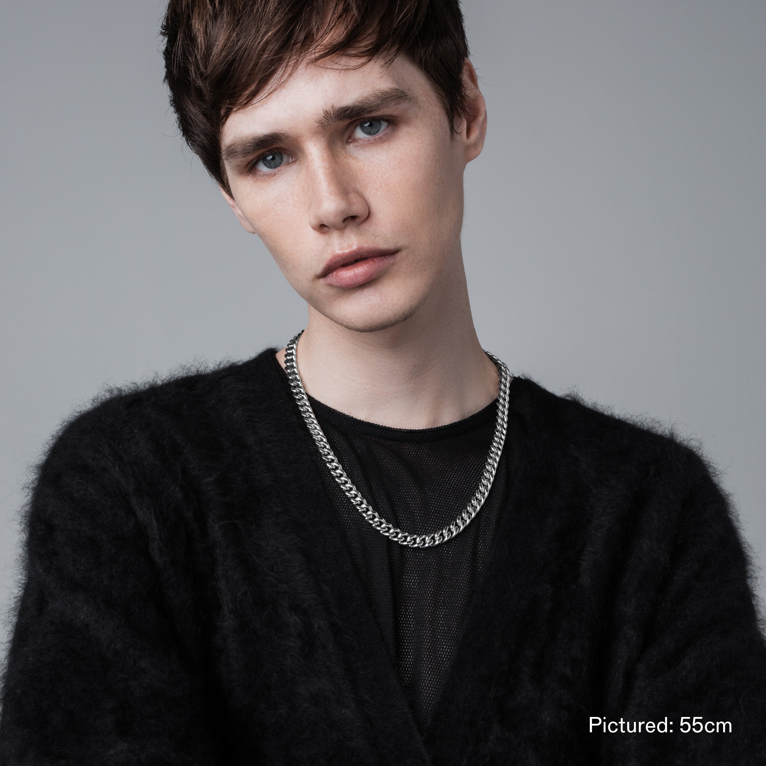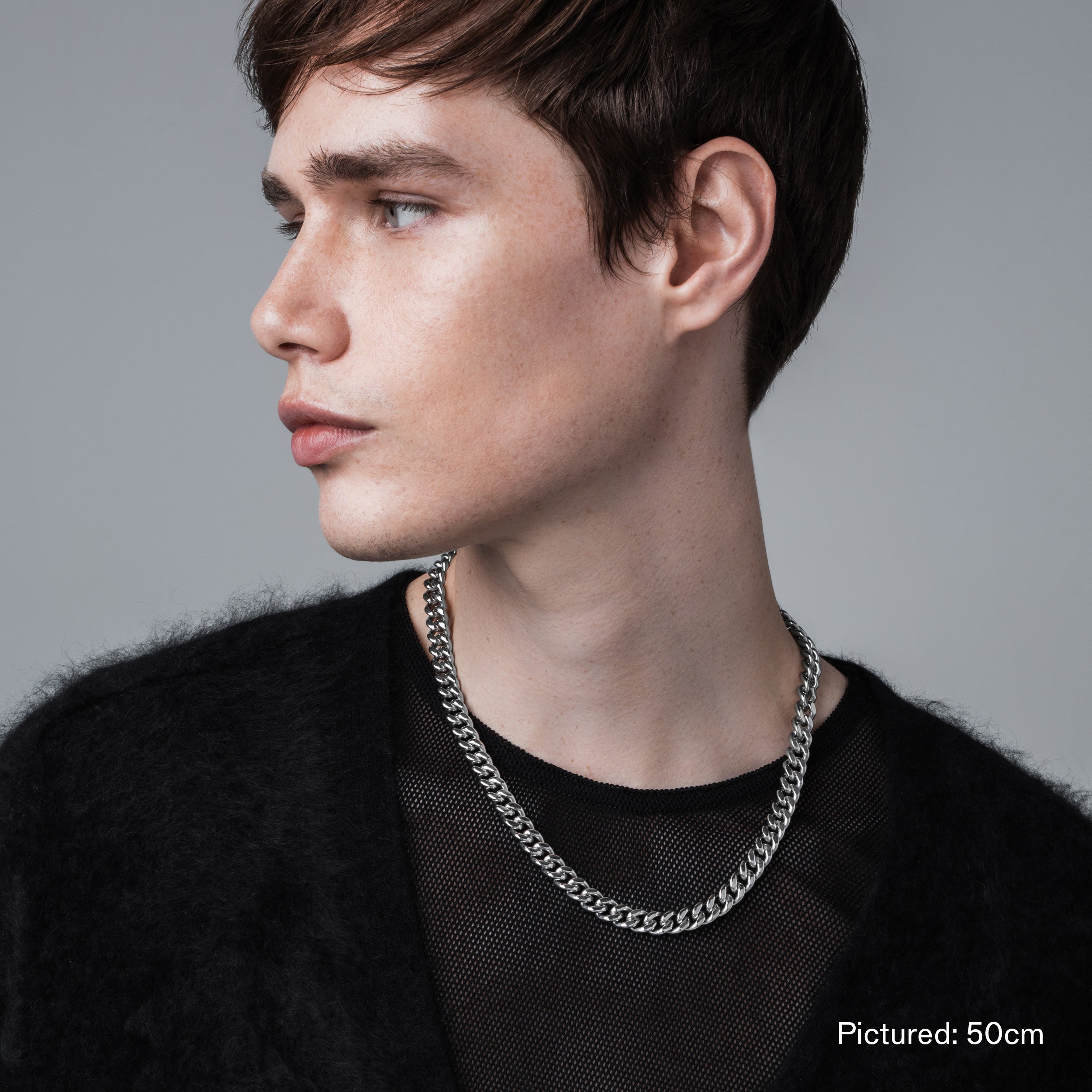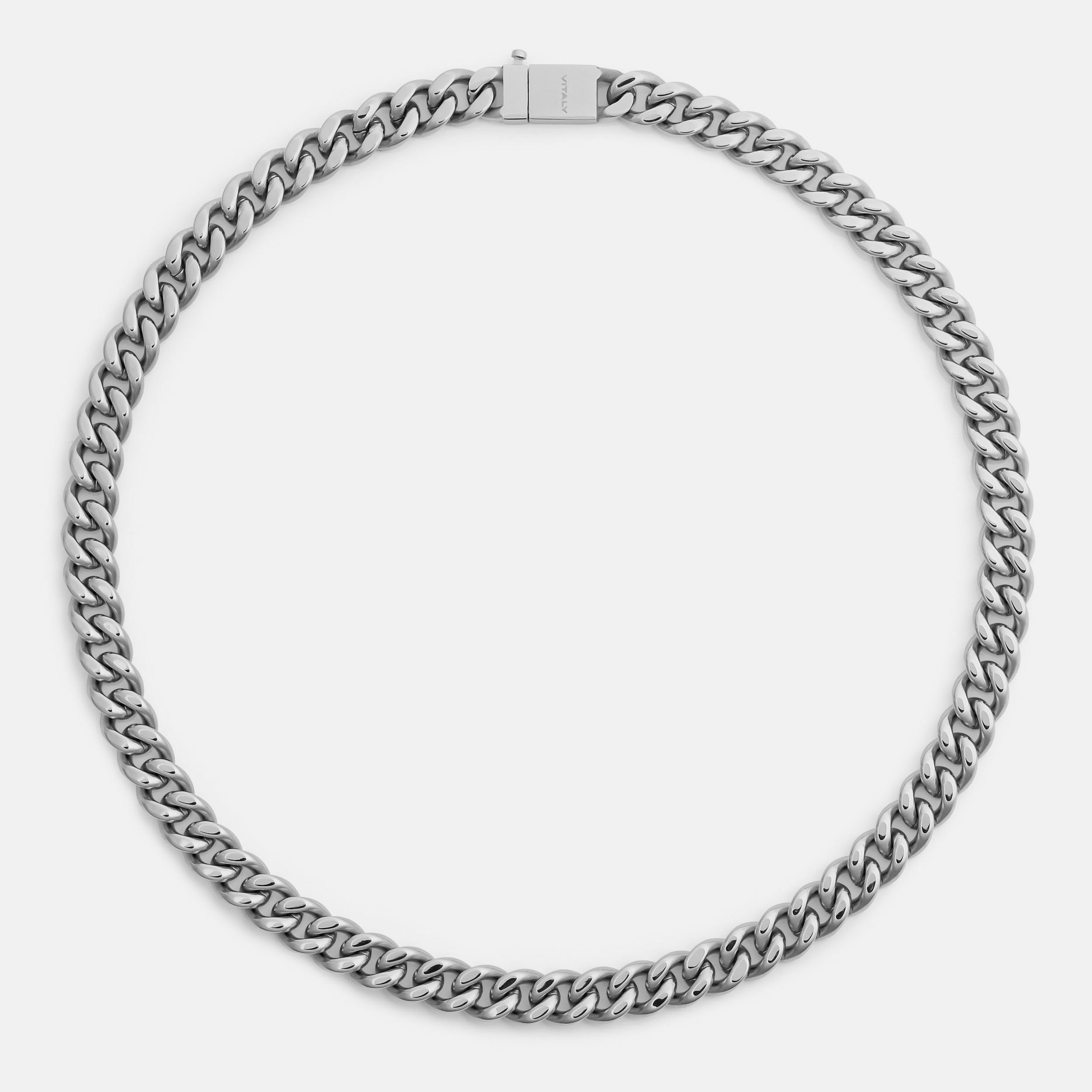 The Source is constructed from tightly woven 9mm Cuban links. giving it a solid. compact aesthetic. Comes in three lengths and finishes with a minimal laser-etched buckle clasp. Can be worn on its own or layered with other chains and pendants.