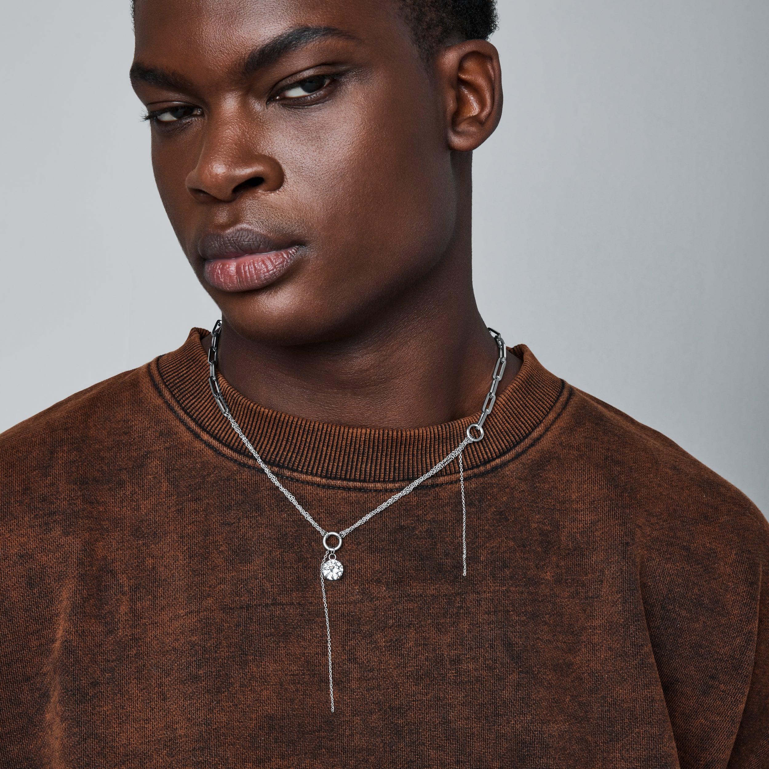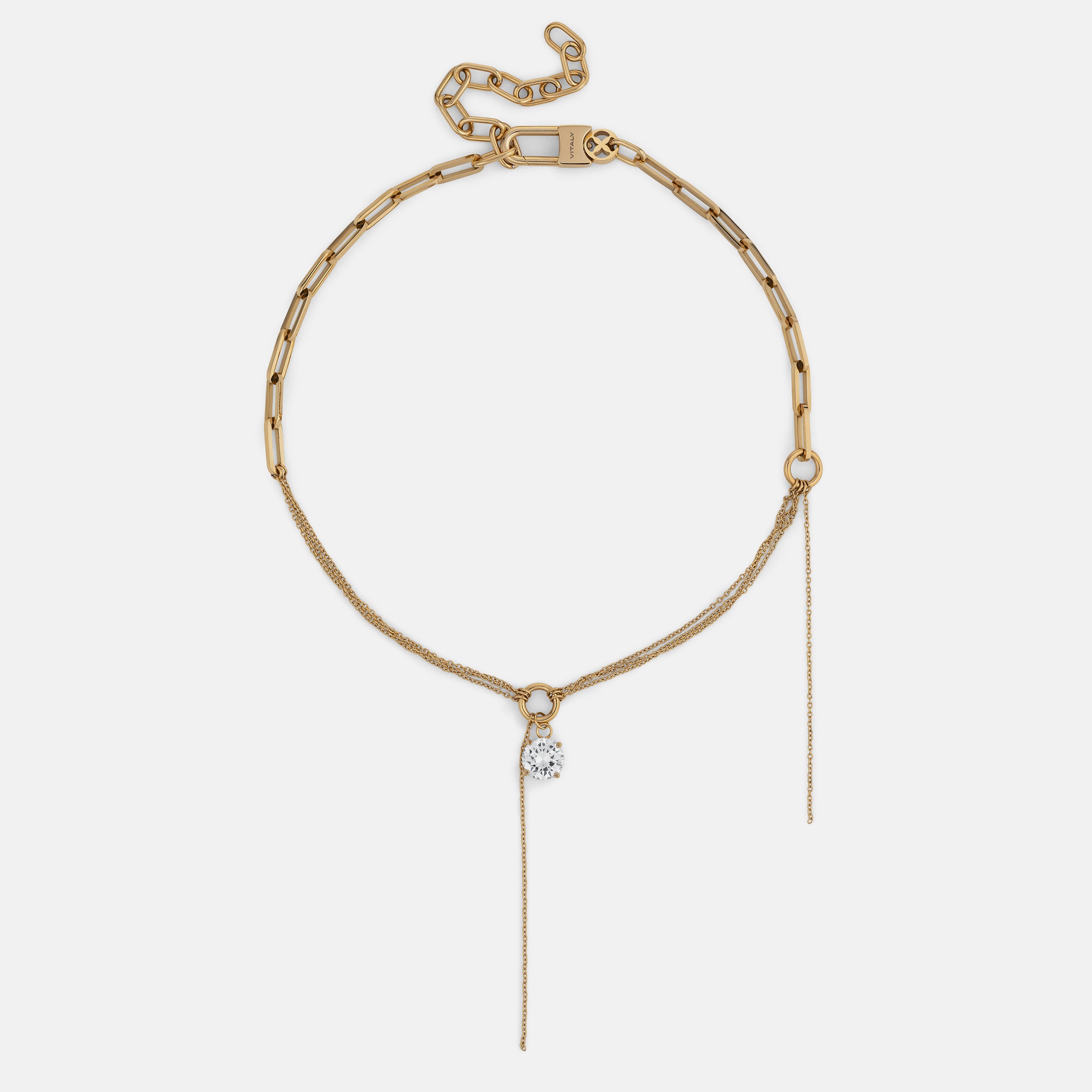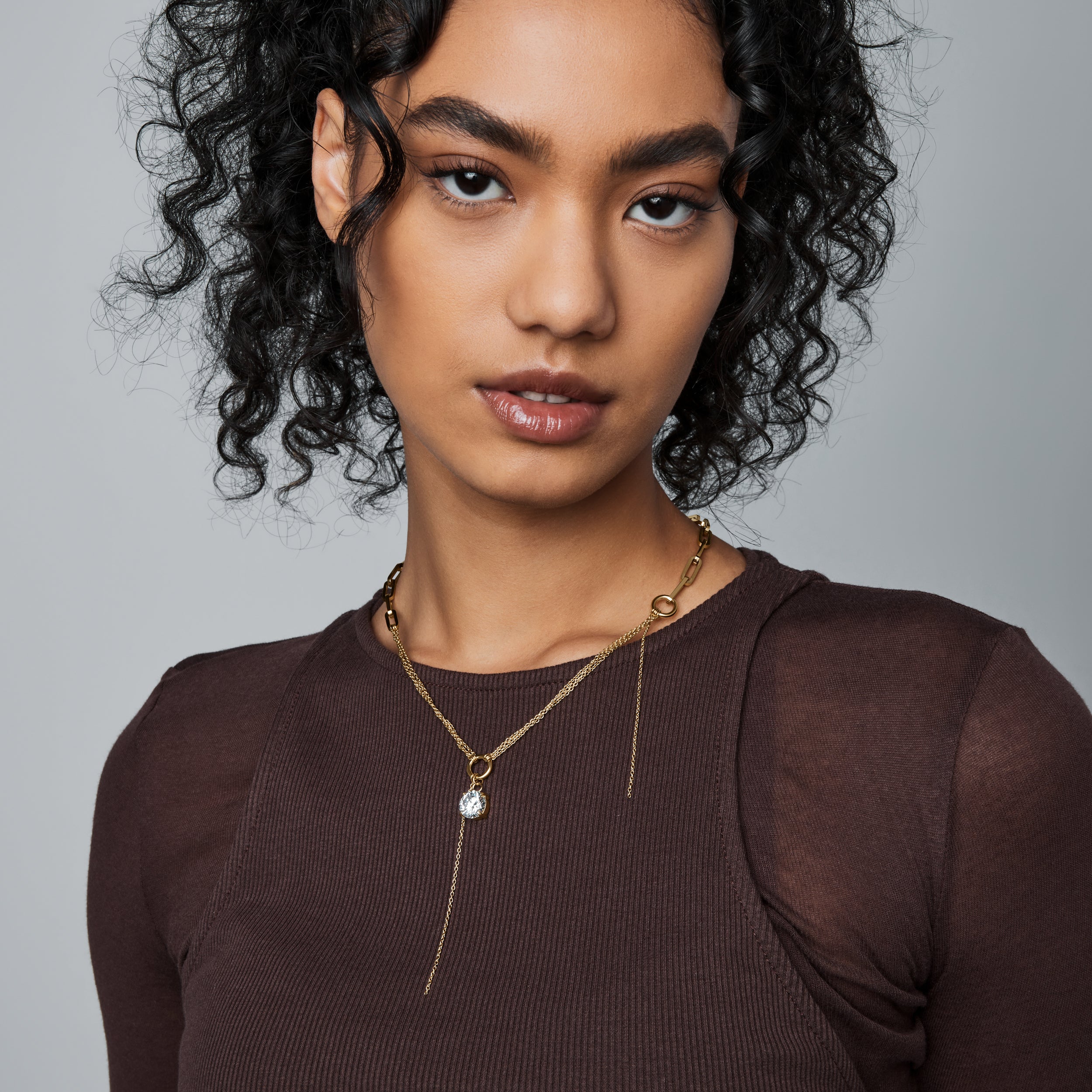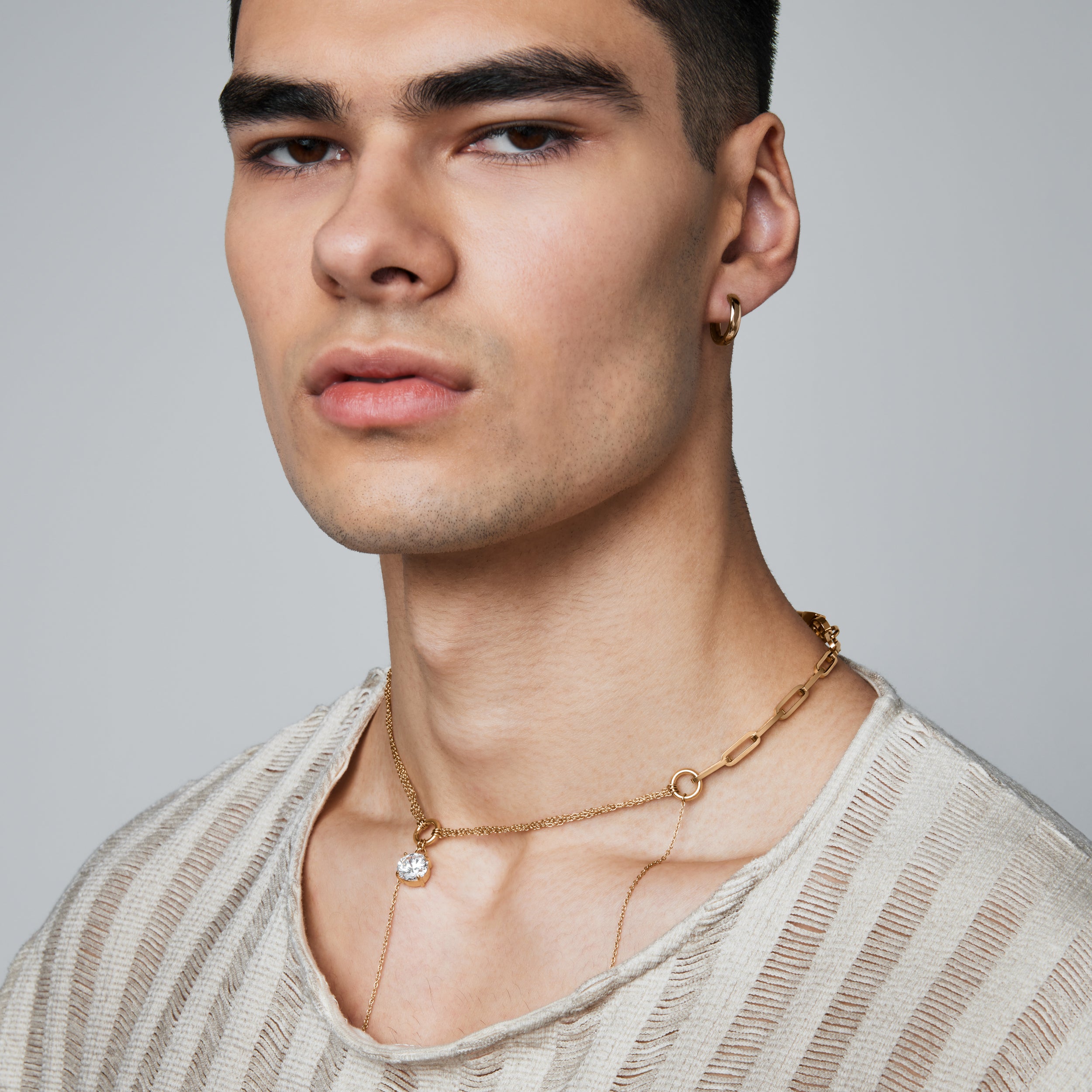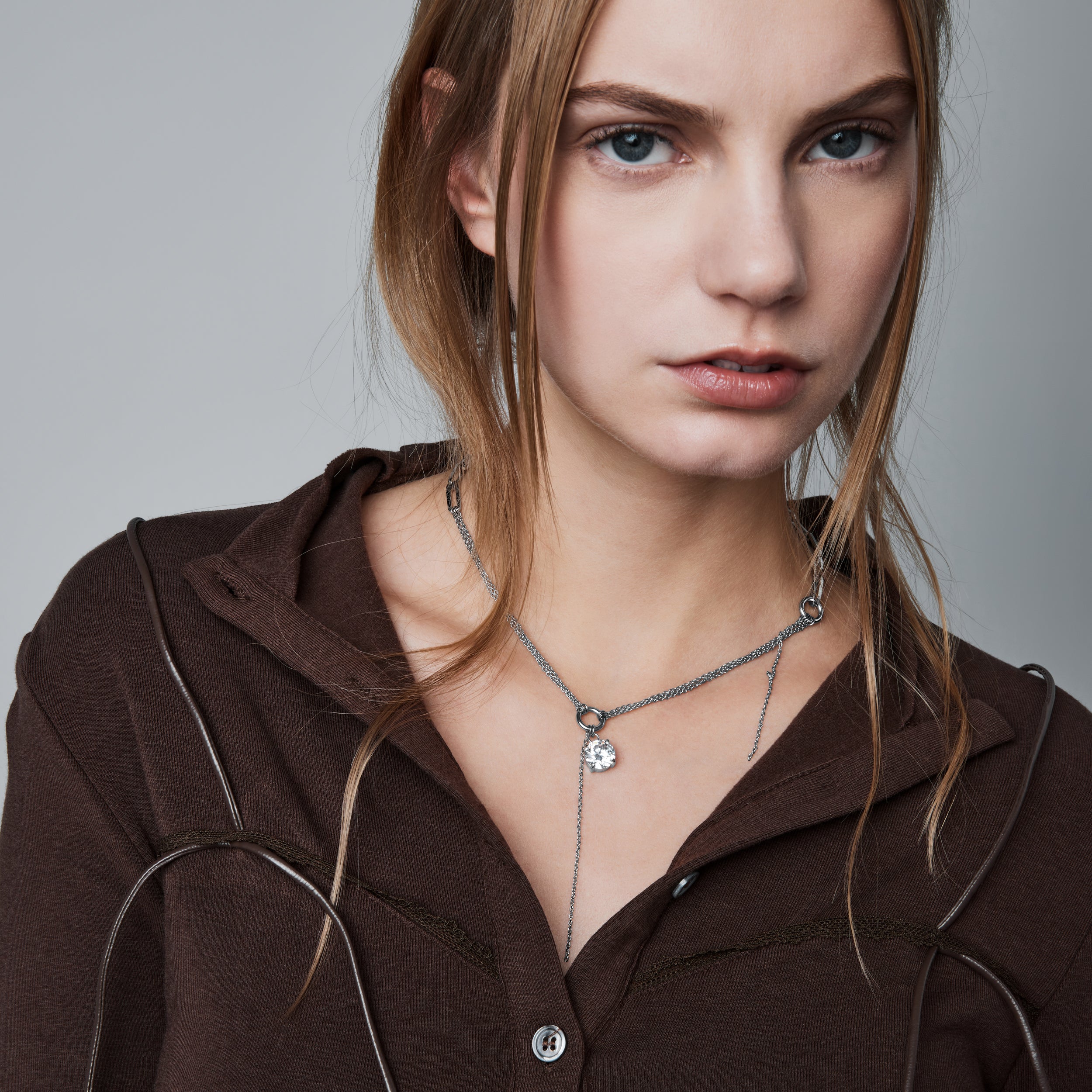 Little sister to our ever-popular chain. the Splendor is composed of angular paperclip links and strands of delicate woven chain that lead the eye towards a shining crystal. Finished with our Signature Glyph carabiner clasp and an adjustable sizing chain.