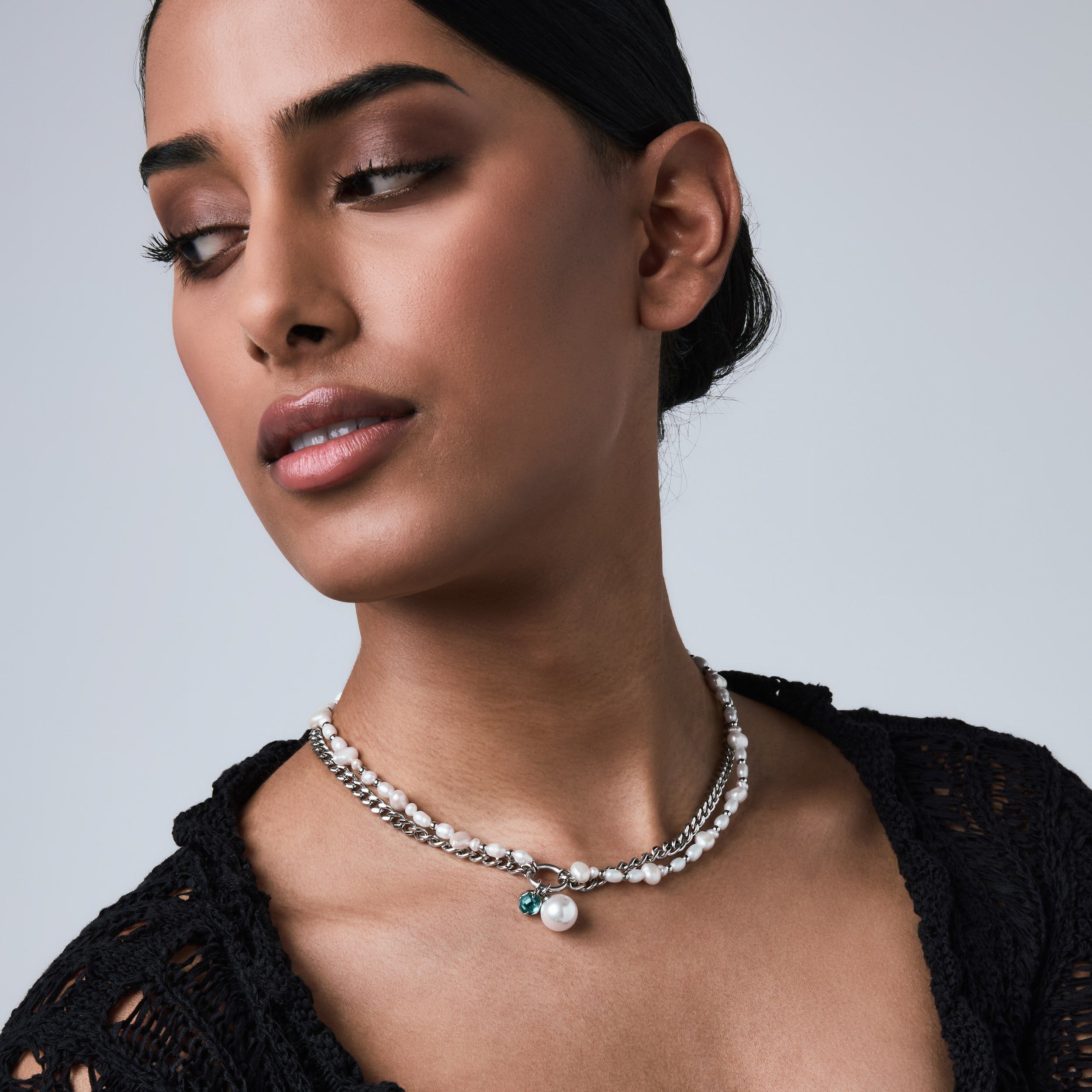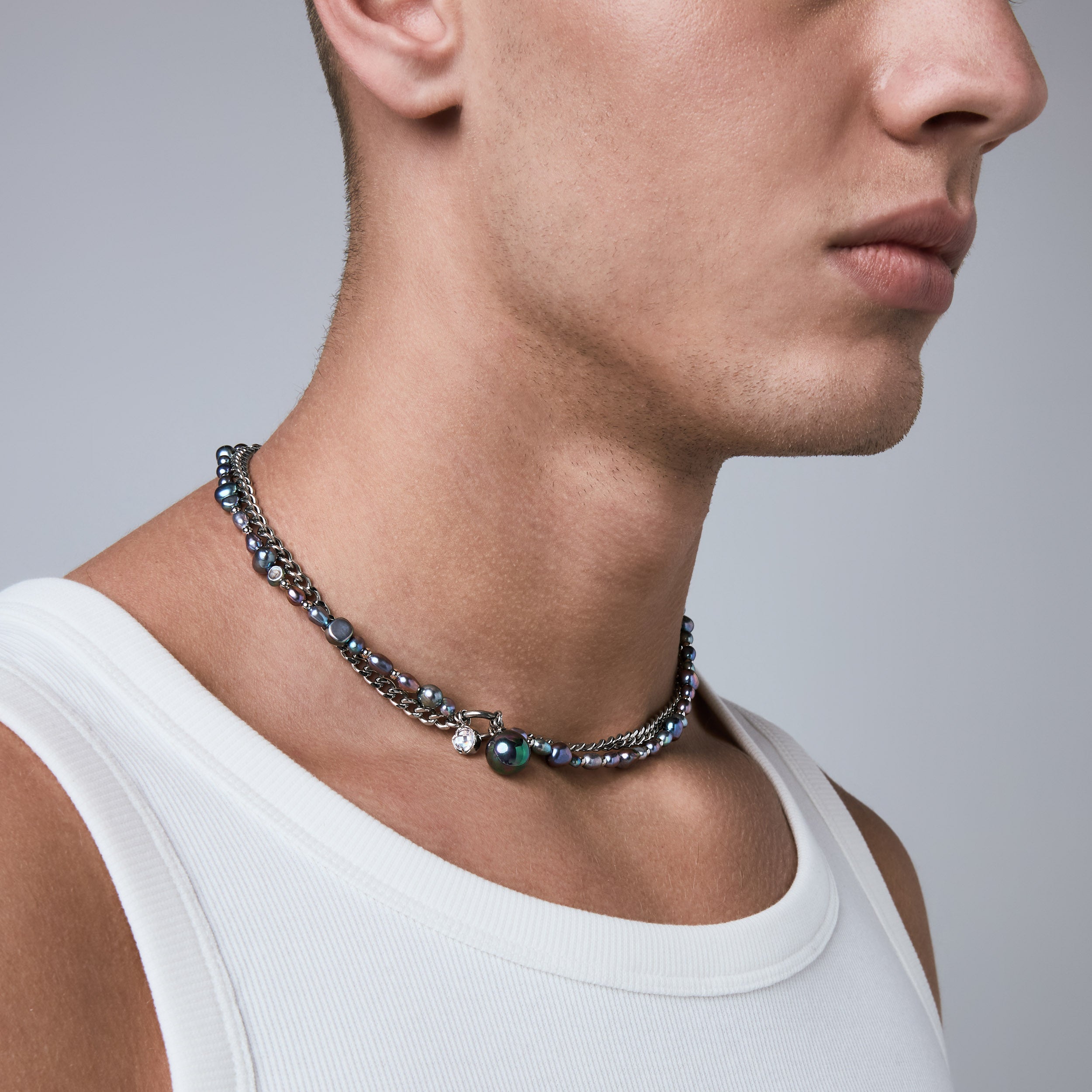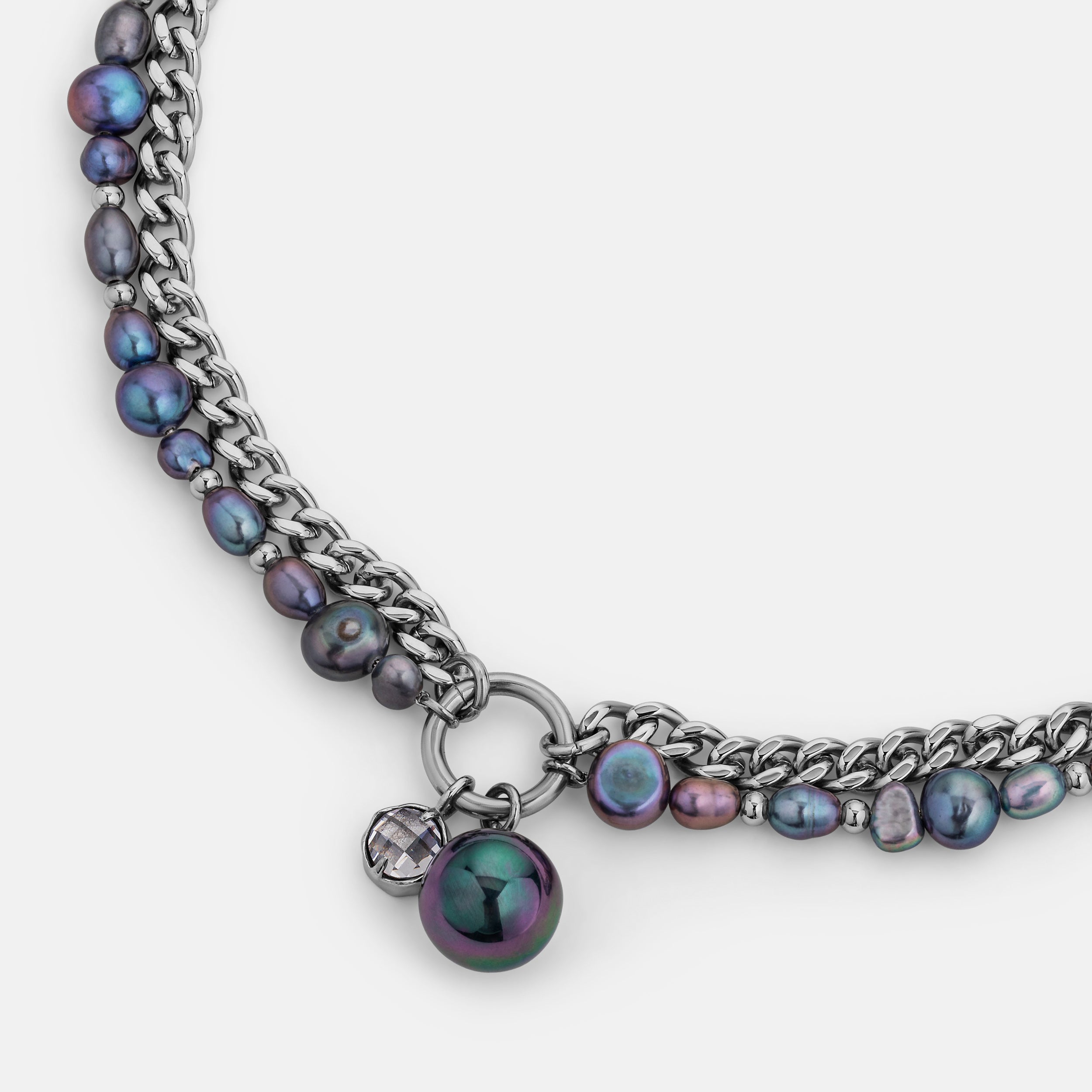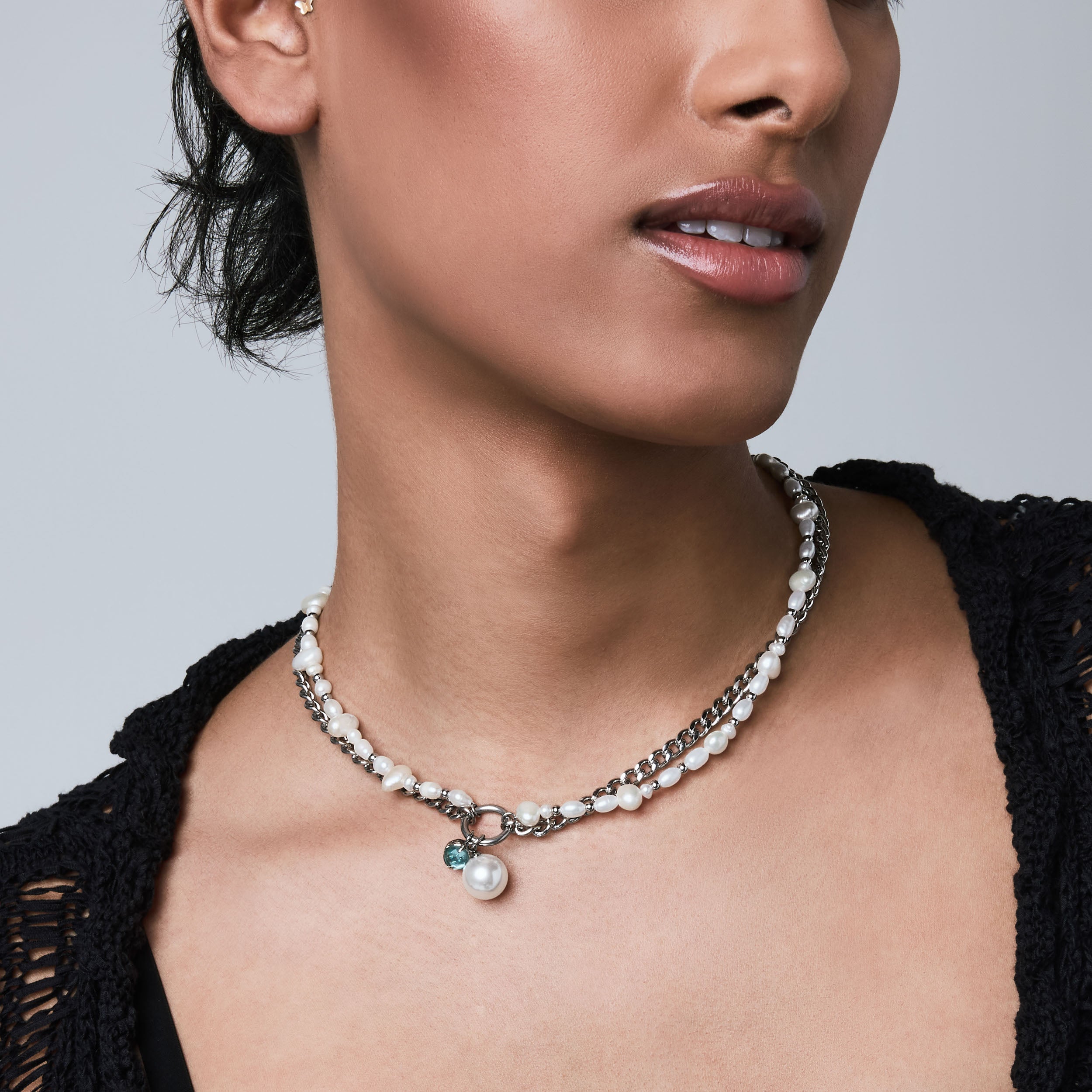 The Sway contrasts a uniform curb chain with a string of irregular pearls. Each material pulls in a different direction. creating a tension between structure and softness. Finished with a dual hanging pendant of crystal and pearl. the Sway adds a kinetic element that shifts with movement. These pearls are synthetic. and come in natural pearl tone or the iridescent purple Edison.