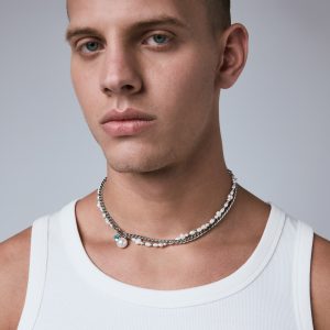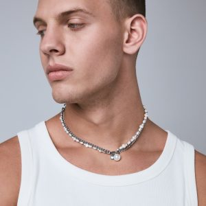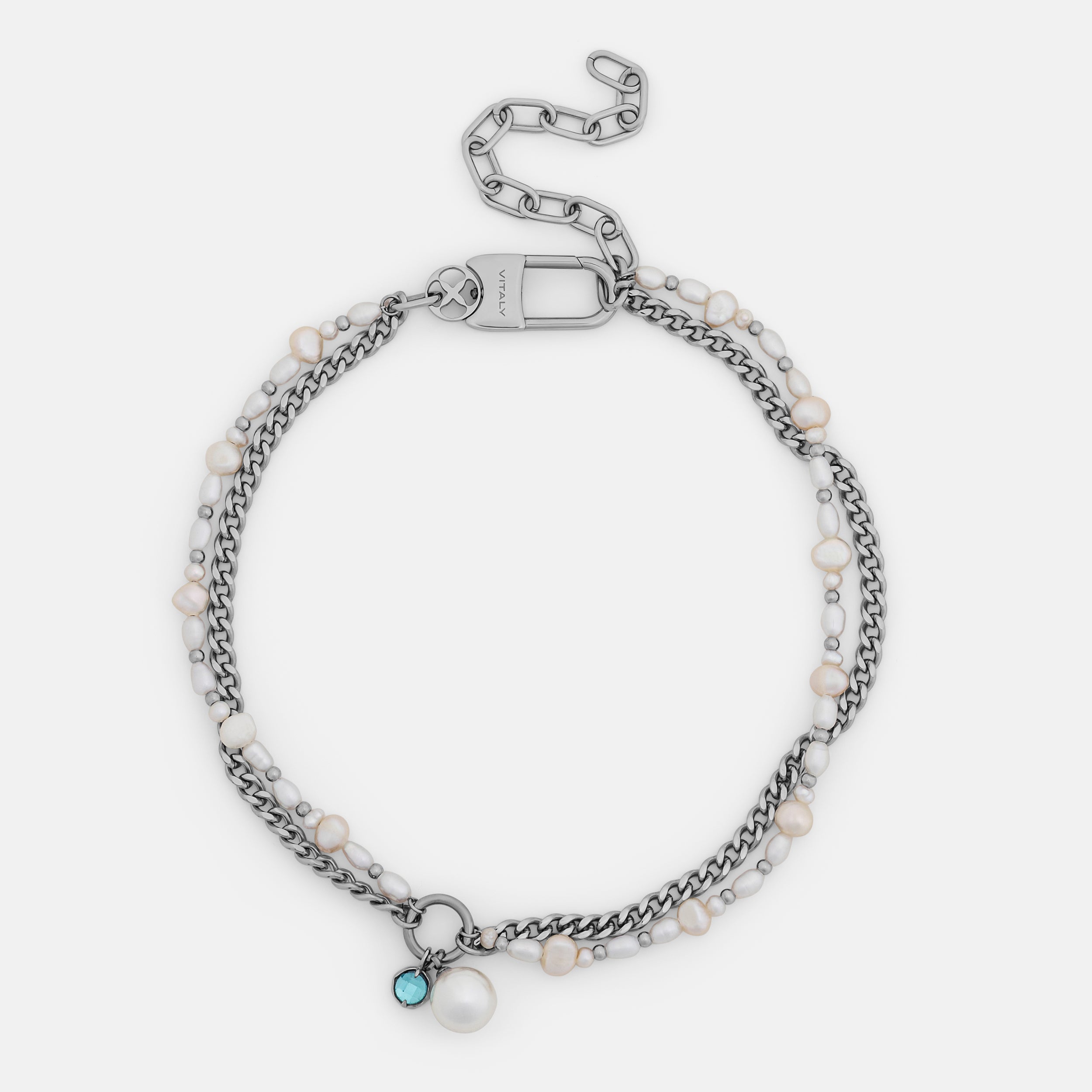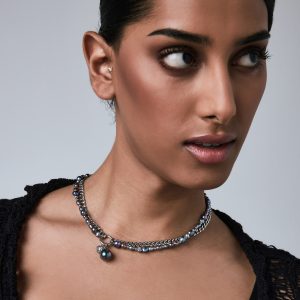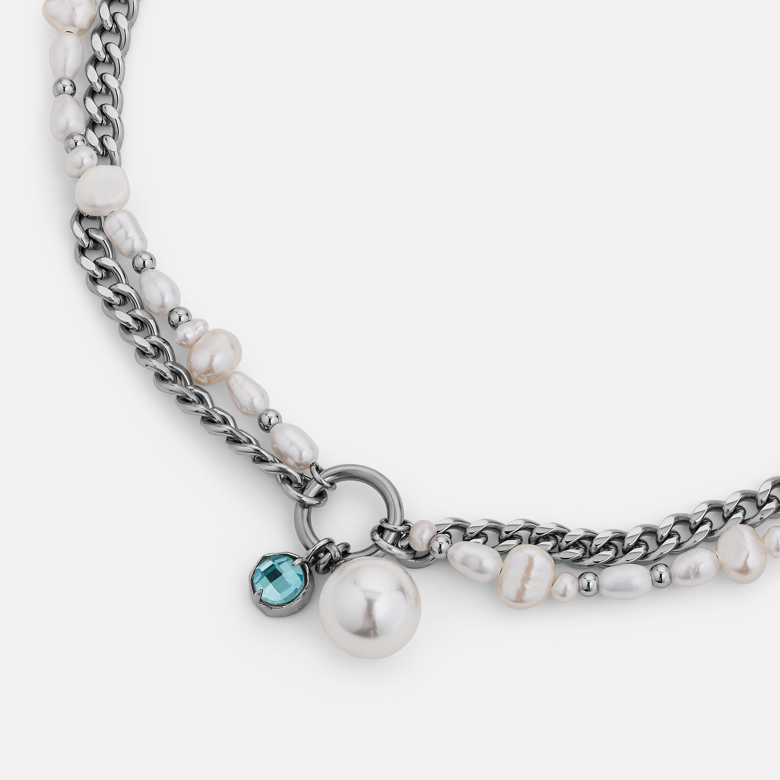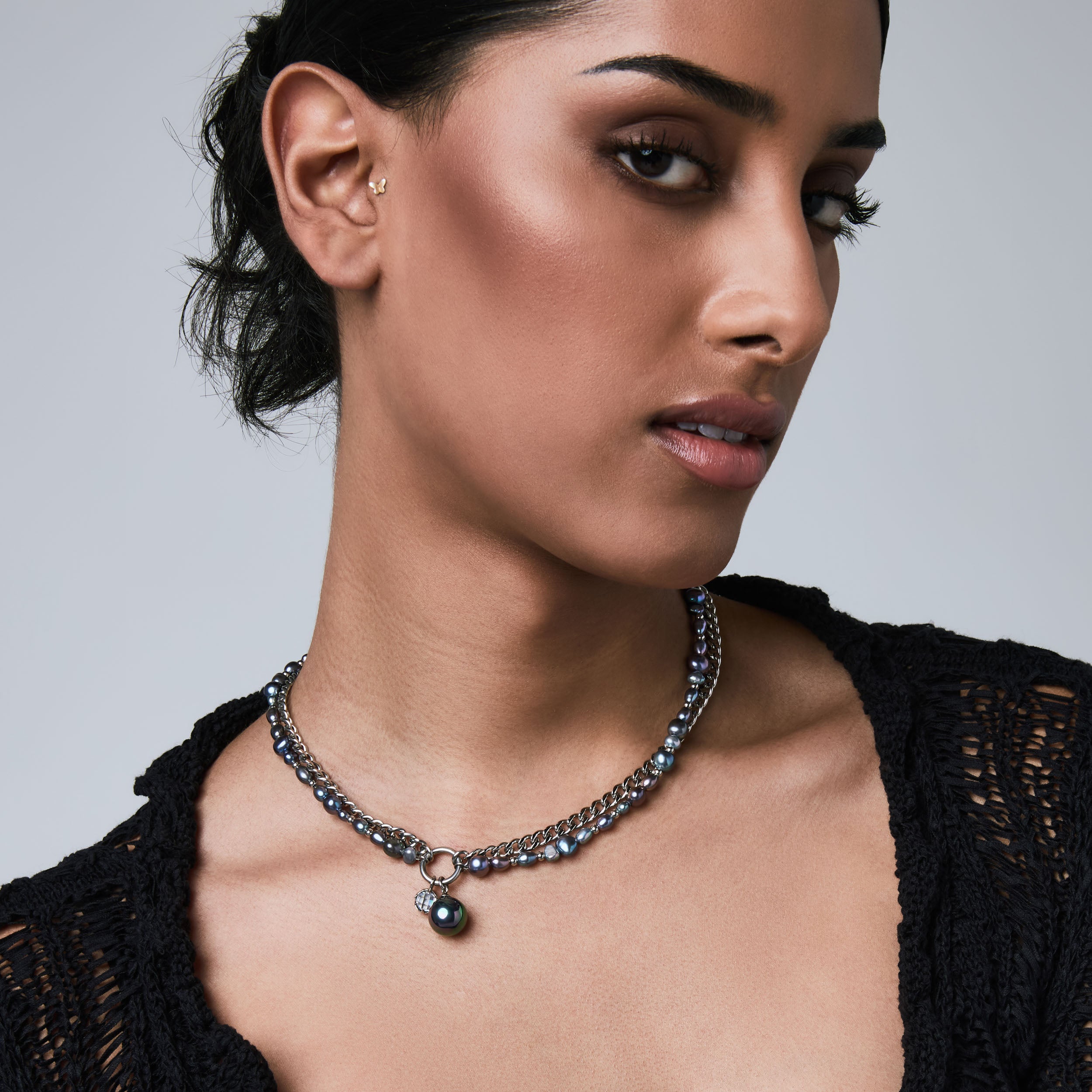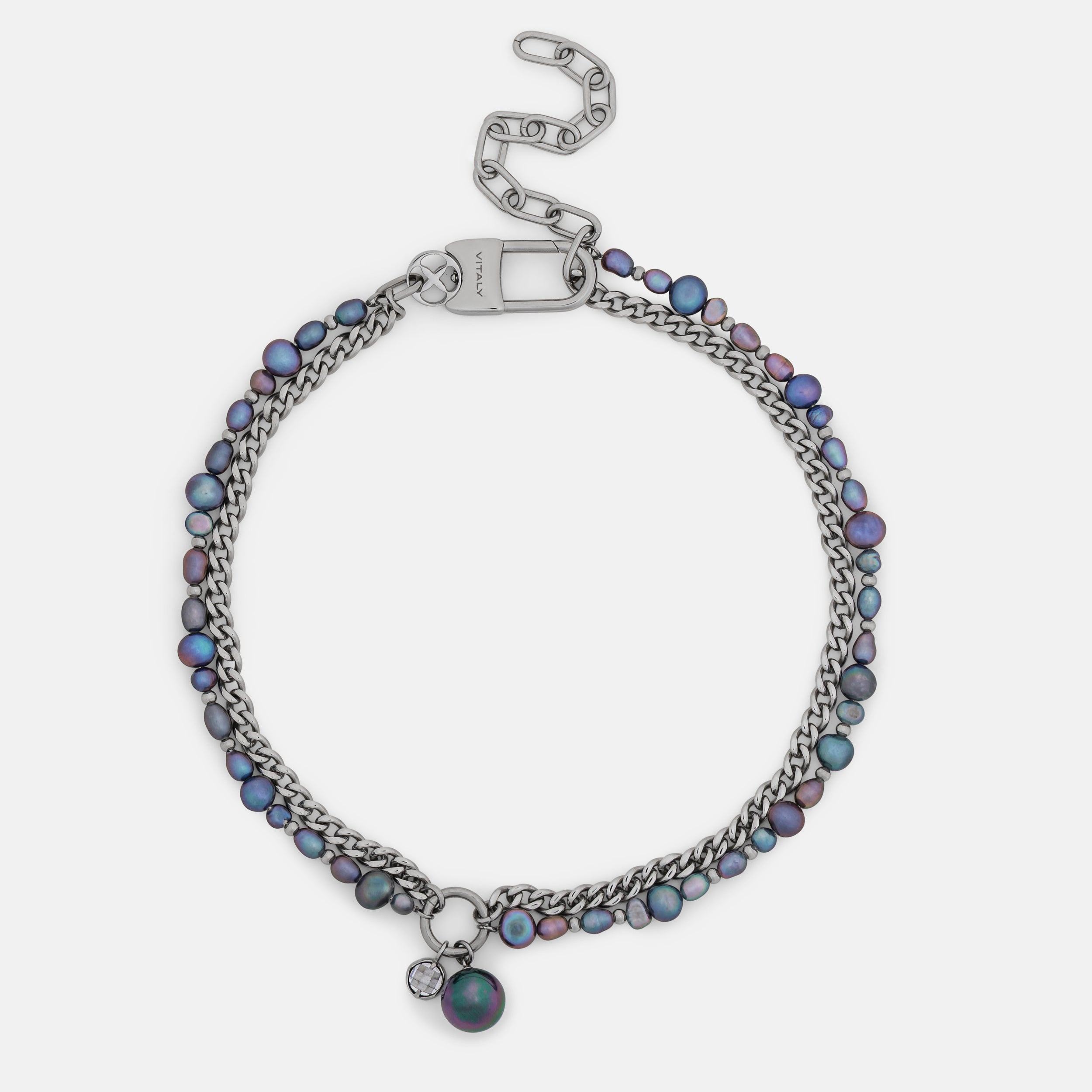 The Sway contrasts a uniform curb chain with a string of irregular pearls. Each material pulls in a different direction. creating a tension between structure and softness. Finished with a dual hanging pendant of crystal and pearl. the Sway adds a kinetic element that shifts with movement. These pearls are synthetic. and come in natural pearl tone or the iridescent purple Edison.